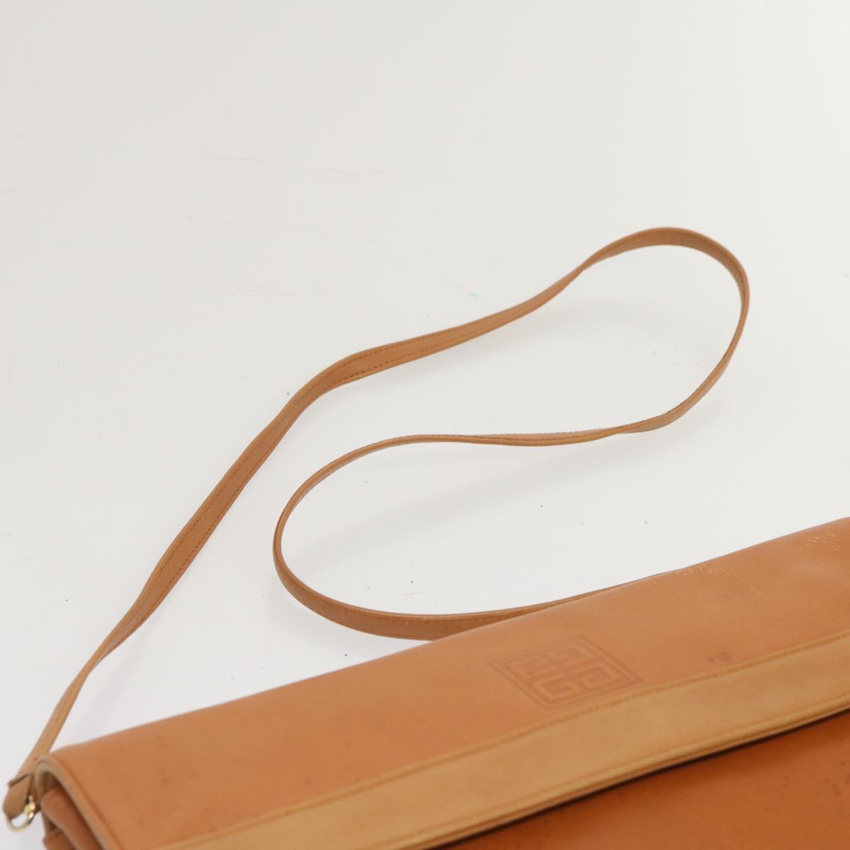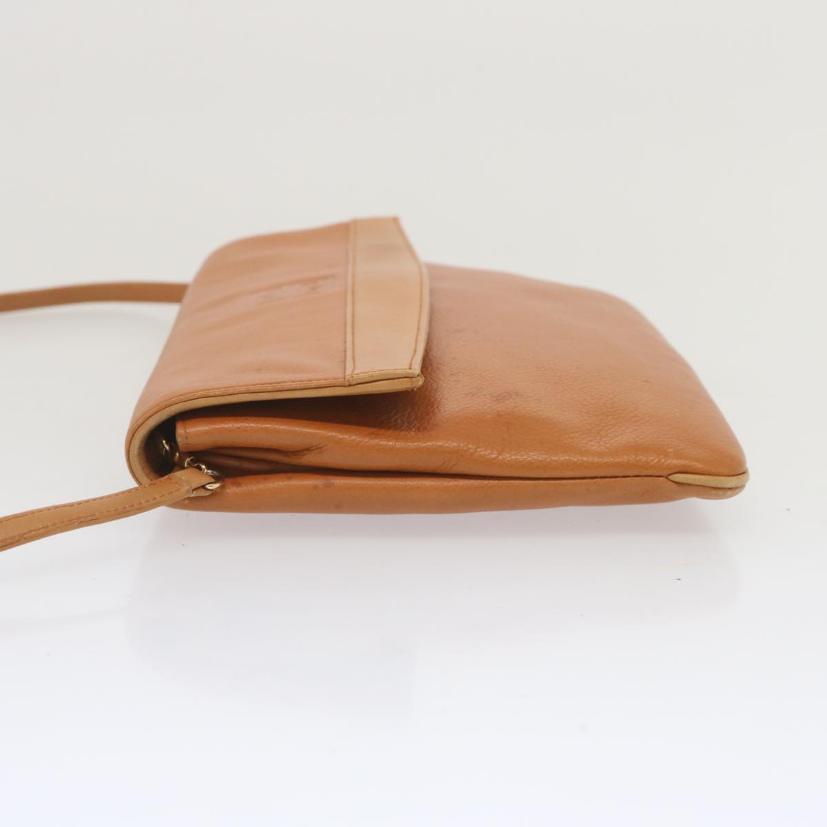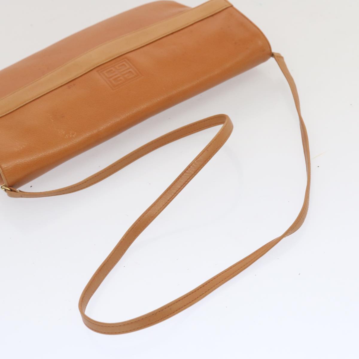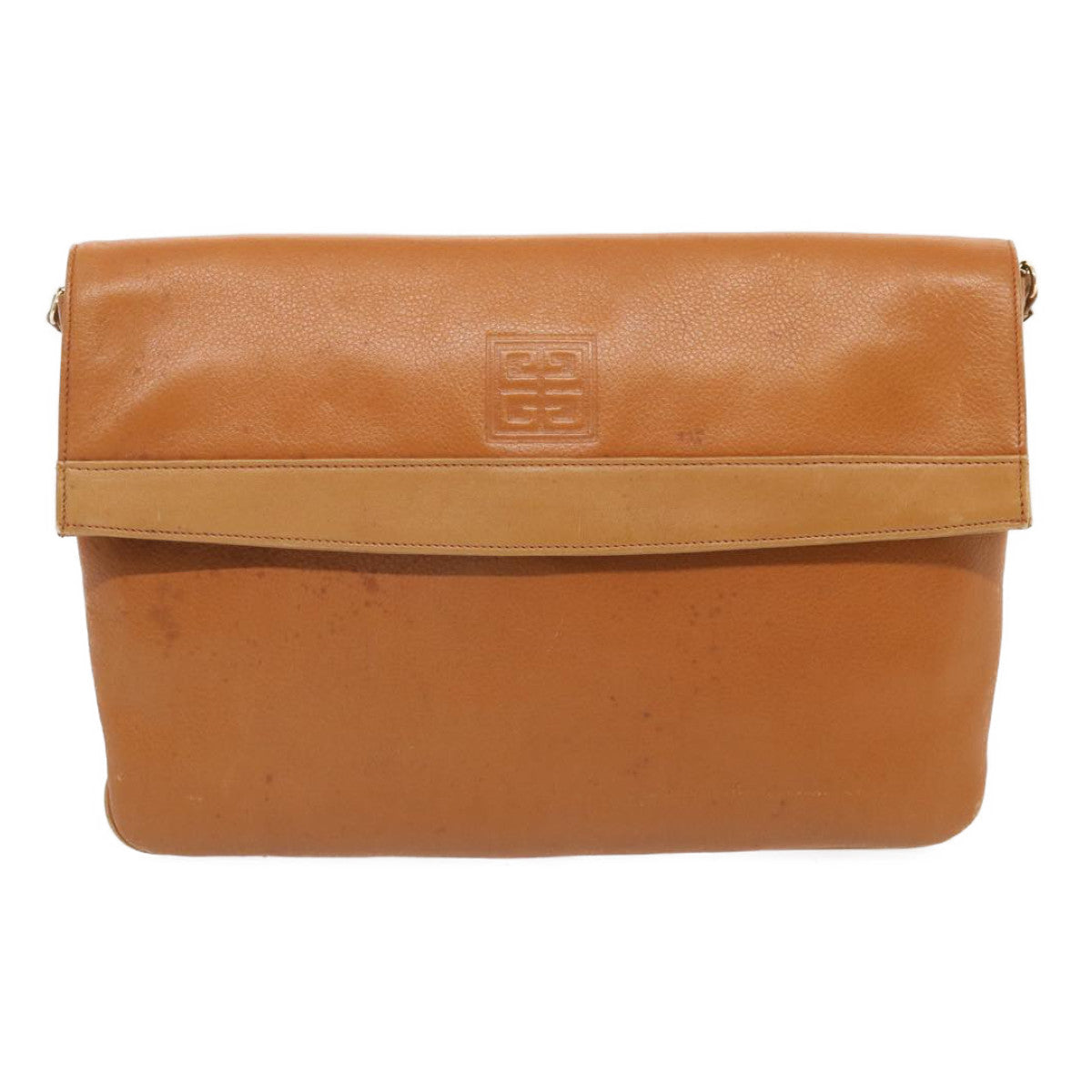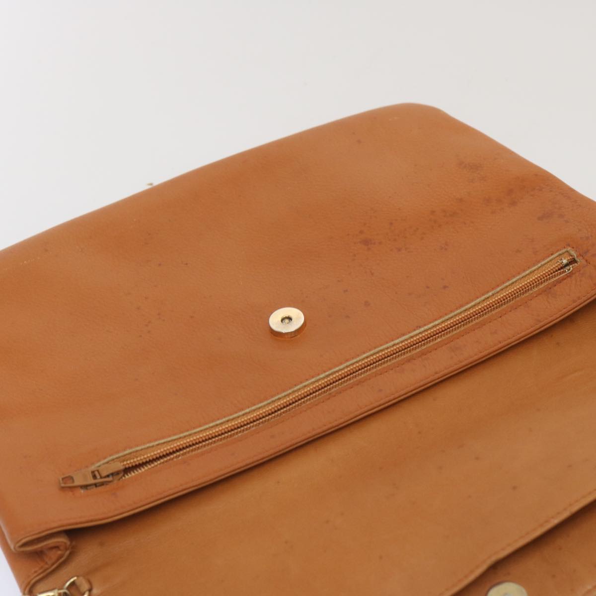 The exterior surface displays rubbing a slight loss of shape and a stain while the shoulder strap exhibits rubbing as well. There are slight scratches on the metal fittings and inside in the pockets and along the corners rubbing is noticeable. Additionally there is a persistent storage odor present within the item.