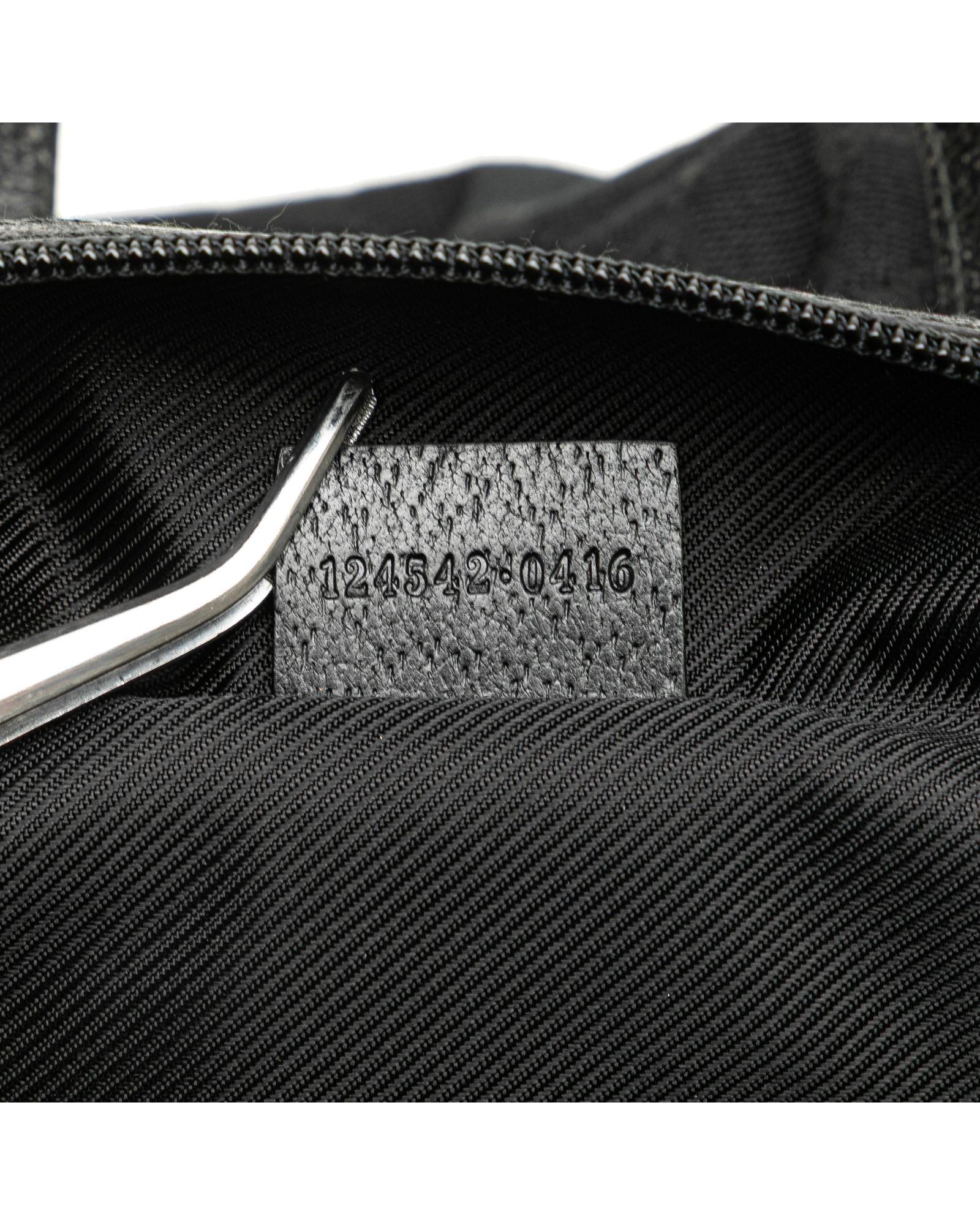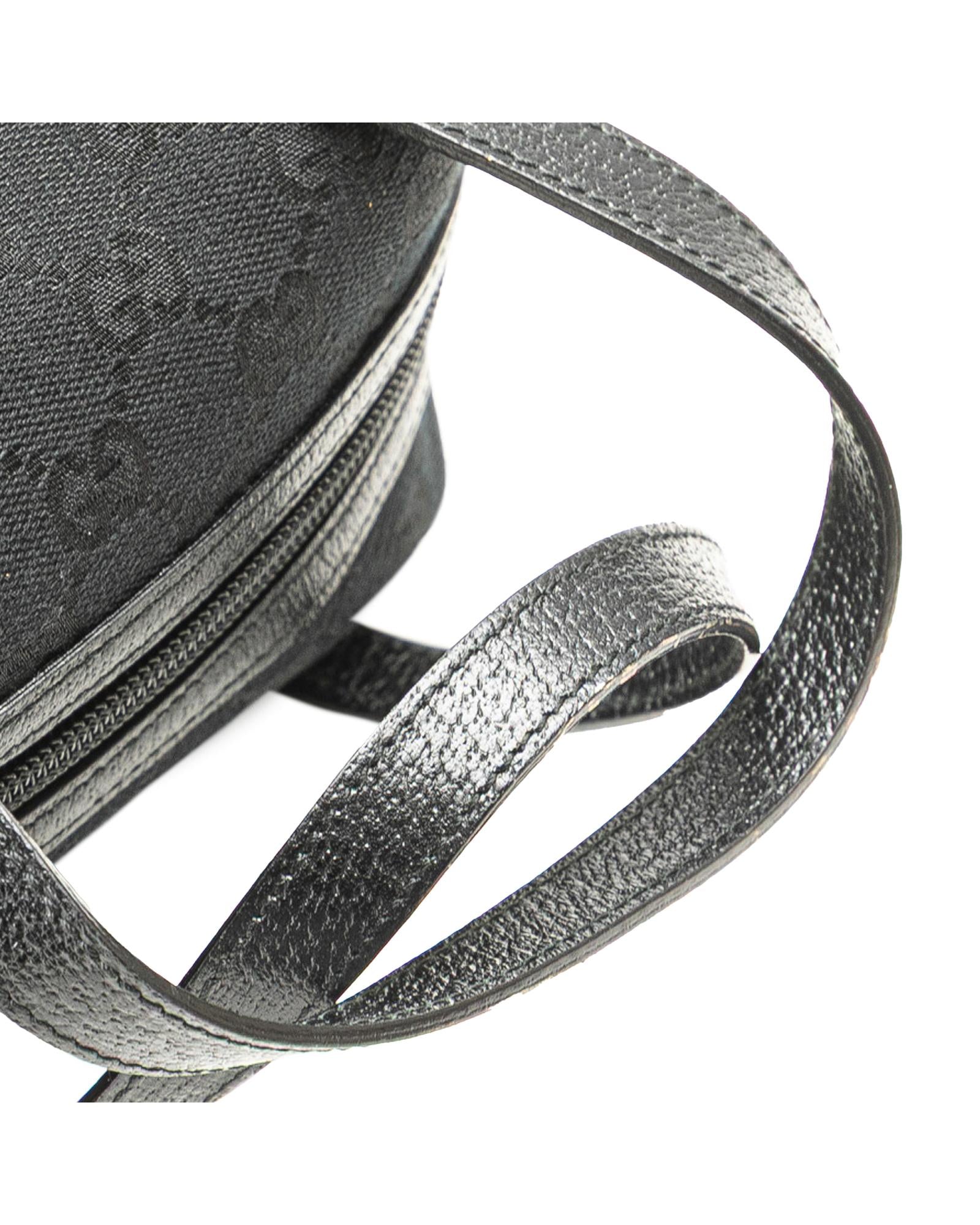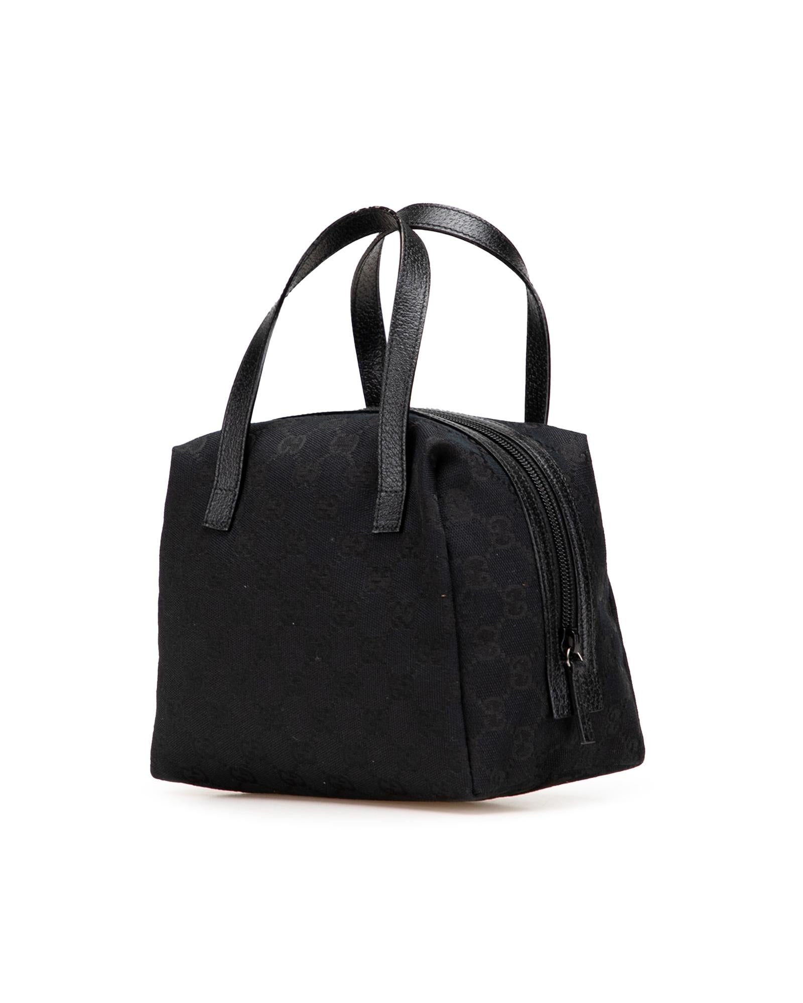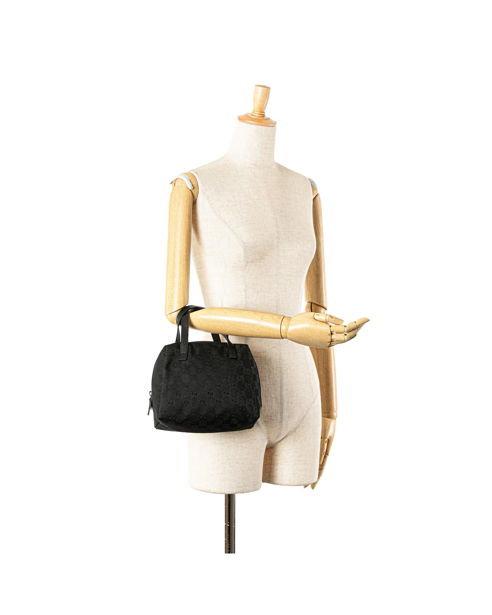 This handbag features a canvas body with leather trim flat leather handles a top zip closure and an interior zip pocket.Brand: Gucci
