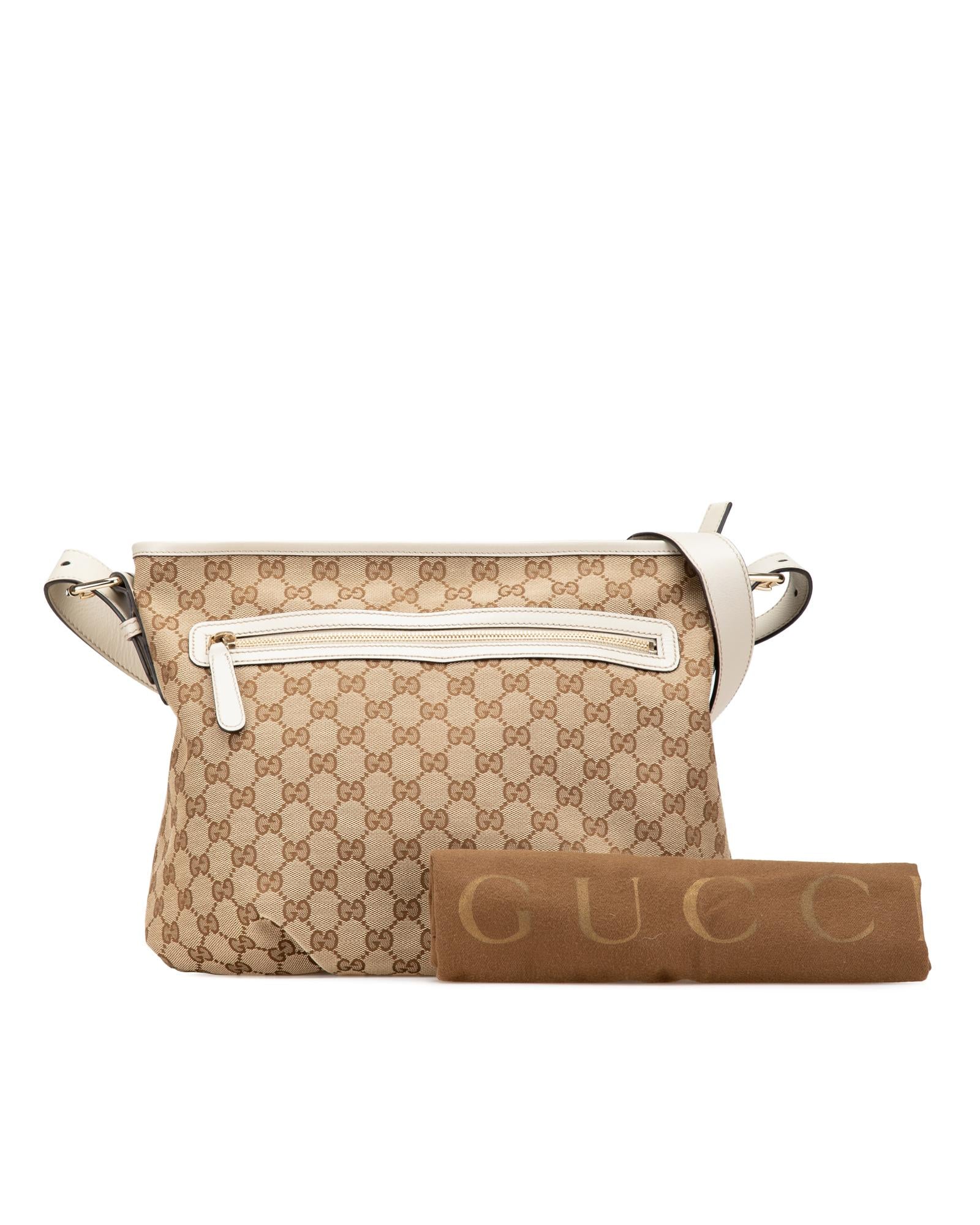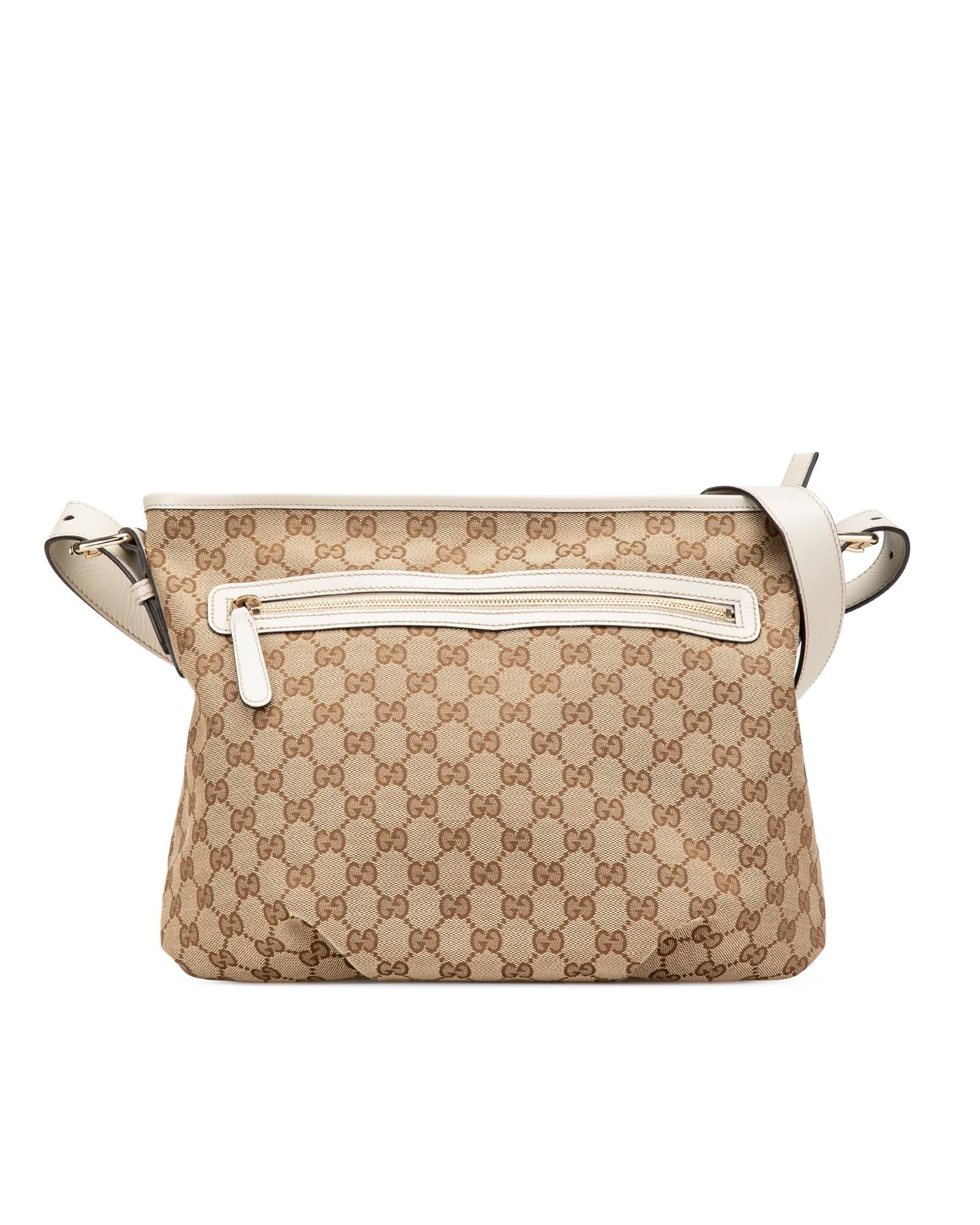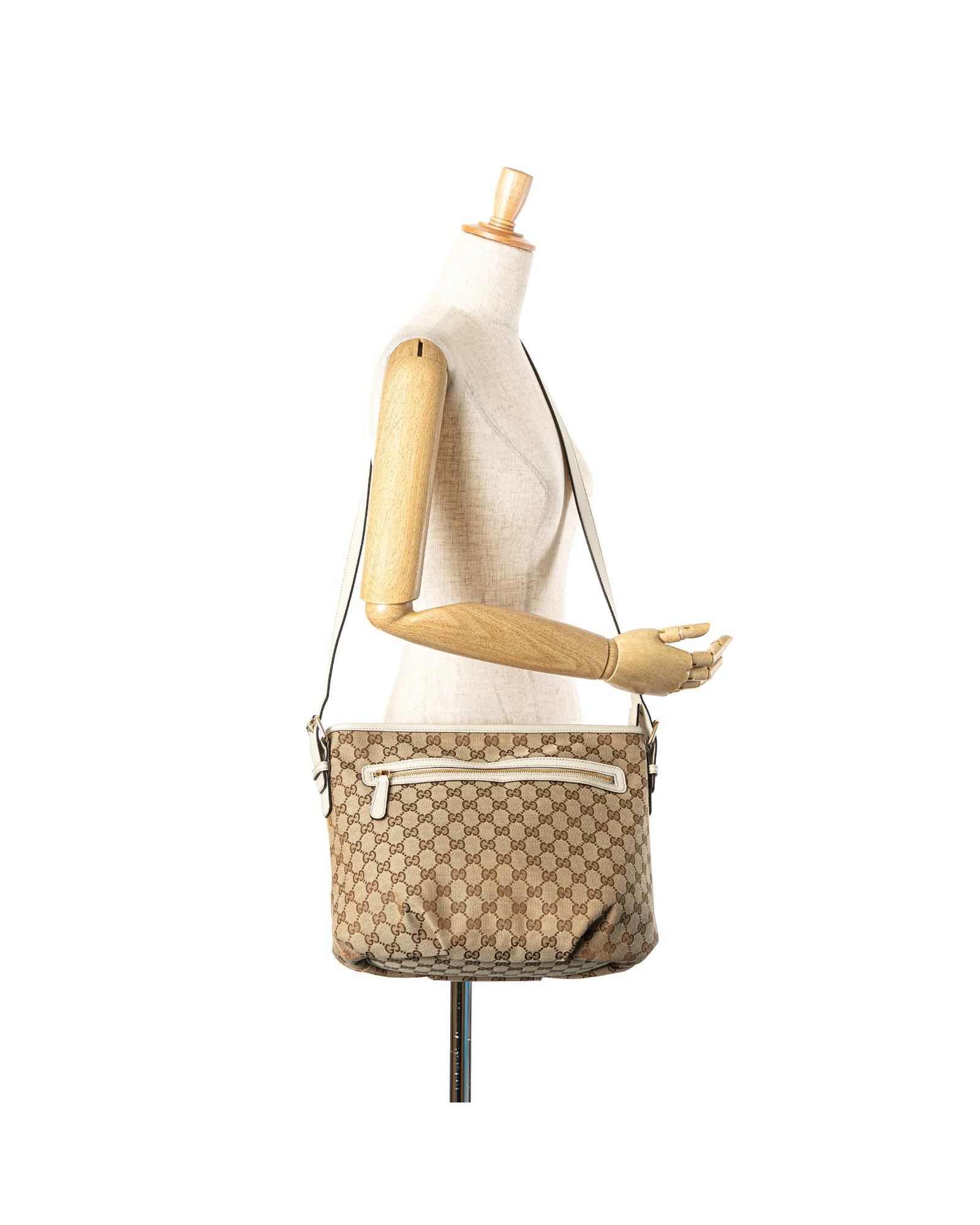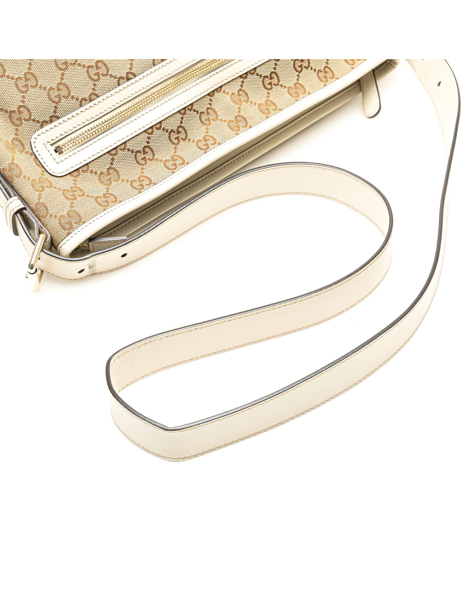 This crossbody bag features a canvas body with leather trim a flat leather strap a top zip closure an exterior front zip pocket and interior zip and slip pockets.