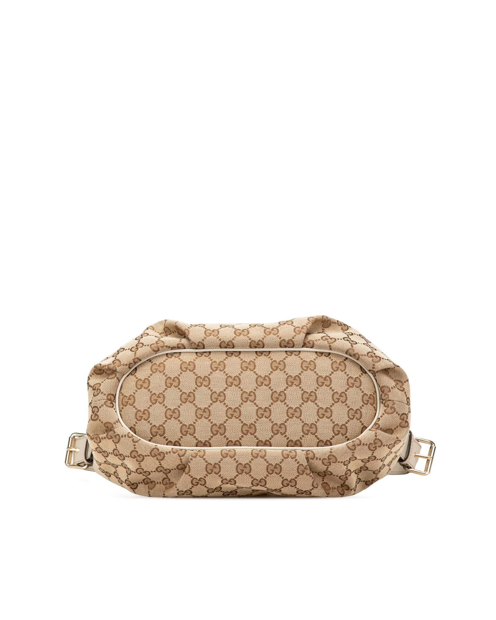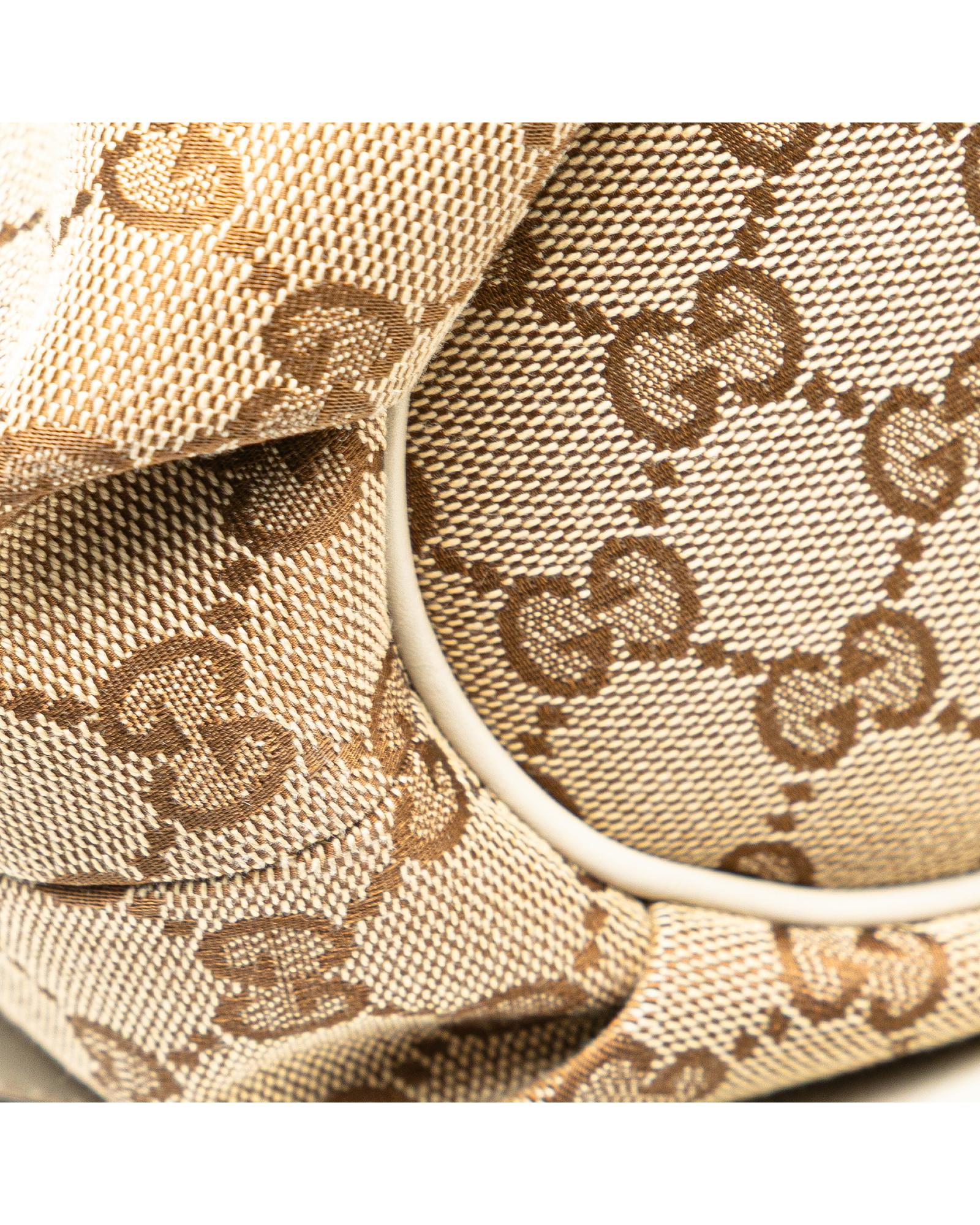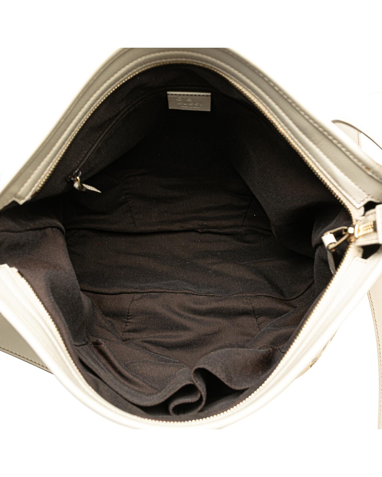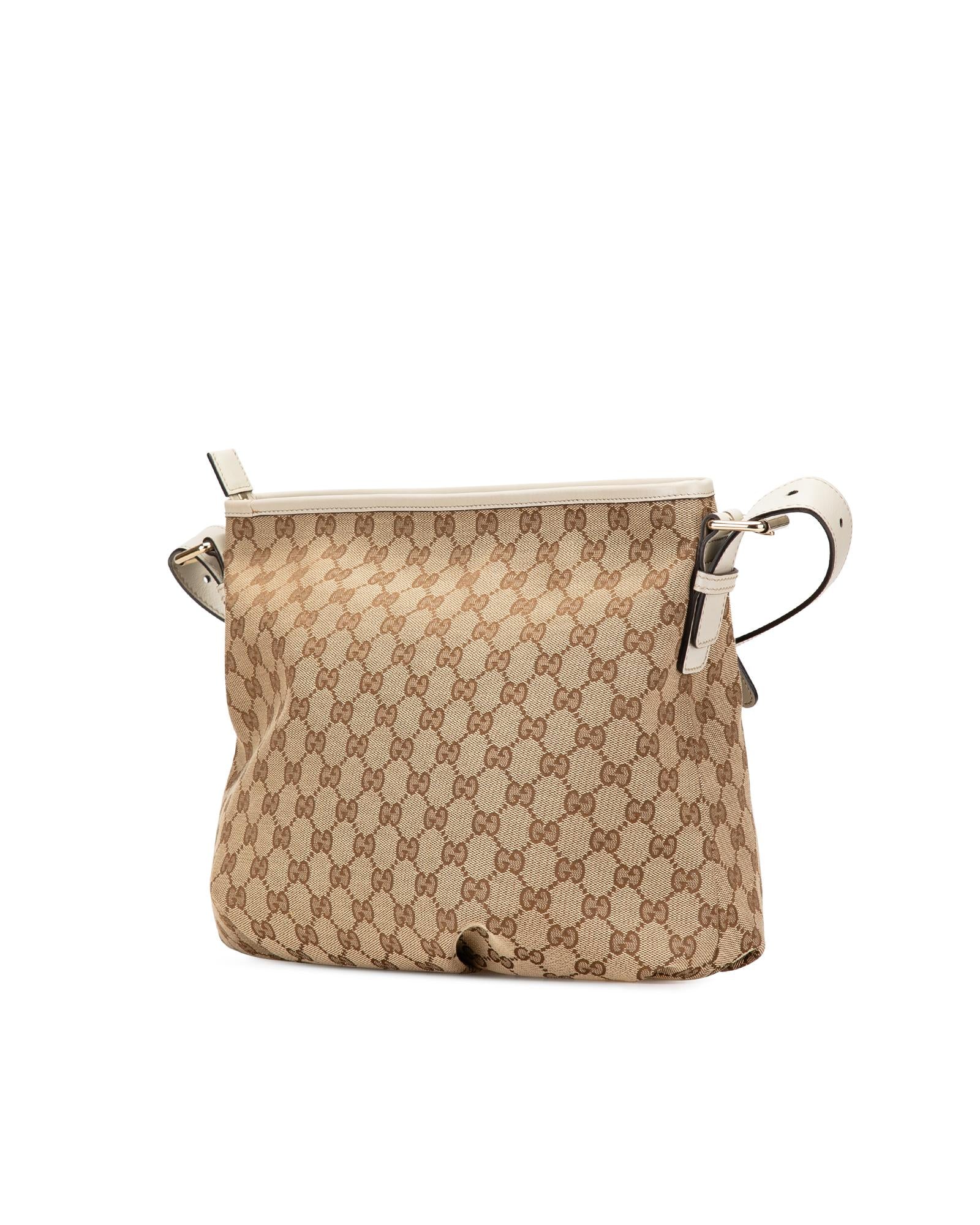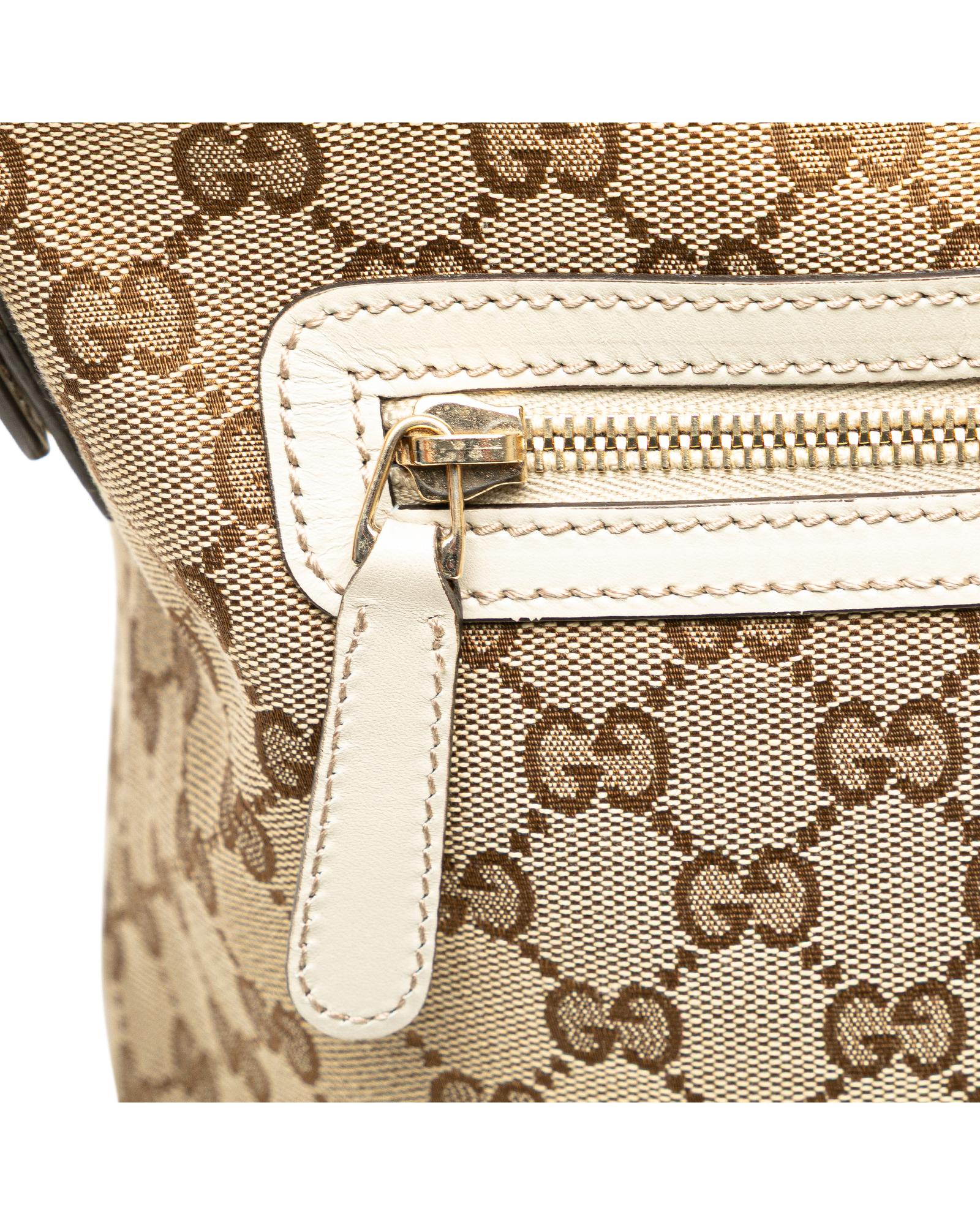 This crossbody bag features a canvas body with leather trim a flat leather strap a top zip closure an exterior front zip pocket and interior zip and slip pockets.