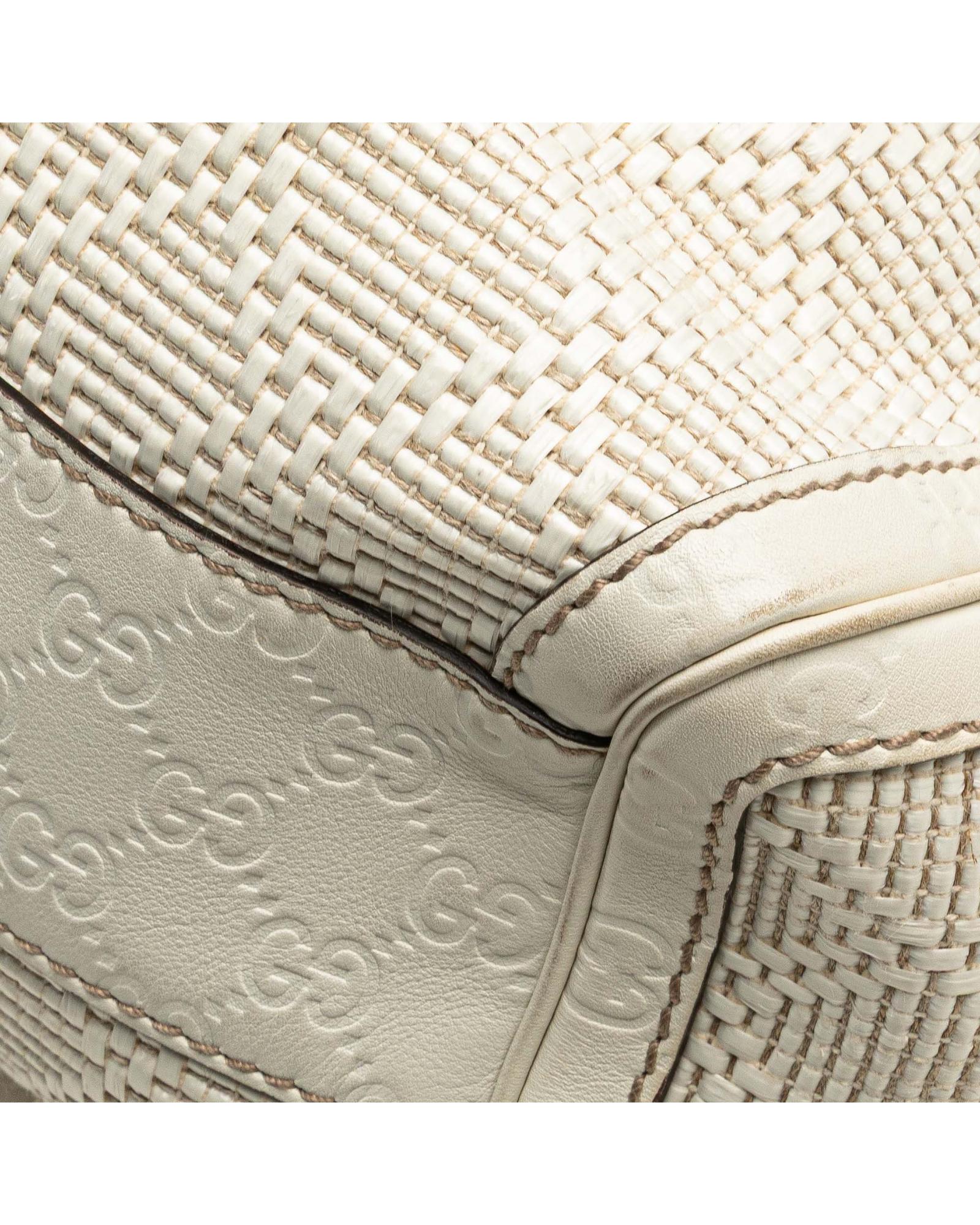 The Sukey features a raffia body with leather trim rolled leather handles an open top with magnetic closure and an interior zip pocket.