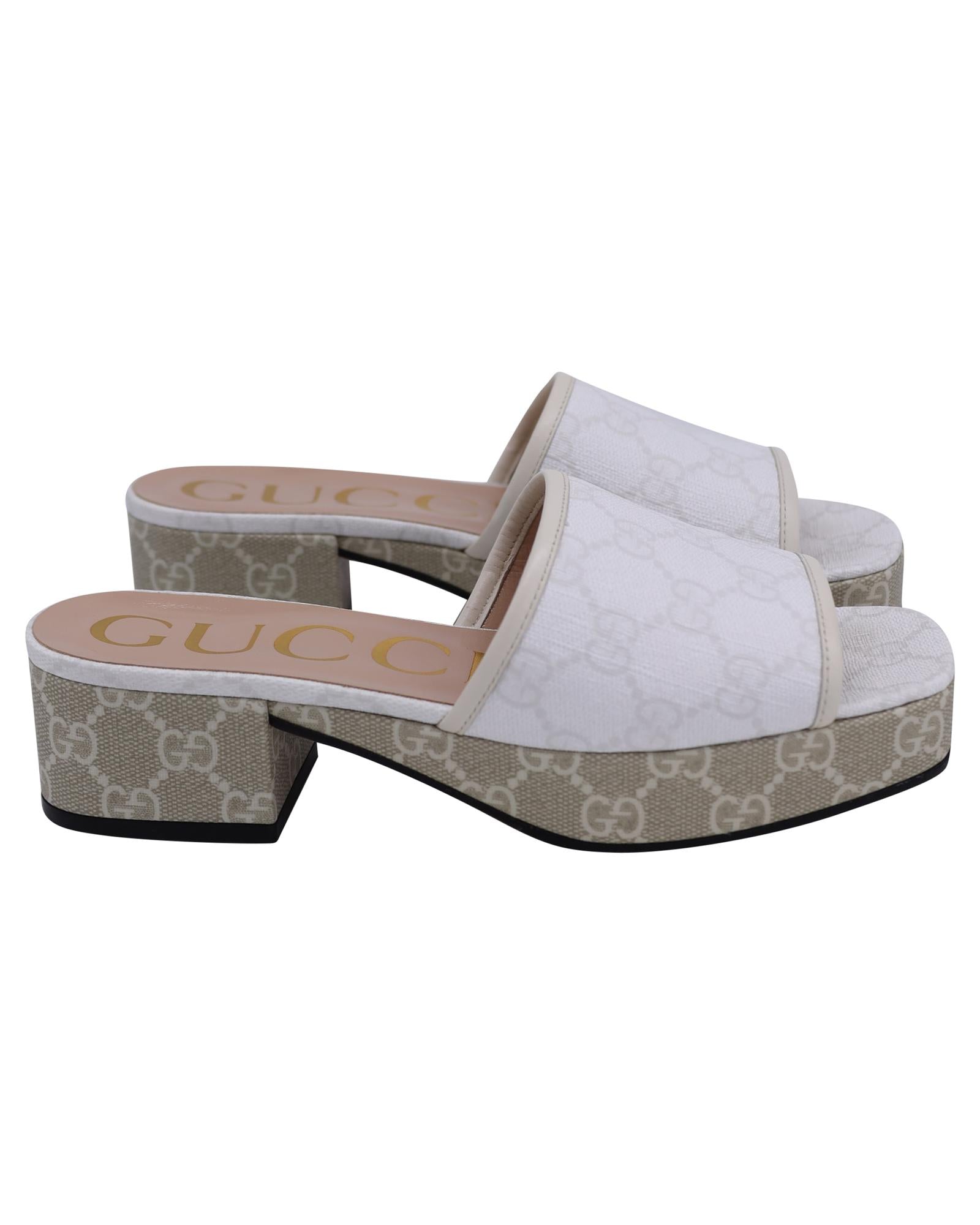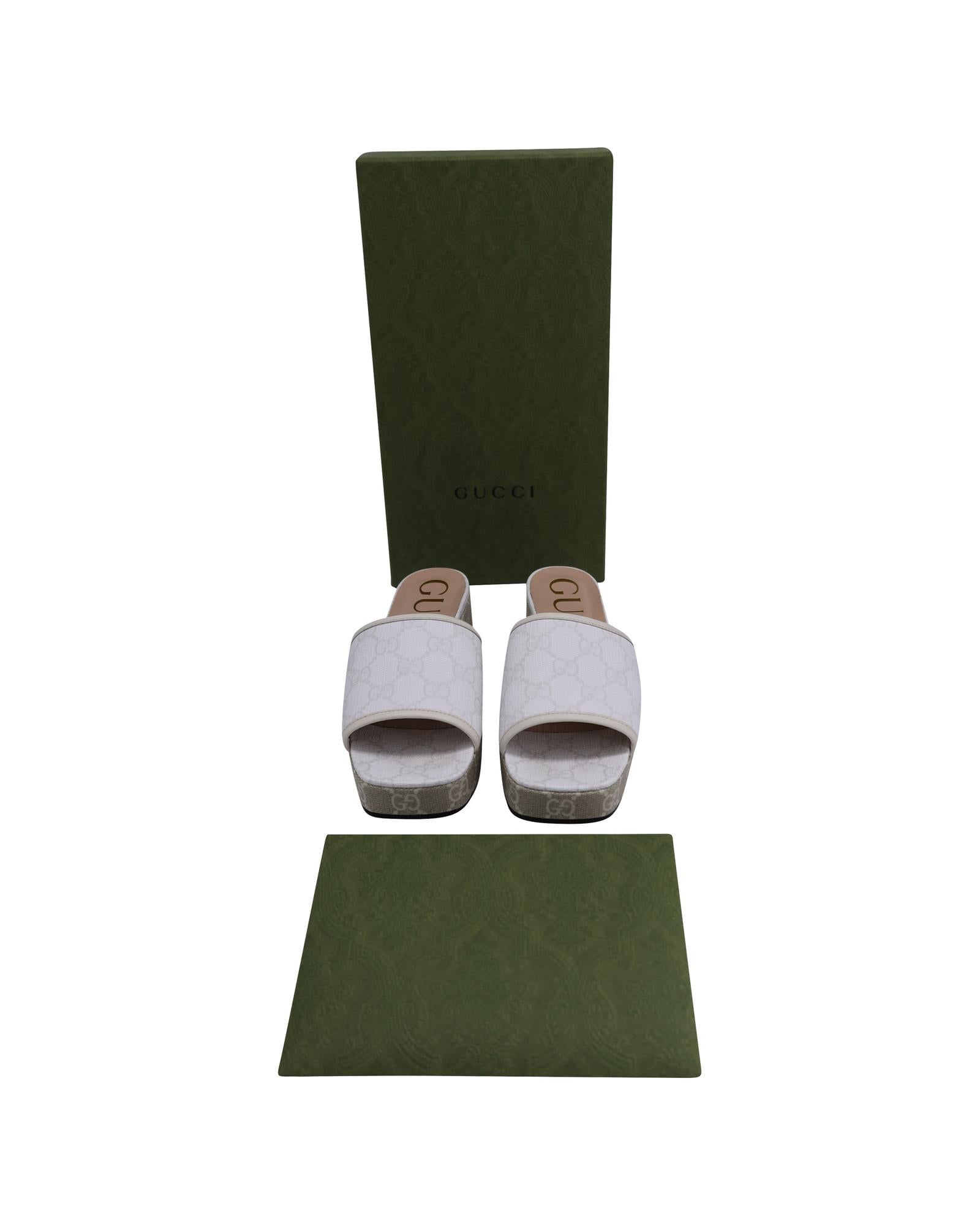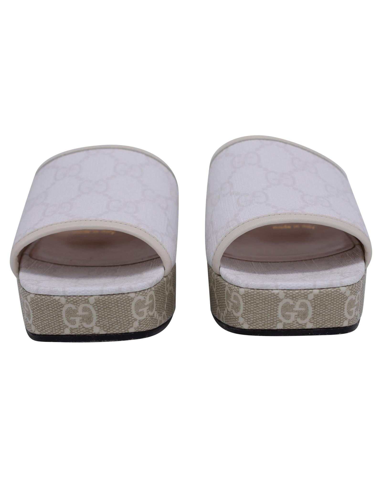 - Gucci GG Supreme Monogram Malaga Kid Platform Slides in White Canvas