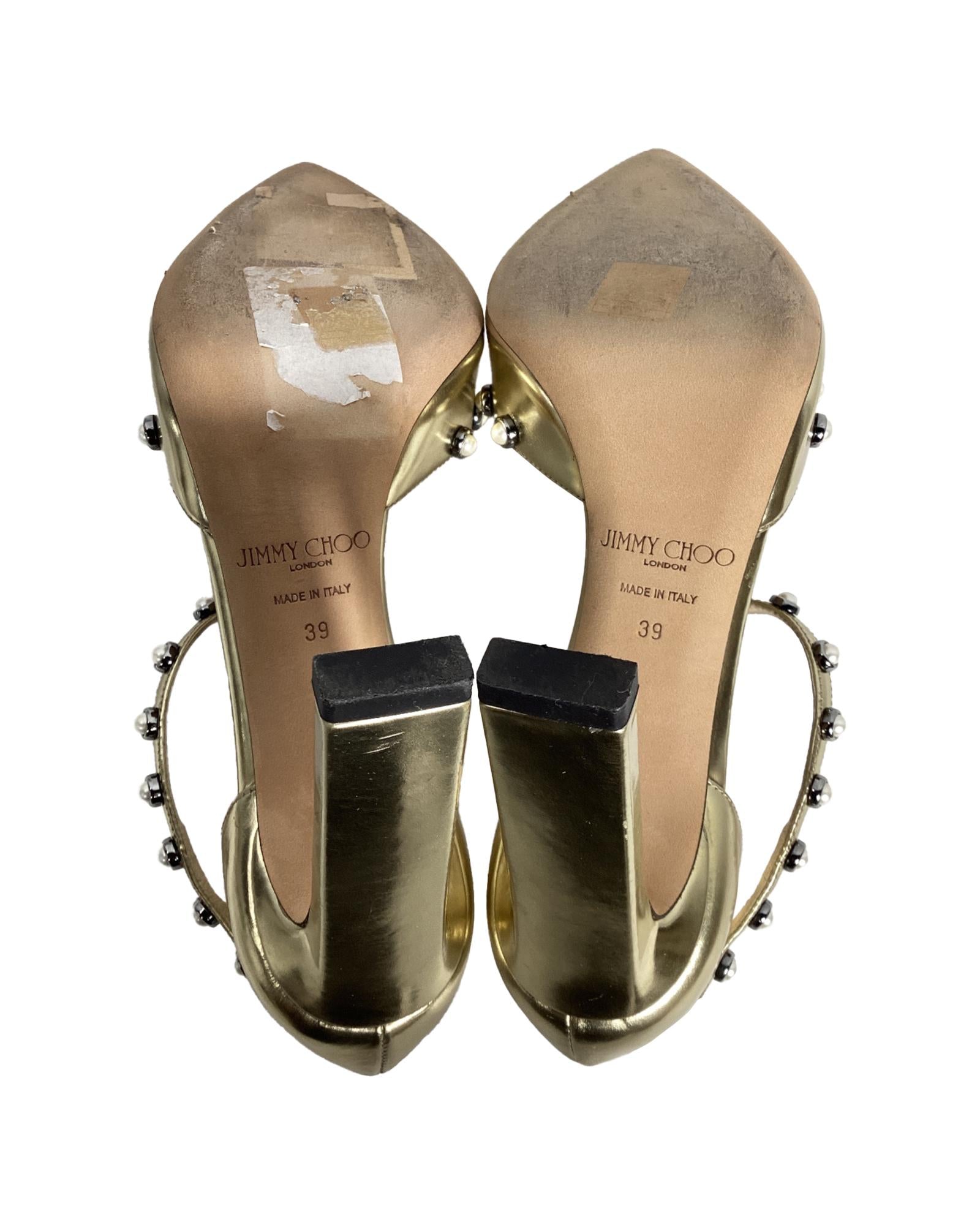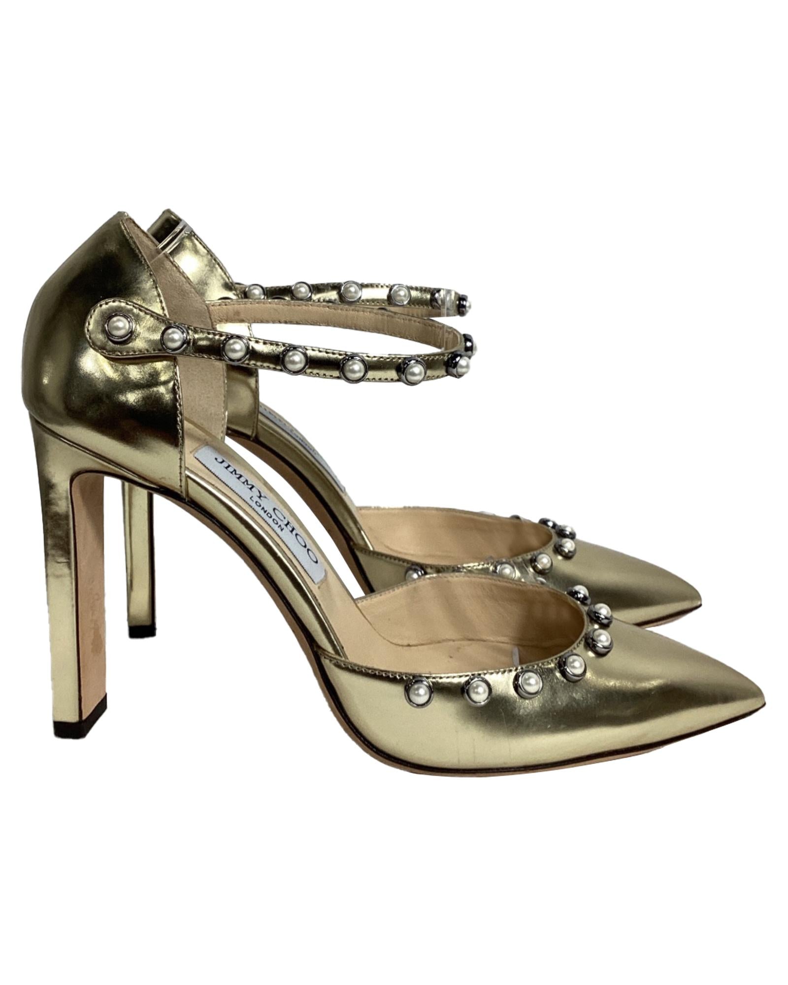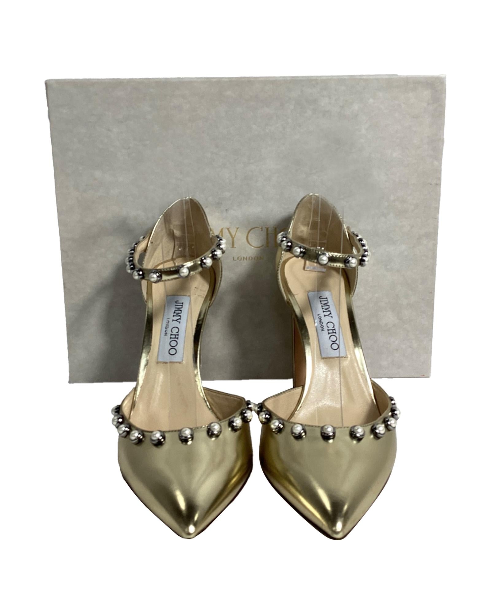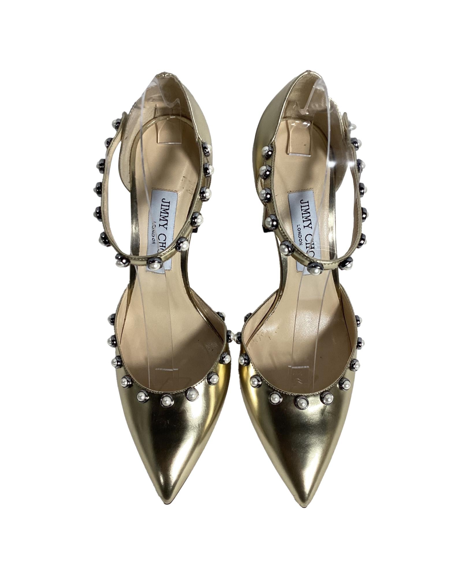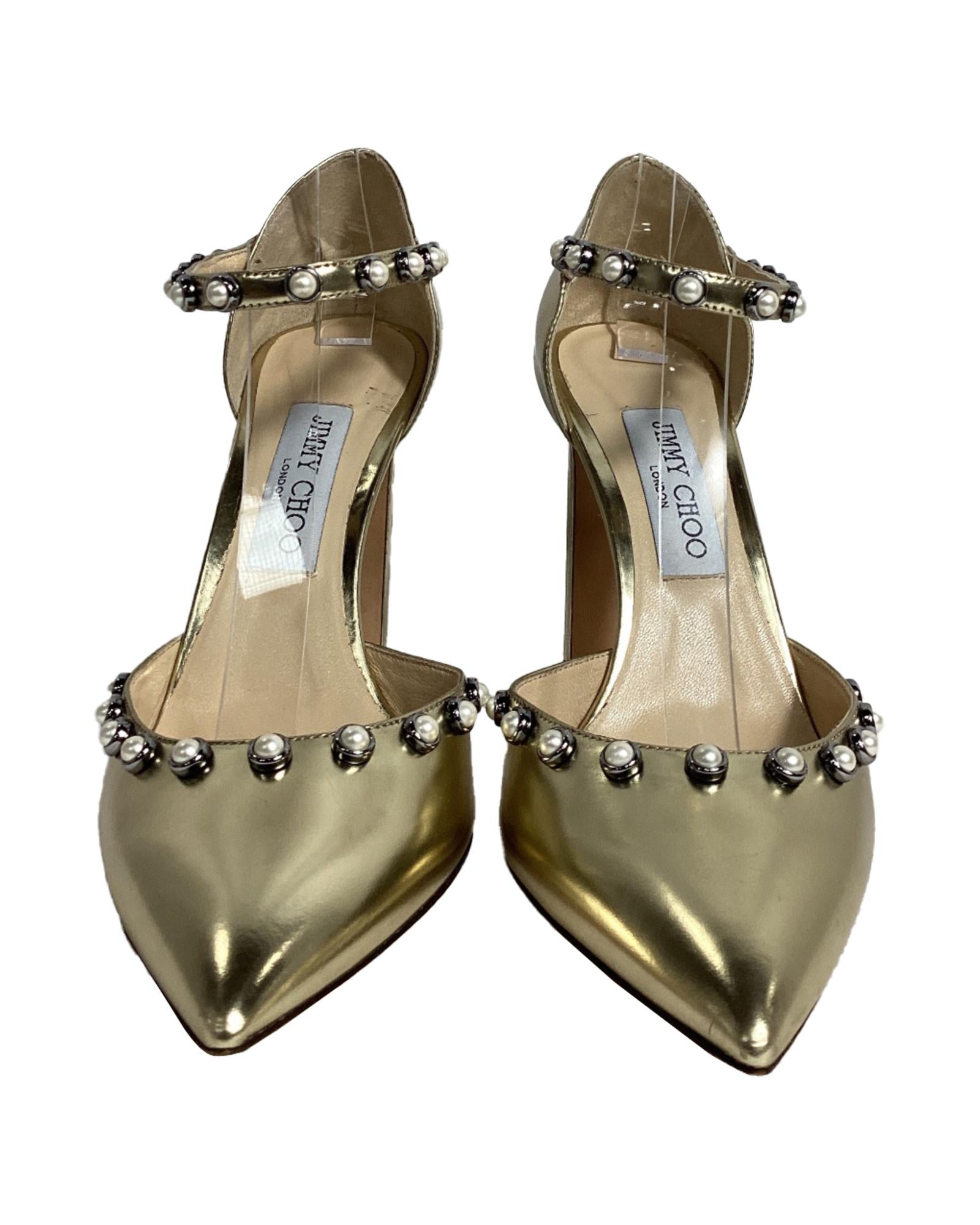 - Jimmy Choo Leema Faux Pearl Accents DOrsay Pumps in Gold Leather