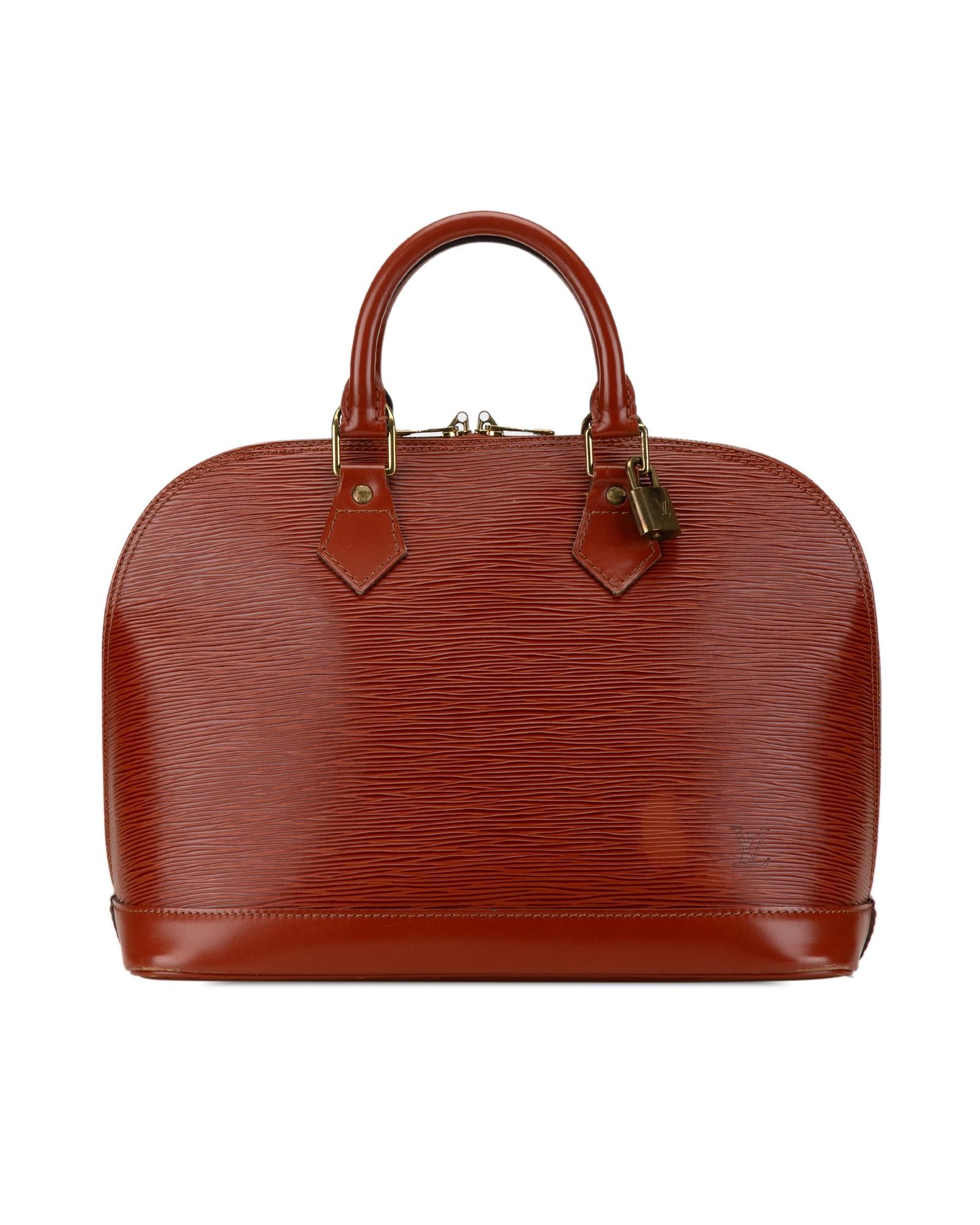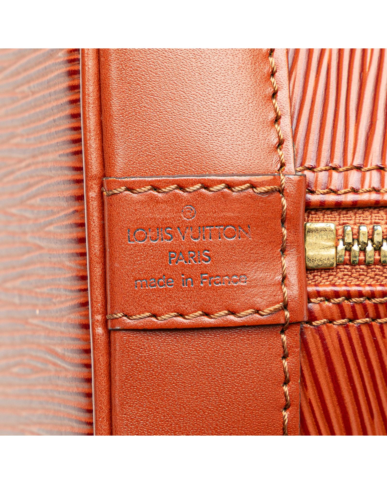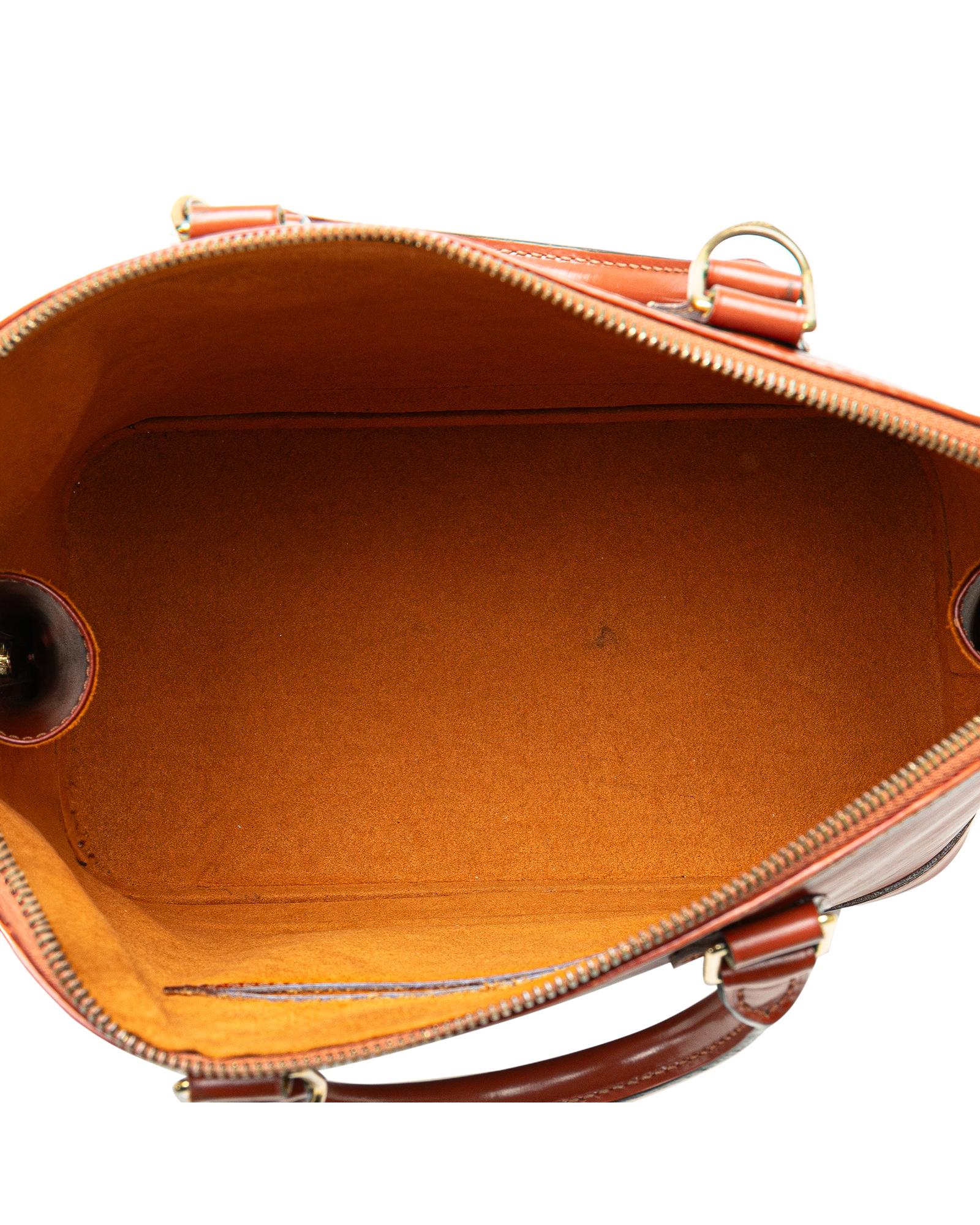 The Alma PM features an epi leather body rolled leather handles a top zip closure and an interior slip pocket.