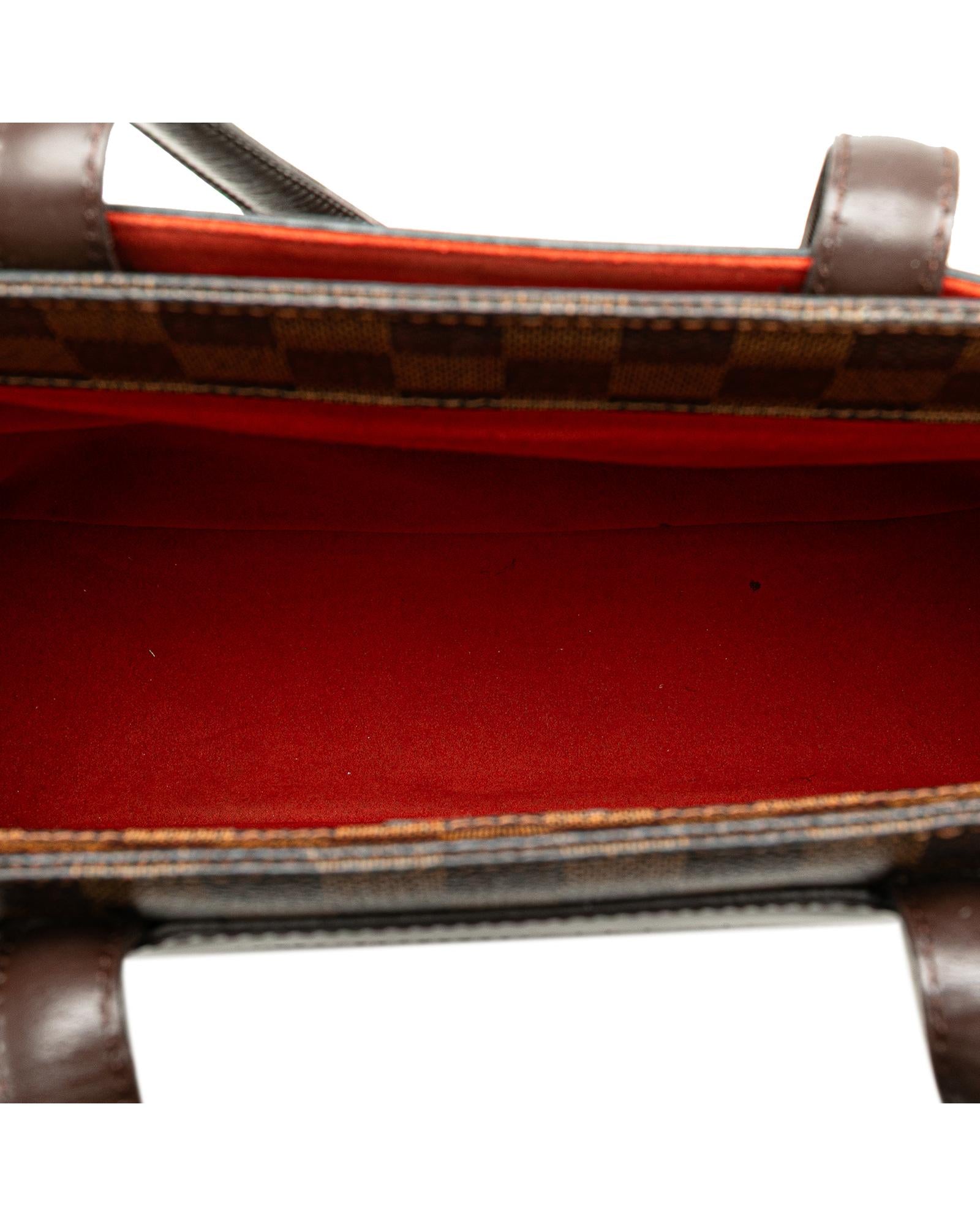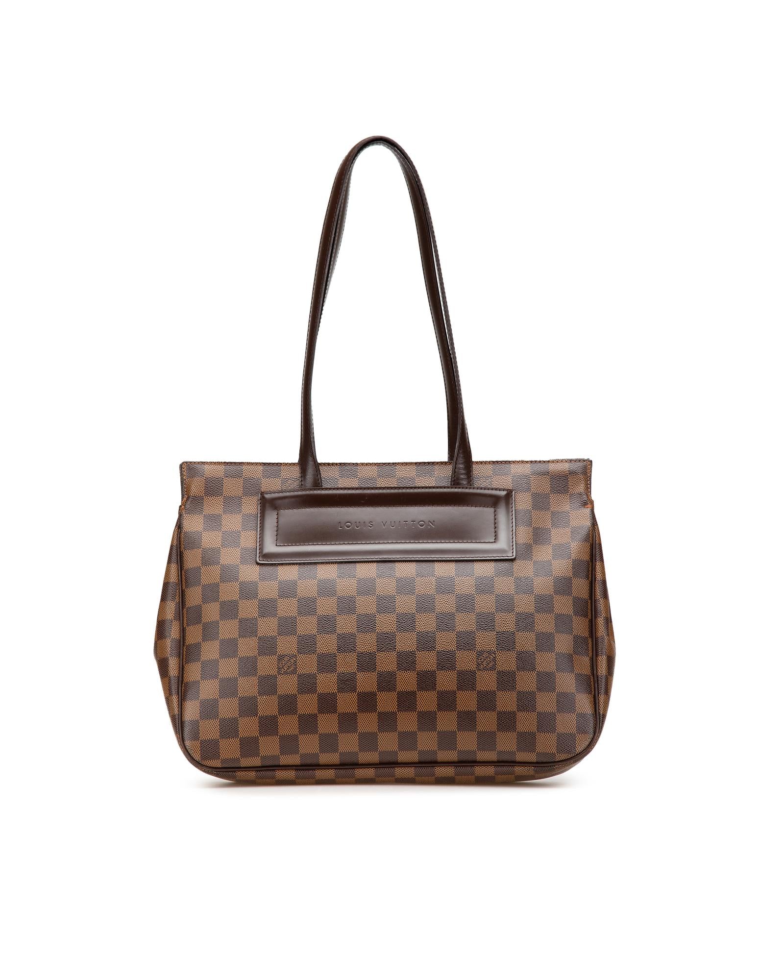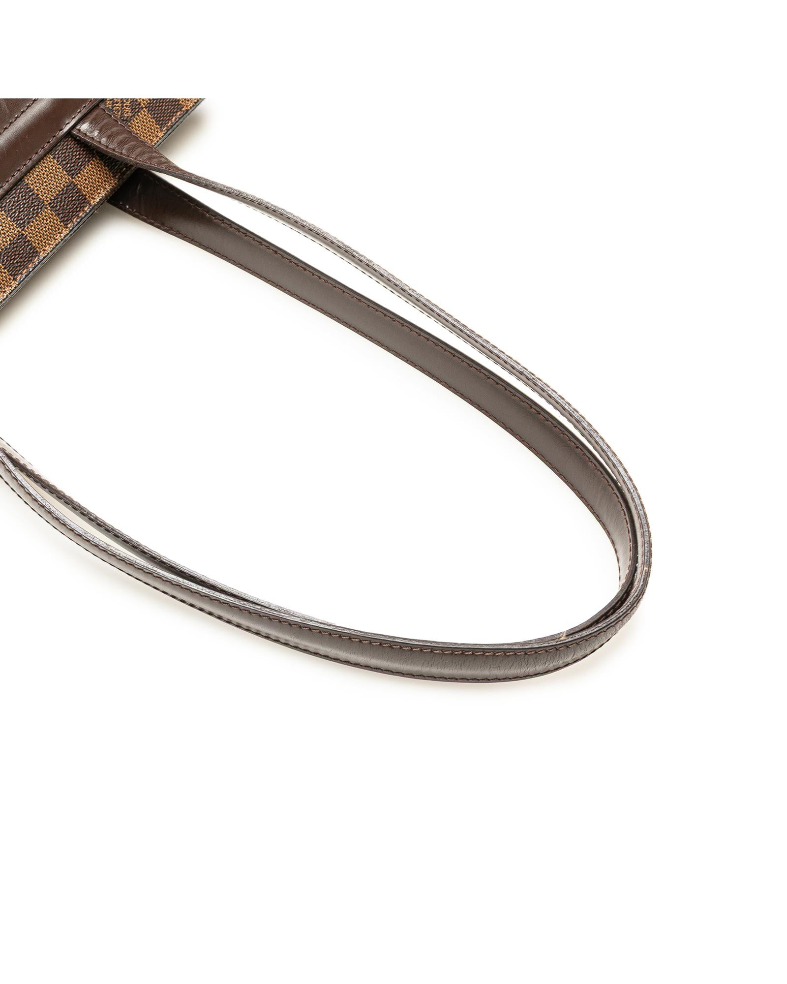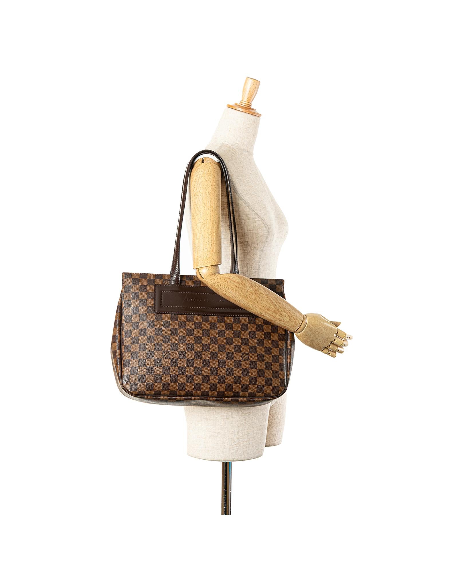 The Parioli PM features a damier ebene canvas body with leather trim flat leather straps an open top with magnetic snap closure and interior slip pockets.Brand: Louis Vuitton