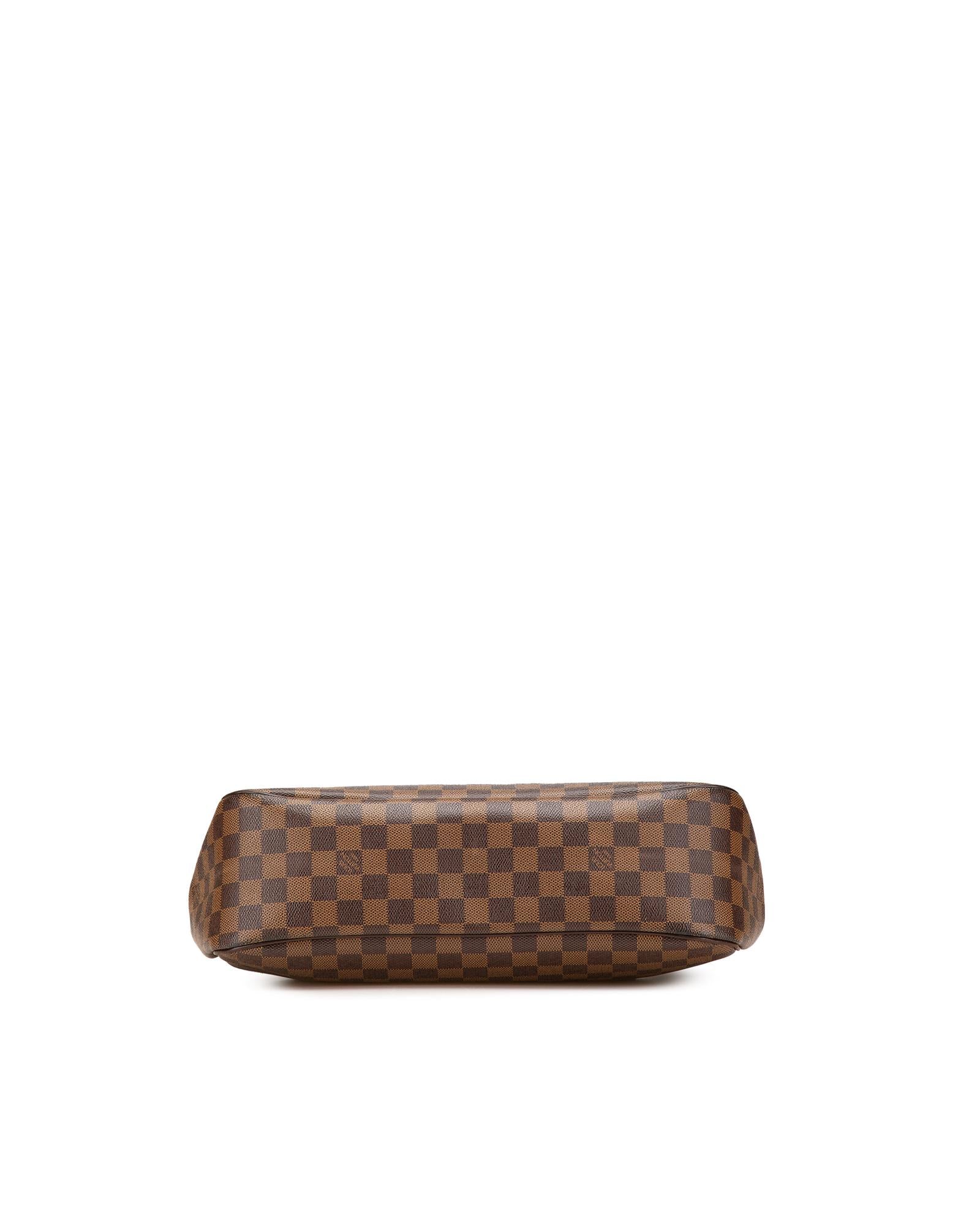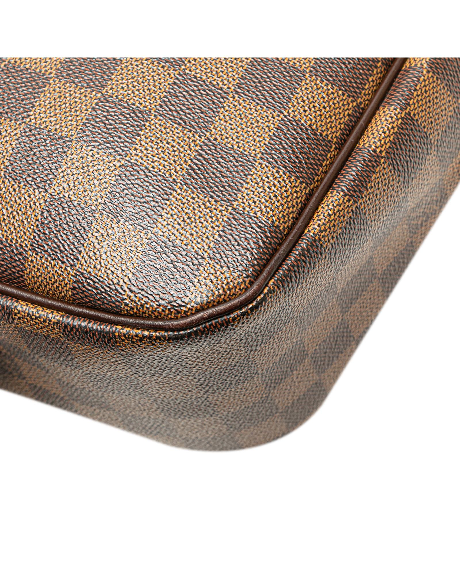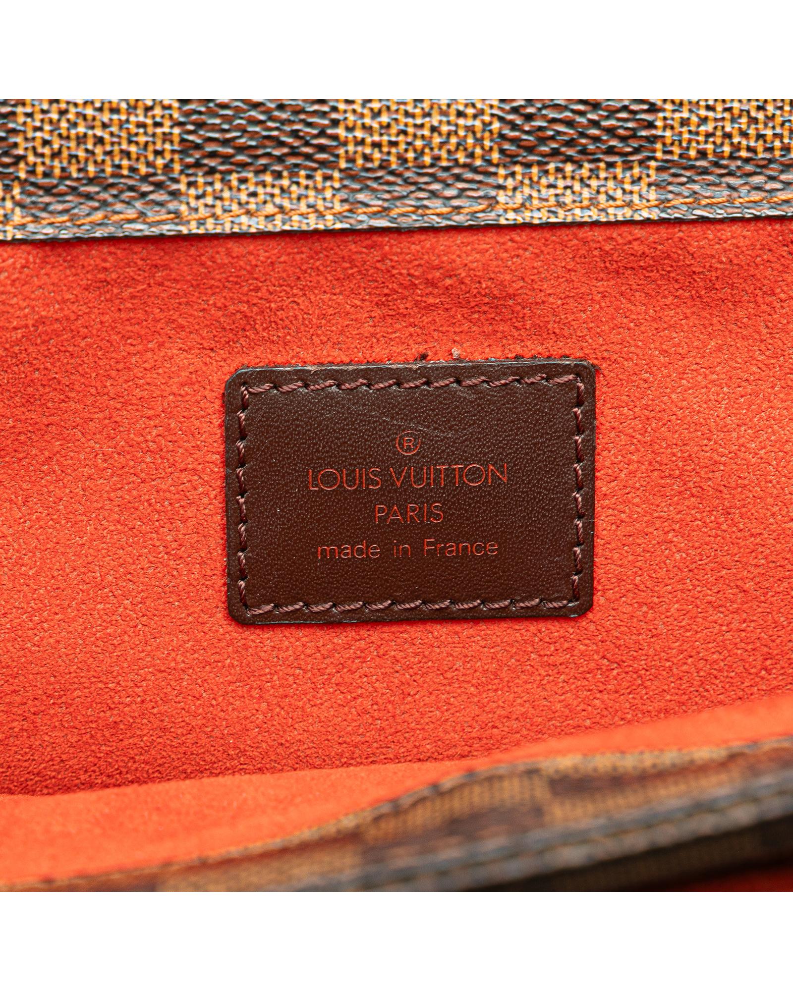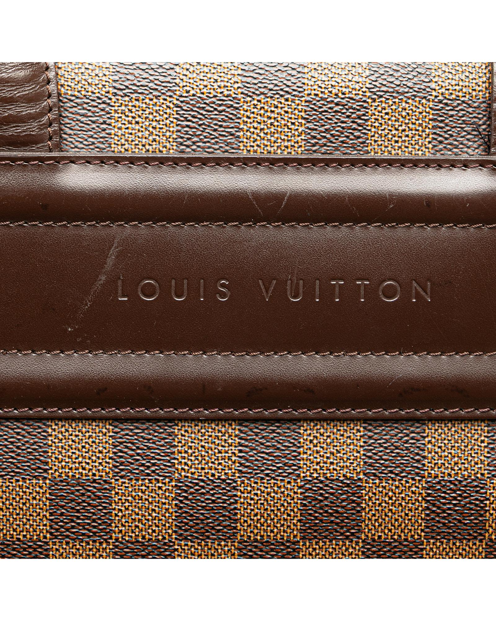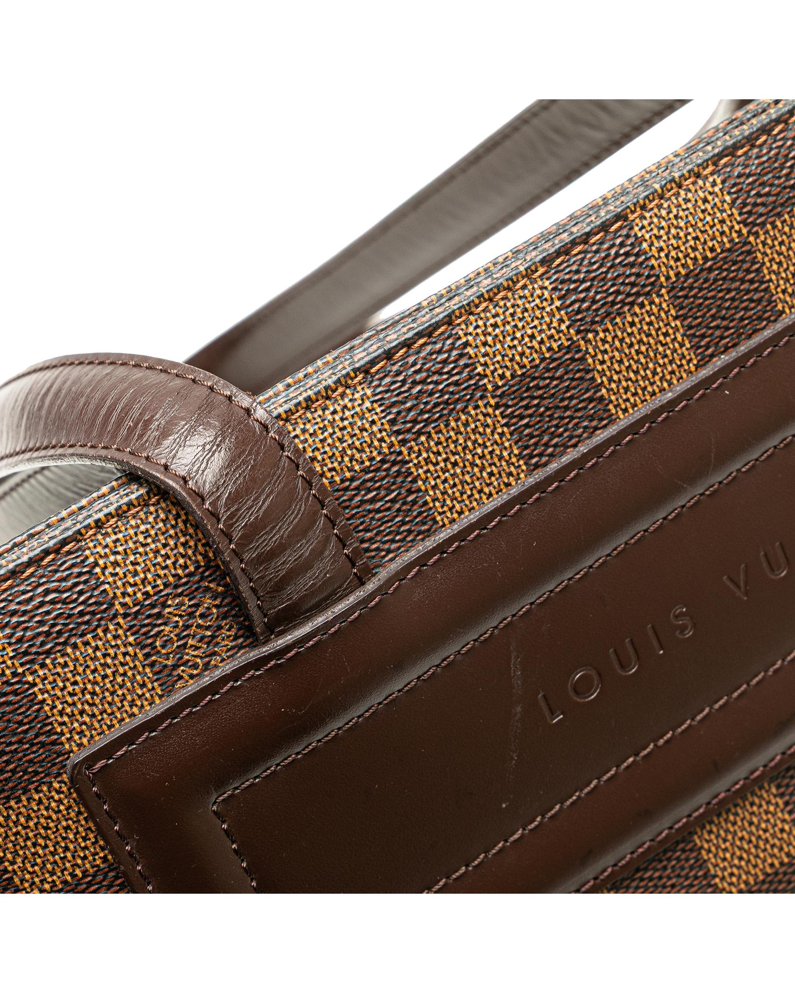 The Parioli PM features a damier ebene canvas body with leather trim flat leather straps an open top with magnetic snap closure and interior slip pockets.Brand: Louis Vuitton