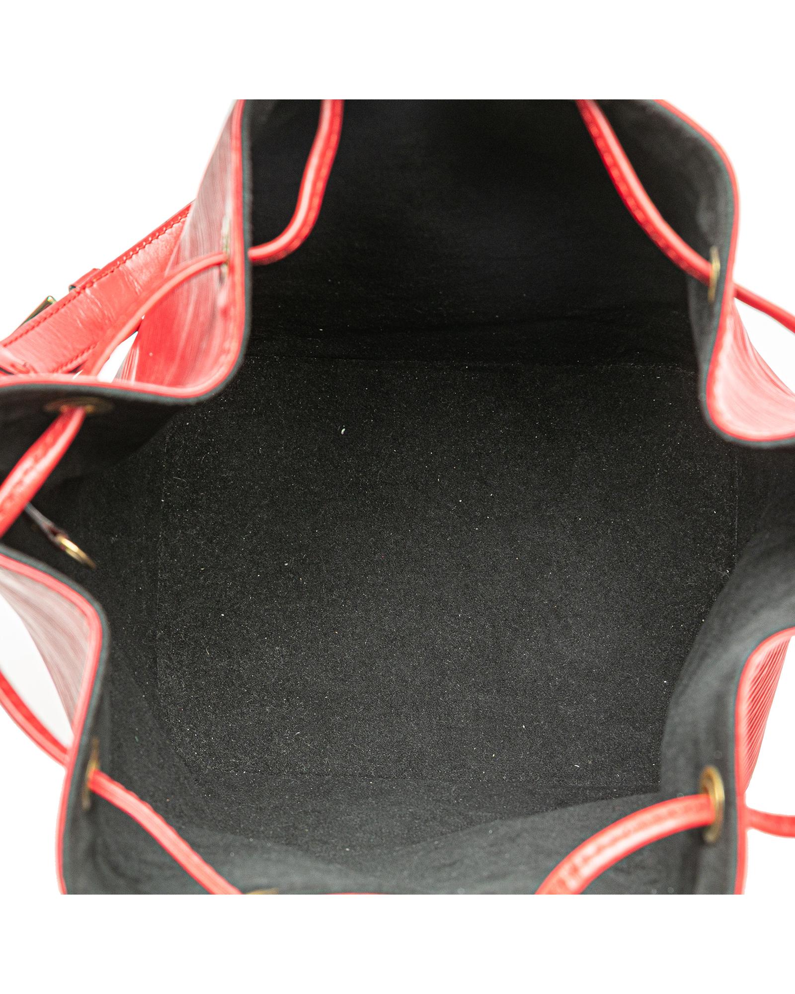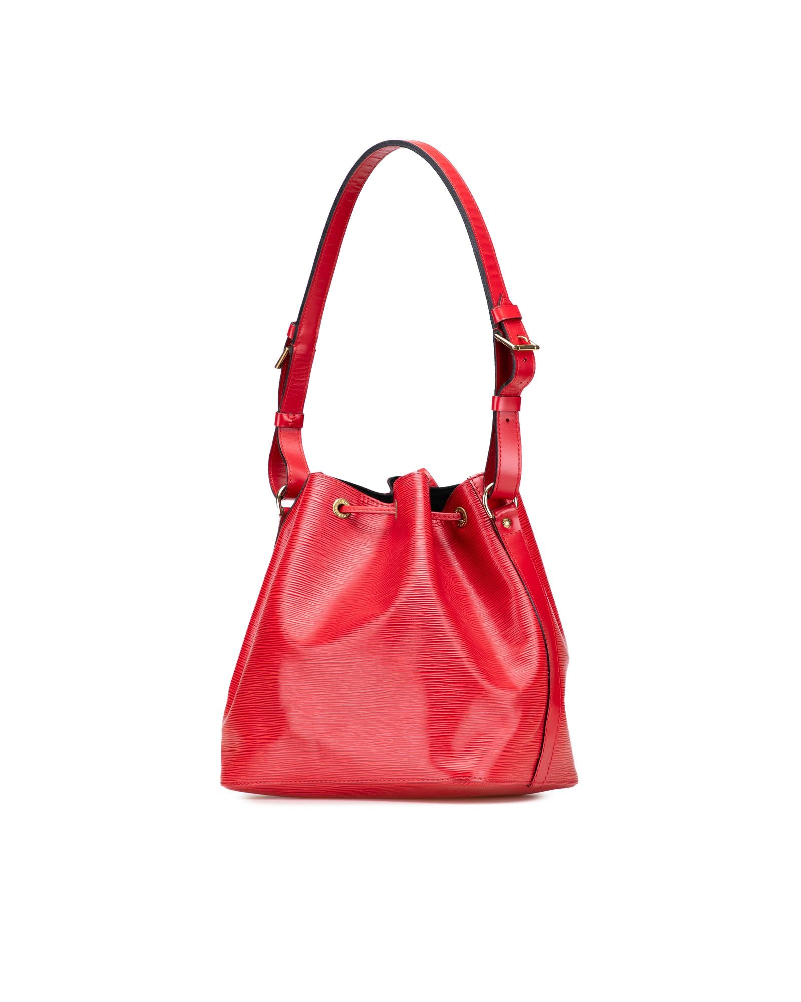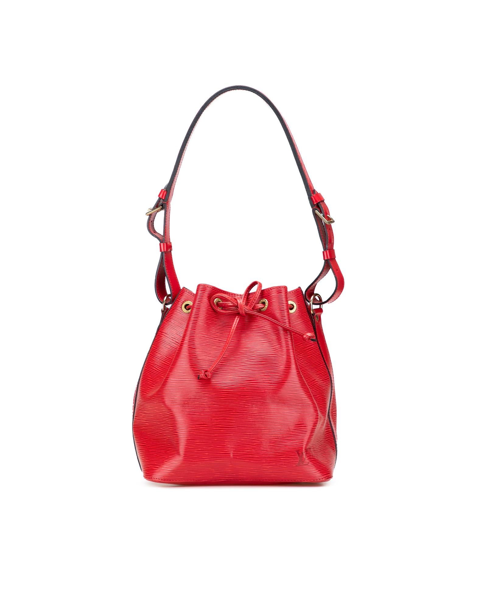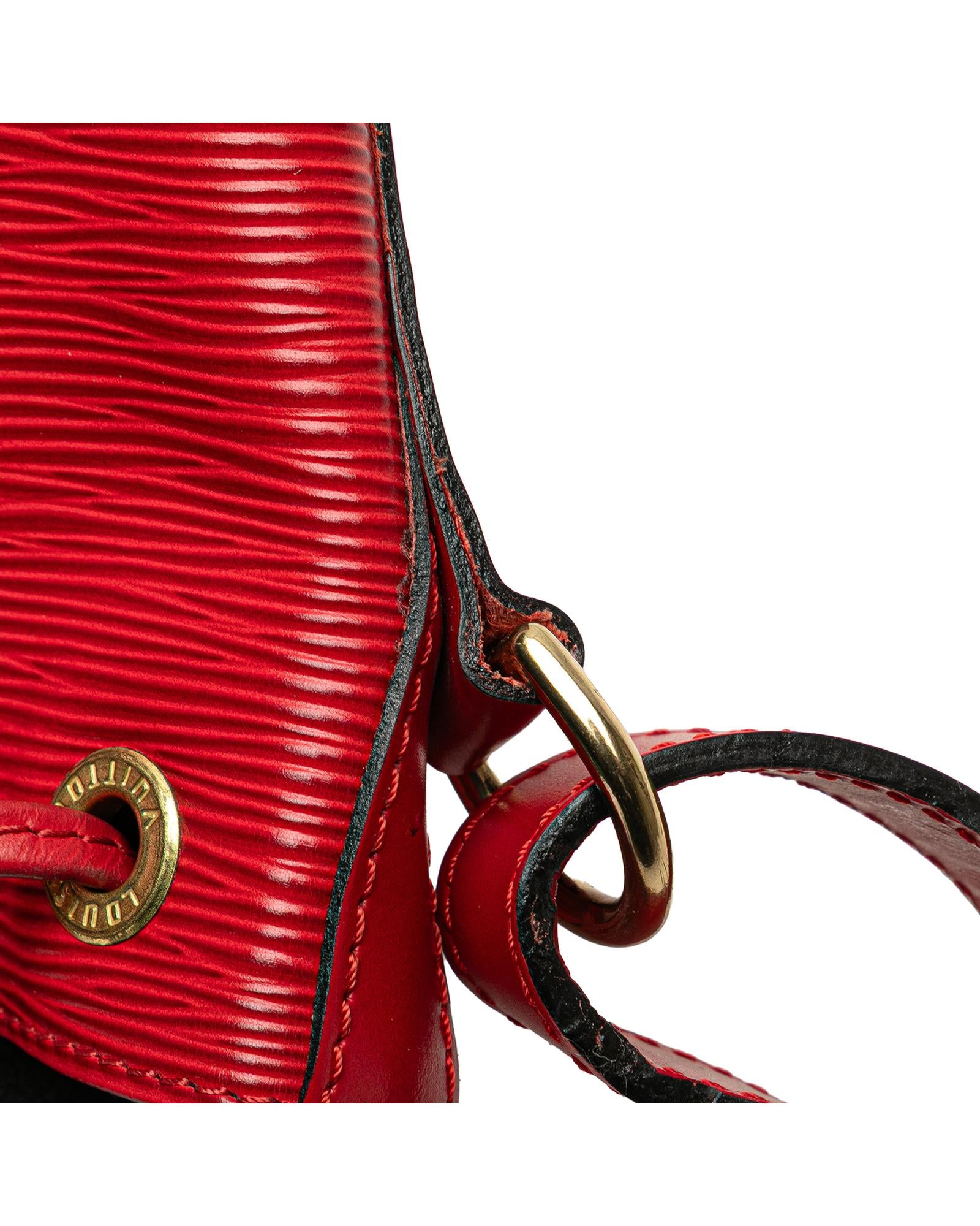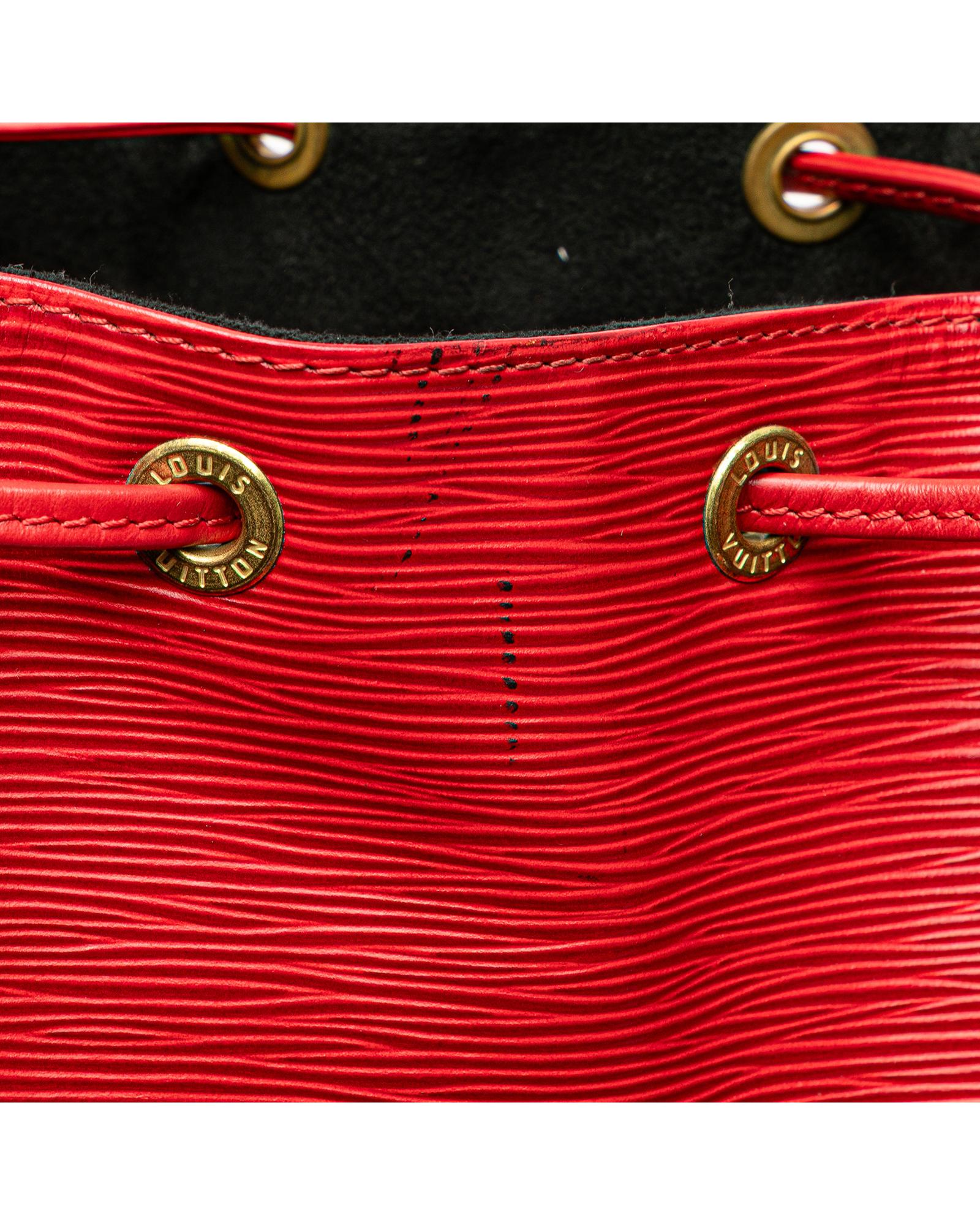 The Petit Noe features an epi leather body flat leather shoulder straps and a drawstring closure.