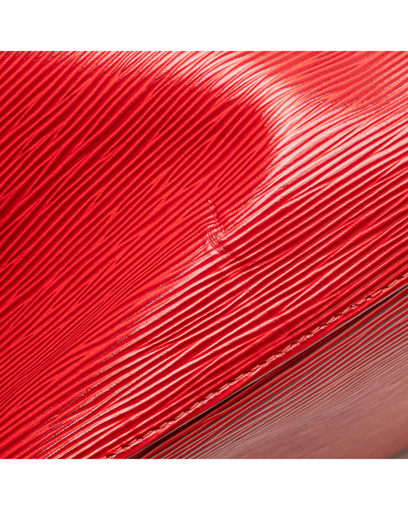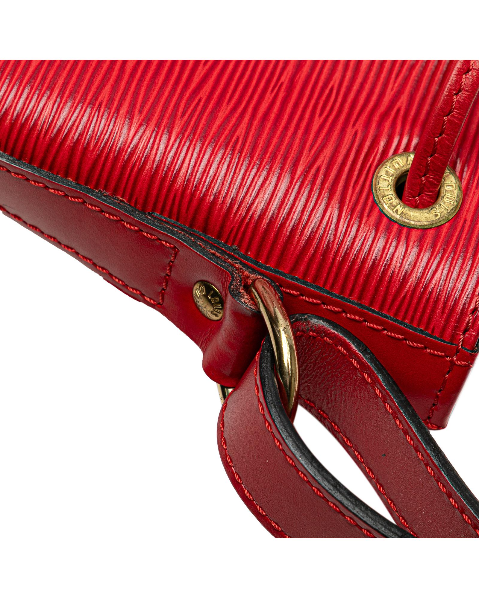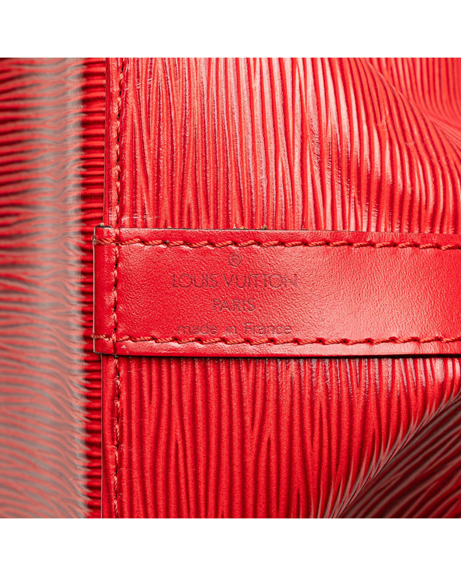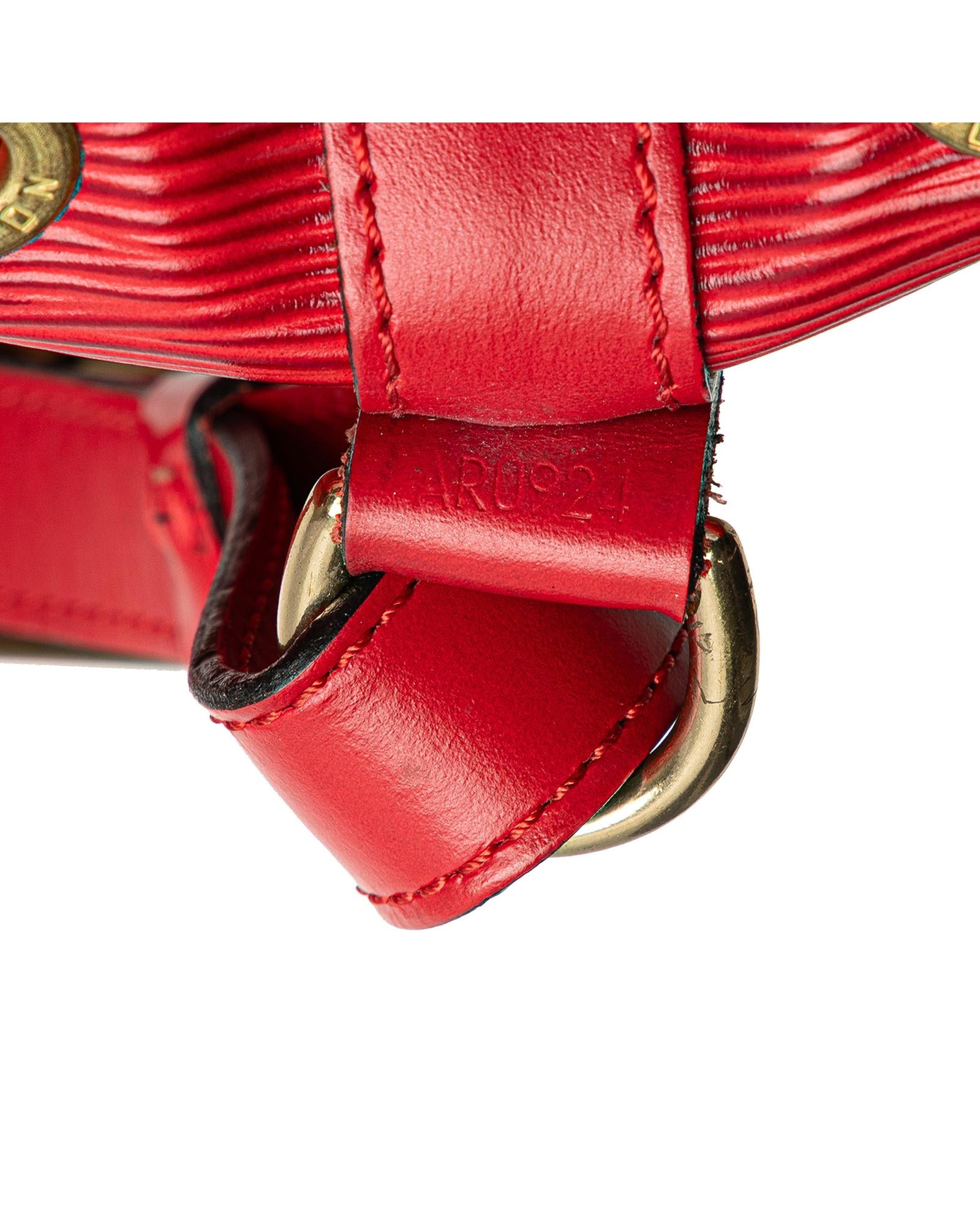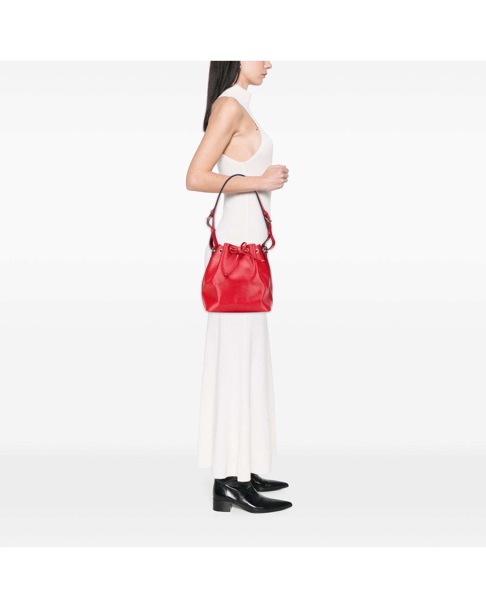 The Petit Noe features an epi leather body flat leather shoulder straps and a drawstring closure.