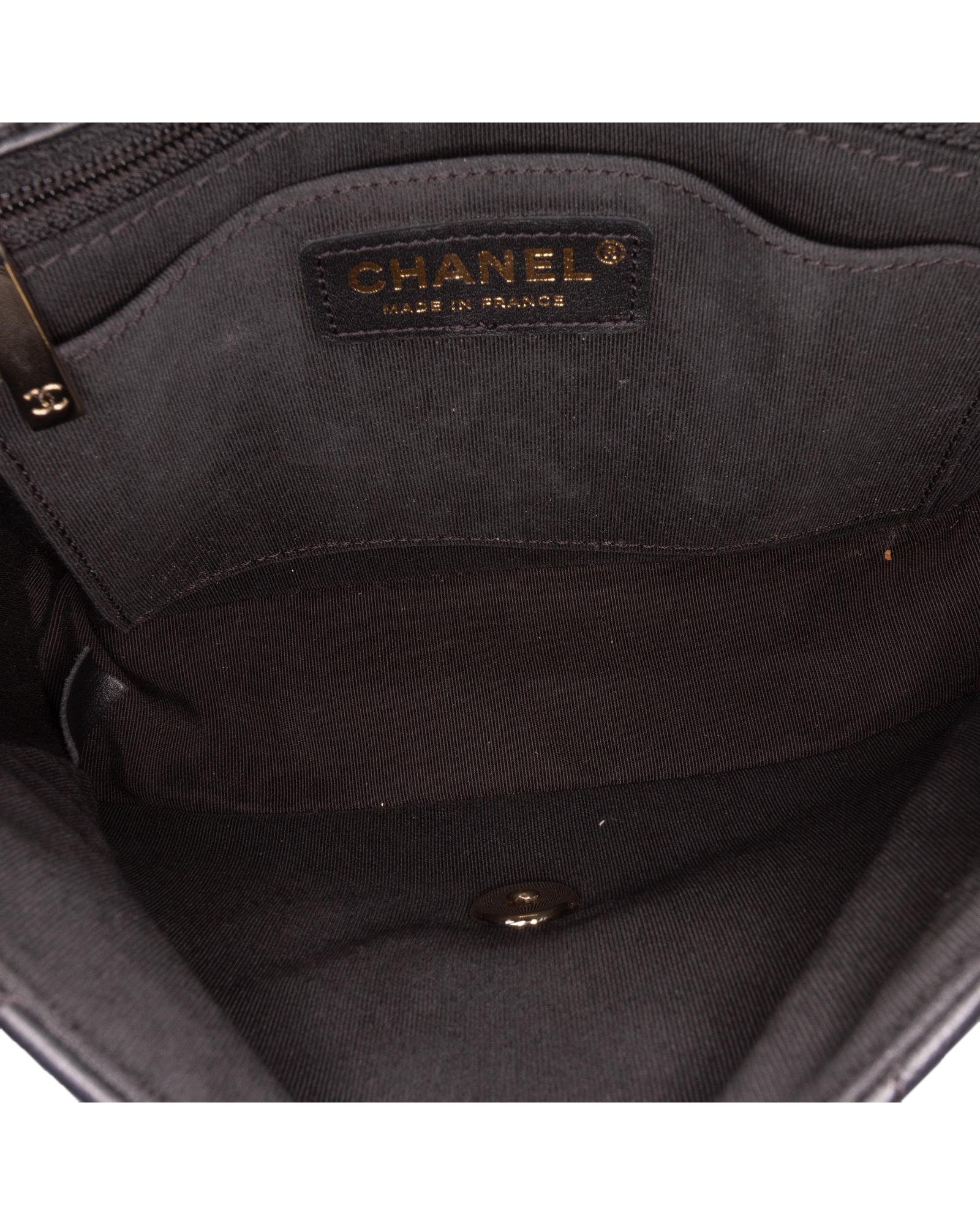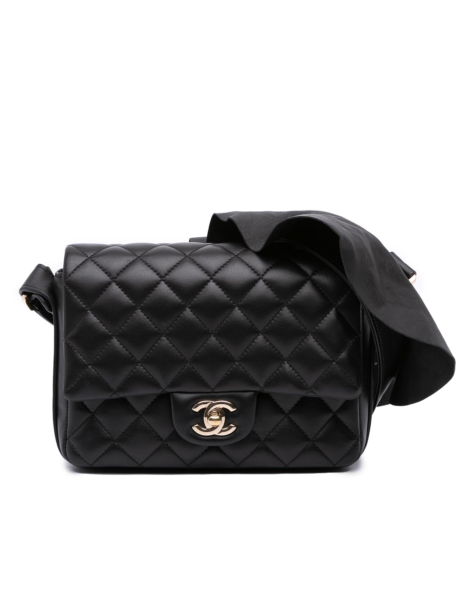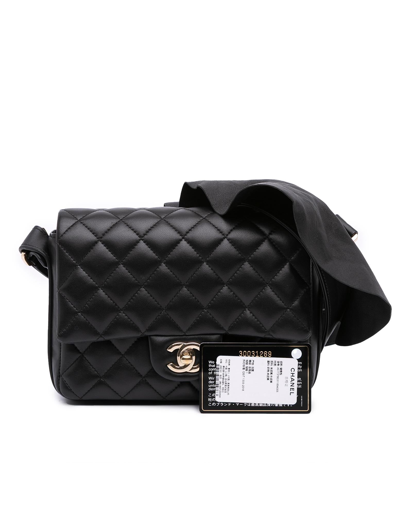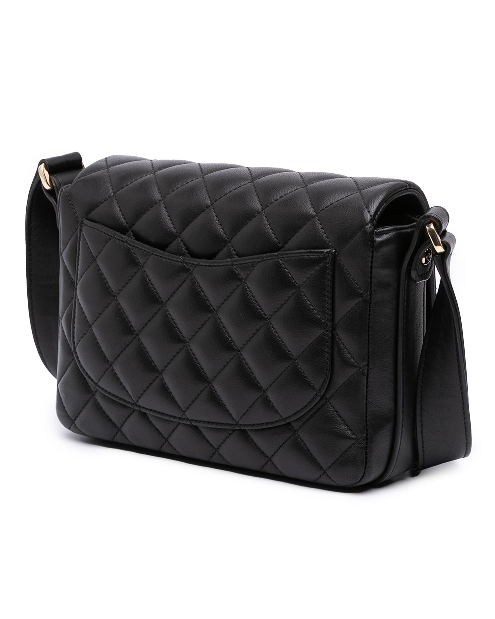This bag features a quilted calfskin body a flat leather shoulder strap with leather ruffle detail a front flap with CC turn lock closure an exterior back slip pocket and interior zip and slip pockets.Brand: Chanel Vintage