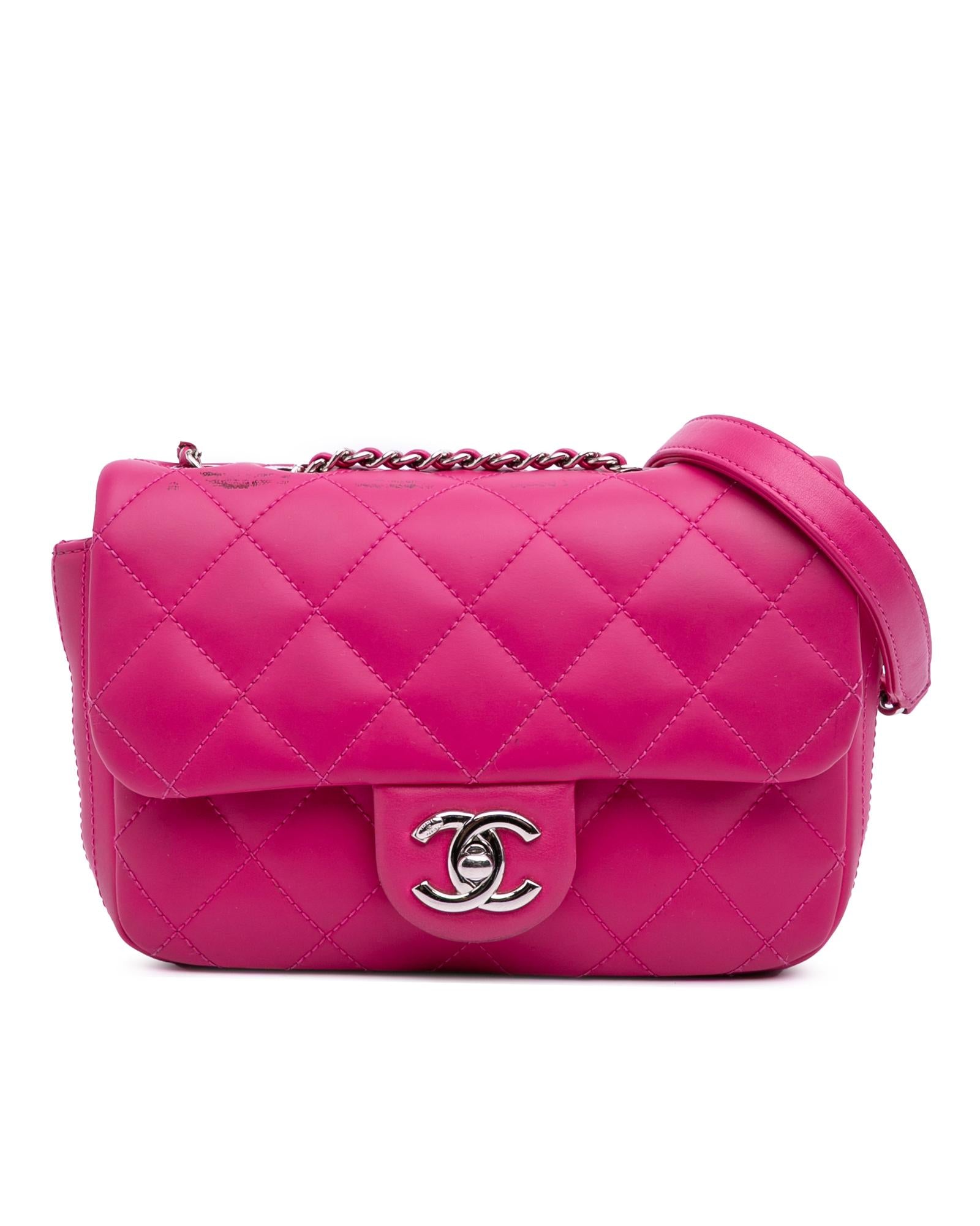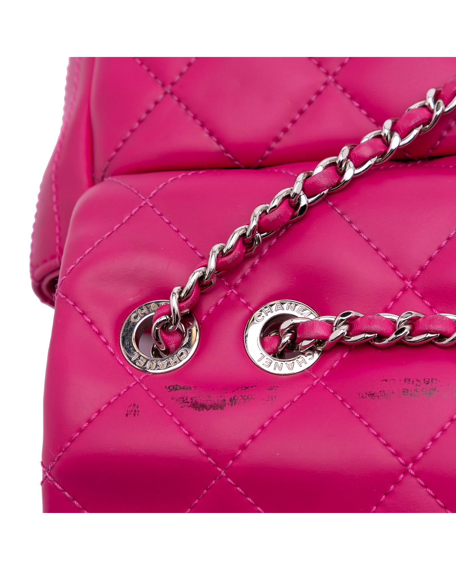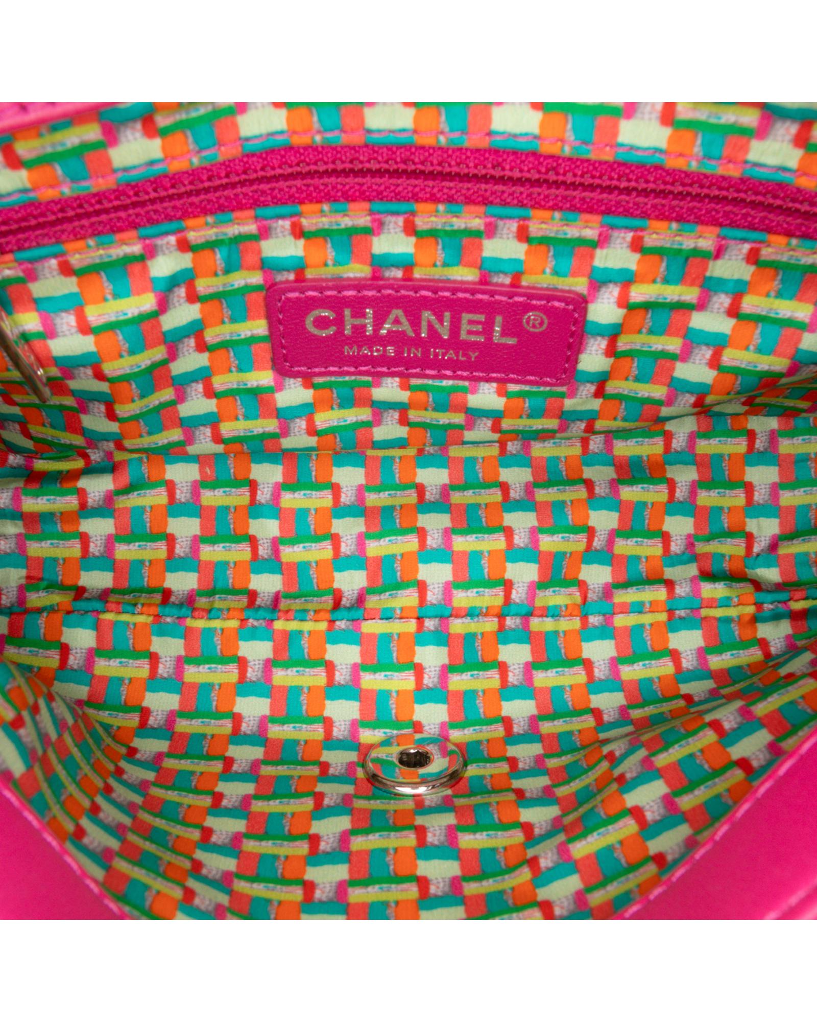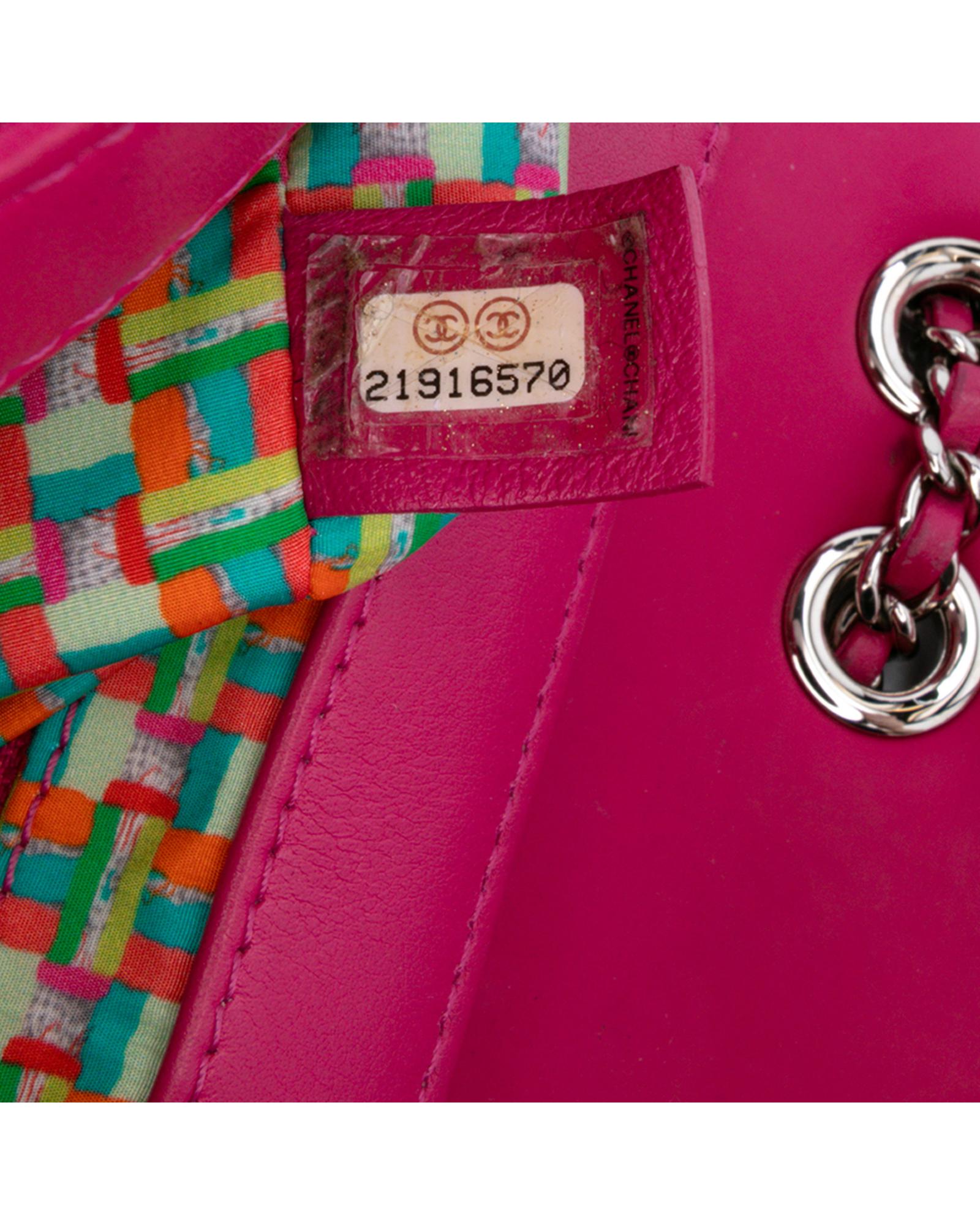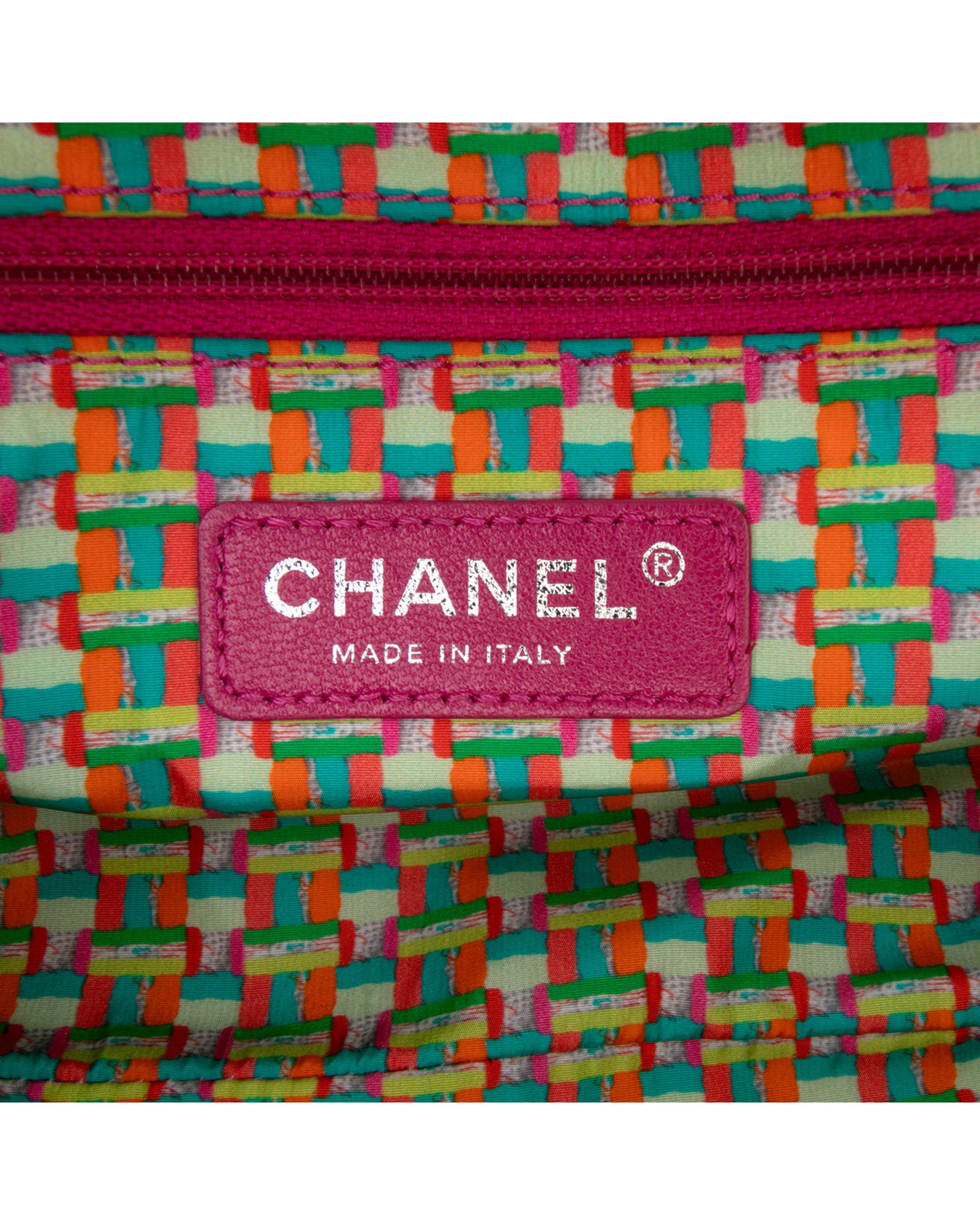 This flap bag features a quilted rubber body a leather-woven chain strap with leather guard a front flap with interlocking Cs and a twist lock closure an exterior back zip pocket and an interior zip pocket.Brand: Chanel Vintage