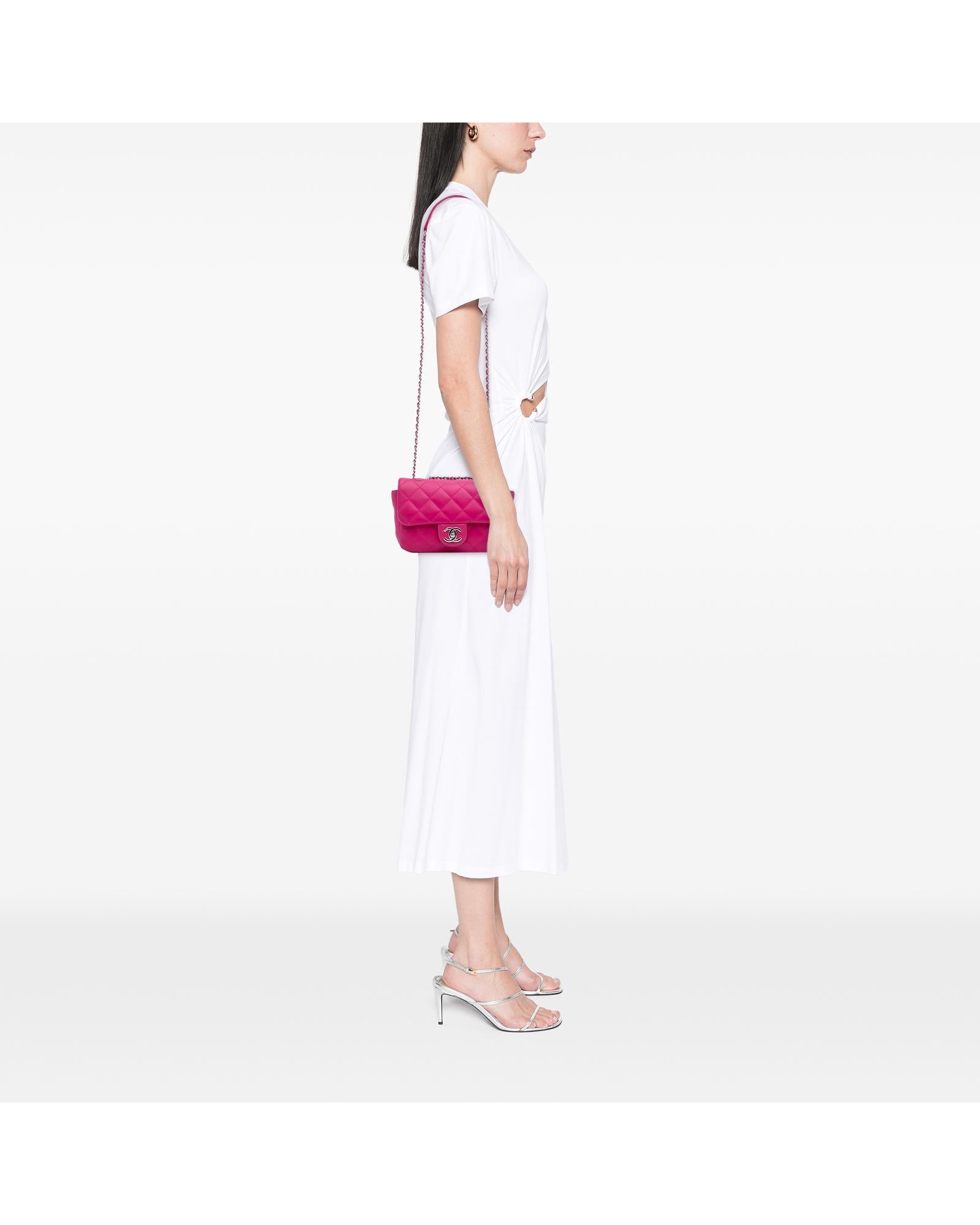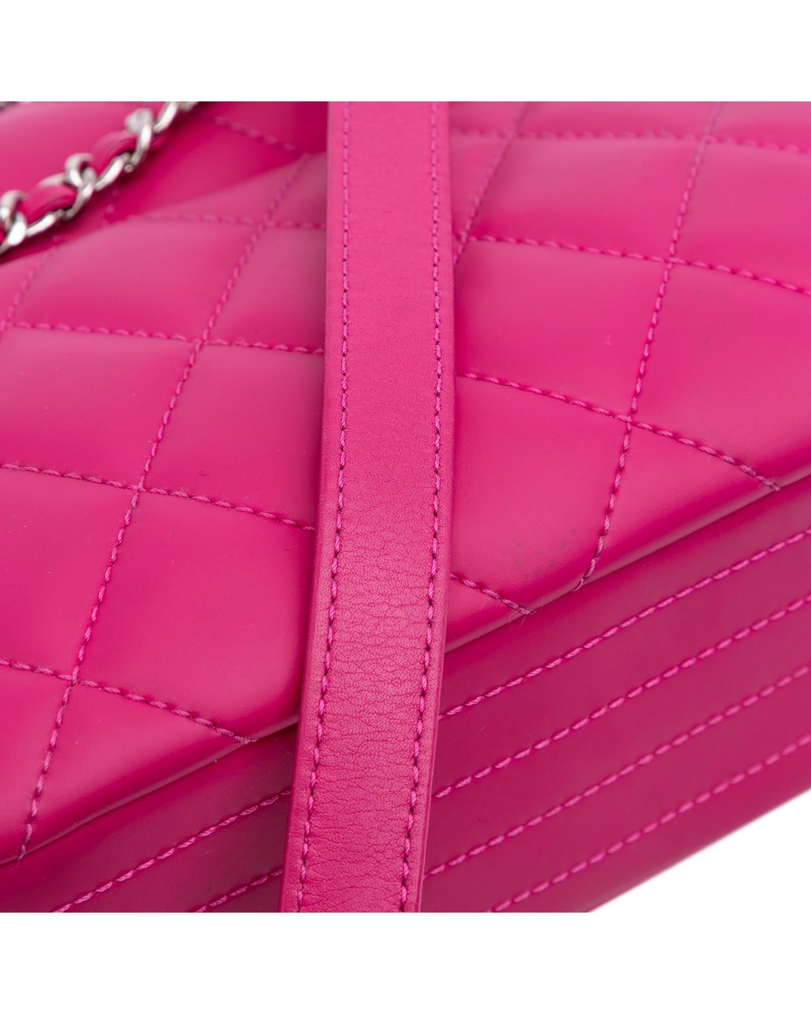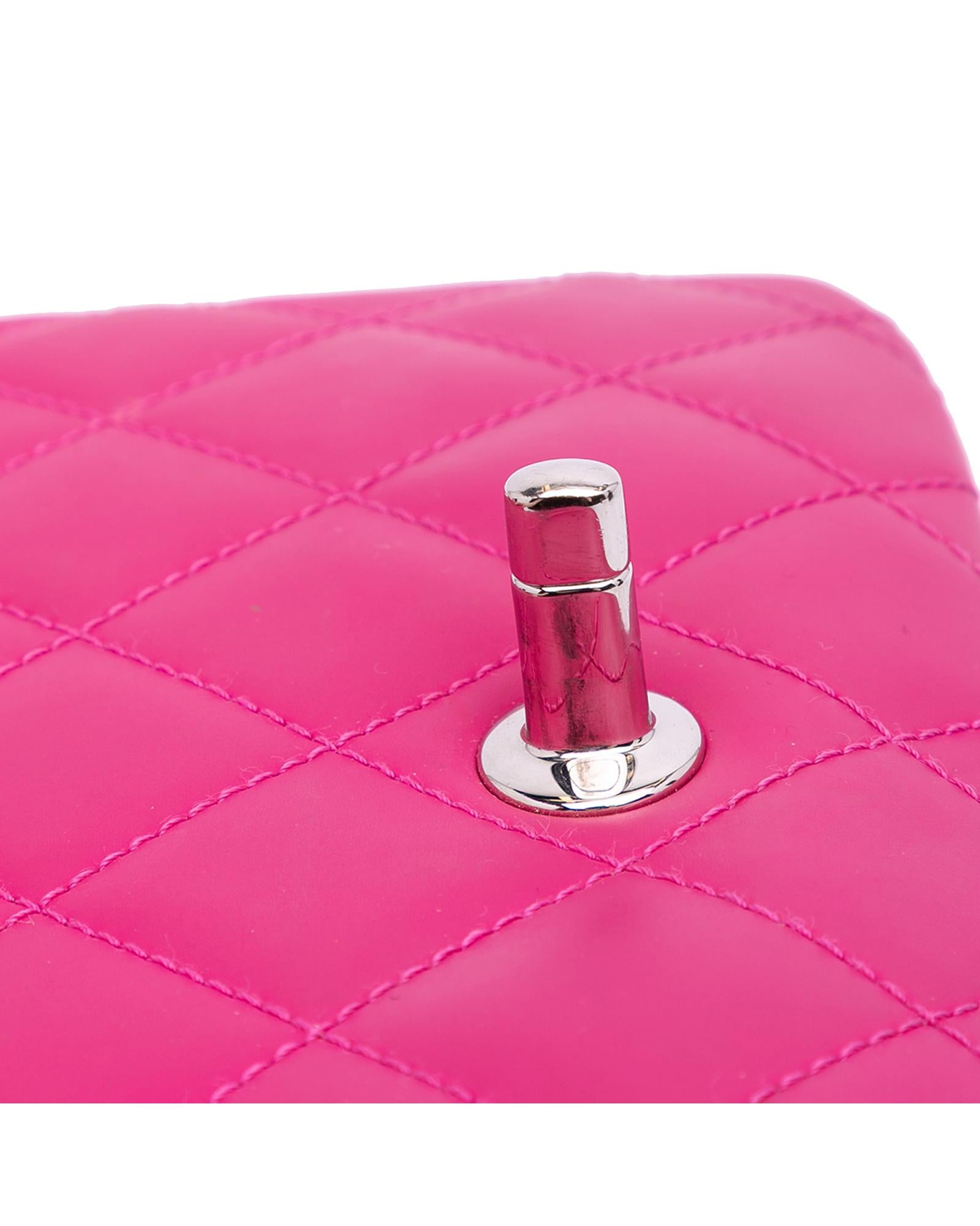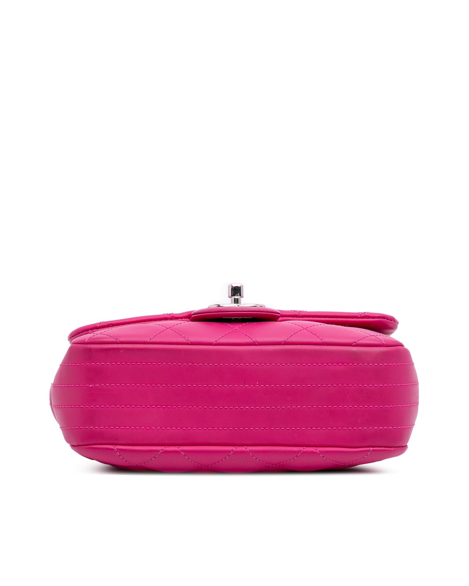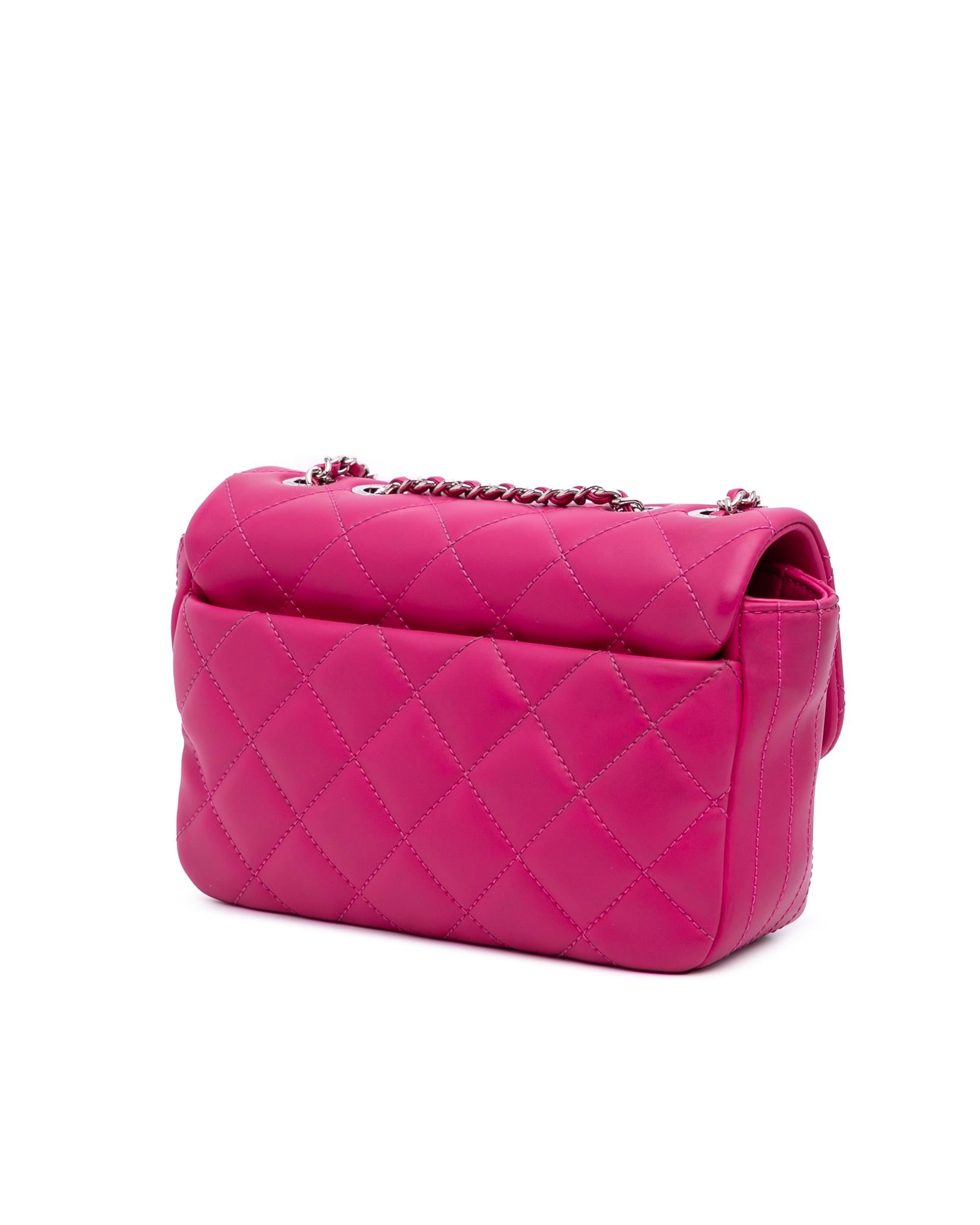 This flap bag features a quilted rubber body a leather-woven chain strap with leather guard a front flap with interlocking Cs and a twist lock closure an exterior back zip pocket and an interior zip pocket.Brand: Chanel Vintage