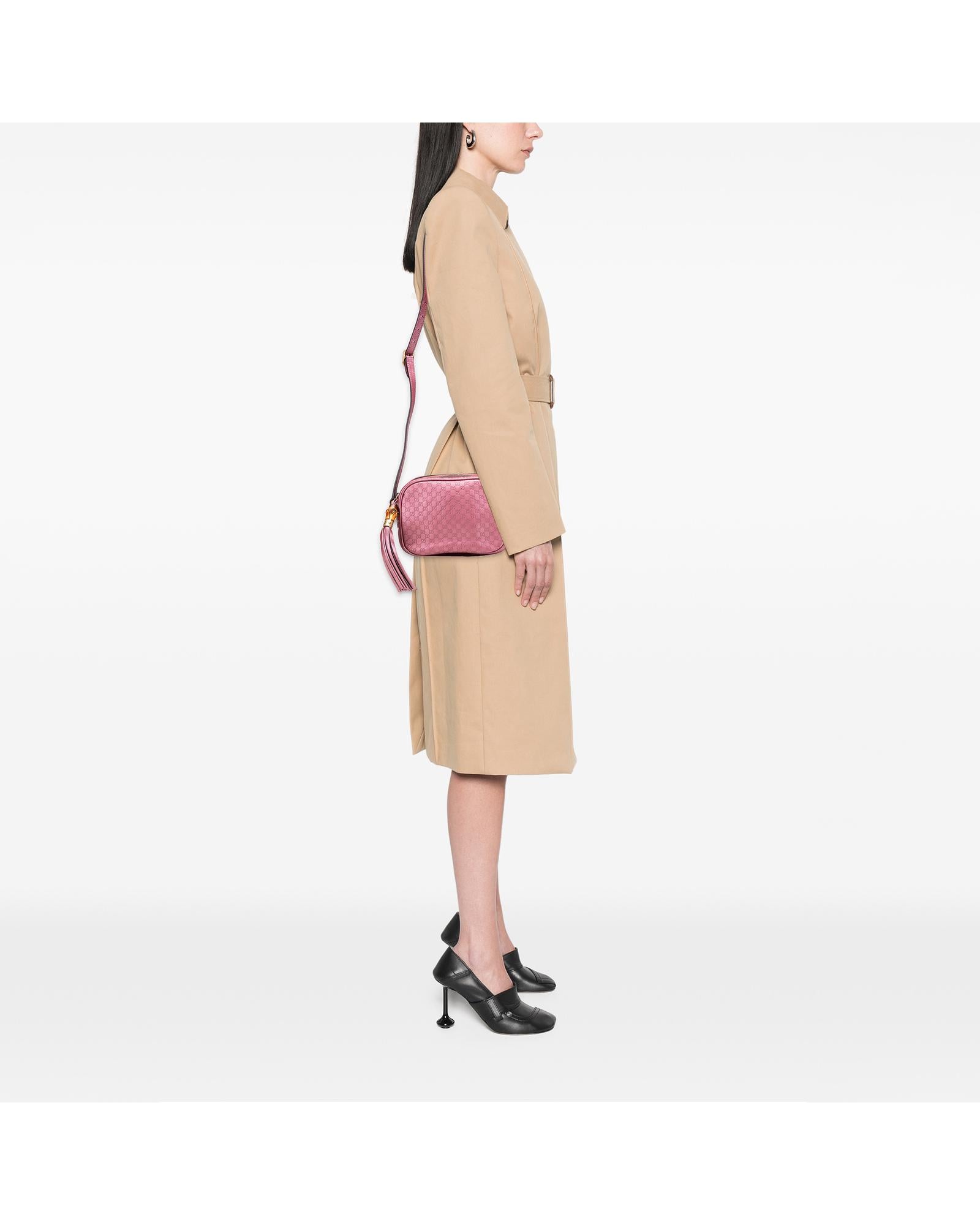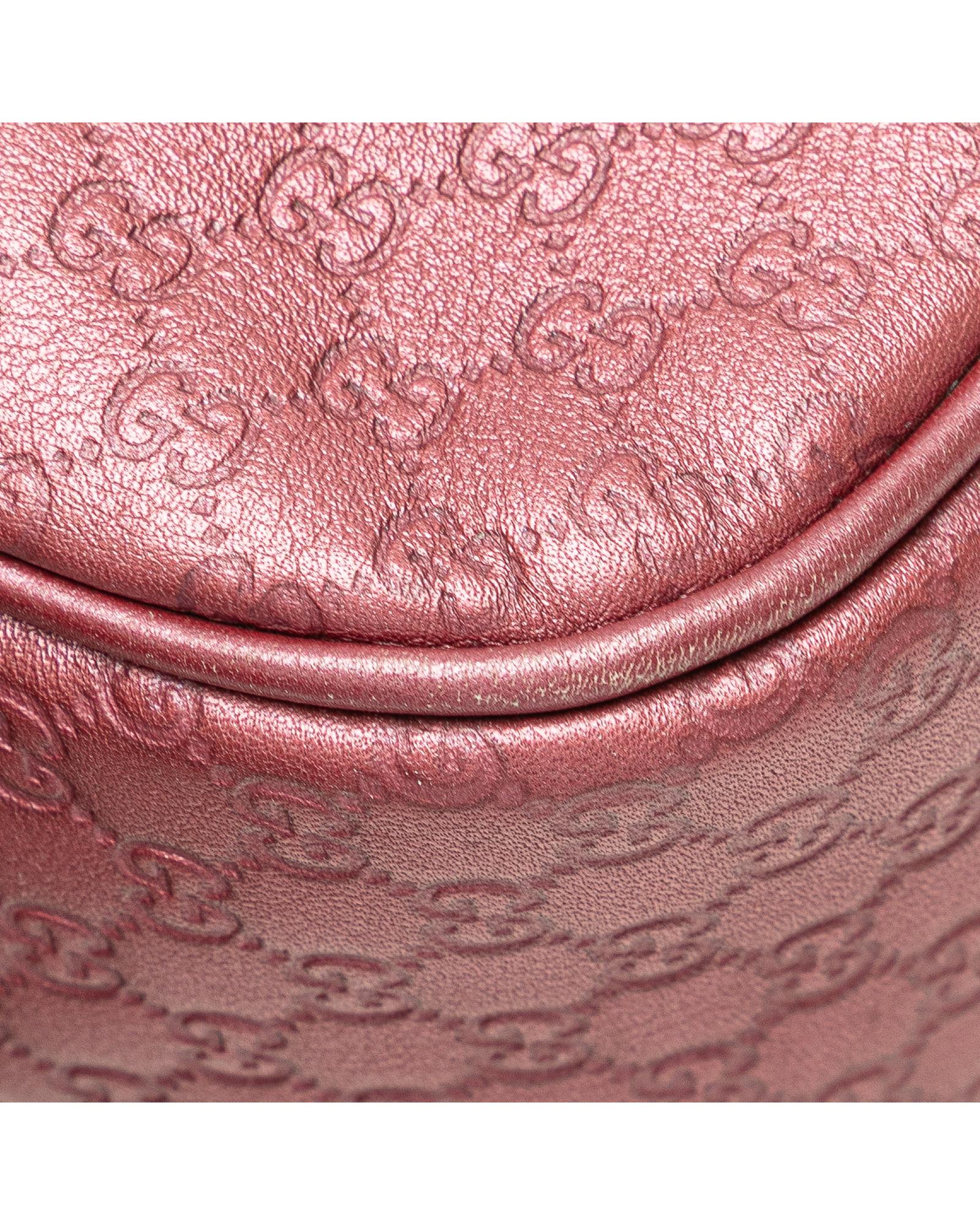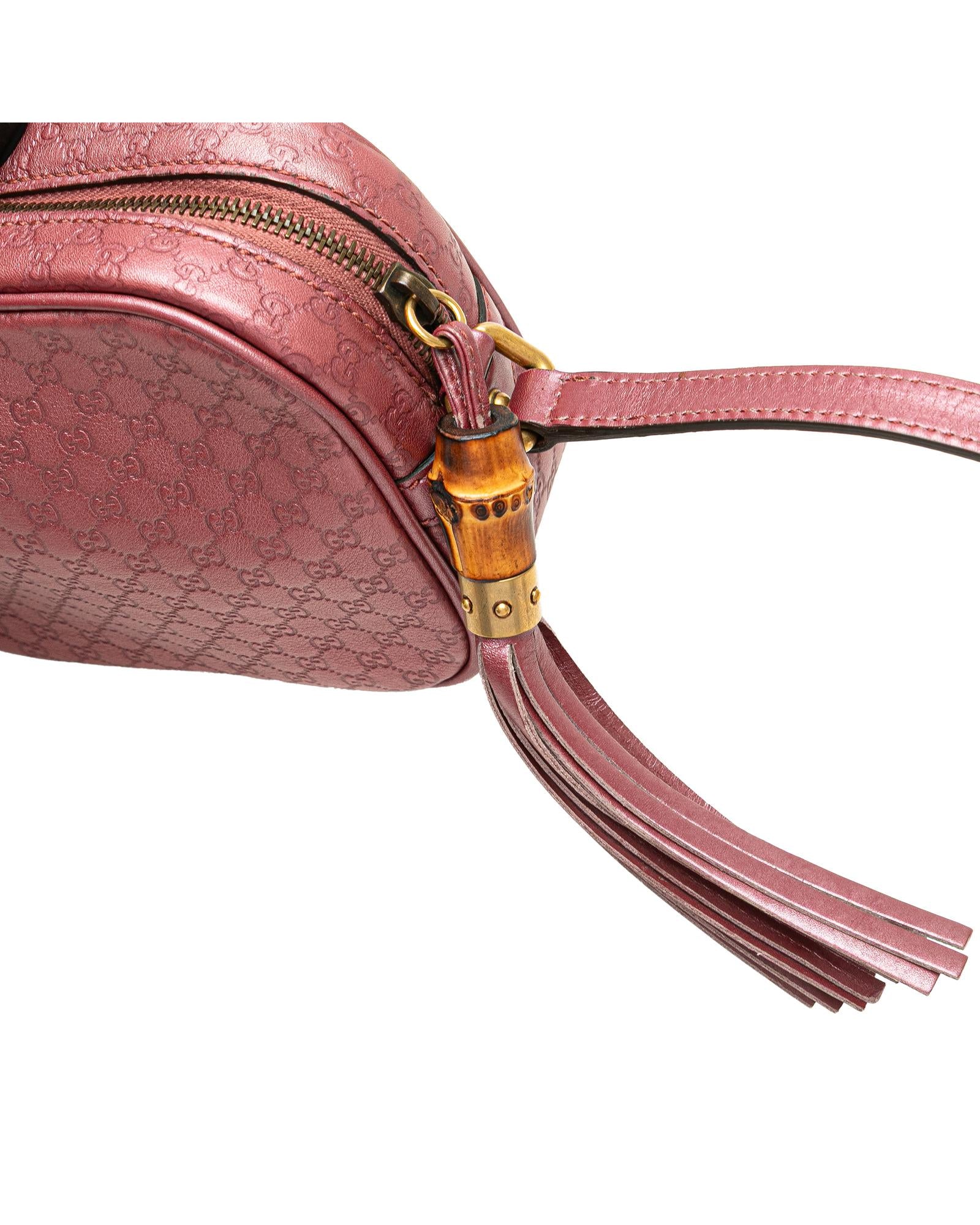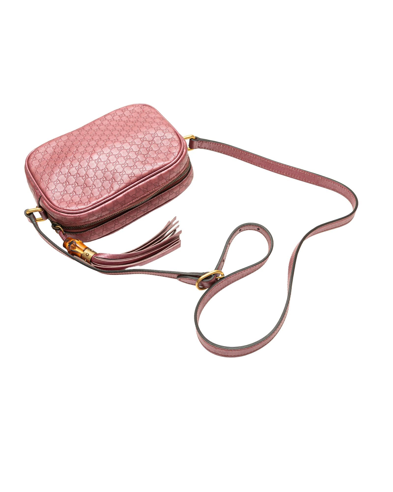This crossbody features an embossed metallic leather body an adjustable flat strap a top zip closure tassel detail and interior slip pockets.