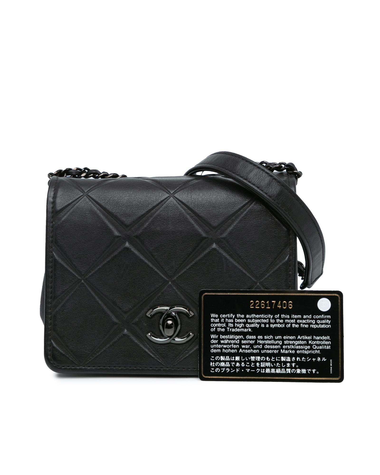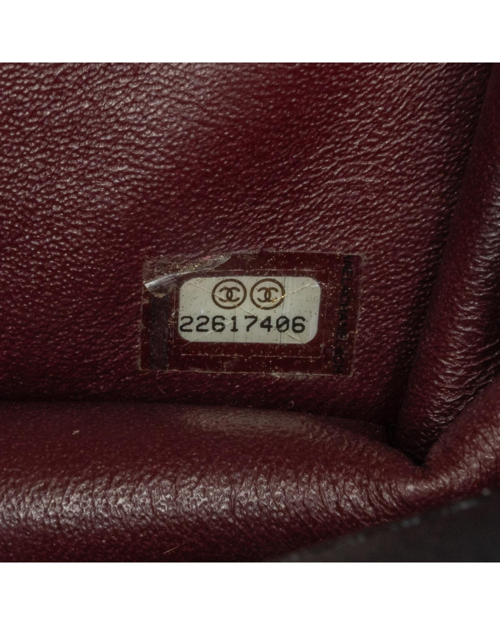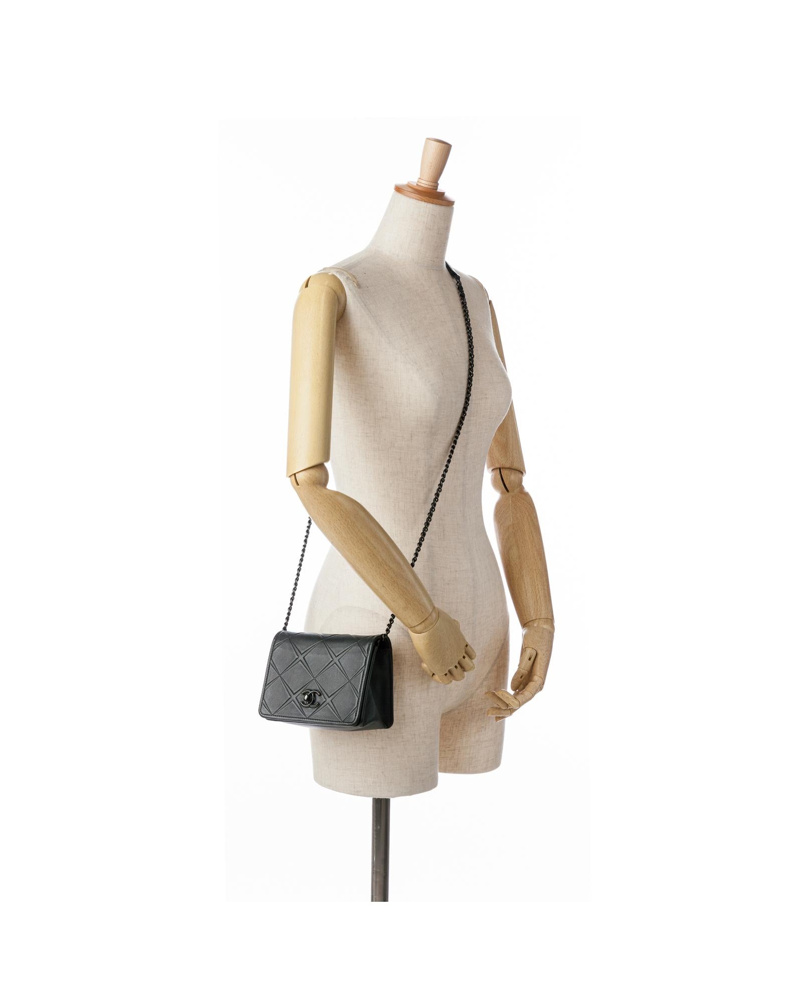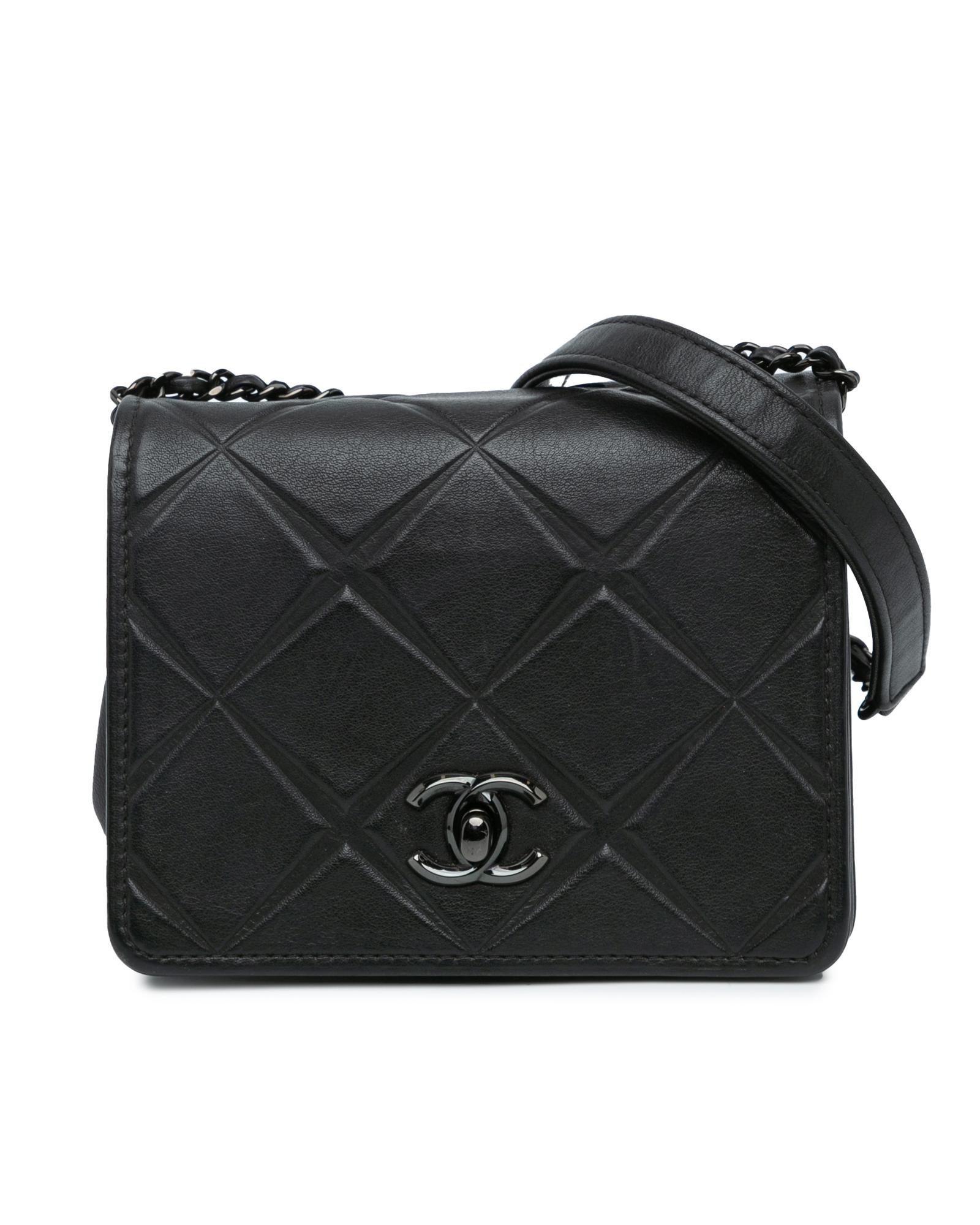This flap features a quilted calf leather body a leather woven chain strap a front flap with twist lock closure and an interior slip pocket.Brand: Chanel Vintage