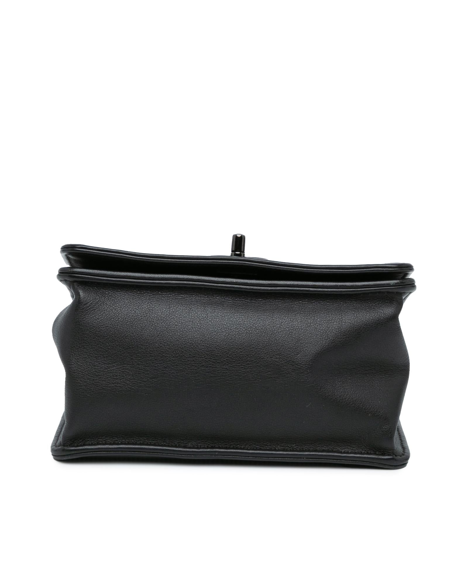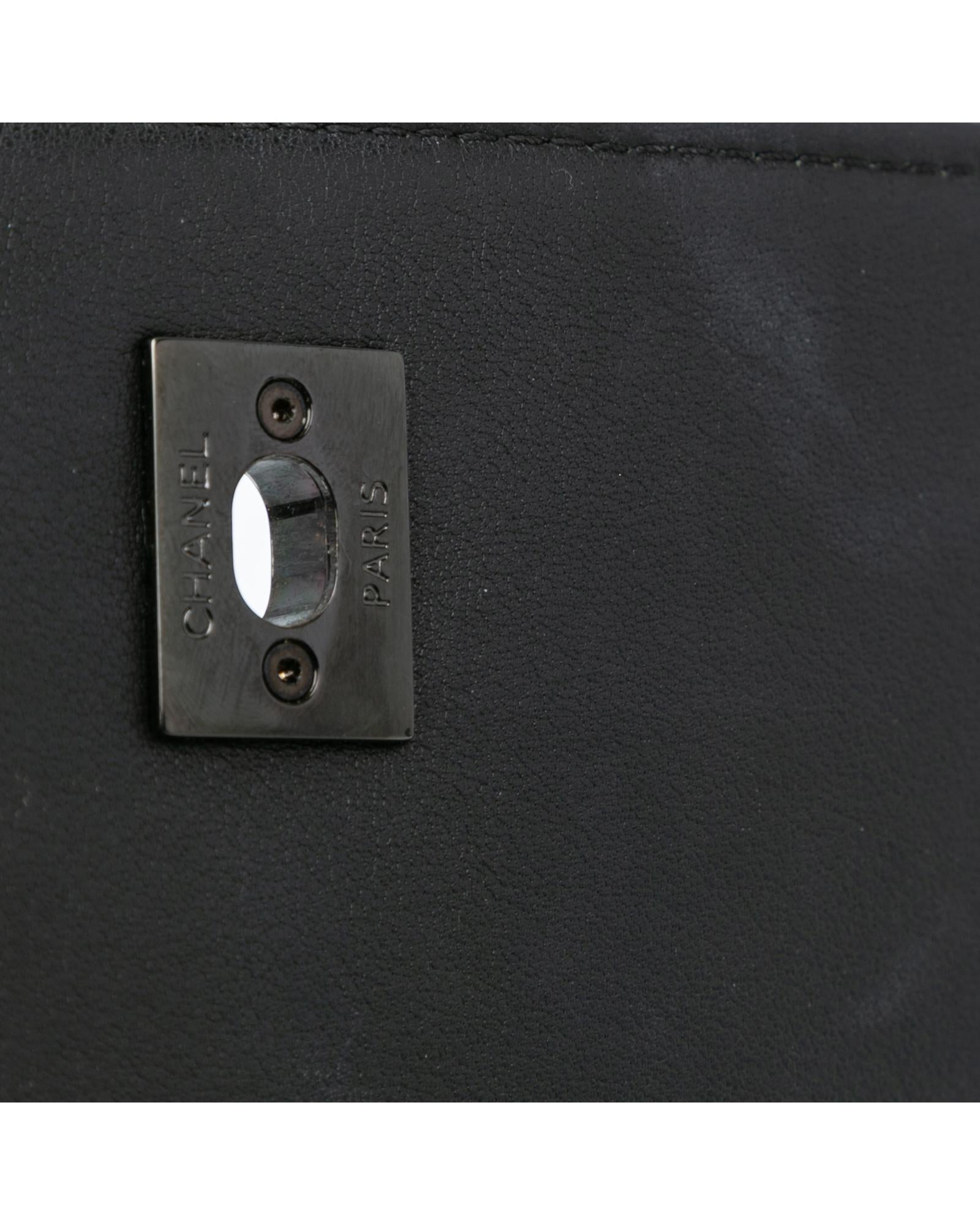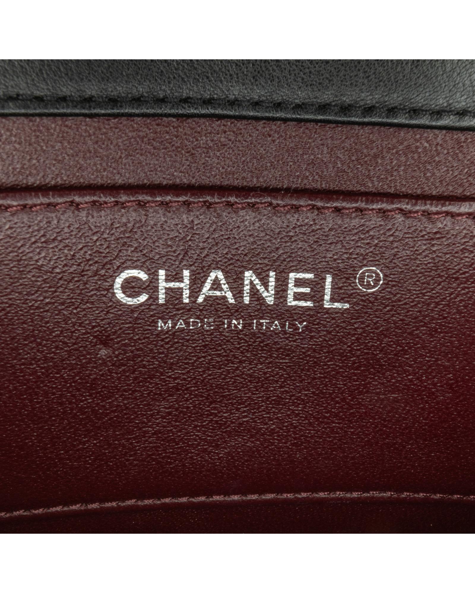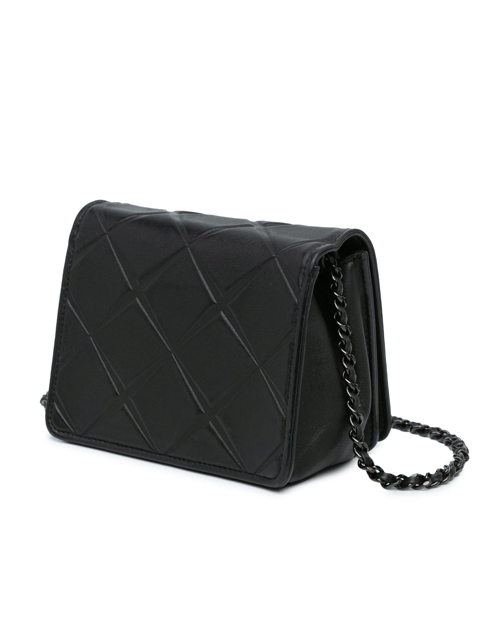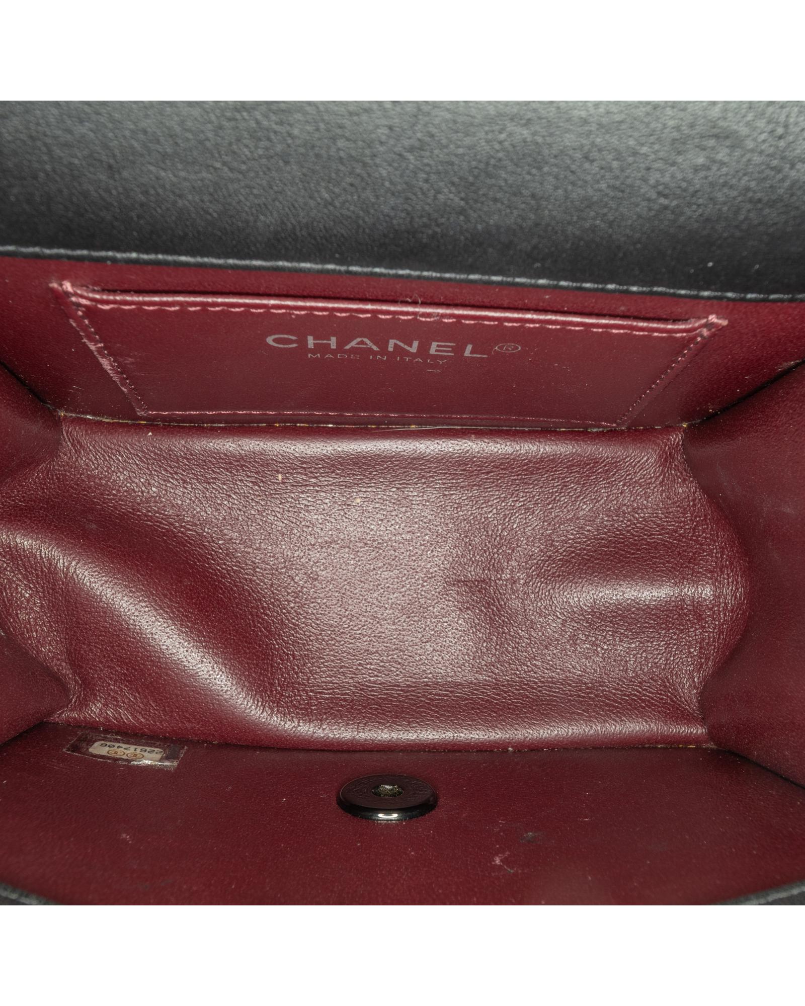 This flap features a quilted calf leather body a leather woven chain strap a front flap with twist lock closure and an interior slip pocket.Brand: Chanel Vintage