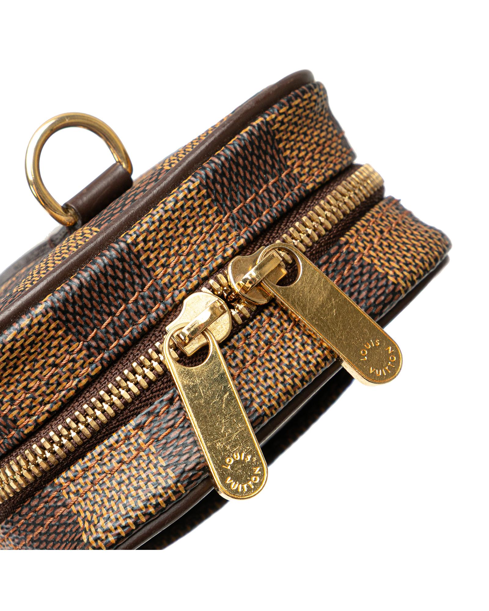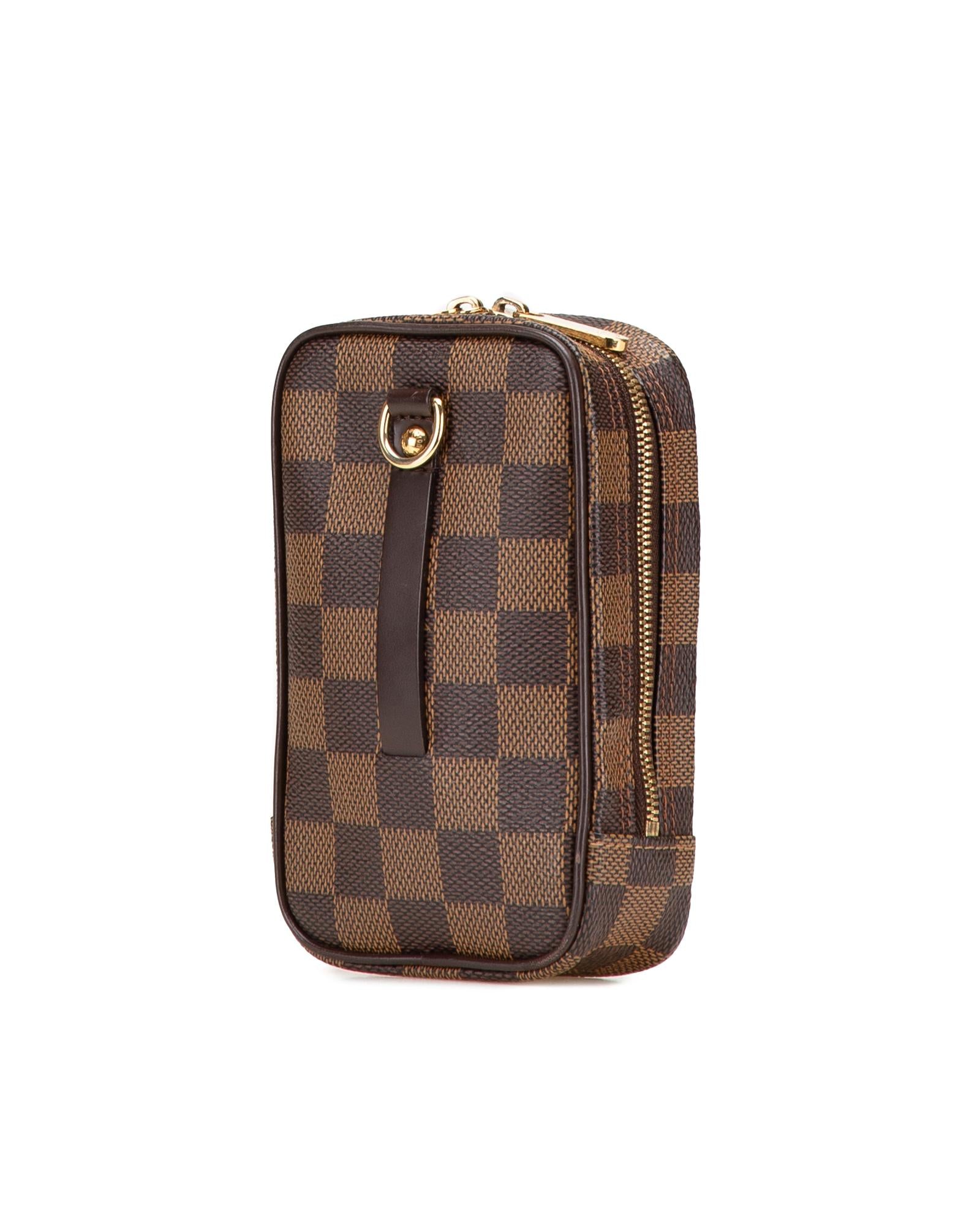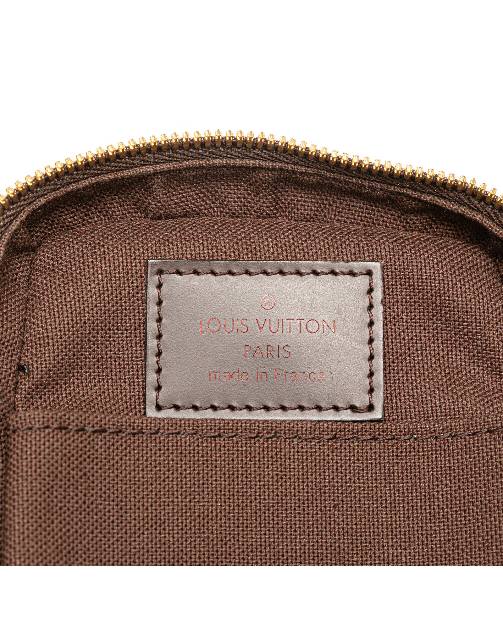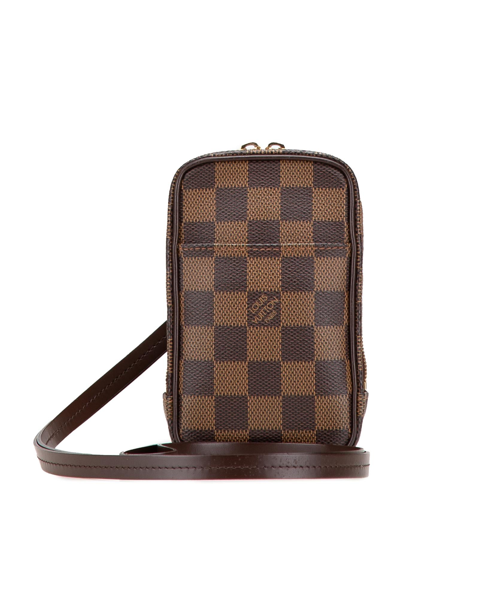 The Etui Okapi GM features a damier ebene canvas body with leather trim a detachable leather strap a top zip closure an exterior front slip pocket and an interior slip pocket.