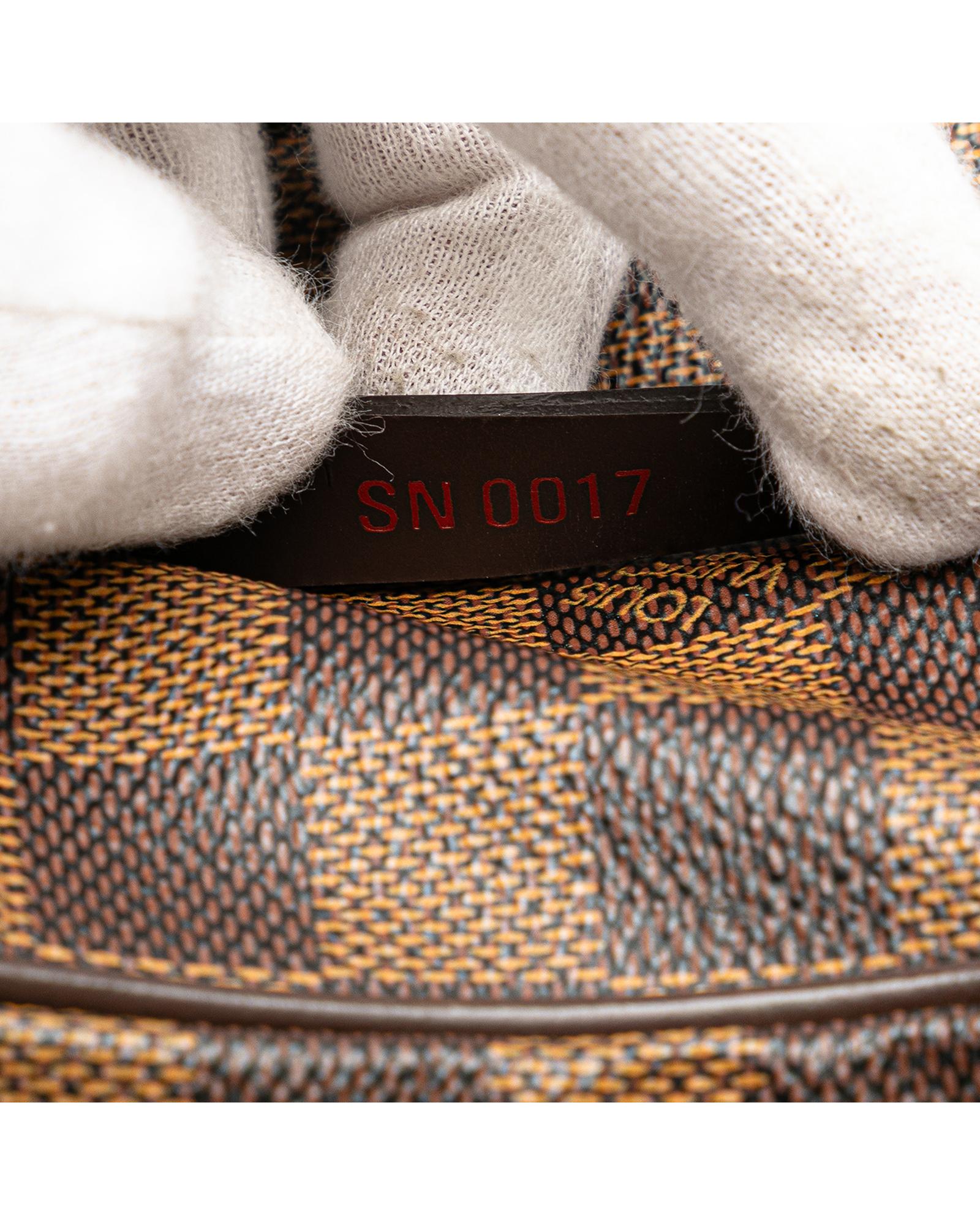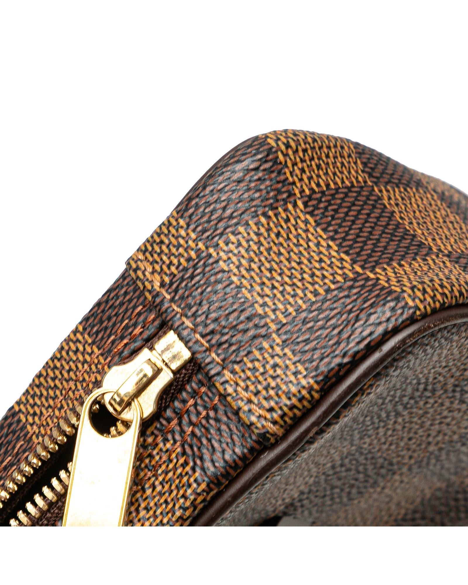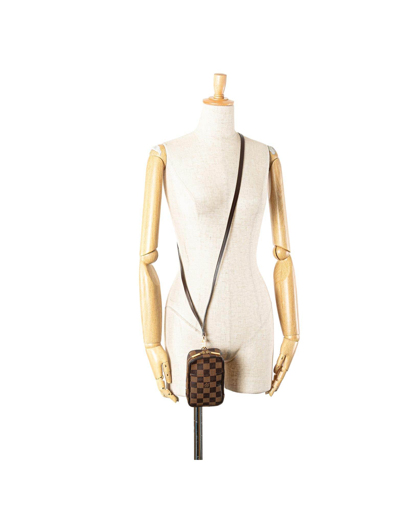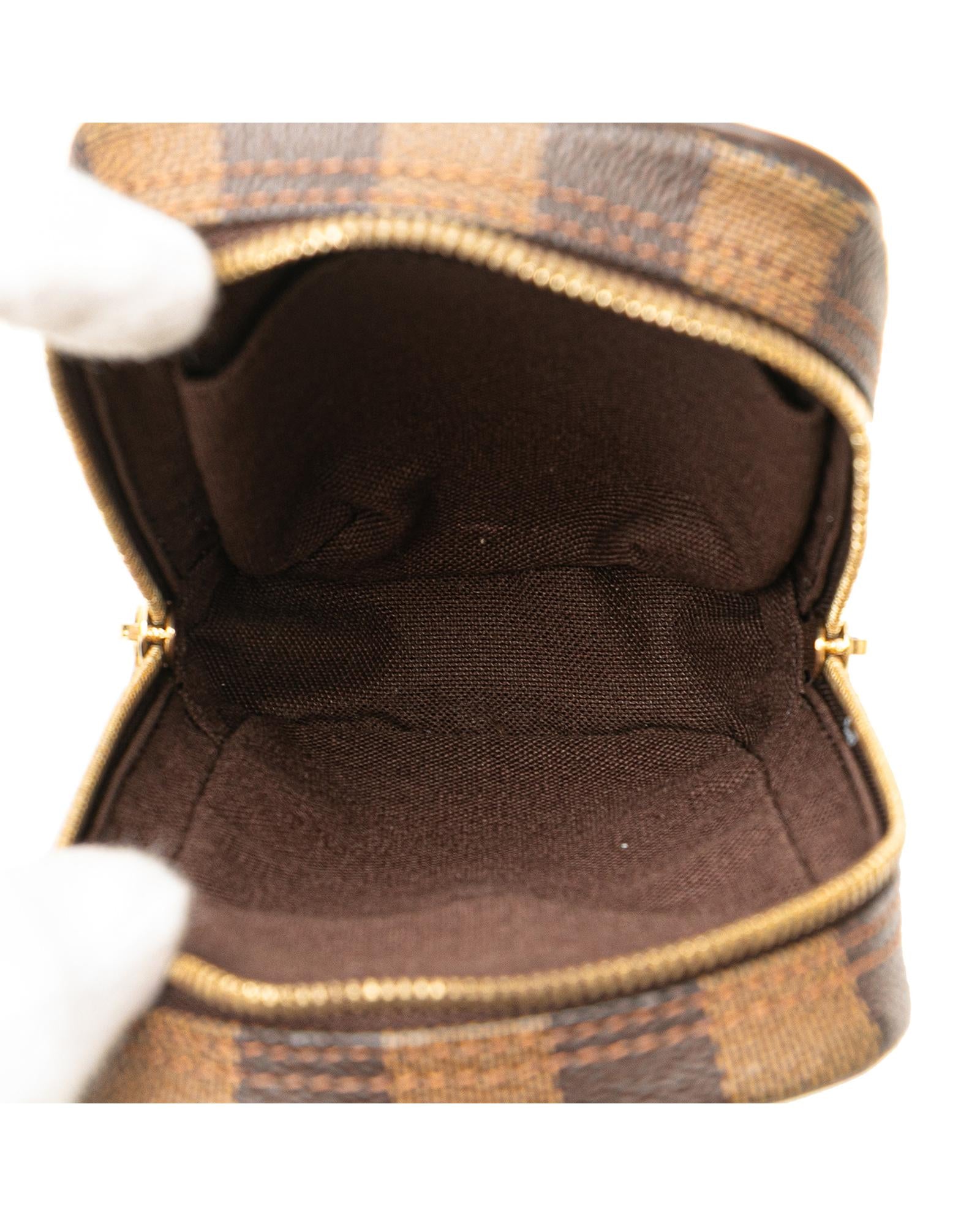 The Etui Okapi GM features a damier ebene canvas body with leather trim a detachable leather strap a top zip closure an exterior front slip pocket and an interior slip pocket.