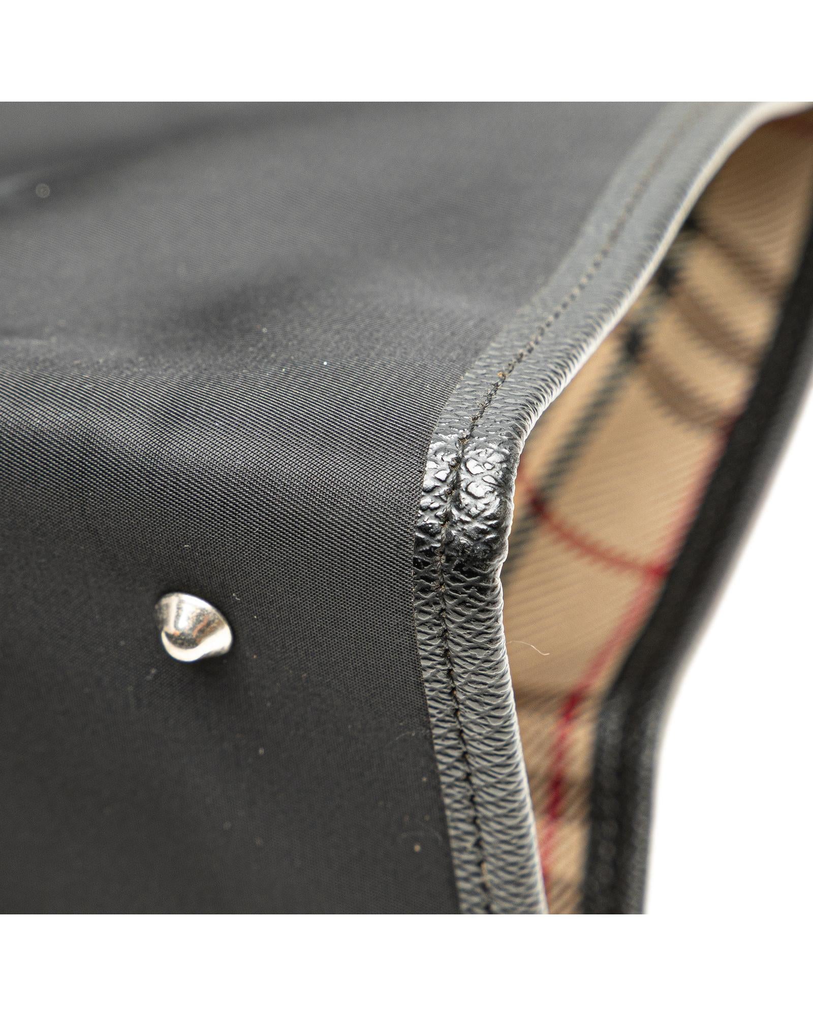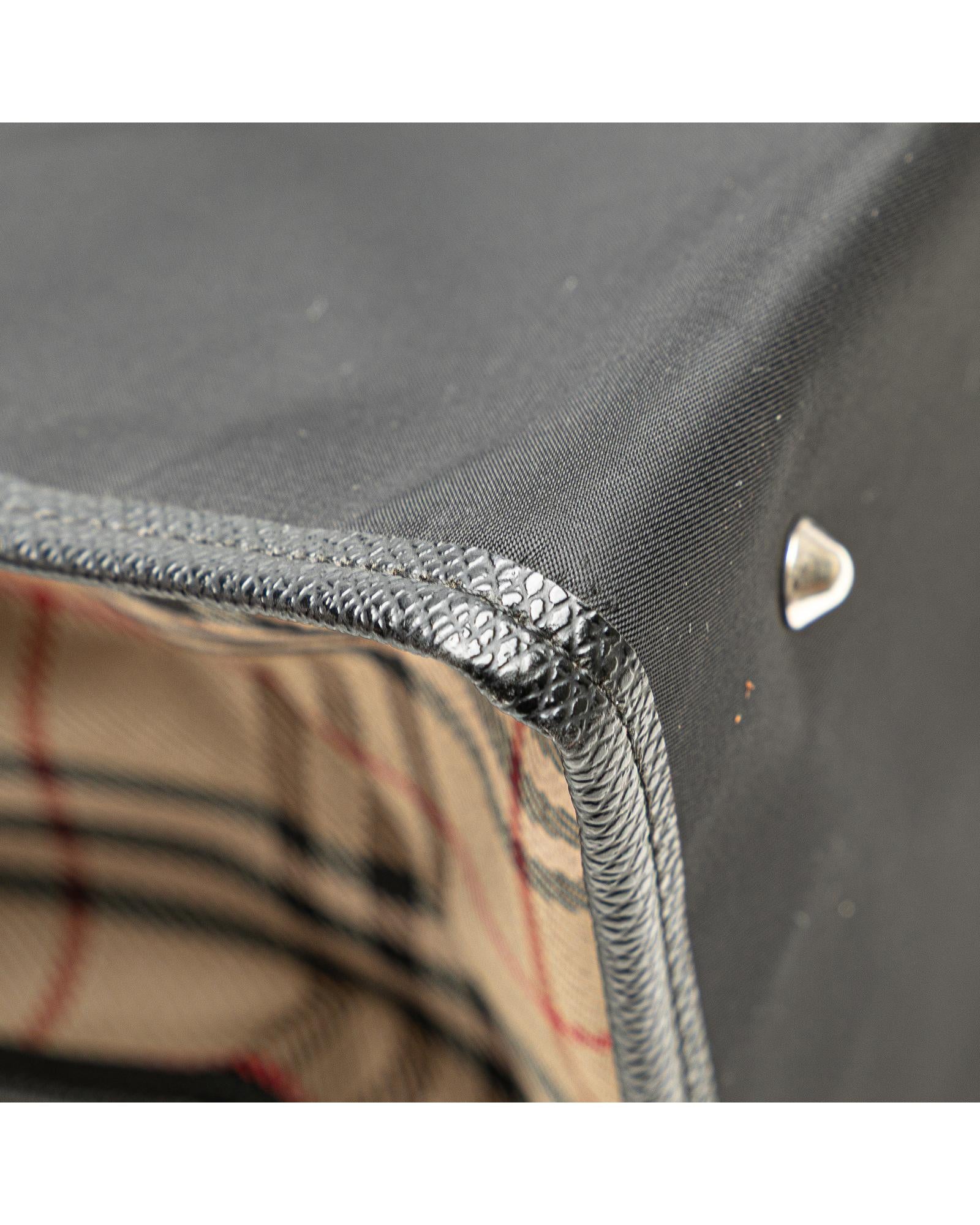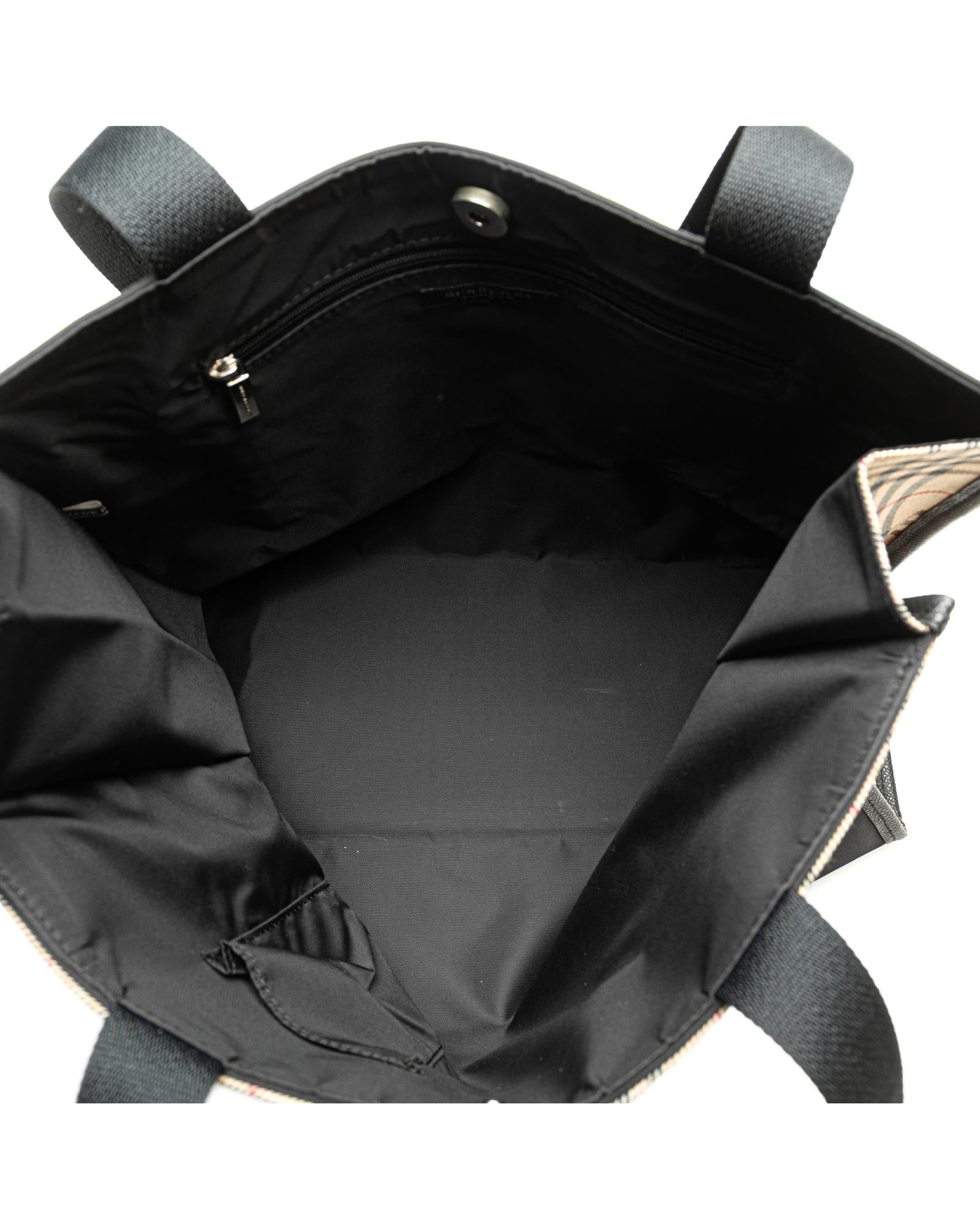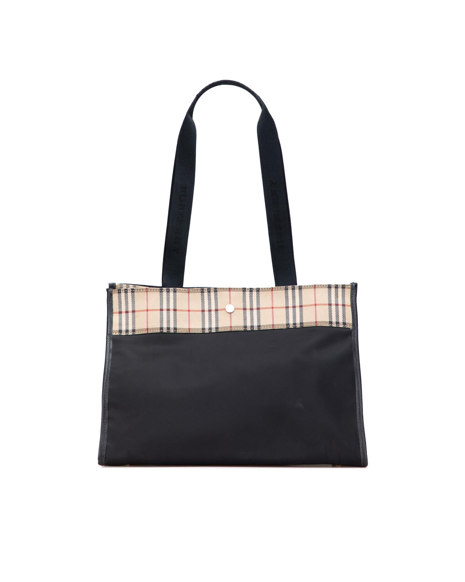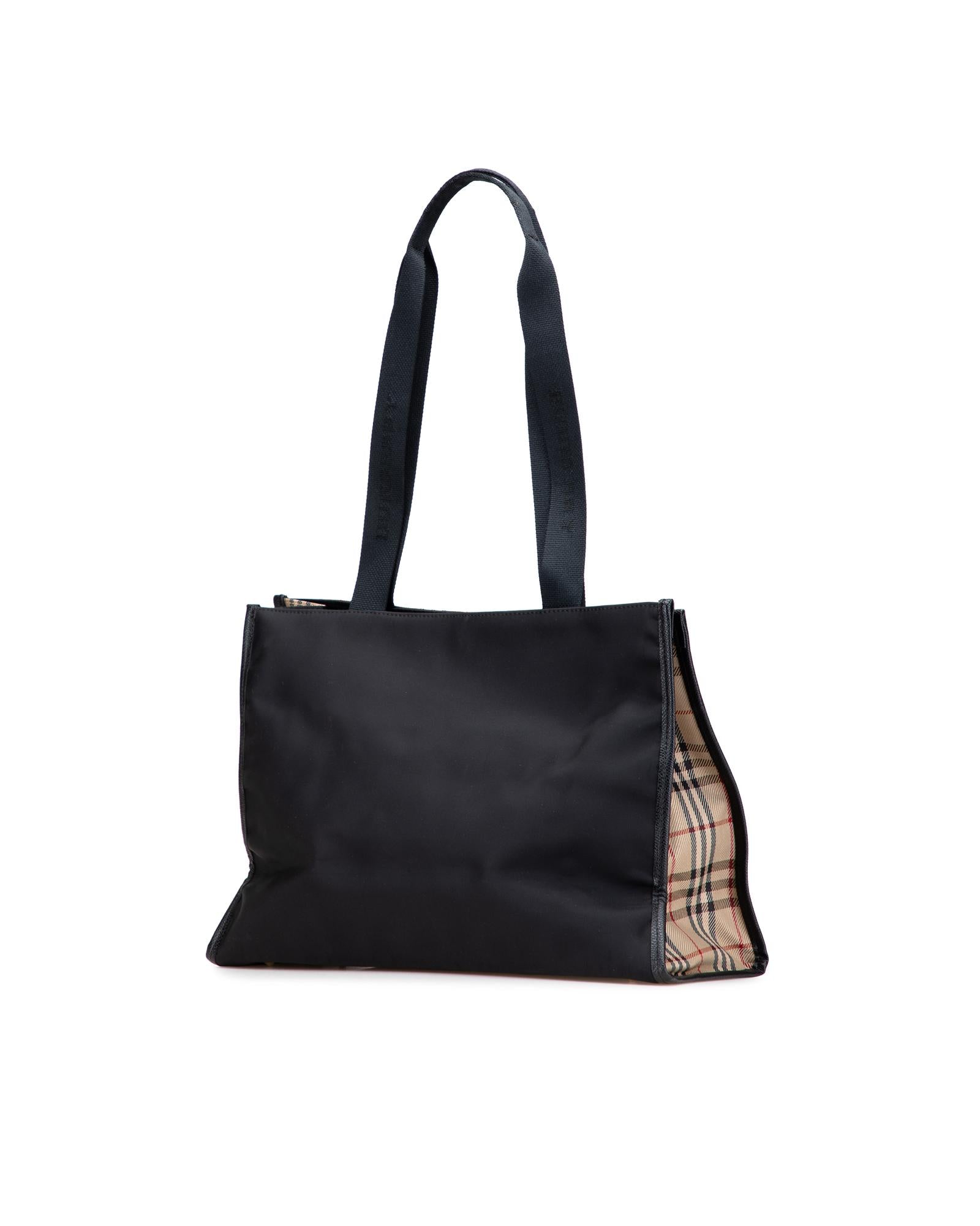 This tote bag features a nylon body flat nylon shoulder straps an open top with magnetic snap closure and interior zip and slip pockets.Brand: Burberry Vintage