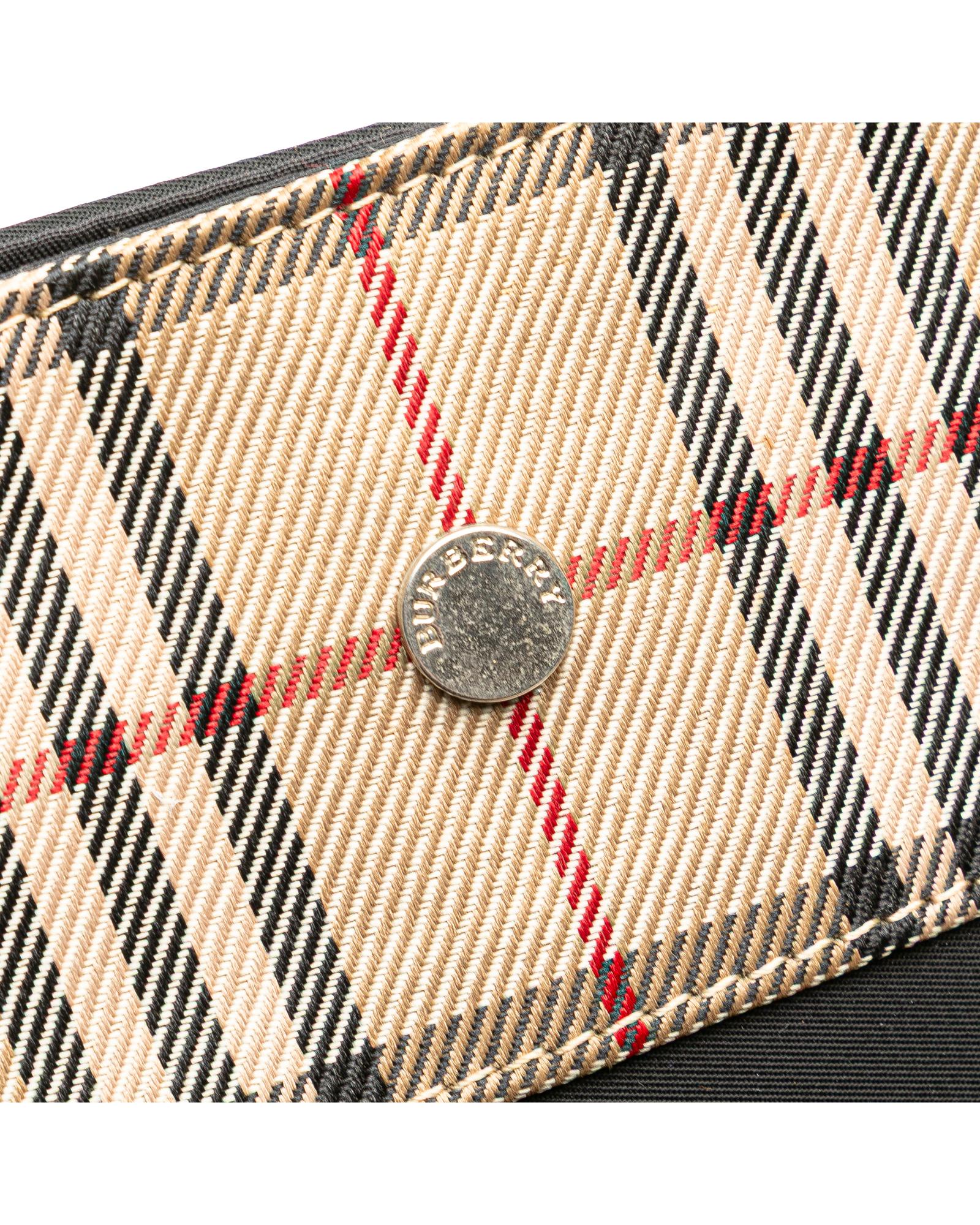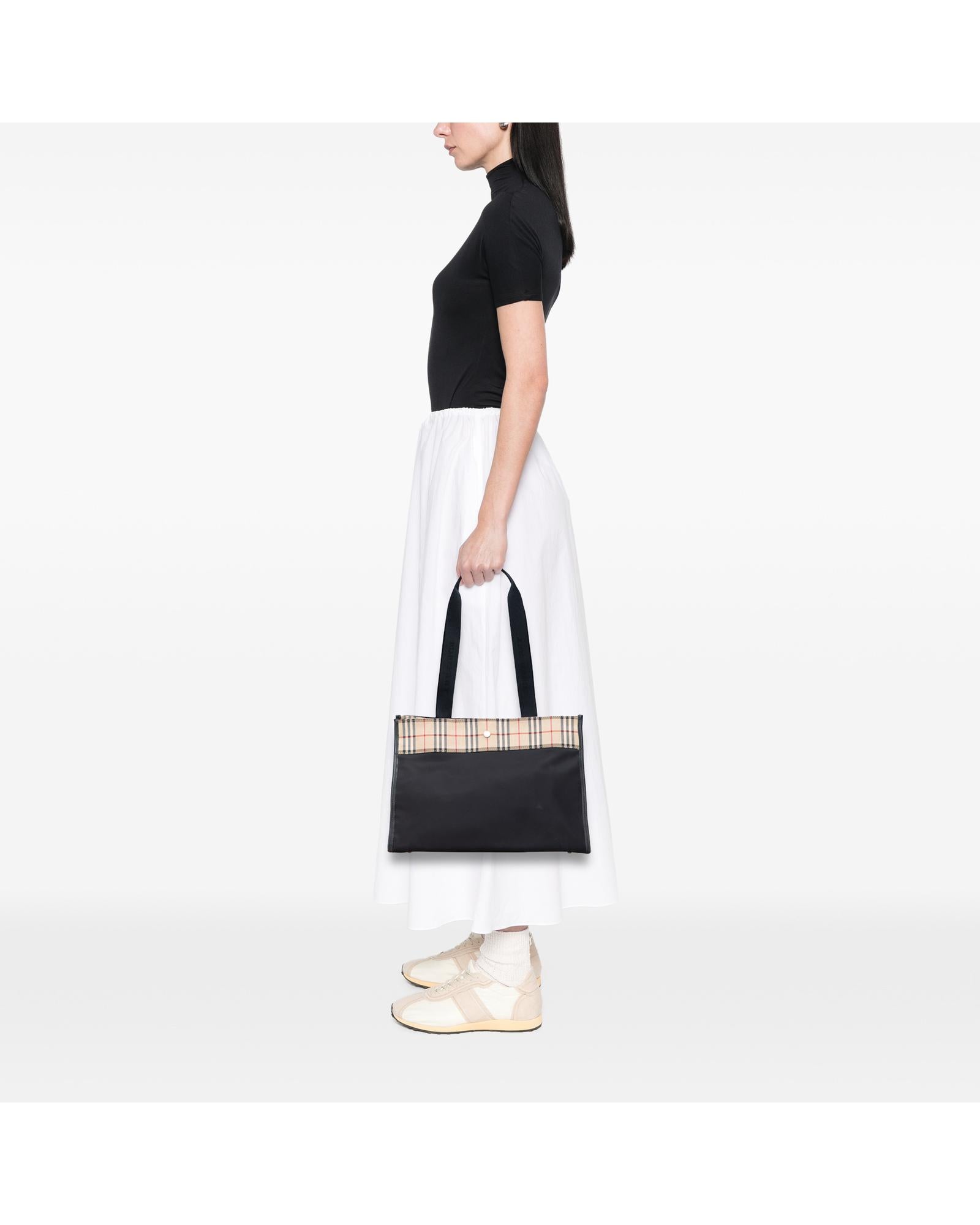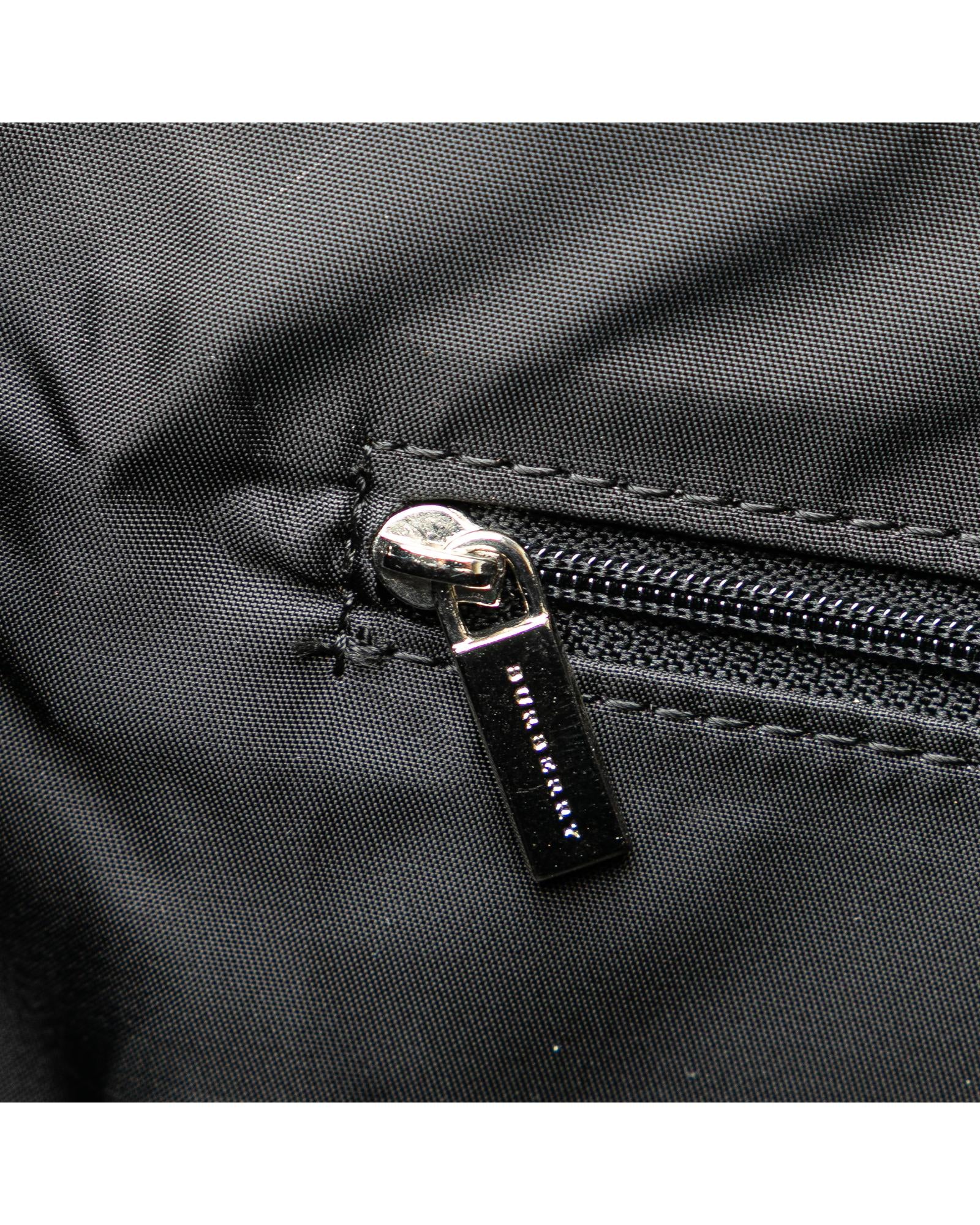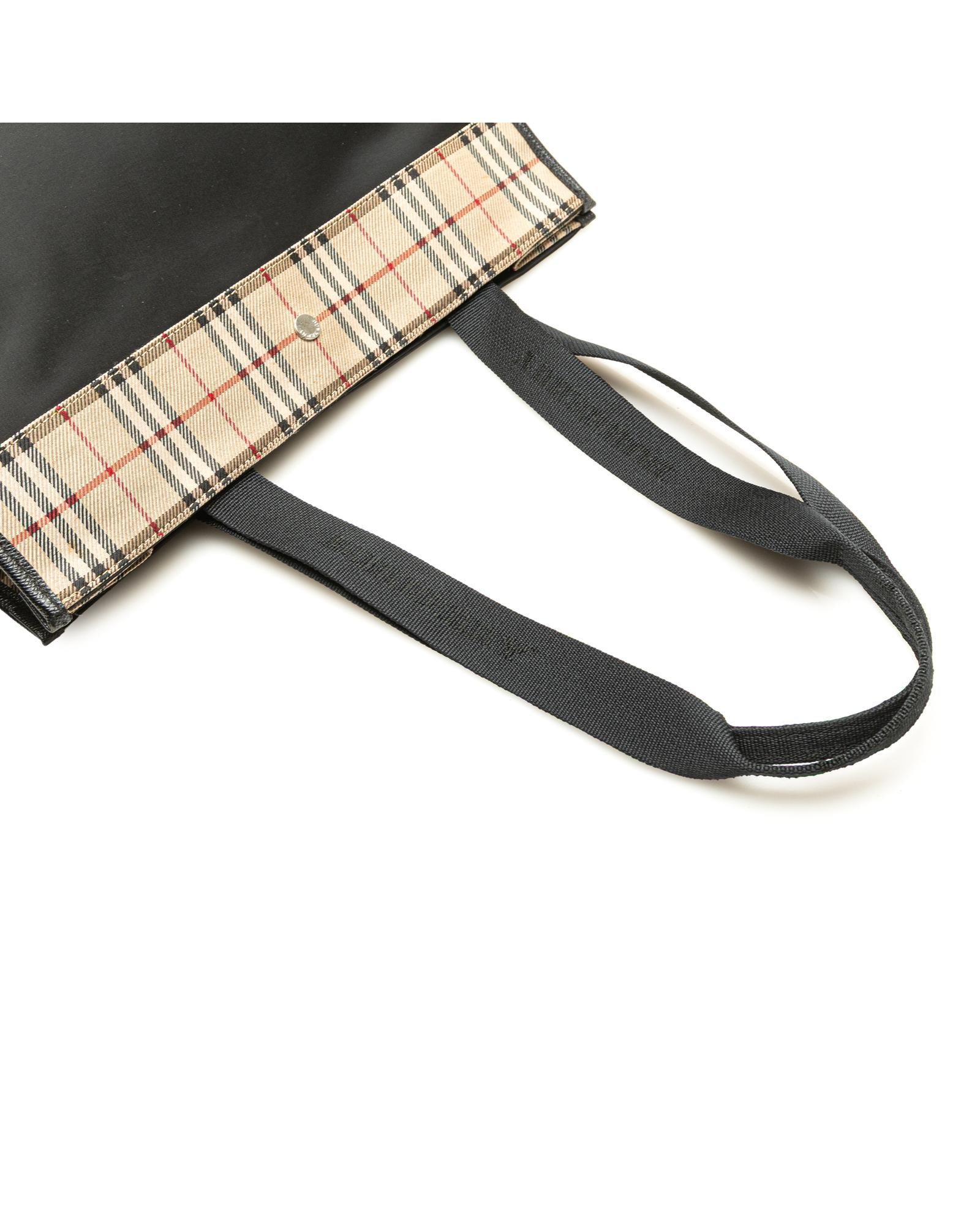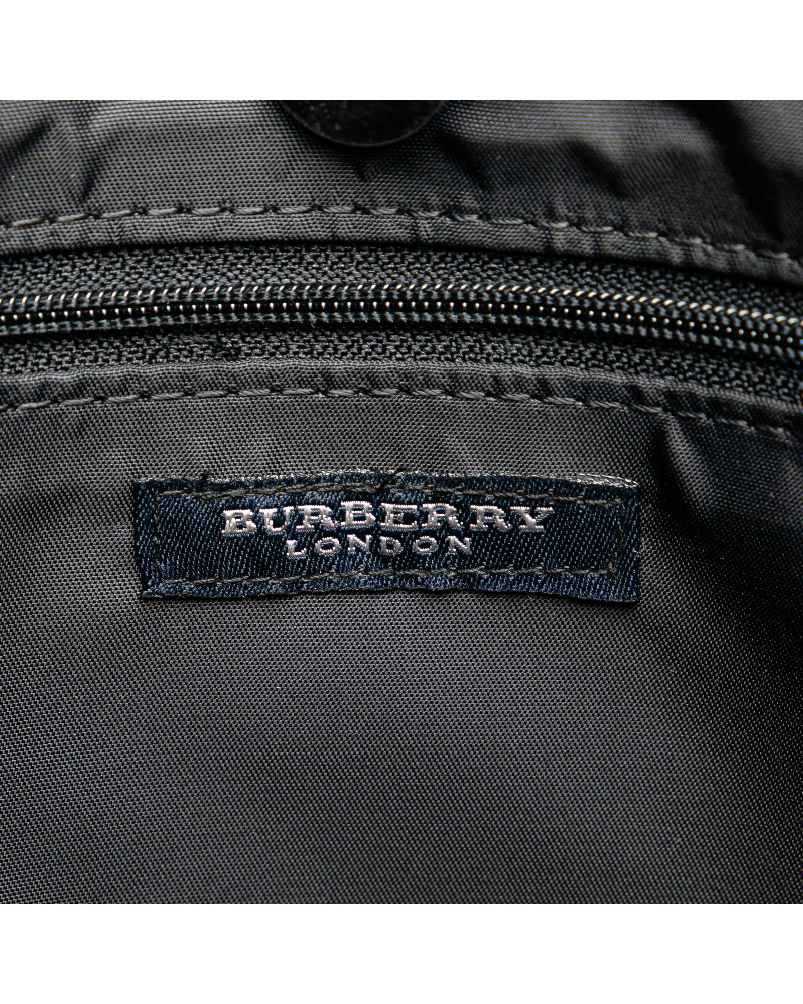 This tote bag features a nylon body flat nylon shoulder straps an open top with magnetic snap closure and interior zip and slip pockets.Brand: Burberry Vintage