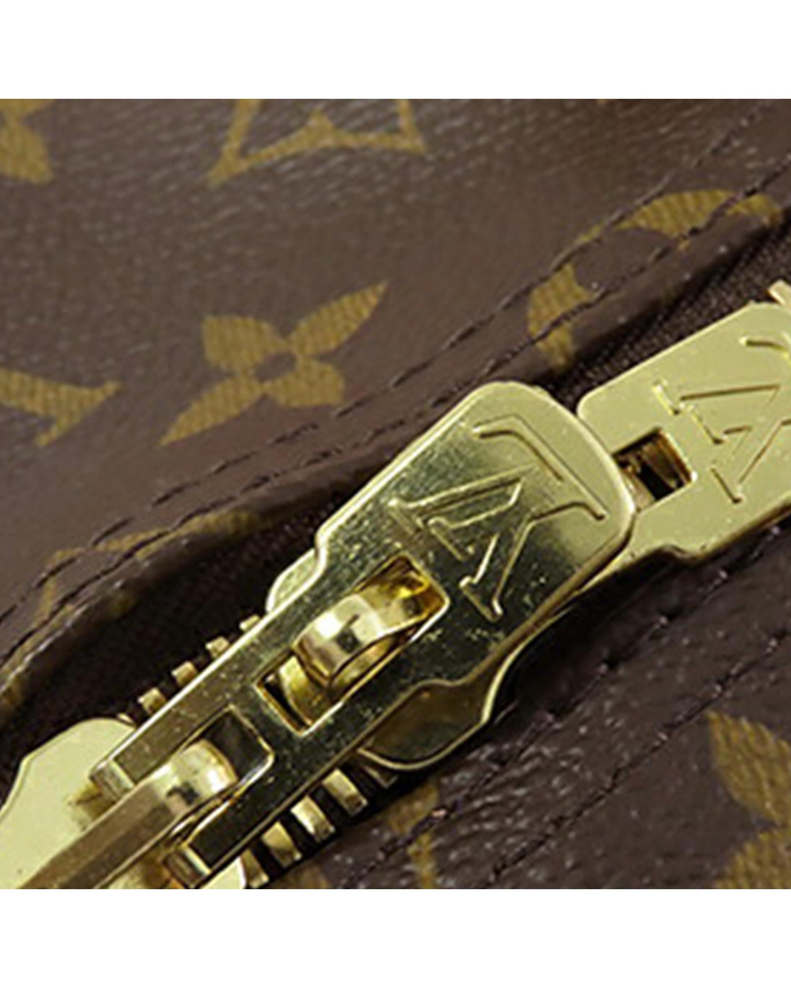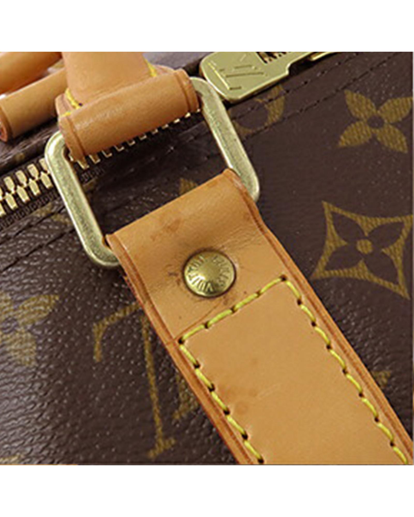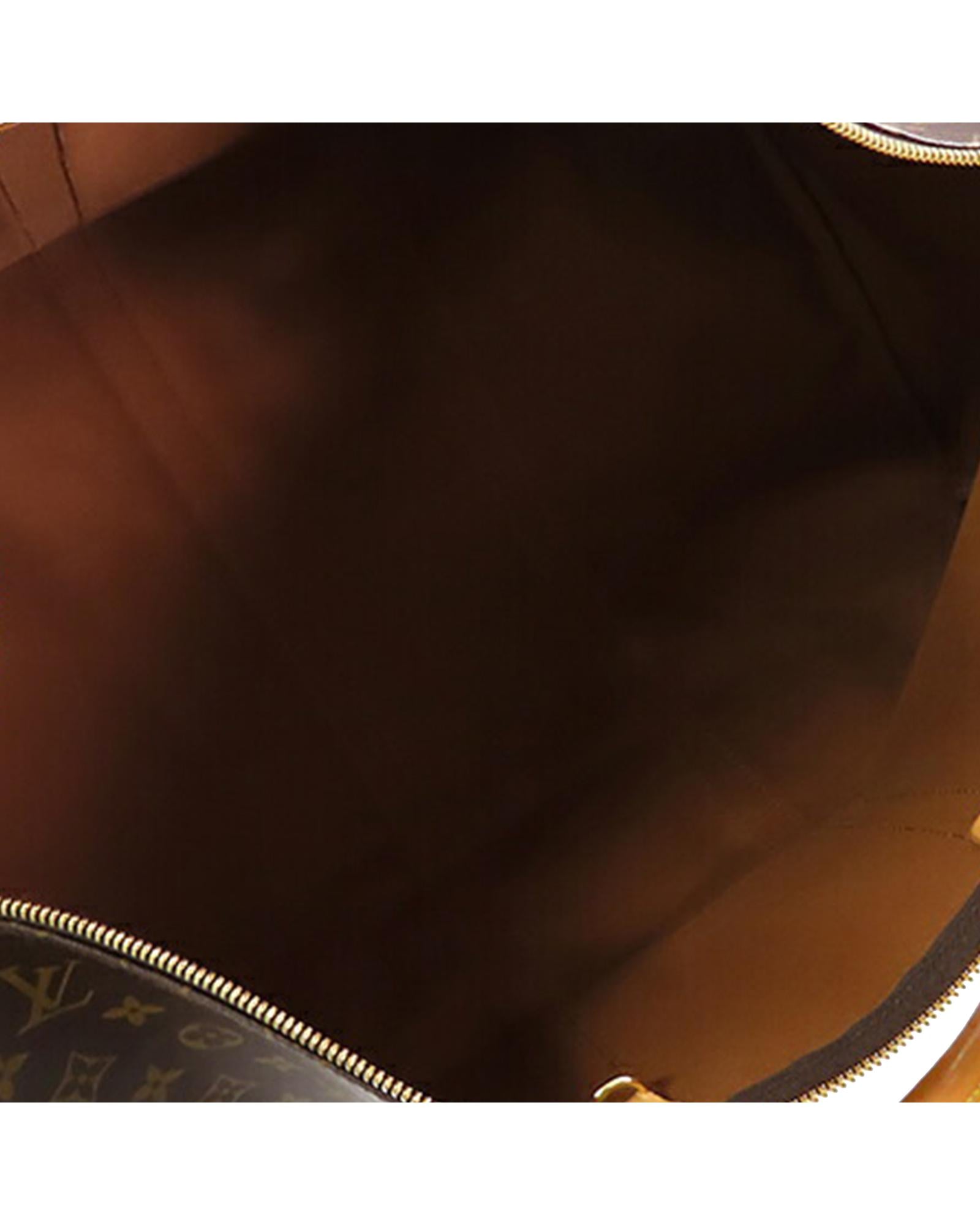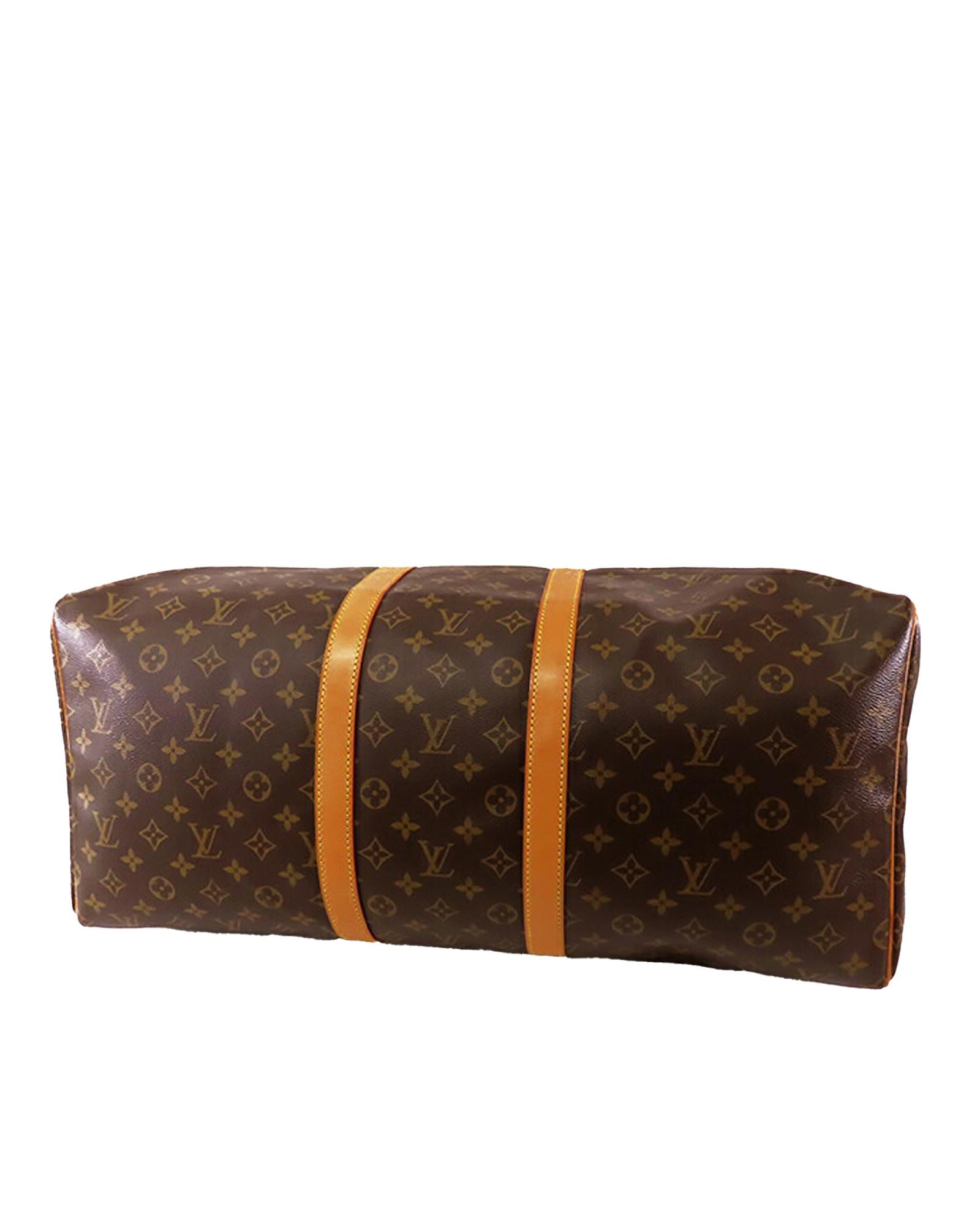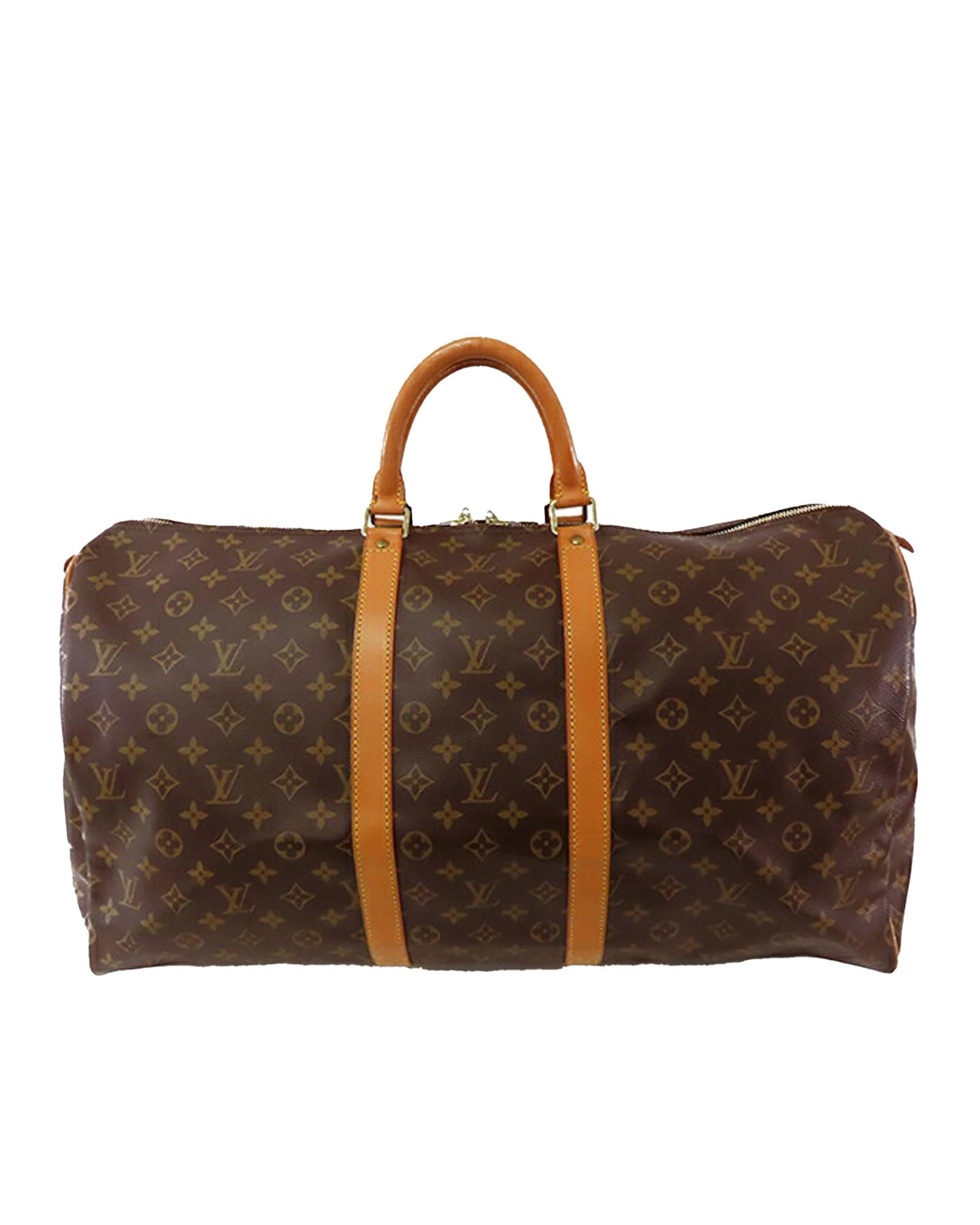 The Keepall 55 features a monogram canvas body with vachetta leather trim rolled vachetta leather handles and a top zip closure.