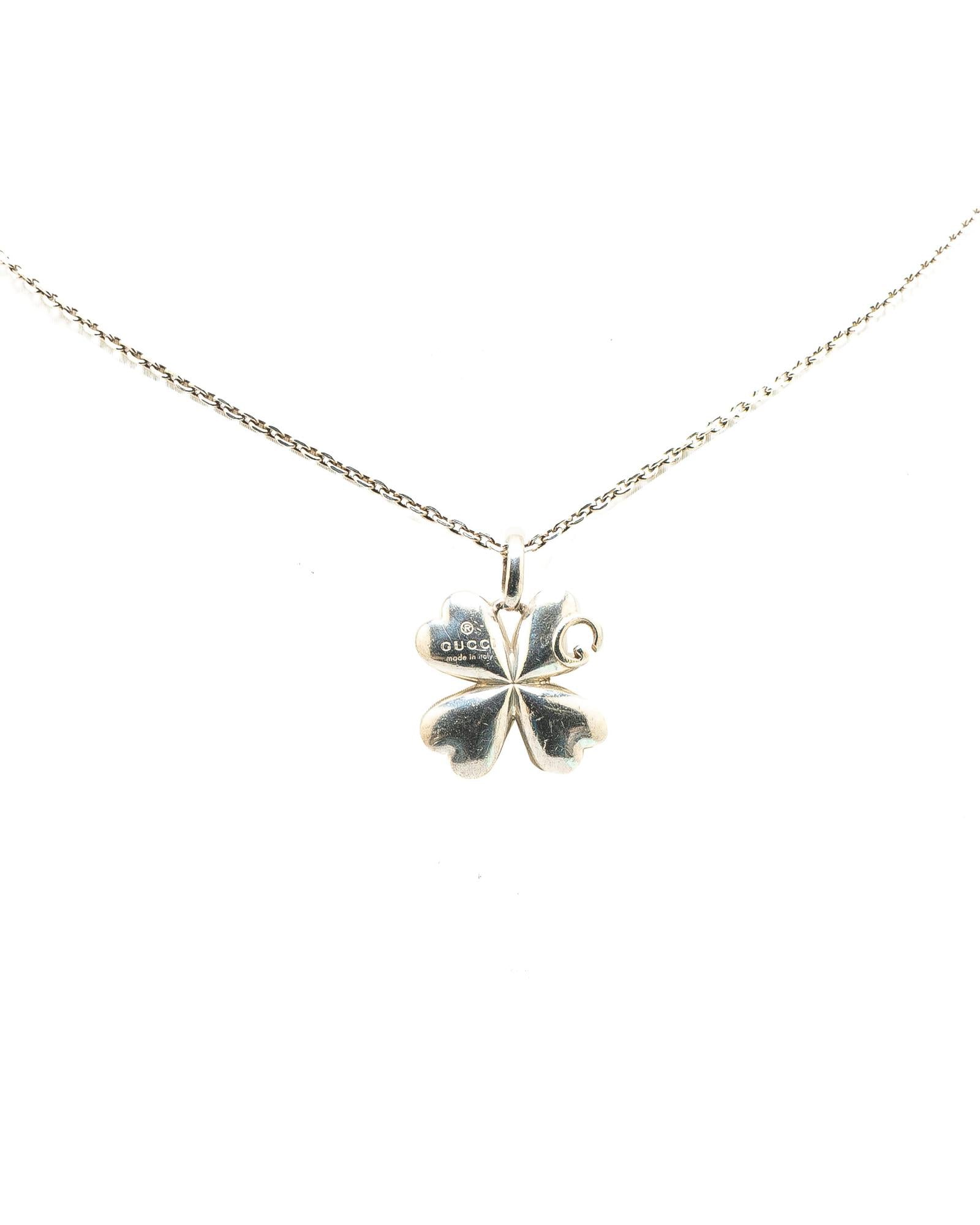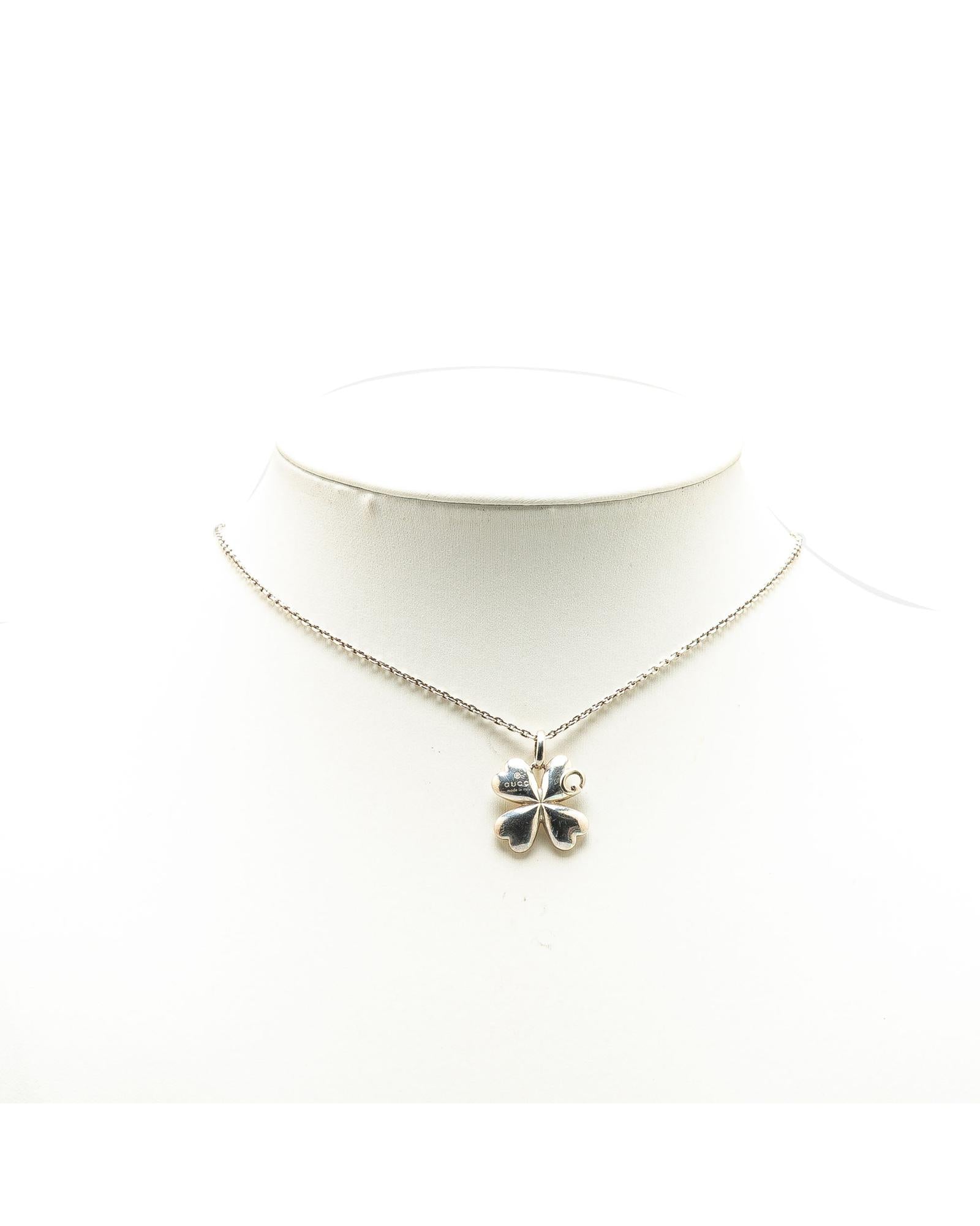 This necklace features a sterling silver body a four-leaf clover pendant and a lobster claw clasp closure.