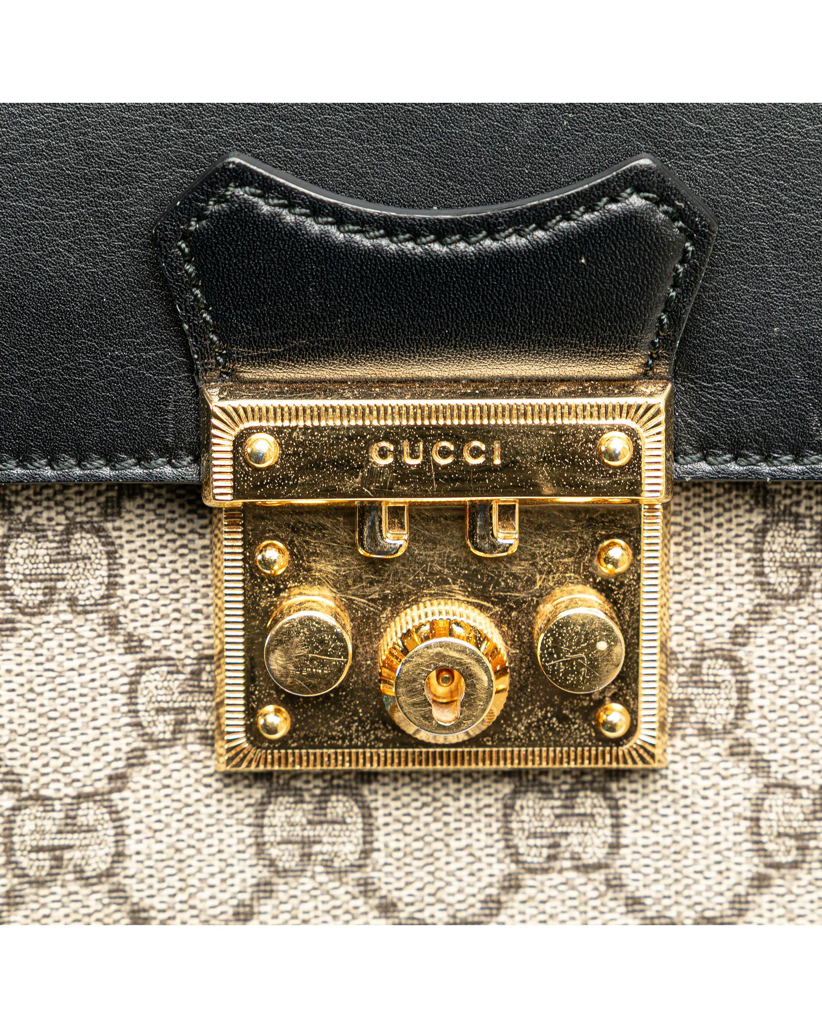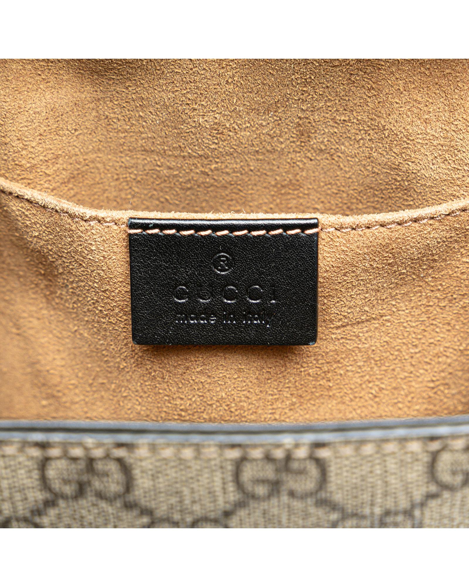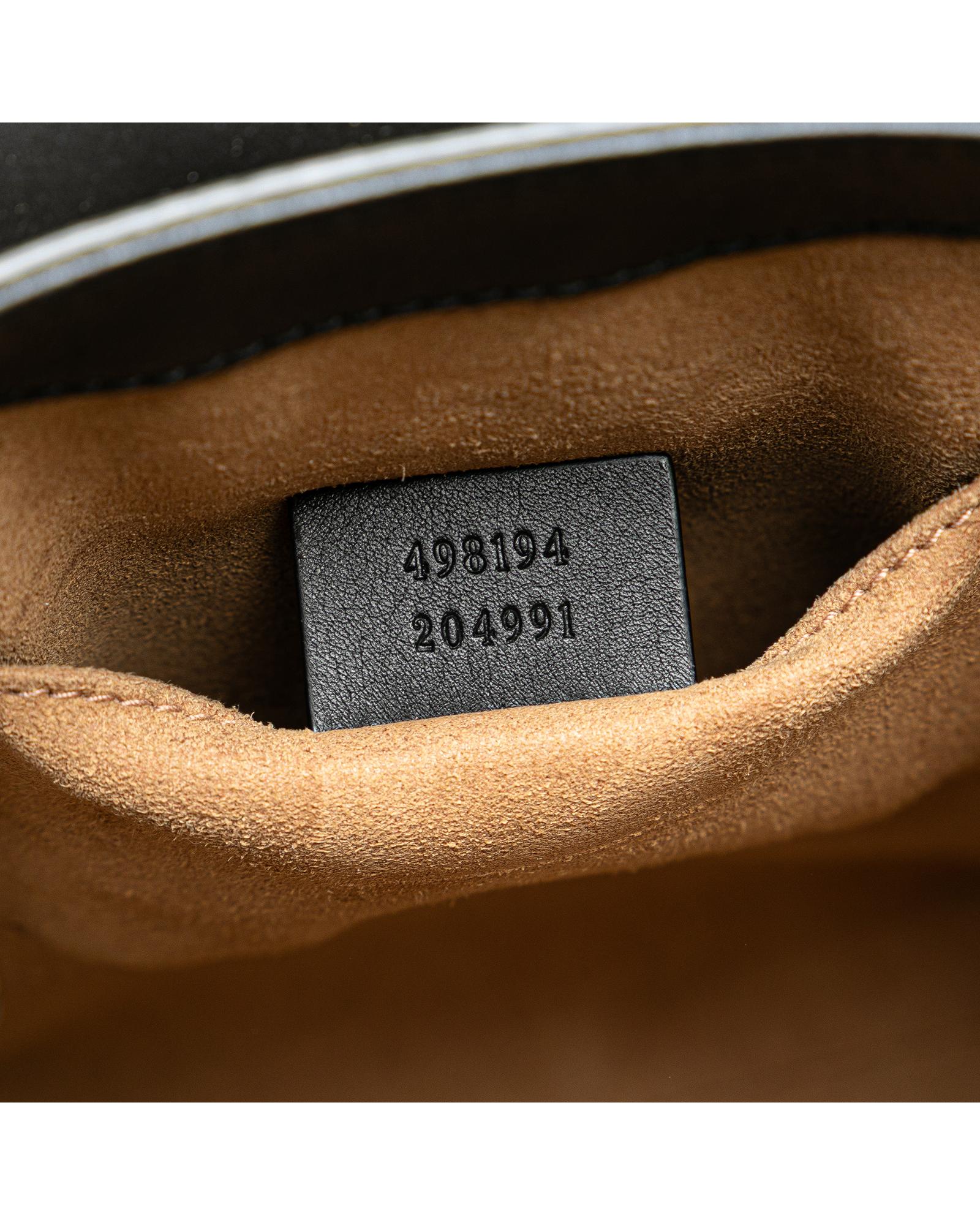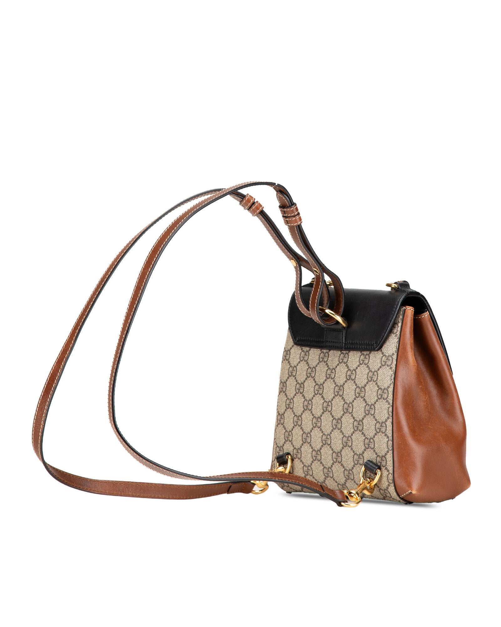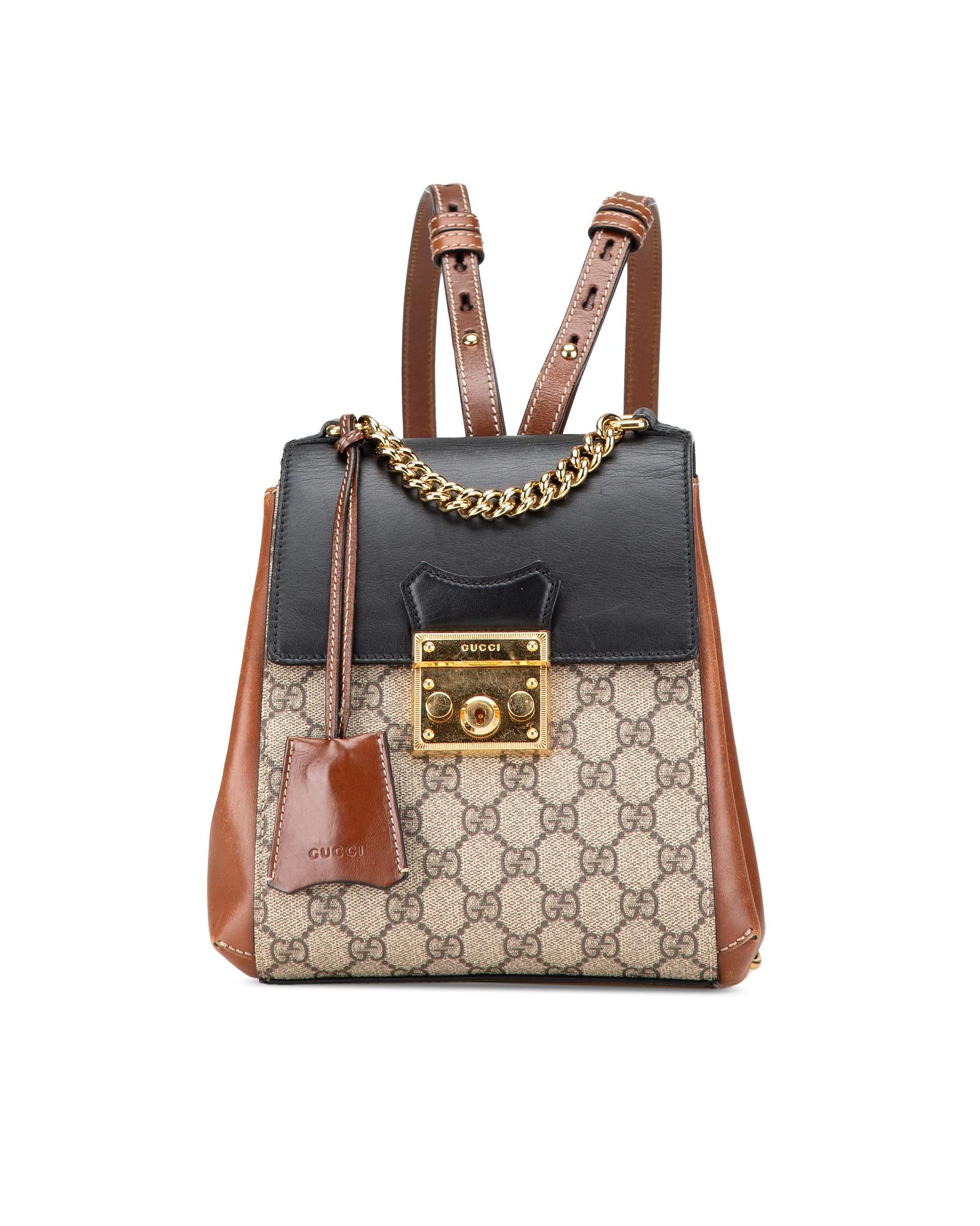 This backpack features a coated canvas body with leather side panels a top chain link handle an adjustable and detachable flat leather back straps a front flap with push lock closure and interior slip pockets.Brand: Gucci