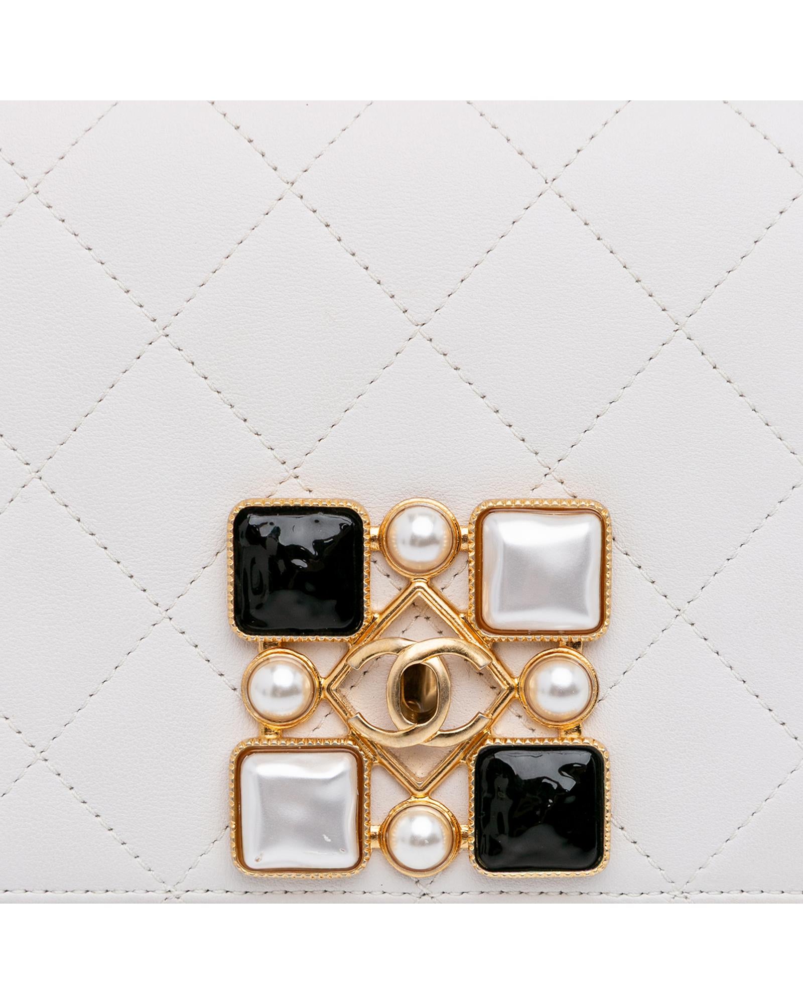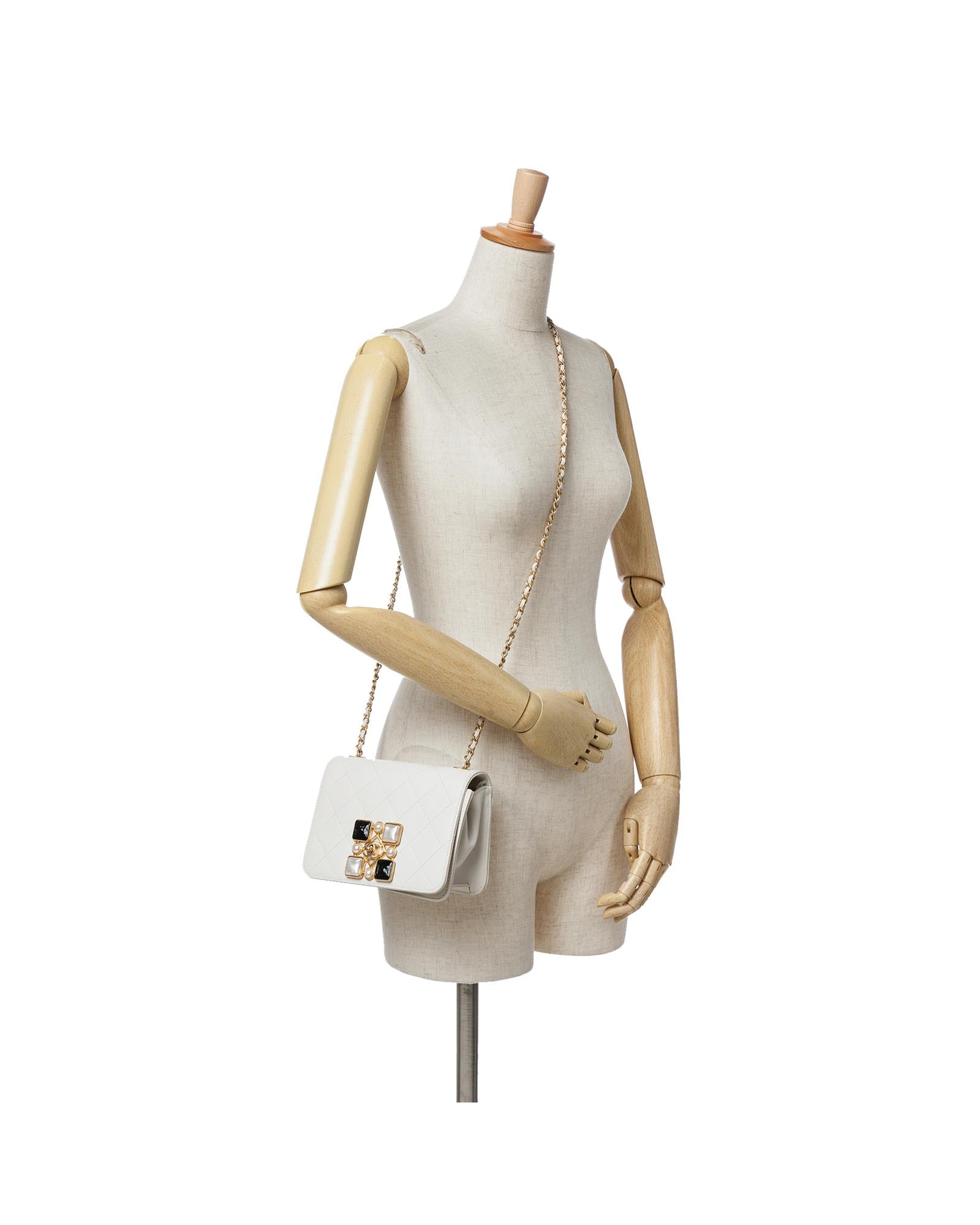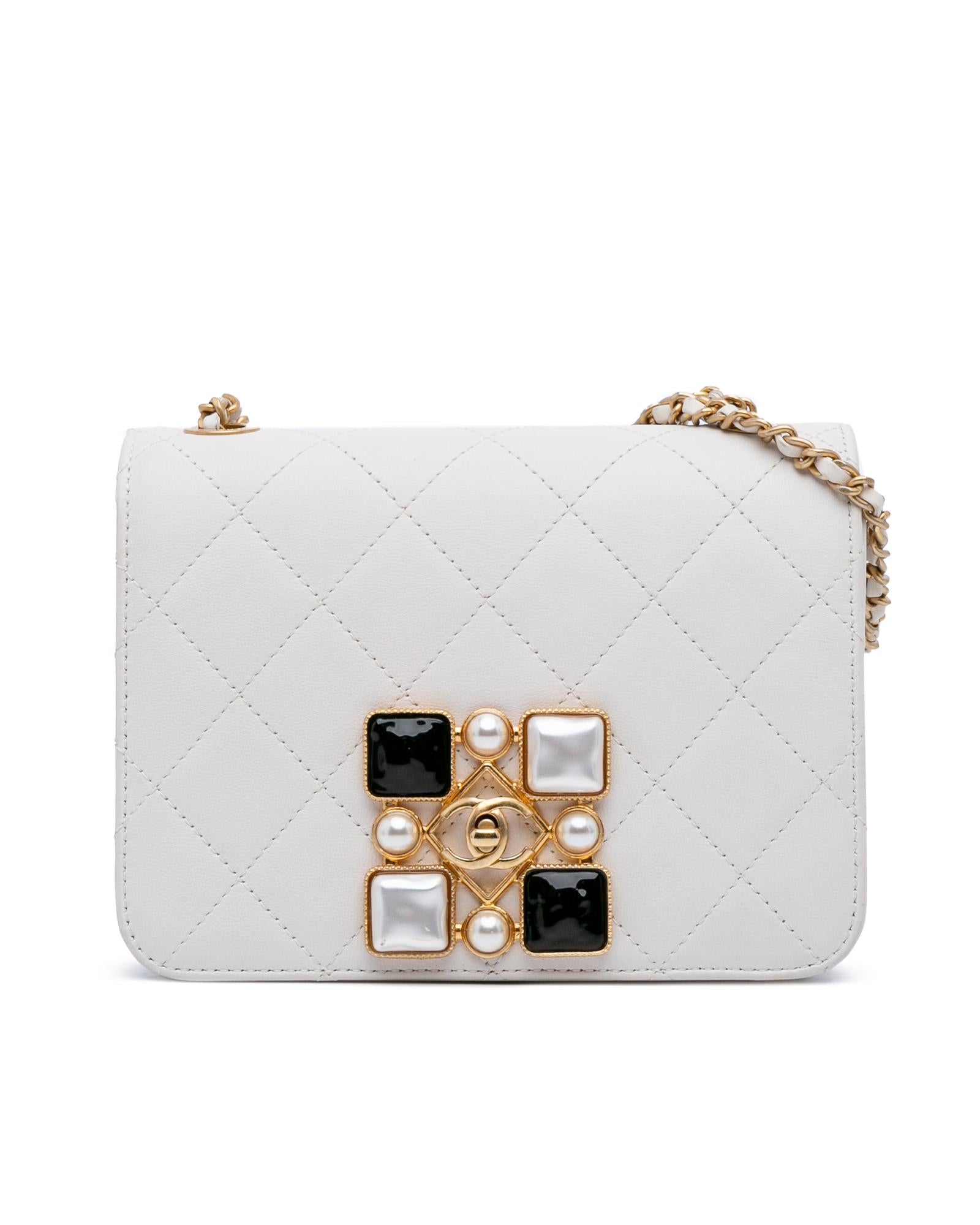 This flap bag features a quilted leather body a leather-woven chain strap a front flap with crystal and pearl embellishments and a CC turn lock closure an exterior back slip pocket and an interior slip pocket.Brand: Chanel