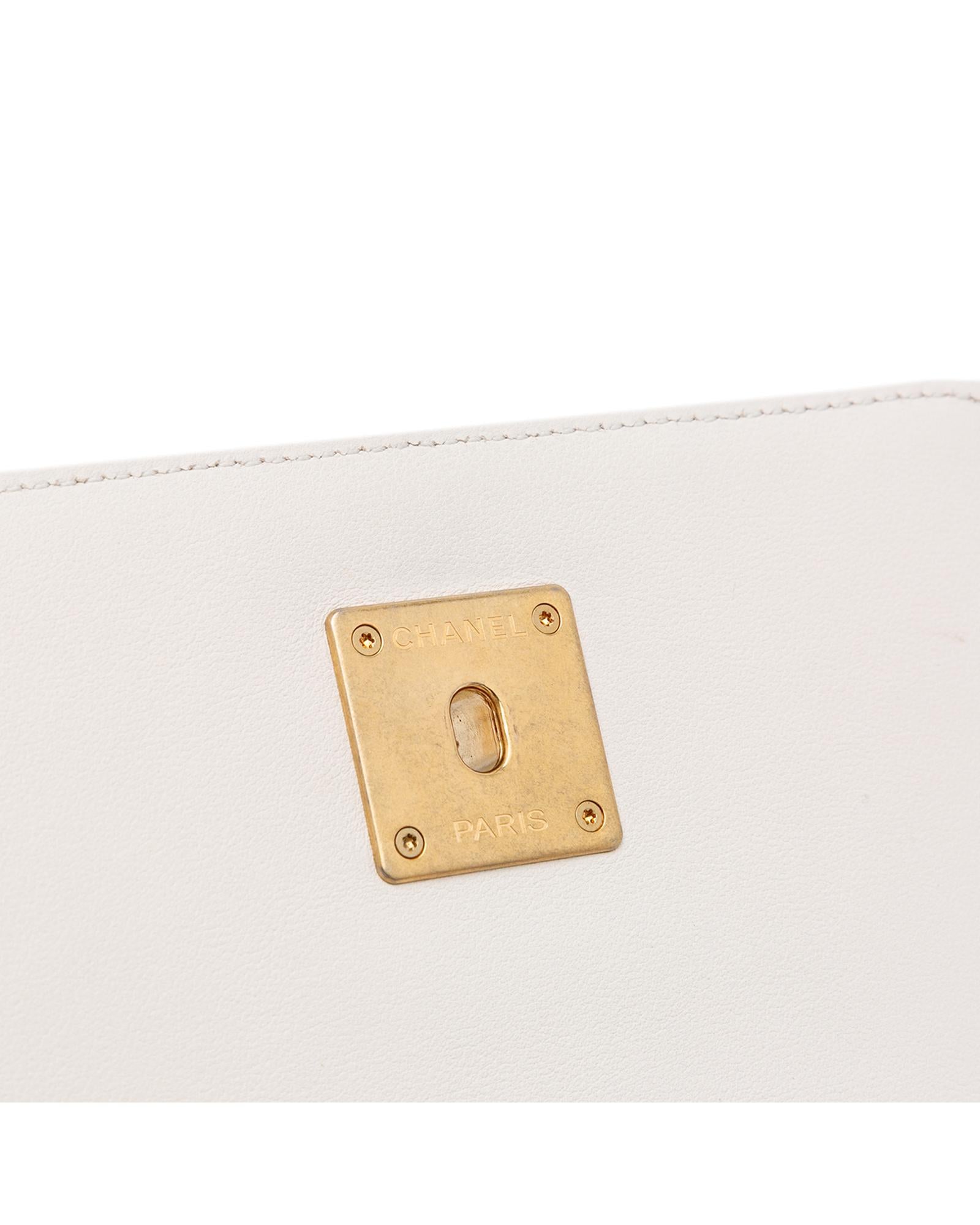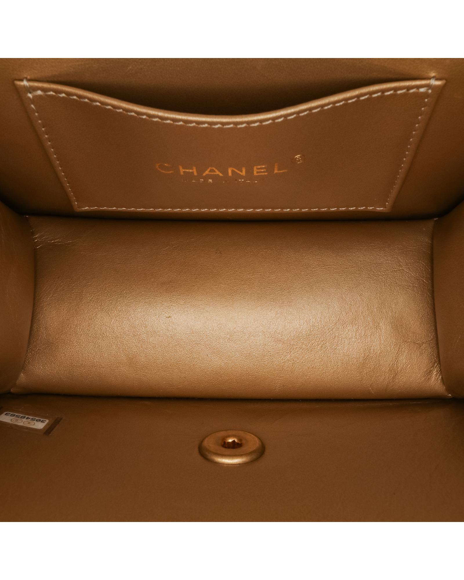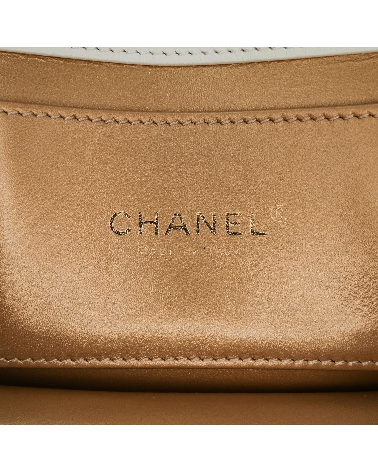 This flap bag features a quilted leather body a leather-woven chain strap a front flap with crystal and pearl embellishments and a CC turn lock closure an exterior back slip pocket and an interior slip pocket.Brand: Chanel