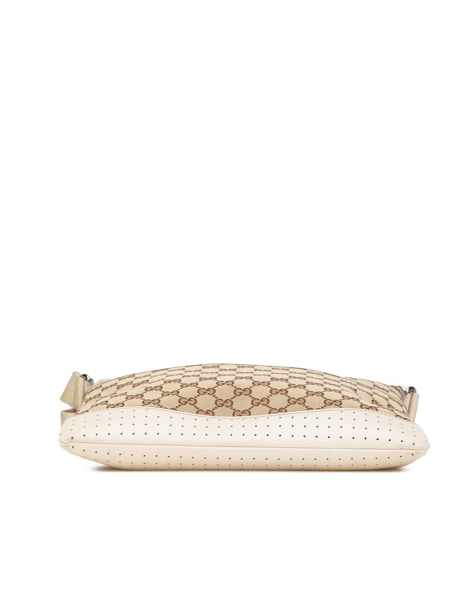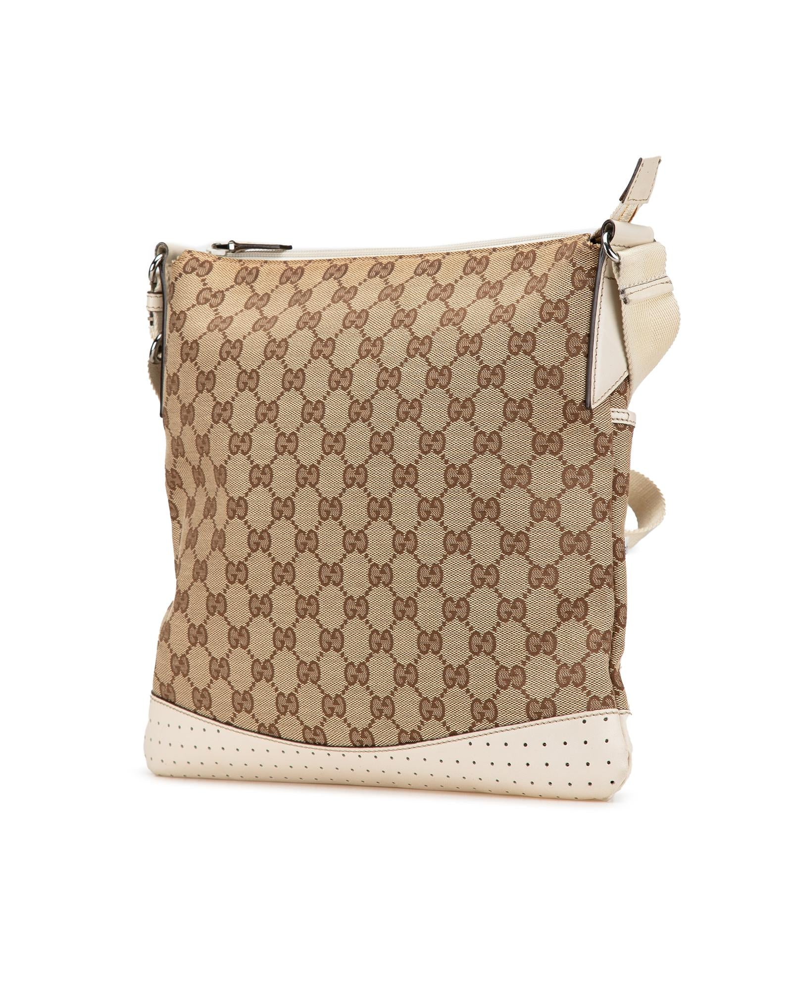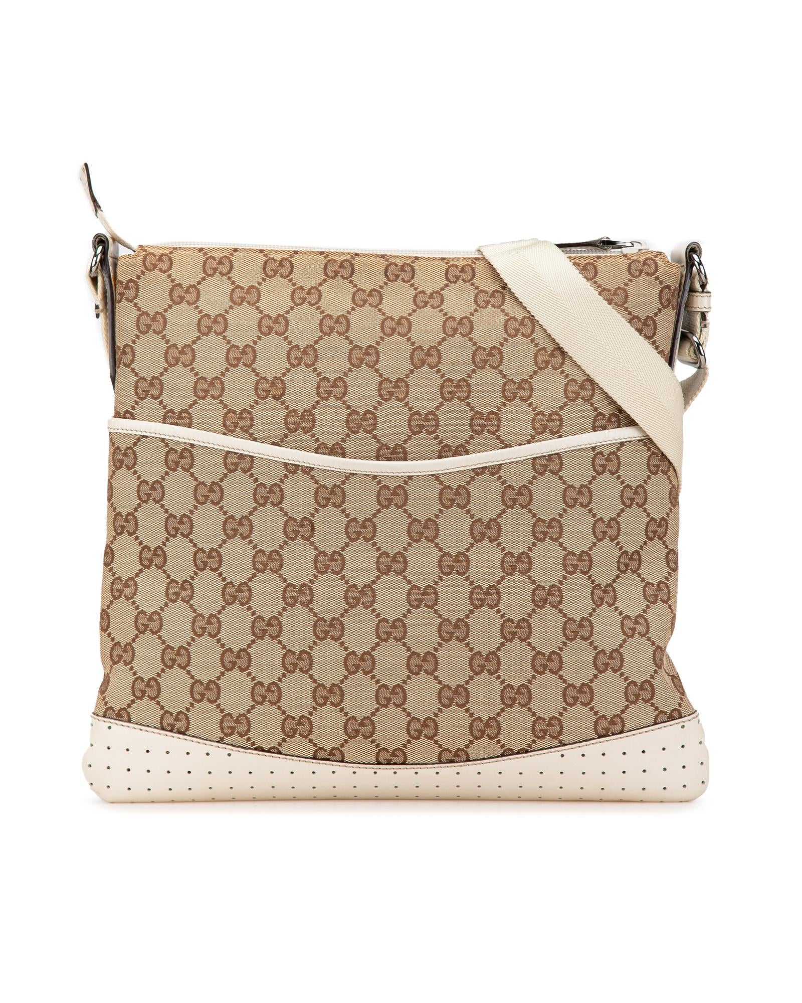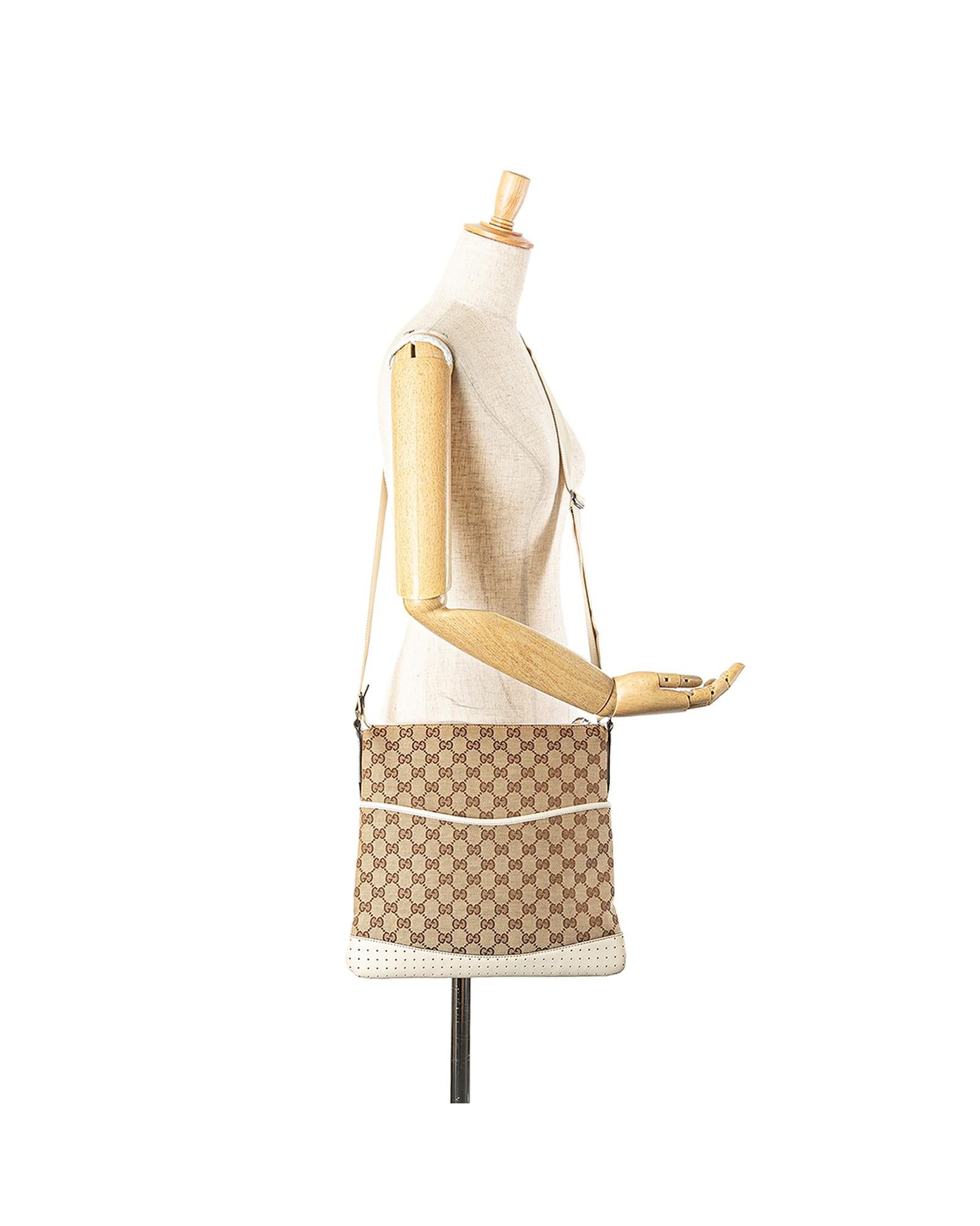 This crossbody bag features a canvas body with perforated leather trim an adjustable flat strap an open top an exterior slip pocket and interior zip and slip pockets.Brand: Gucci