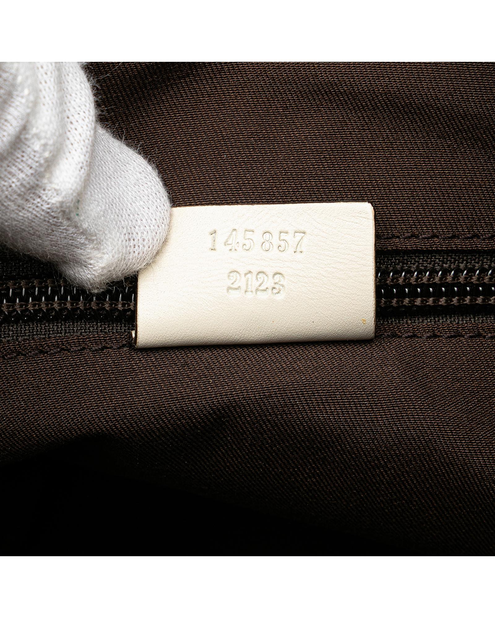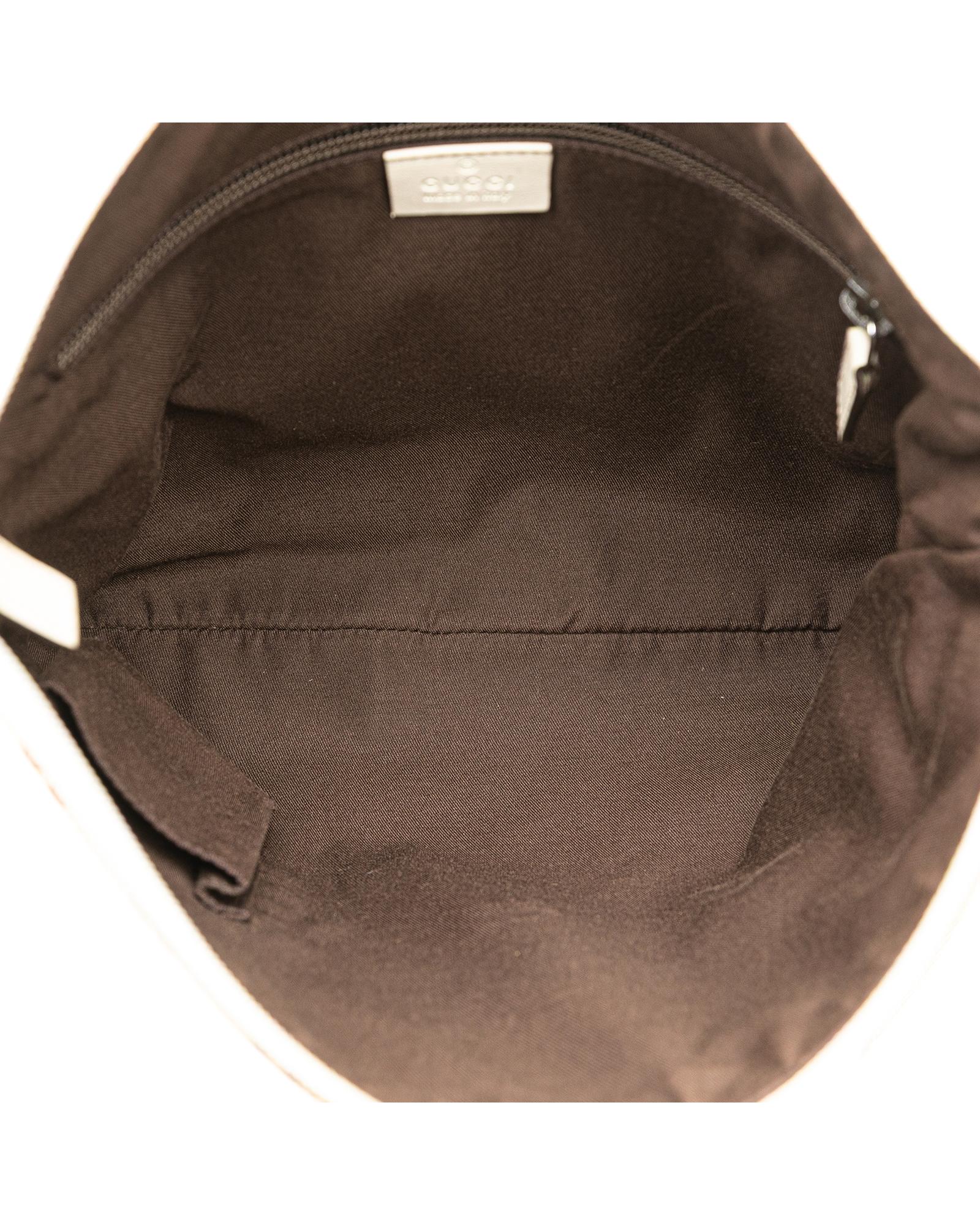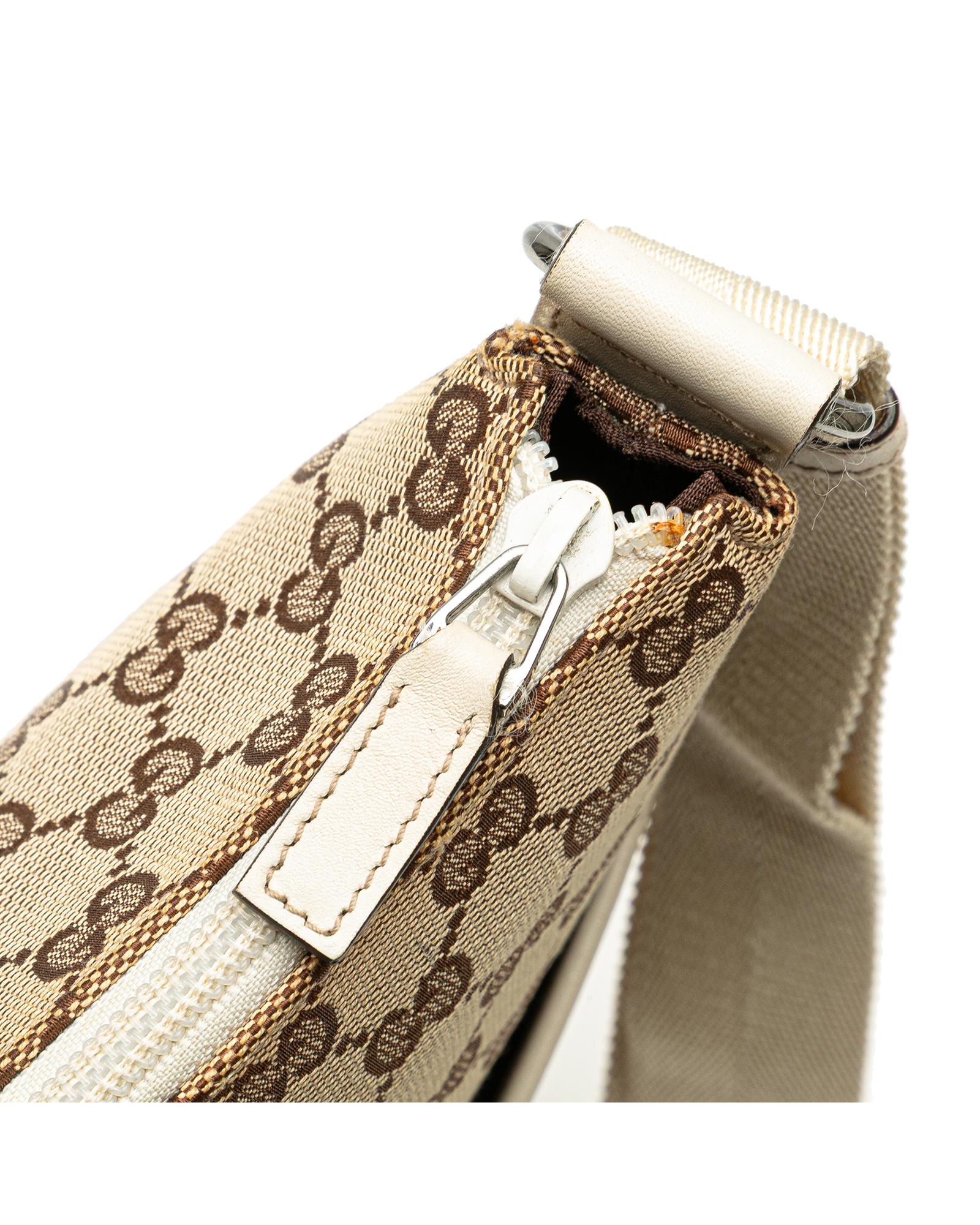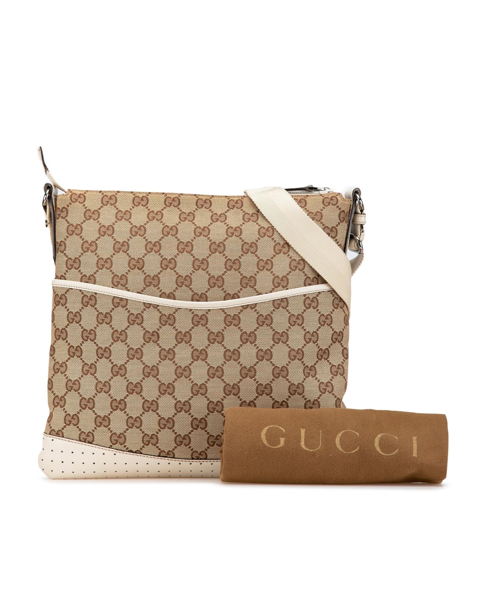 This crossbody bag features a canvas body with perforated leather trim an adjustable flat strap an open top an exterior slip pocket and interior zip and slip pockets.Brand: Gucci