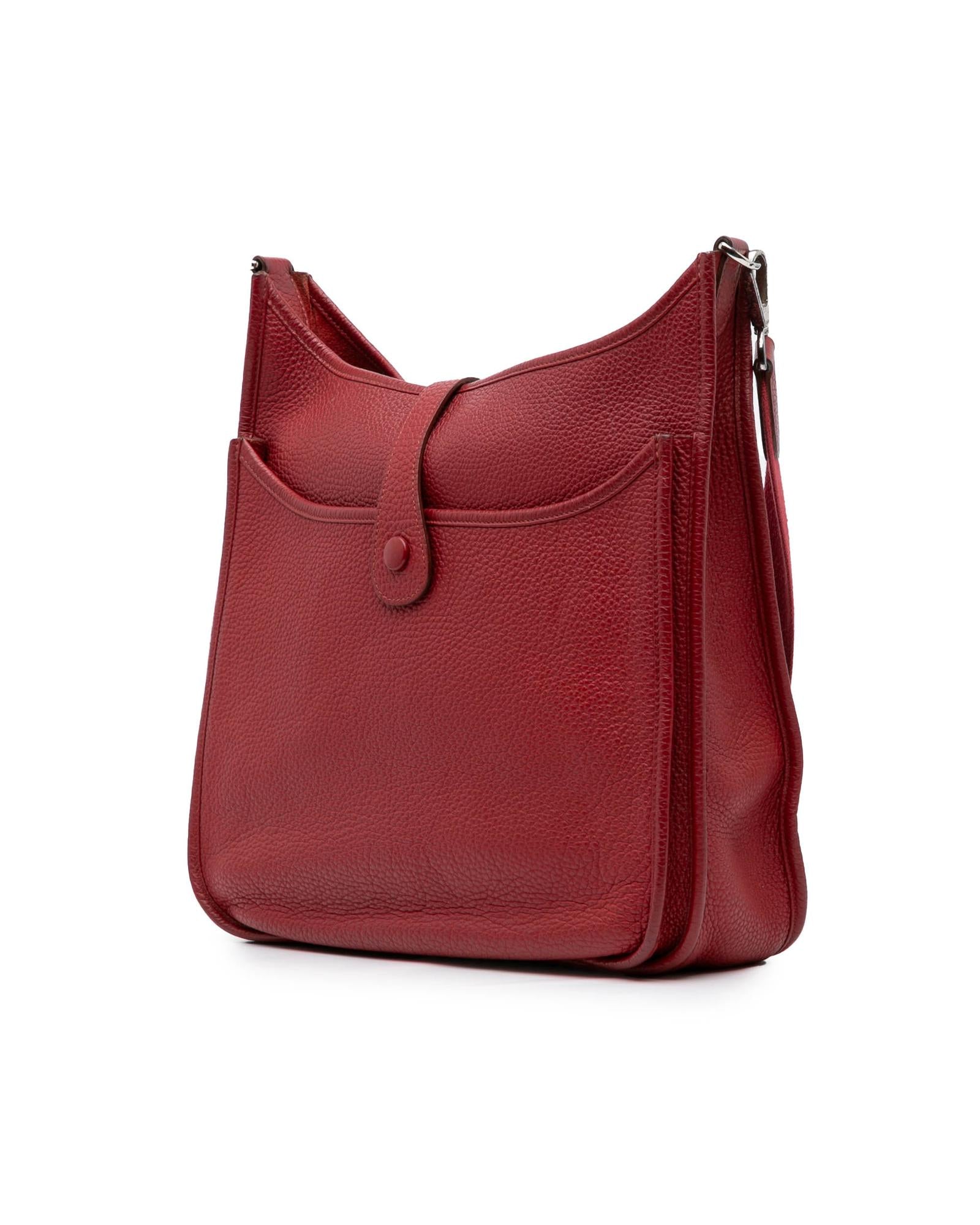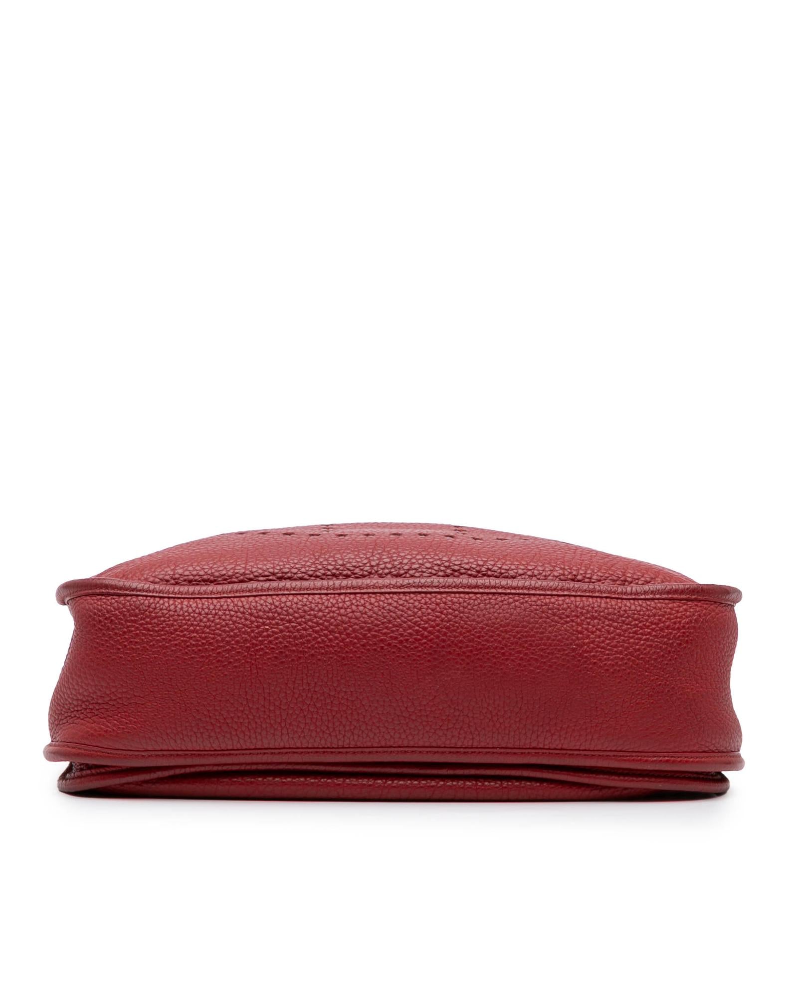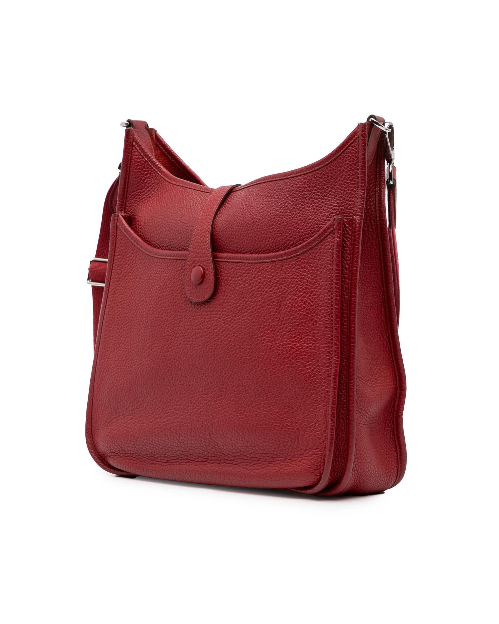 This Evelyne III PM features a Clemence leather body in Rouge Grenat color a removable and adjustable flat leather strap a top strap closure and an exterior slip pocket.Brand: Hermes