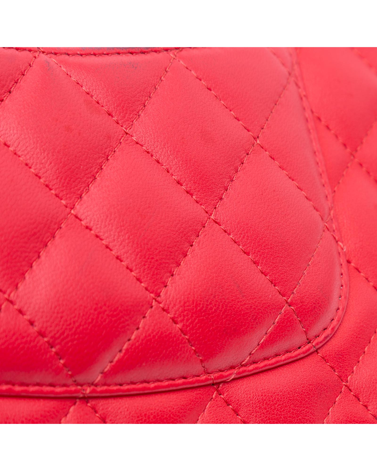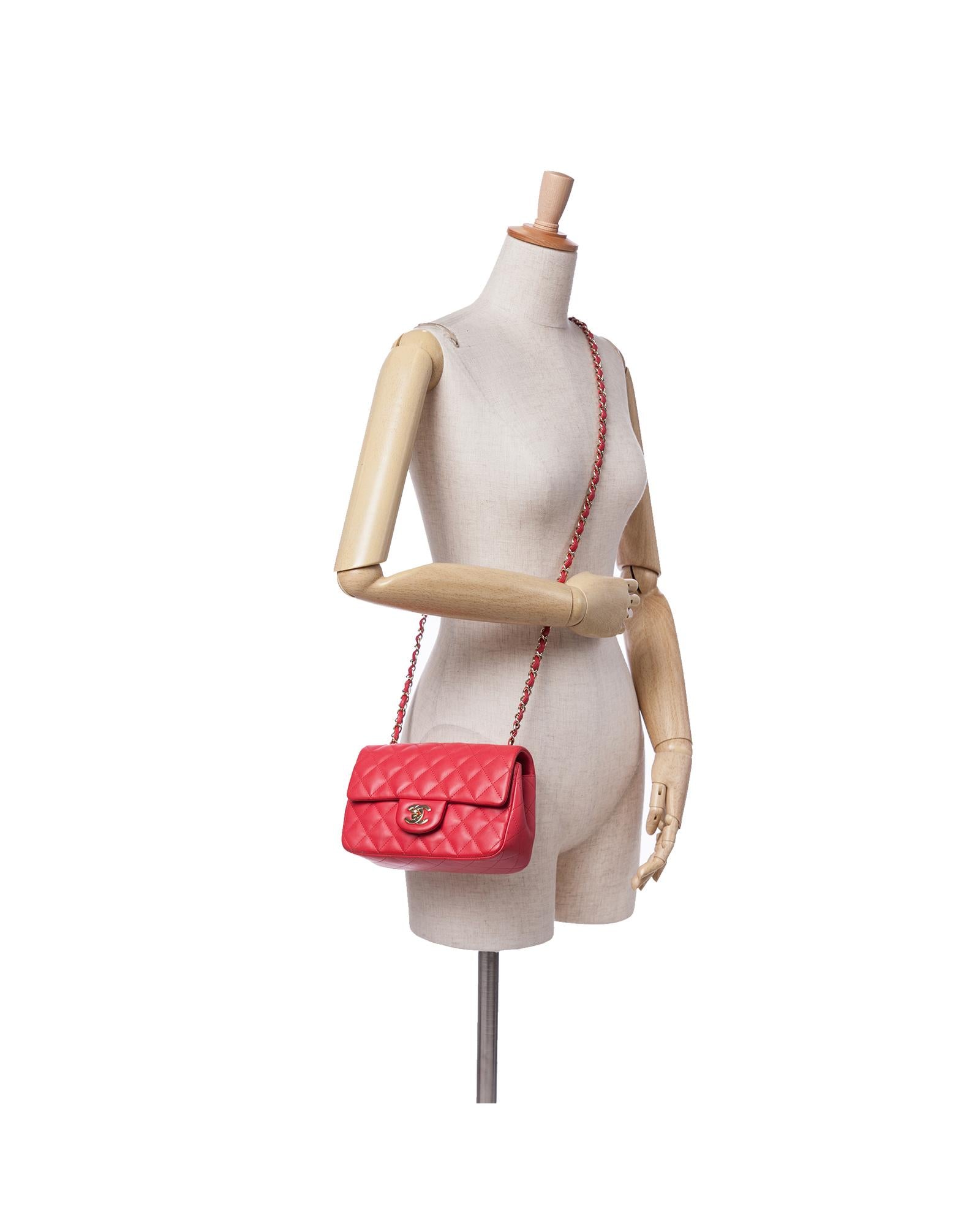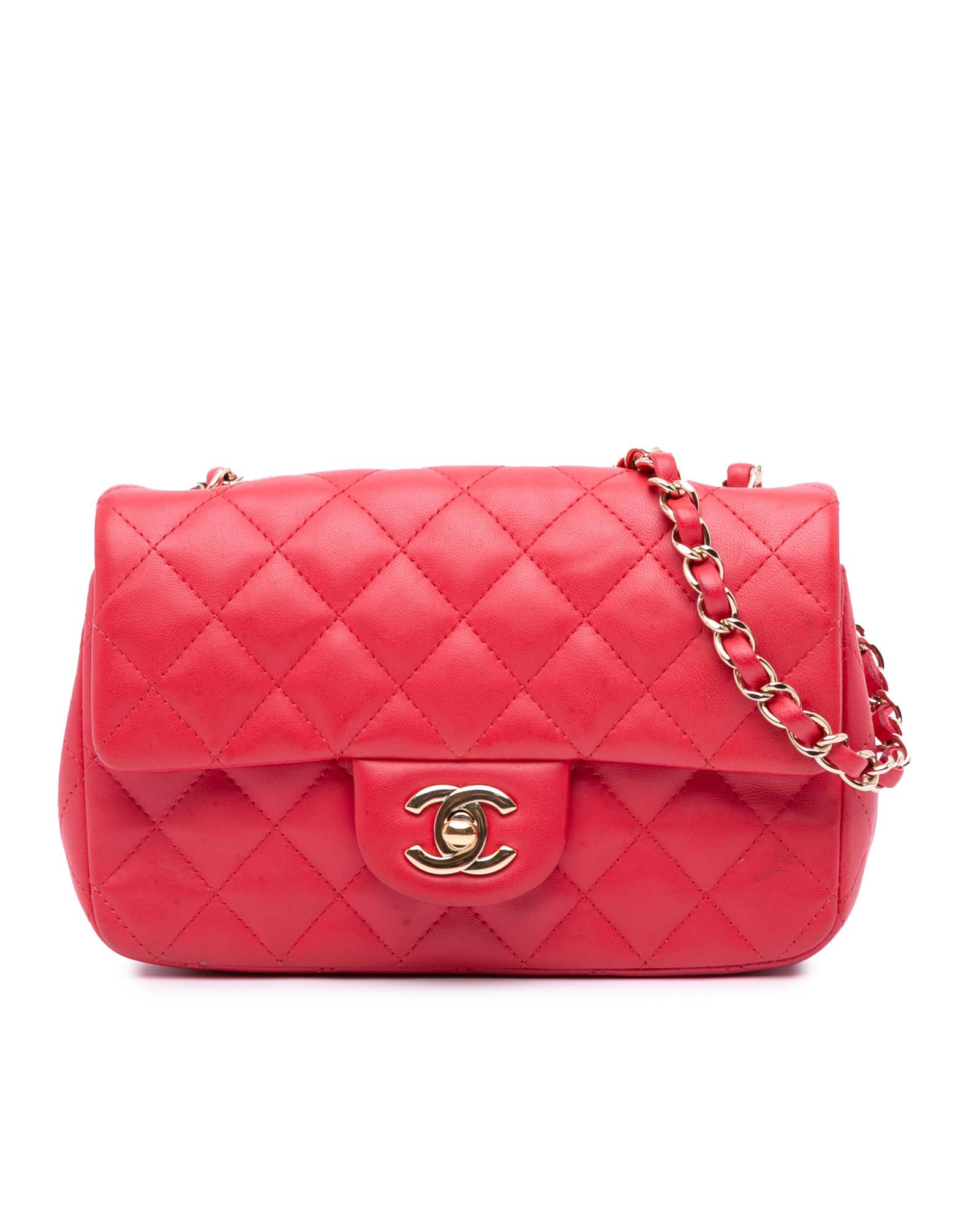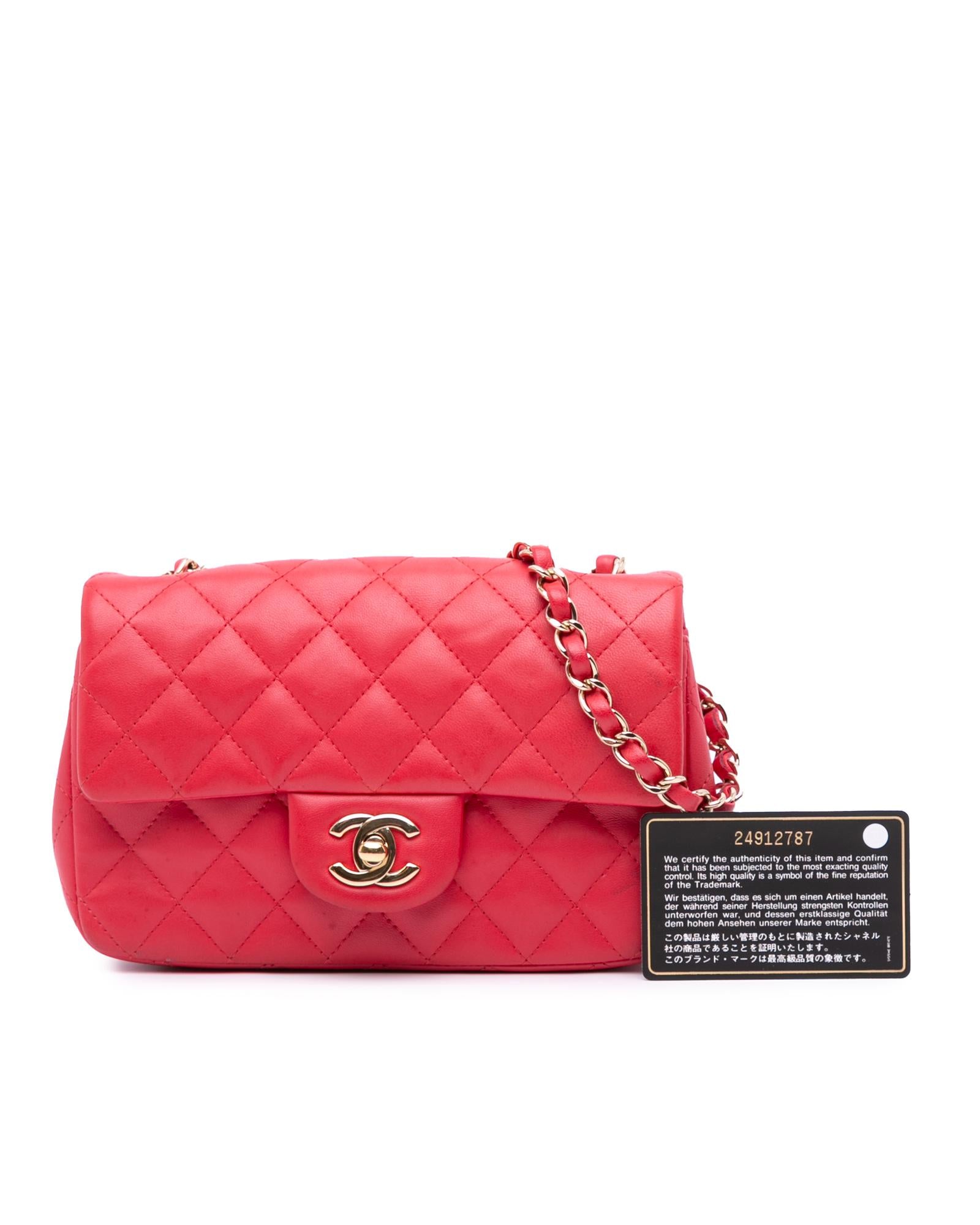 This flap bag features a lambskin leather body a leather woven chain link shoulder strap a front flap with CC turn lock closure and interior zip and slip pockets.Brand: Chanel