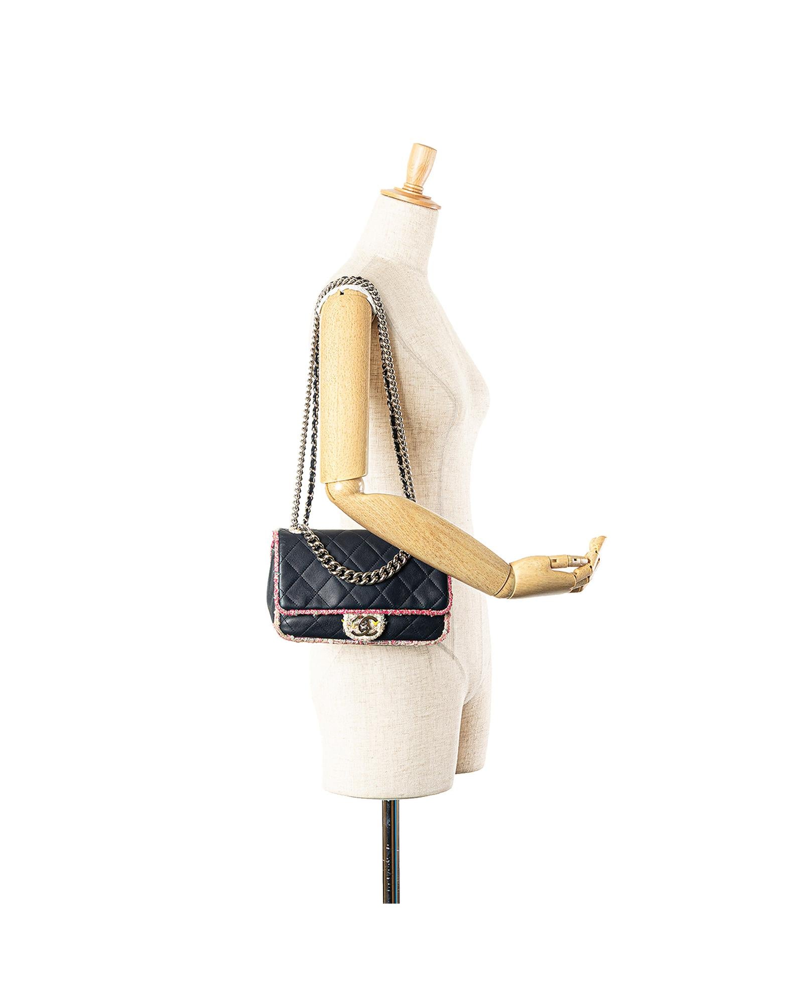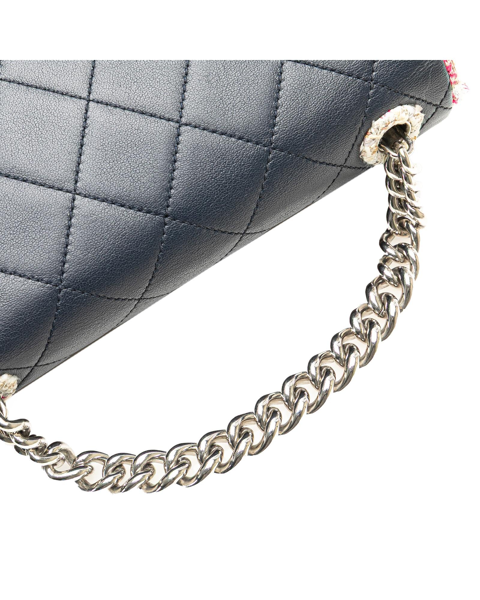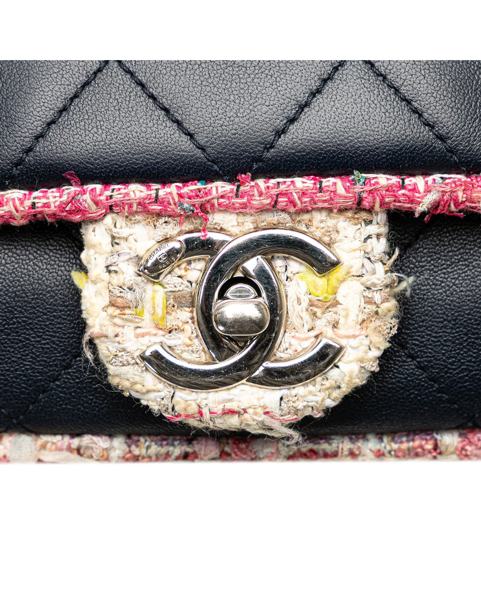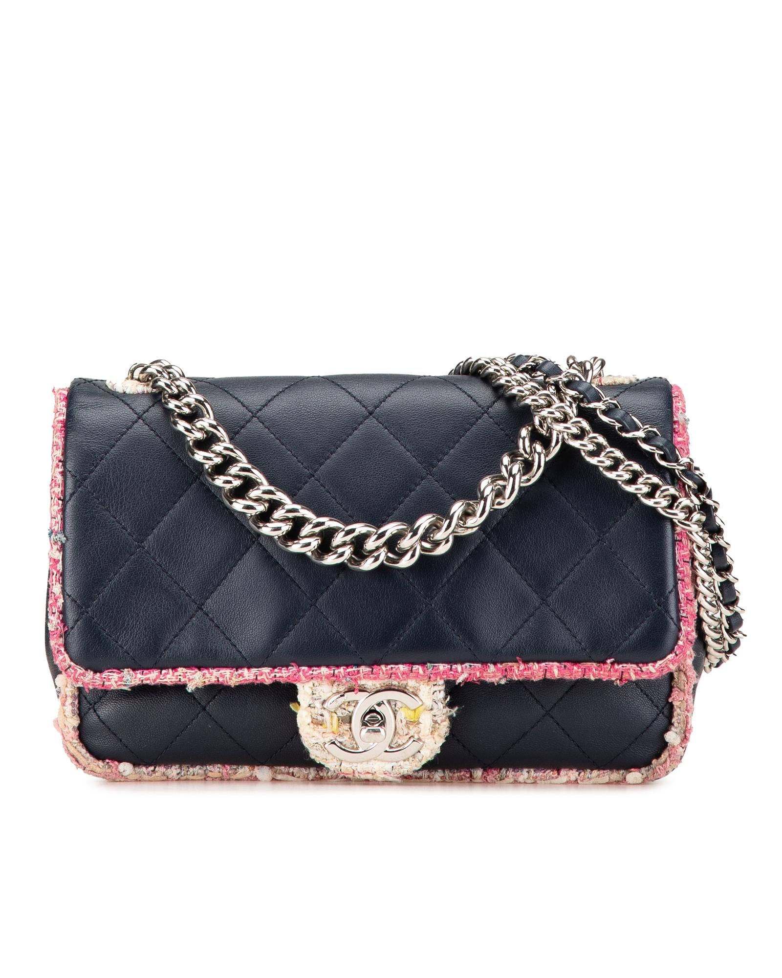 This satchel features a quilted lambskin leather body with tweed trim a chain link handle a detachable double layered chain link strap a front flap with CC turn-lock closure an exterior back slip pocket and an interior zip pocket.Brand: Chanel