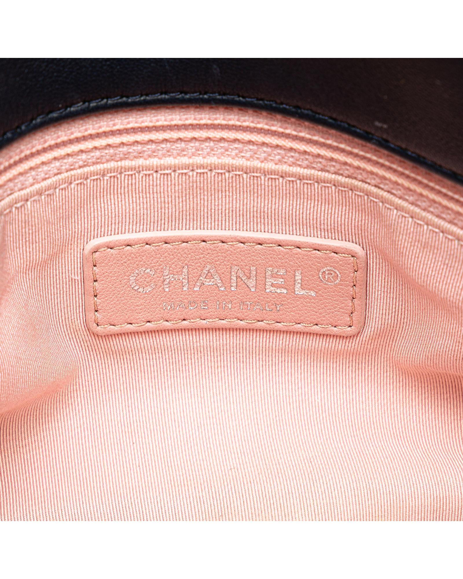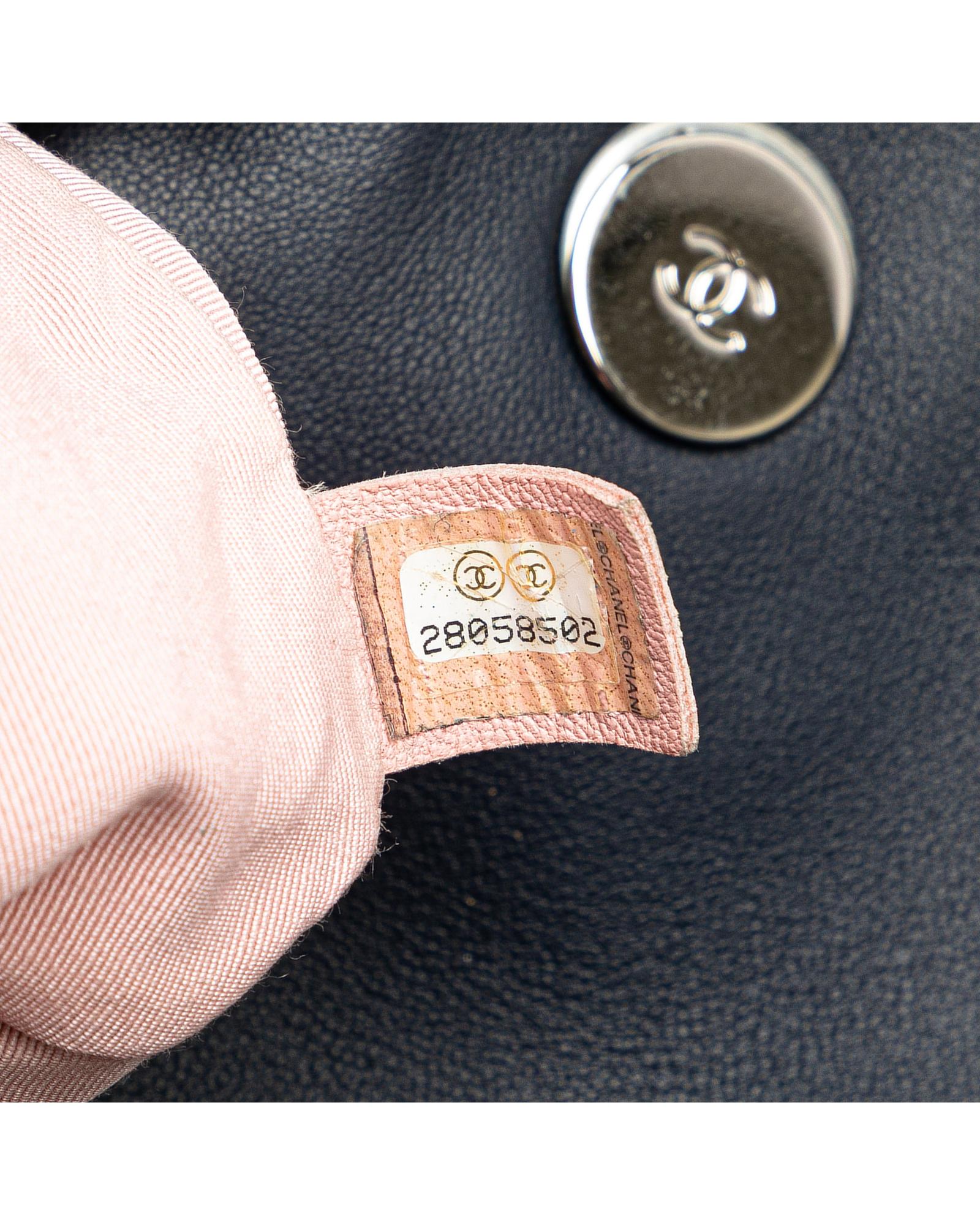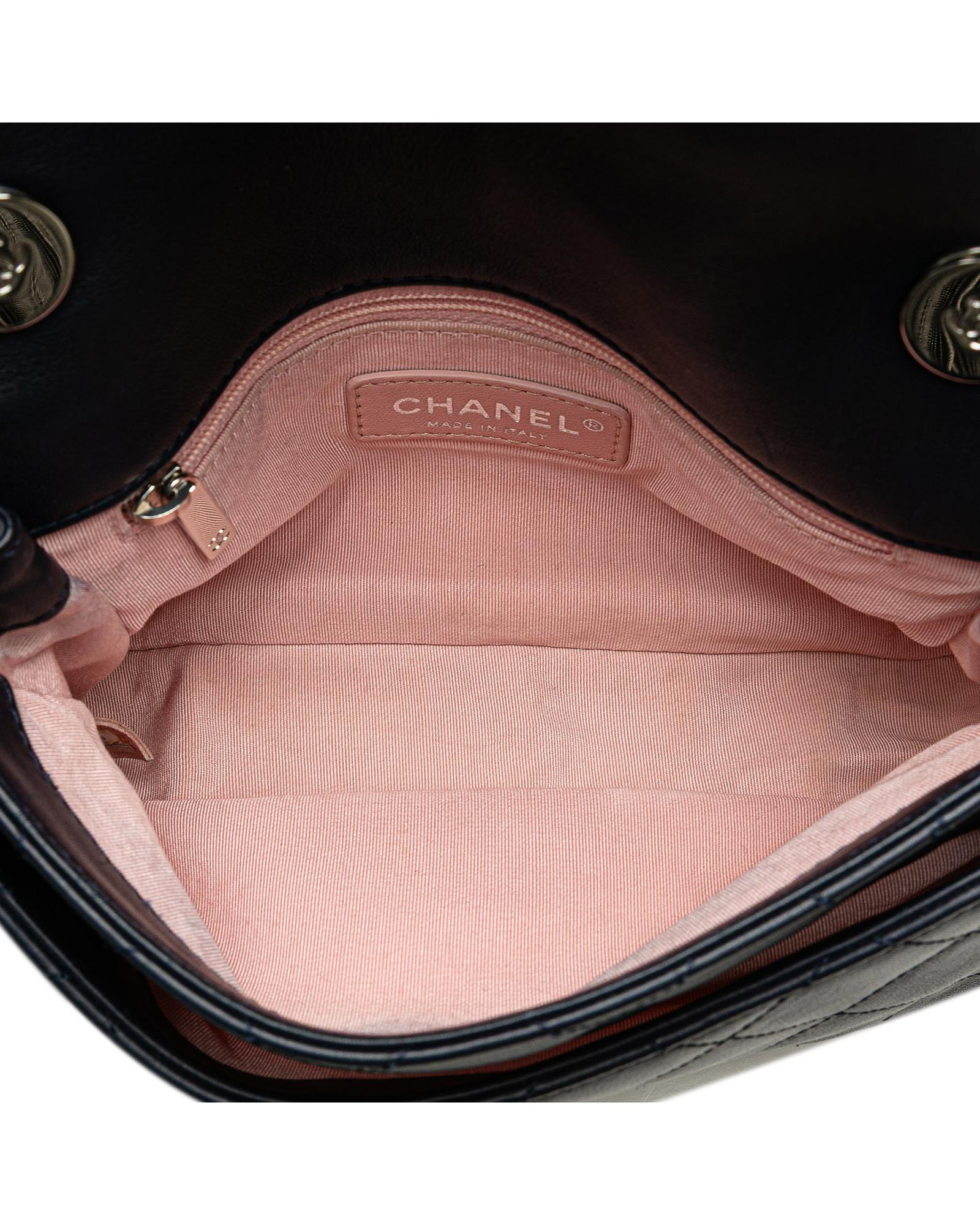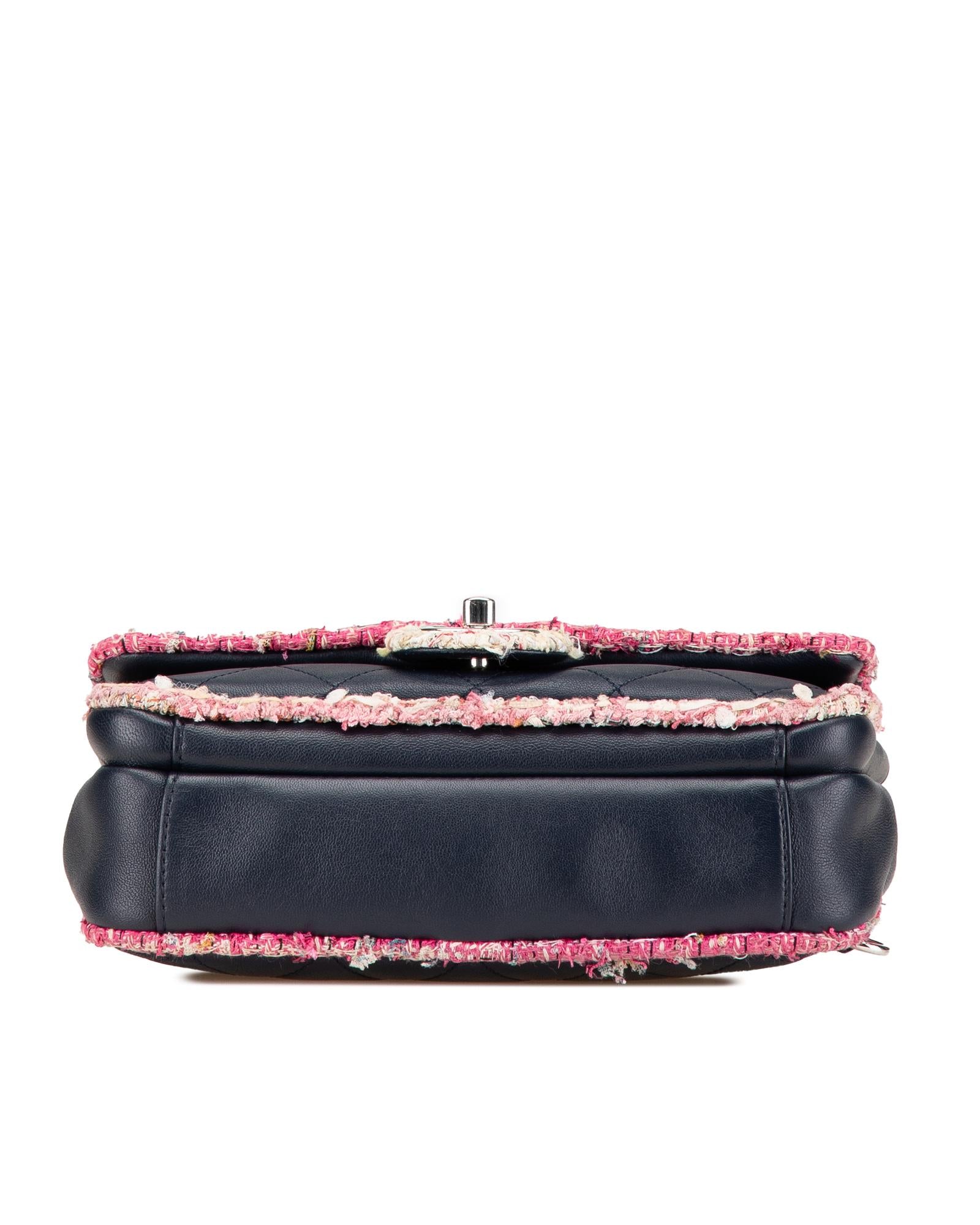 This satchel features a quilted lambskin leather body with tweed trim a chain link handle a detachable double layered chain link strap a front flap with CC turn-lock closure an exterior back slip pocket and an interior zip pocket.Brand: Chanel