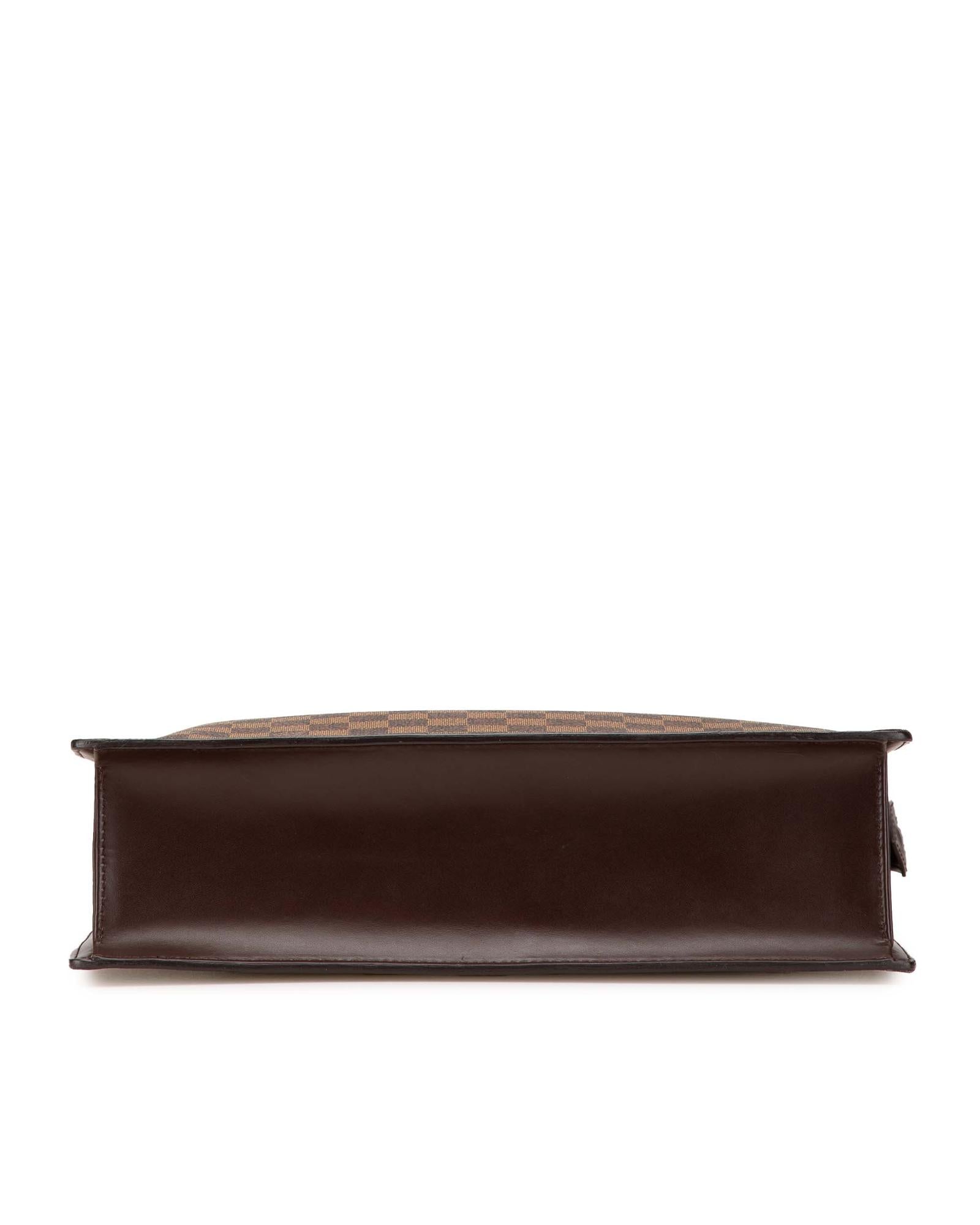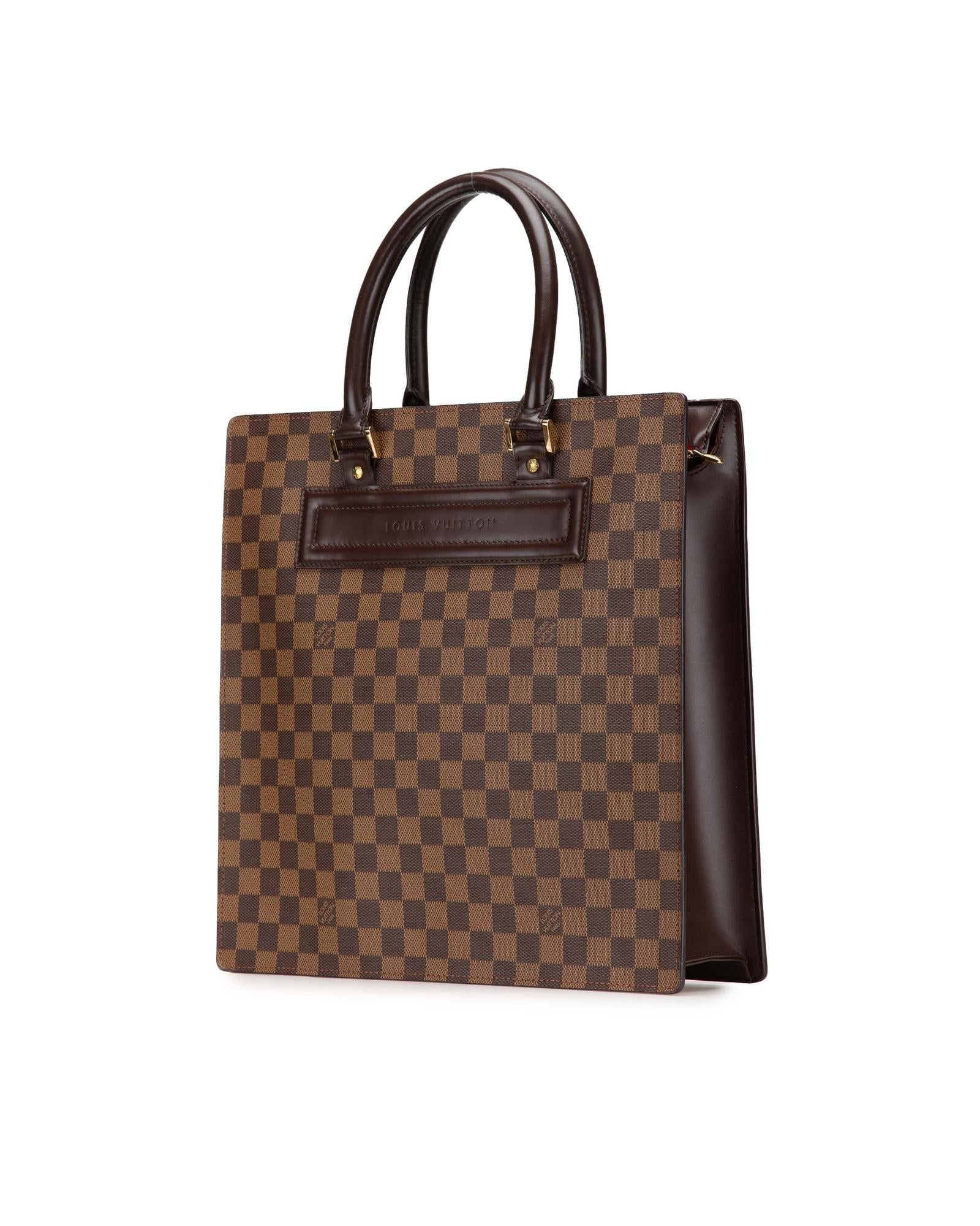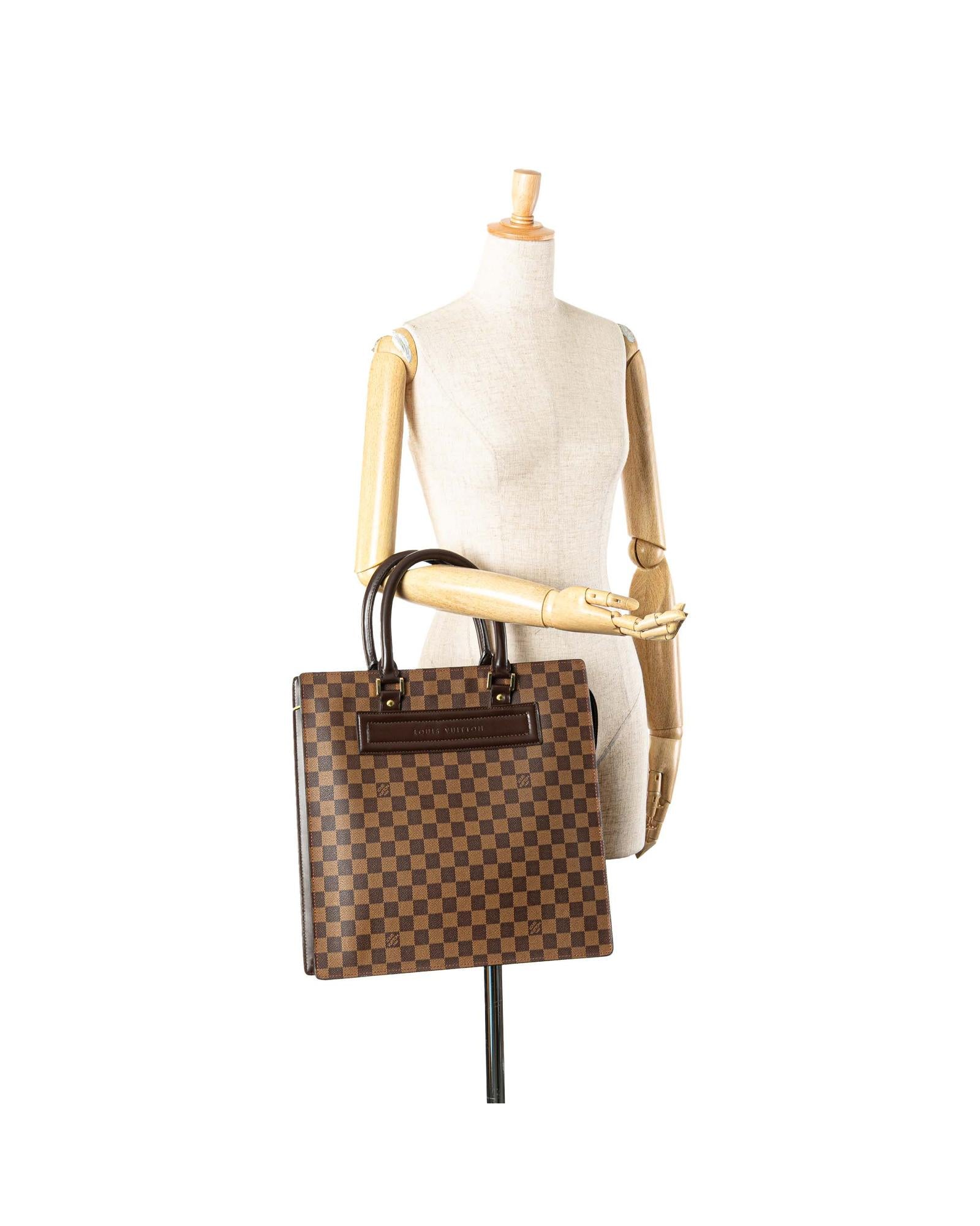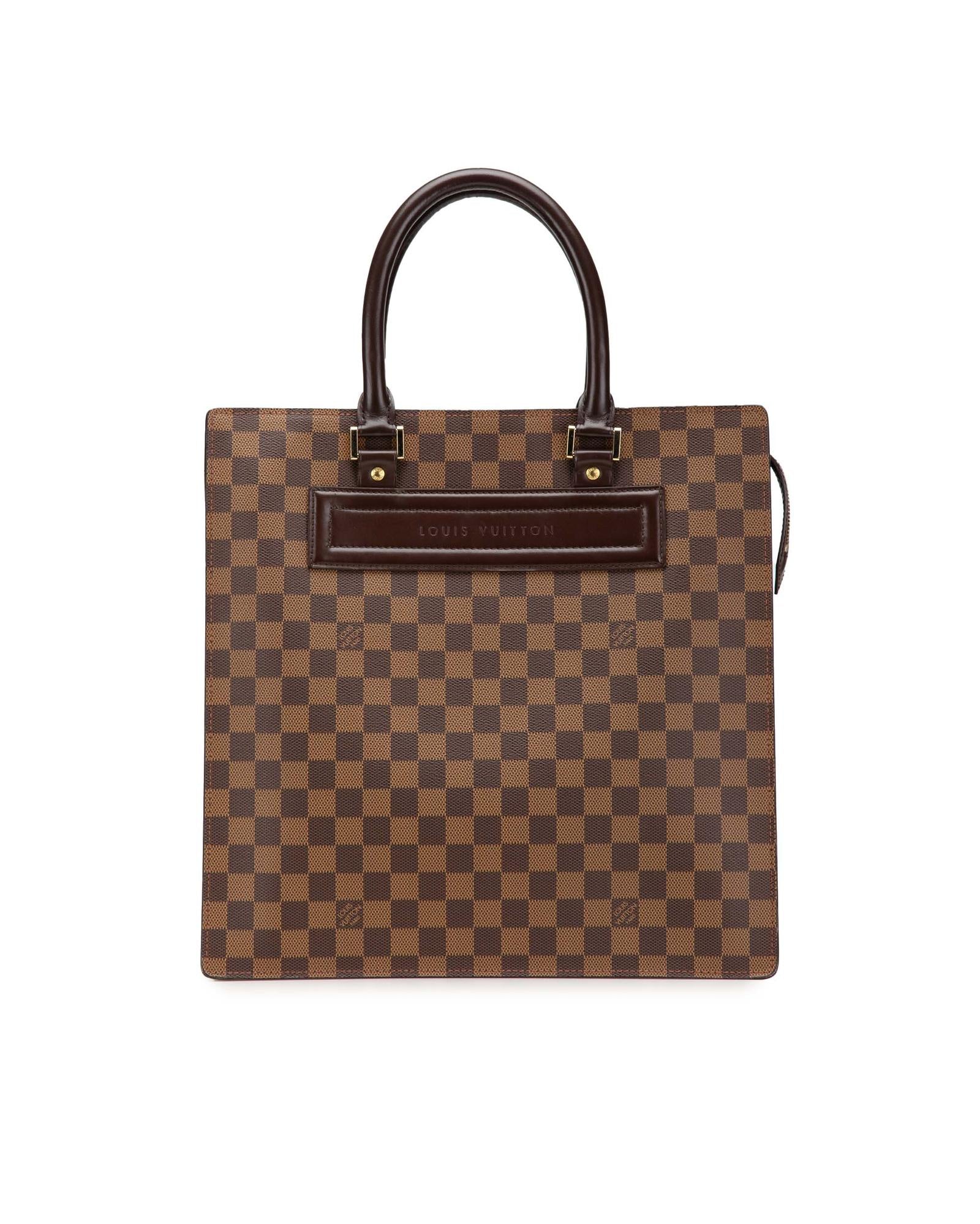 The Venice Sac Plat GM features a damier ebene canvas body rolled leather handles a top zip closure and interior slip pockets.