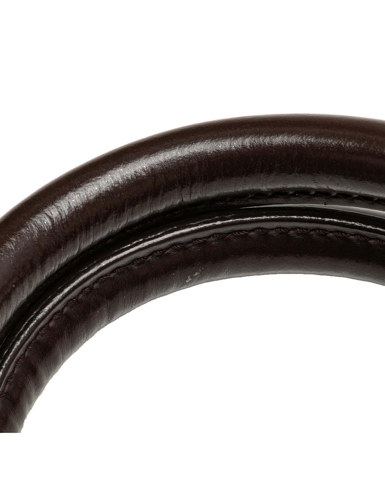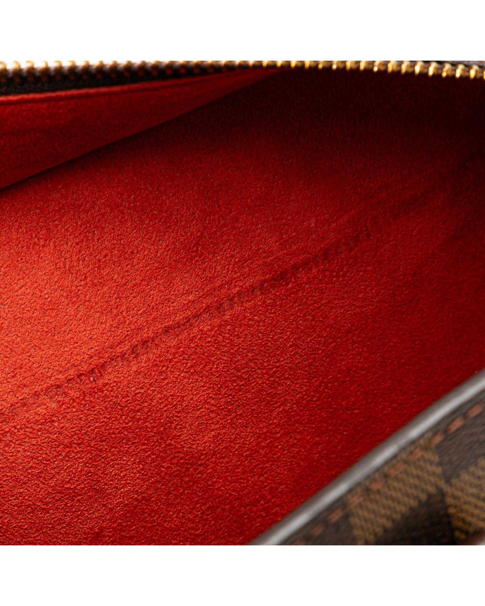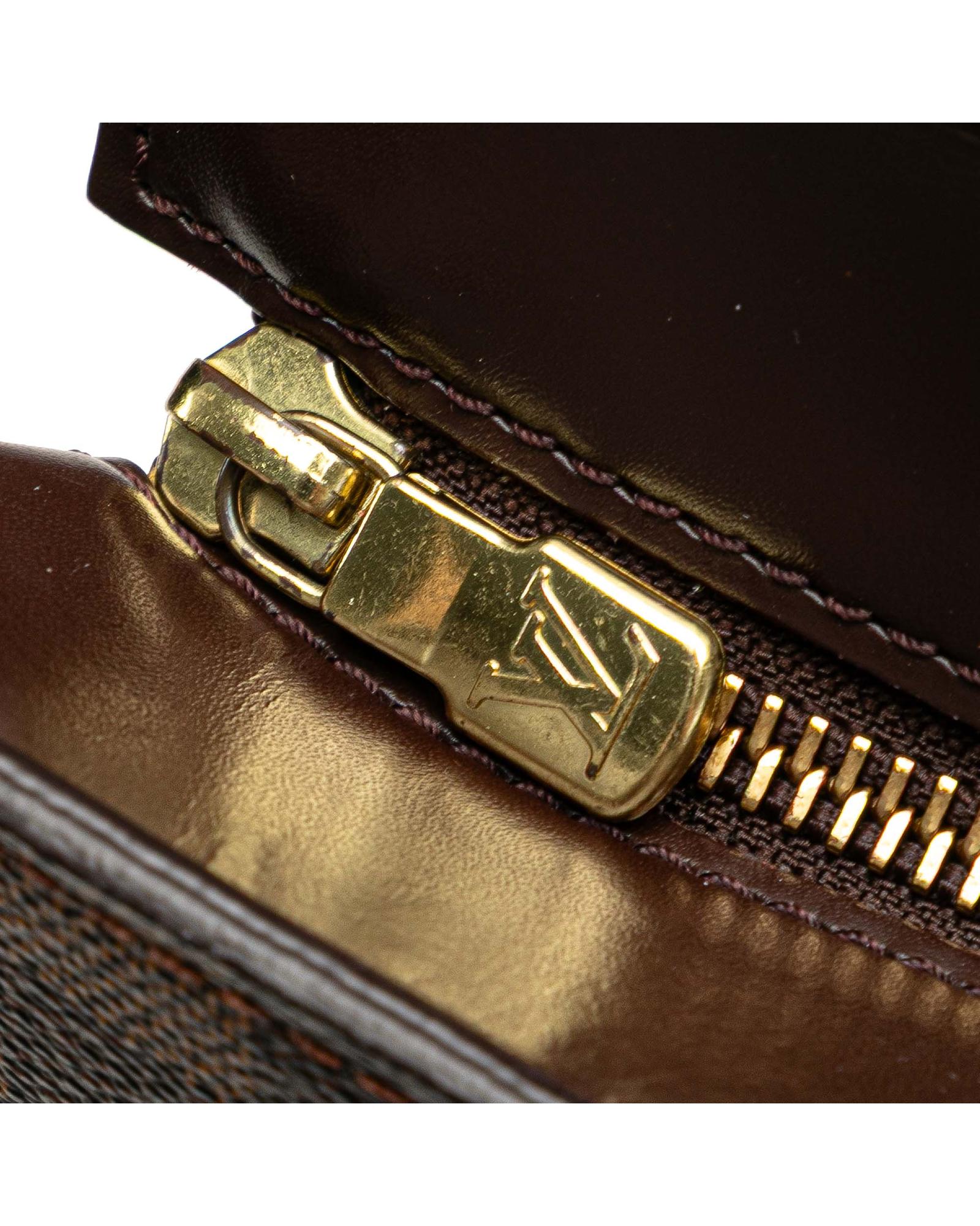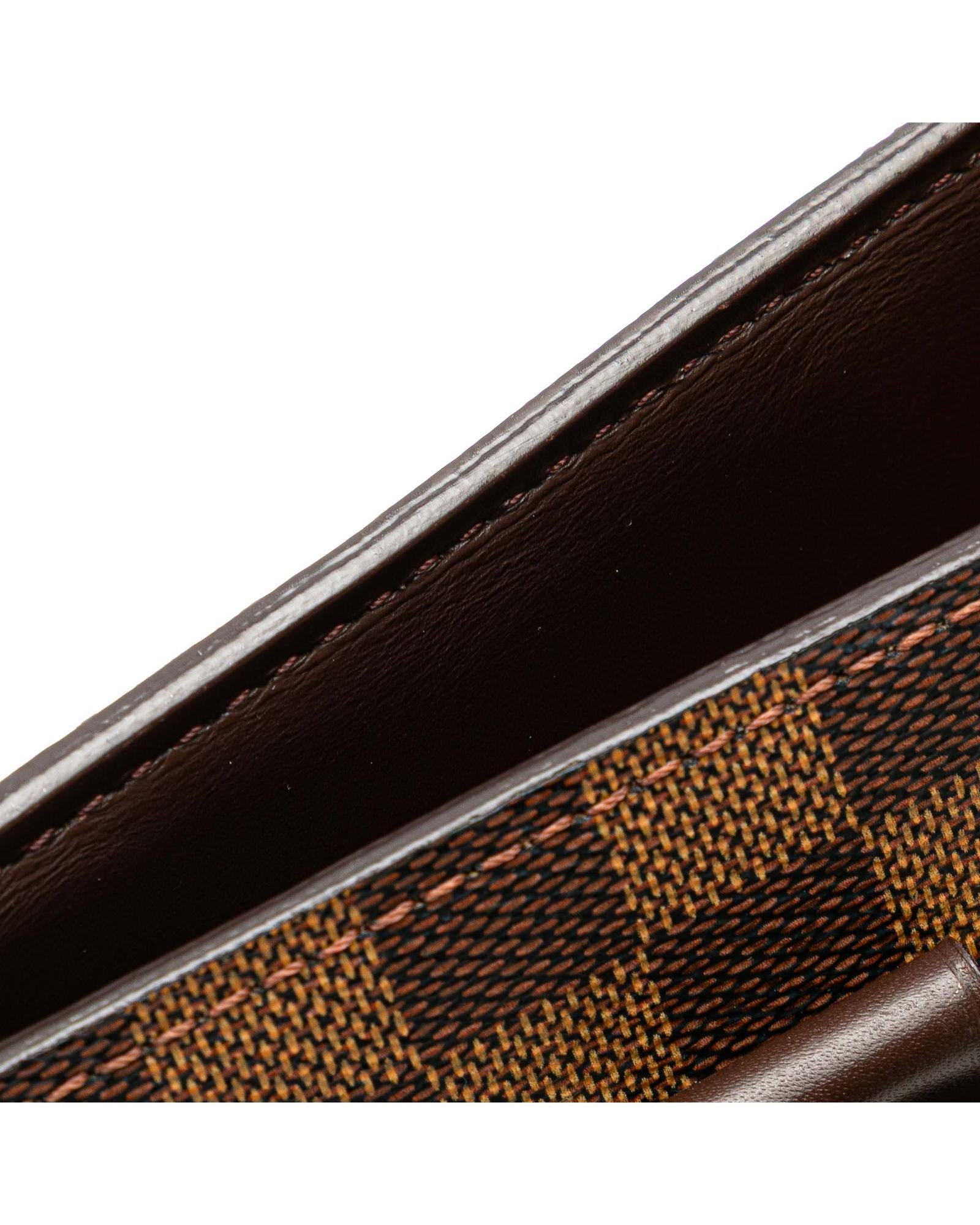 The Venice Sac Plat GM features a damier ebene canvas body rolled leather handles a top zip closure and interior slip pockets.