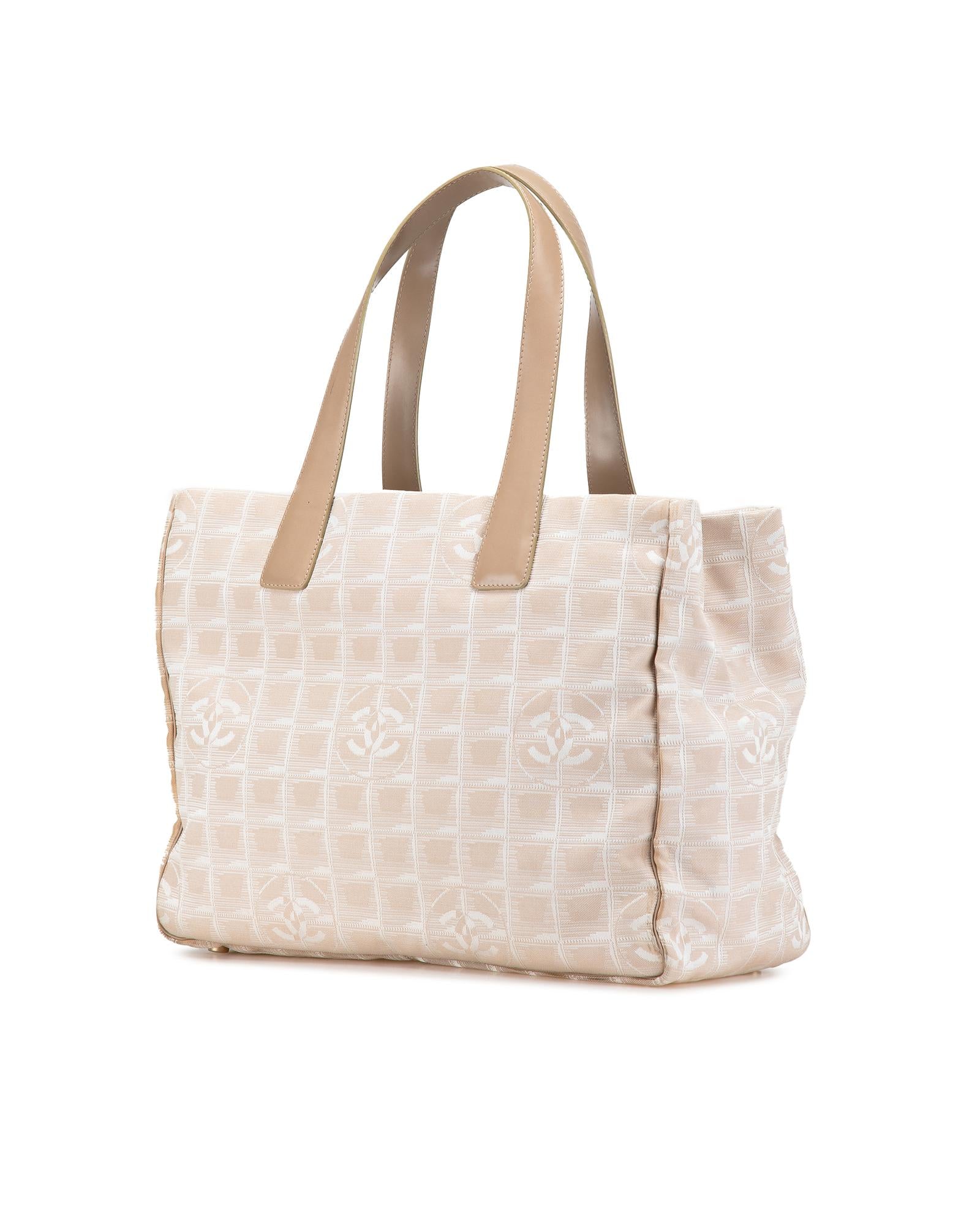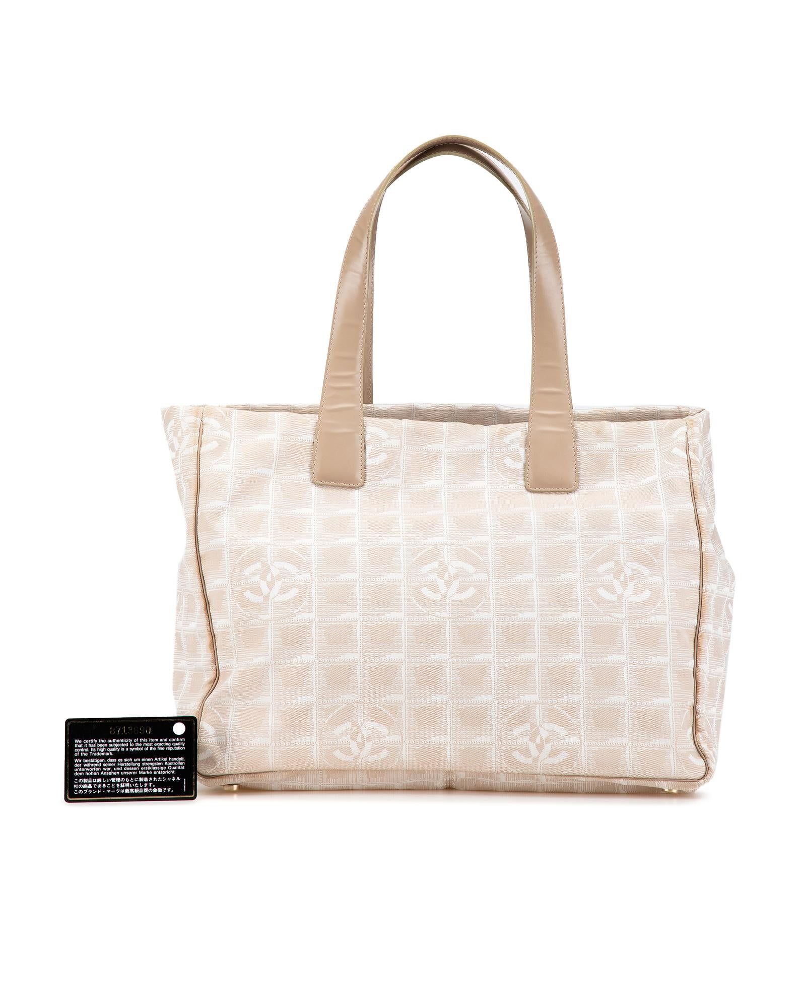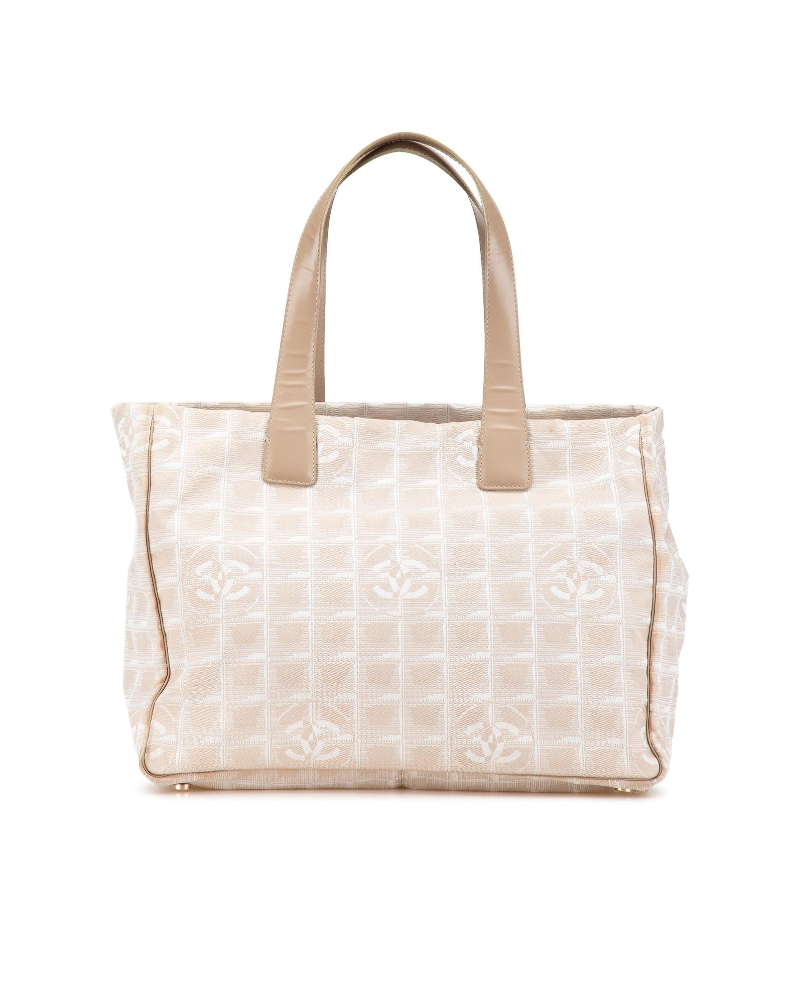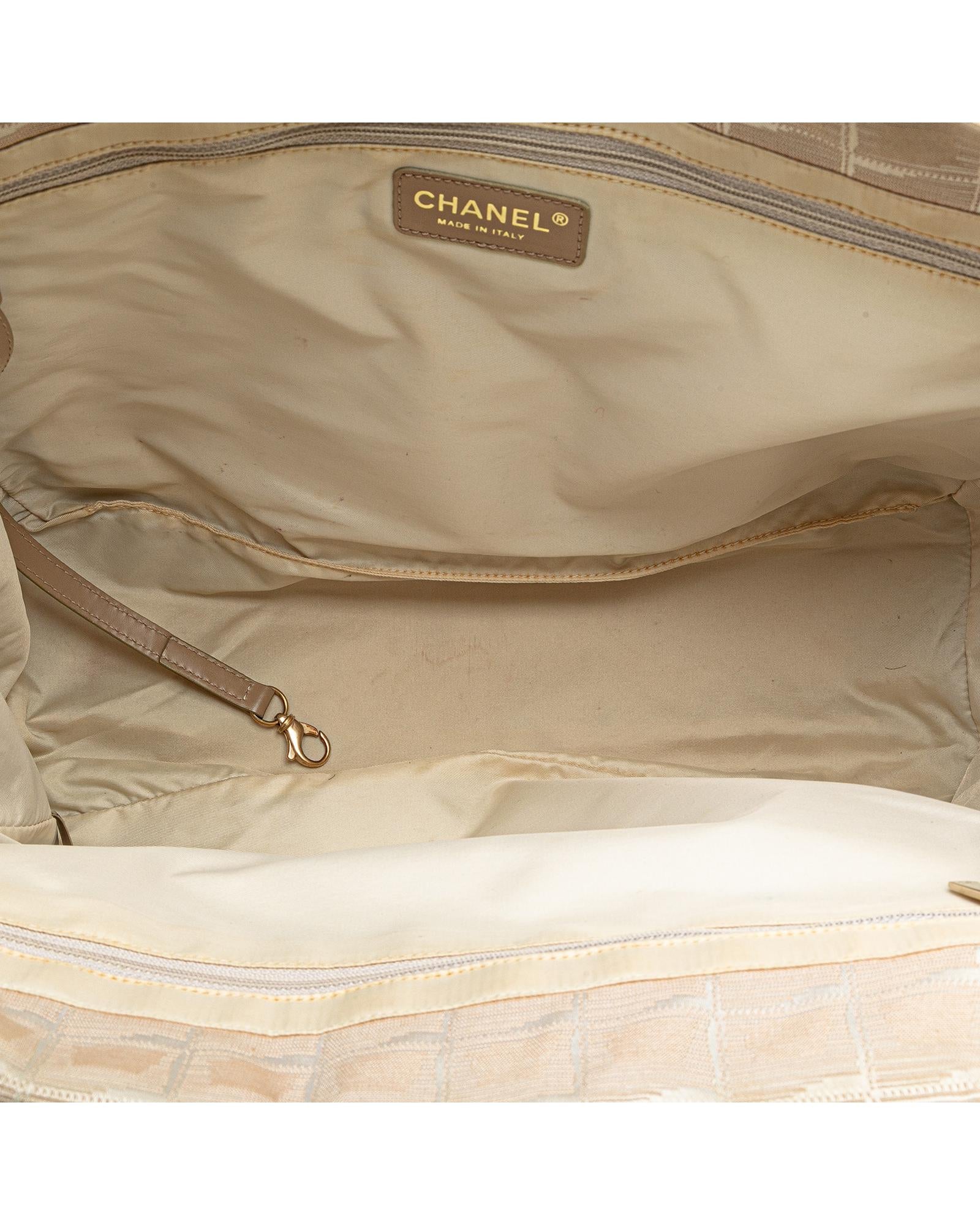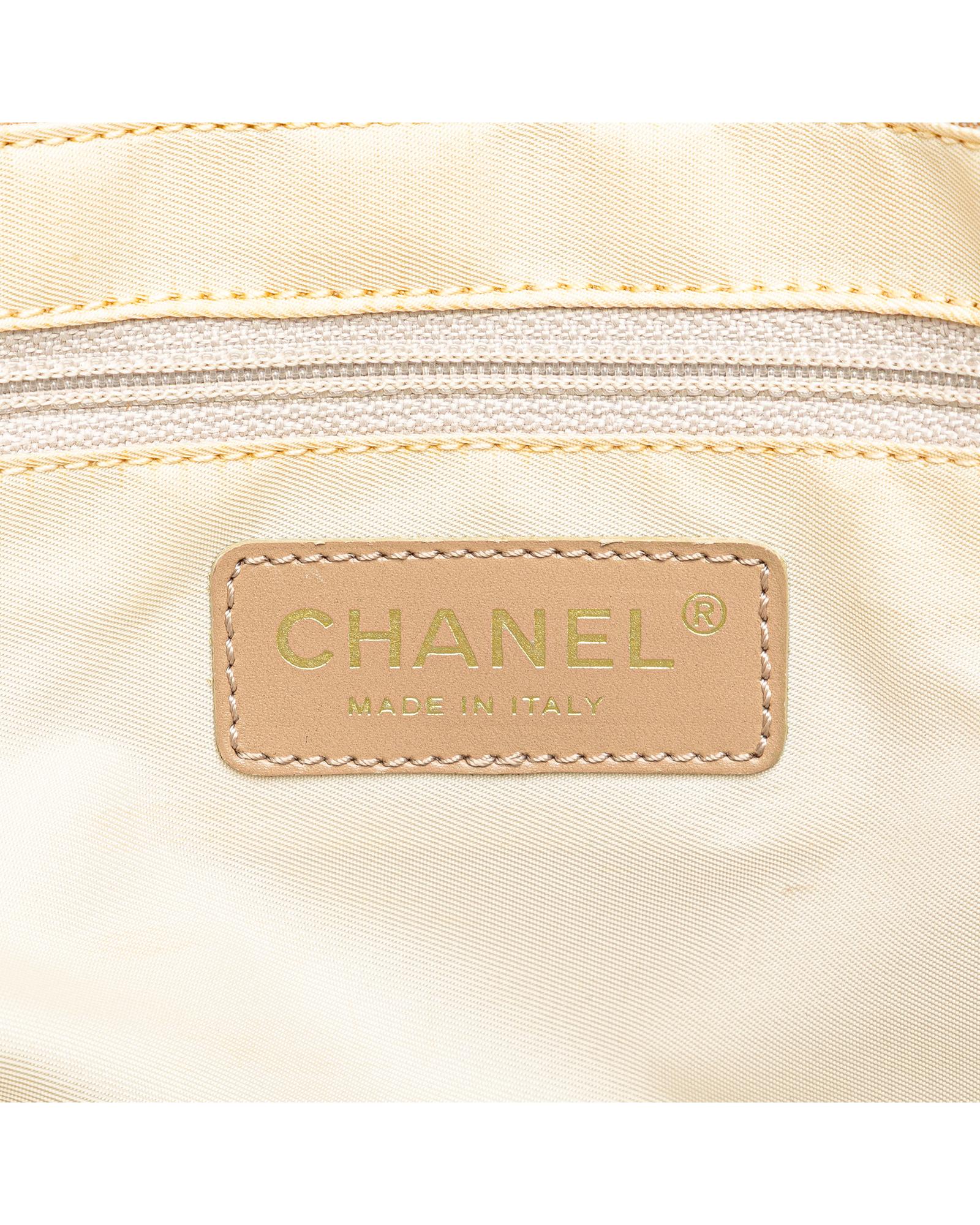 This tote bag features a nylon body with leather trim flat leather straps a top zip closure and interior zip pockets.Brand: Chanel