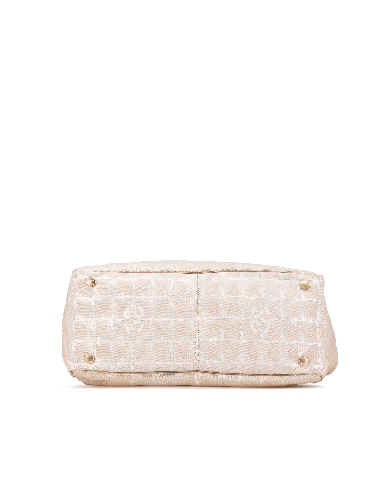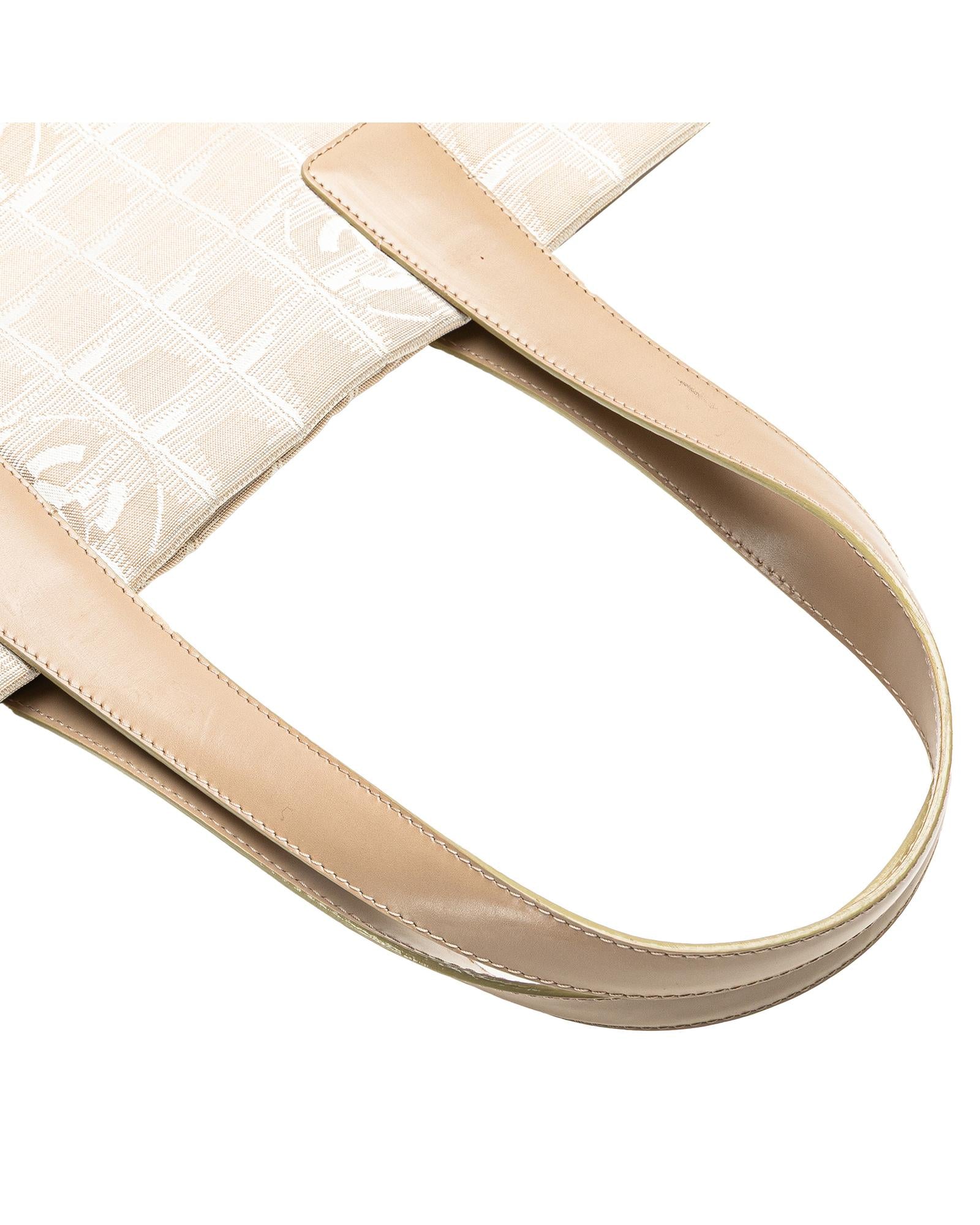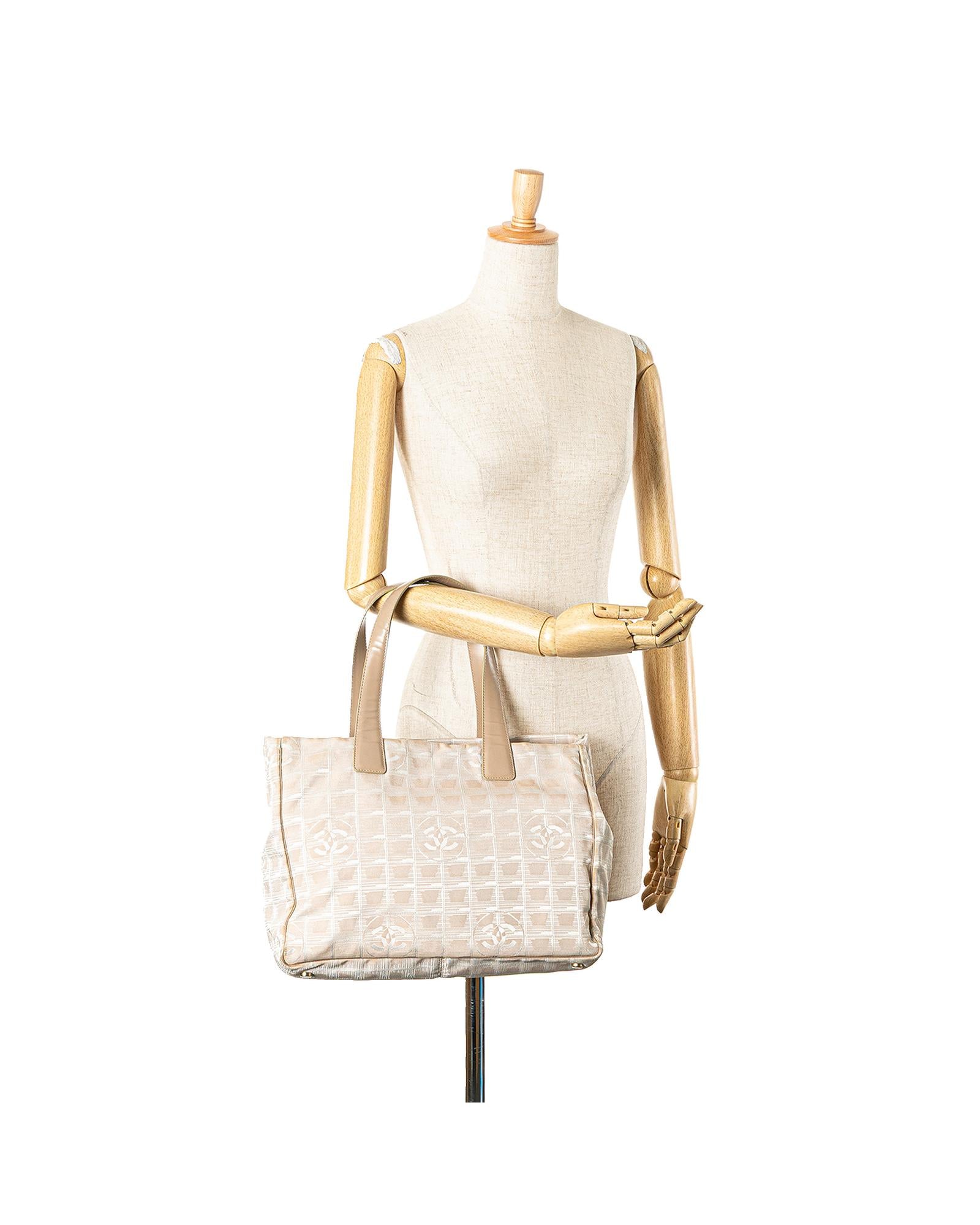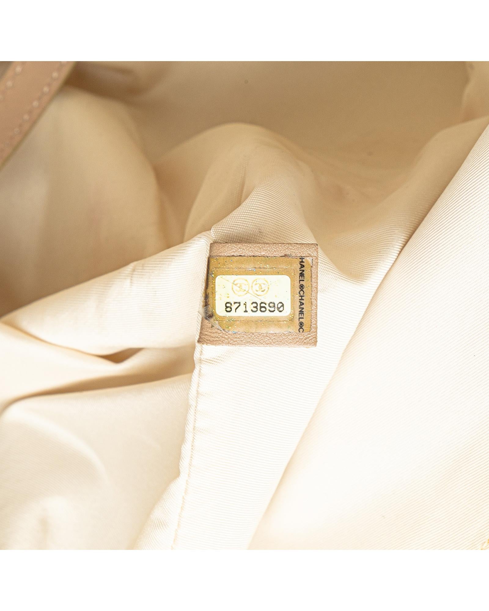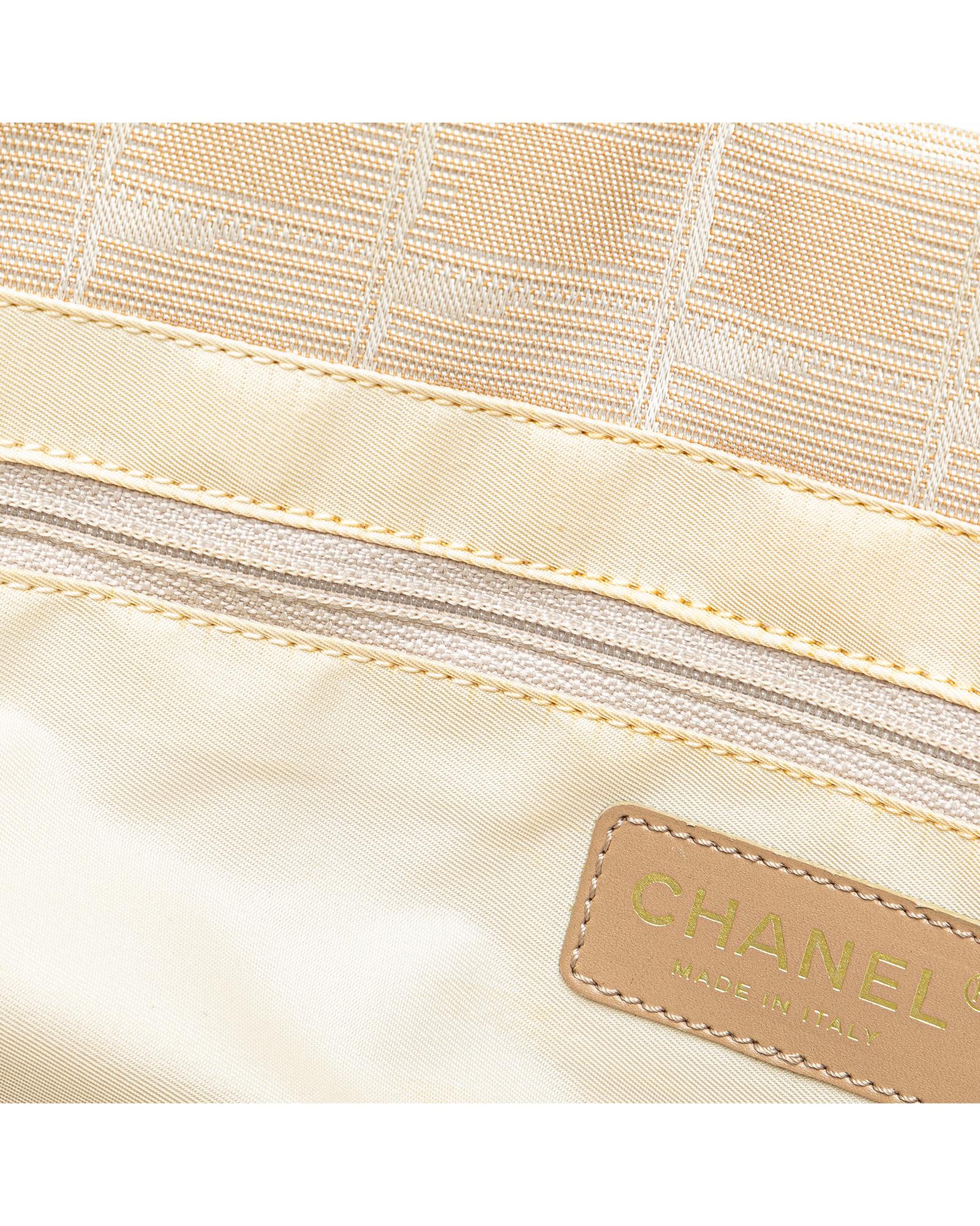 This tote bag features a nylon body with leather trim flat leather straps a top zip closure and interior zip pockets.Brand: Chanel