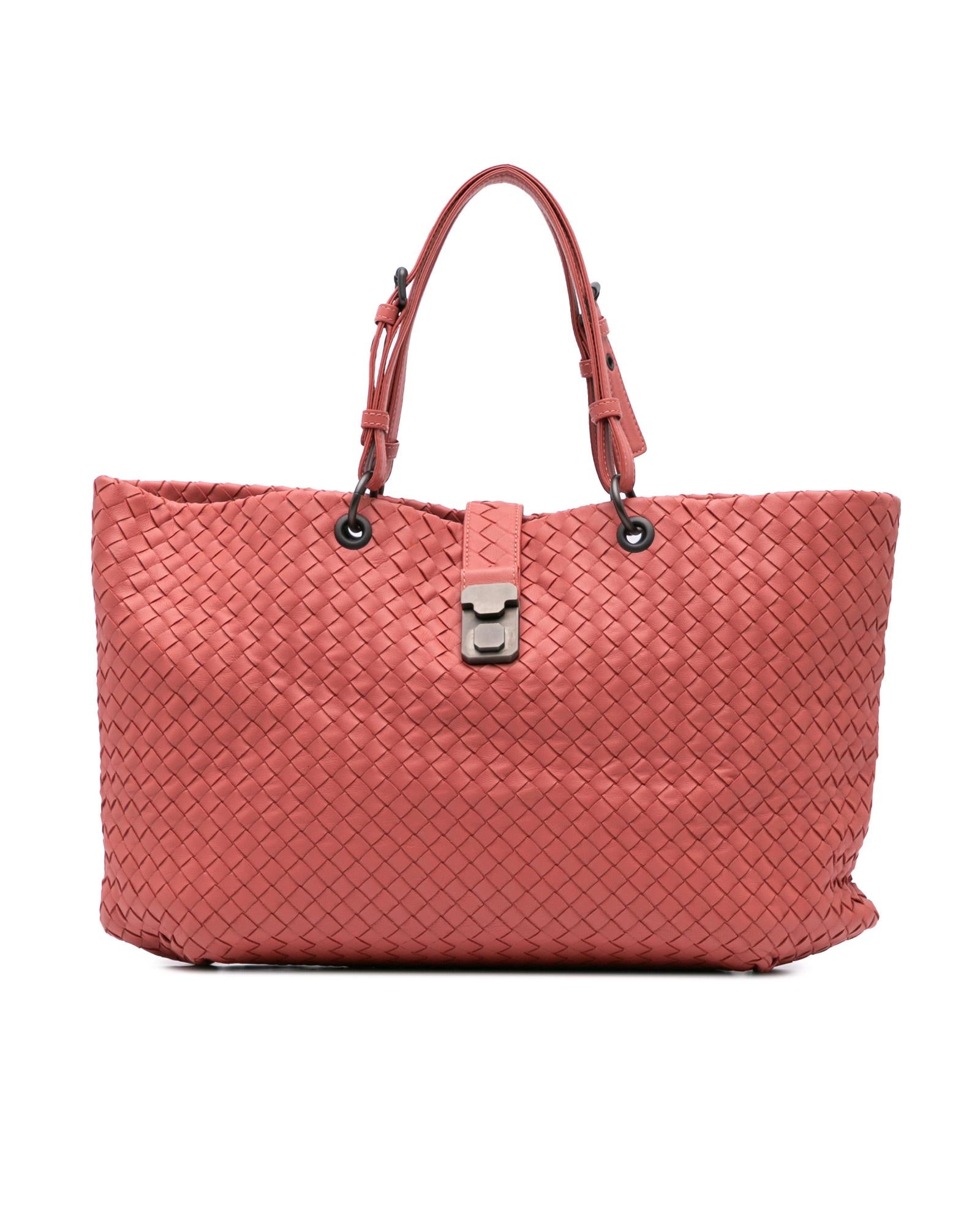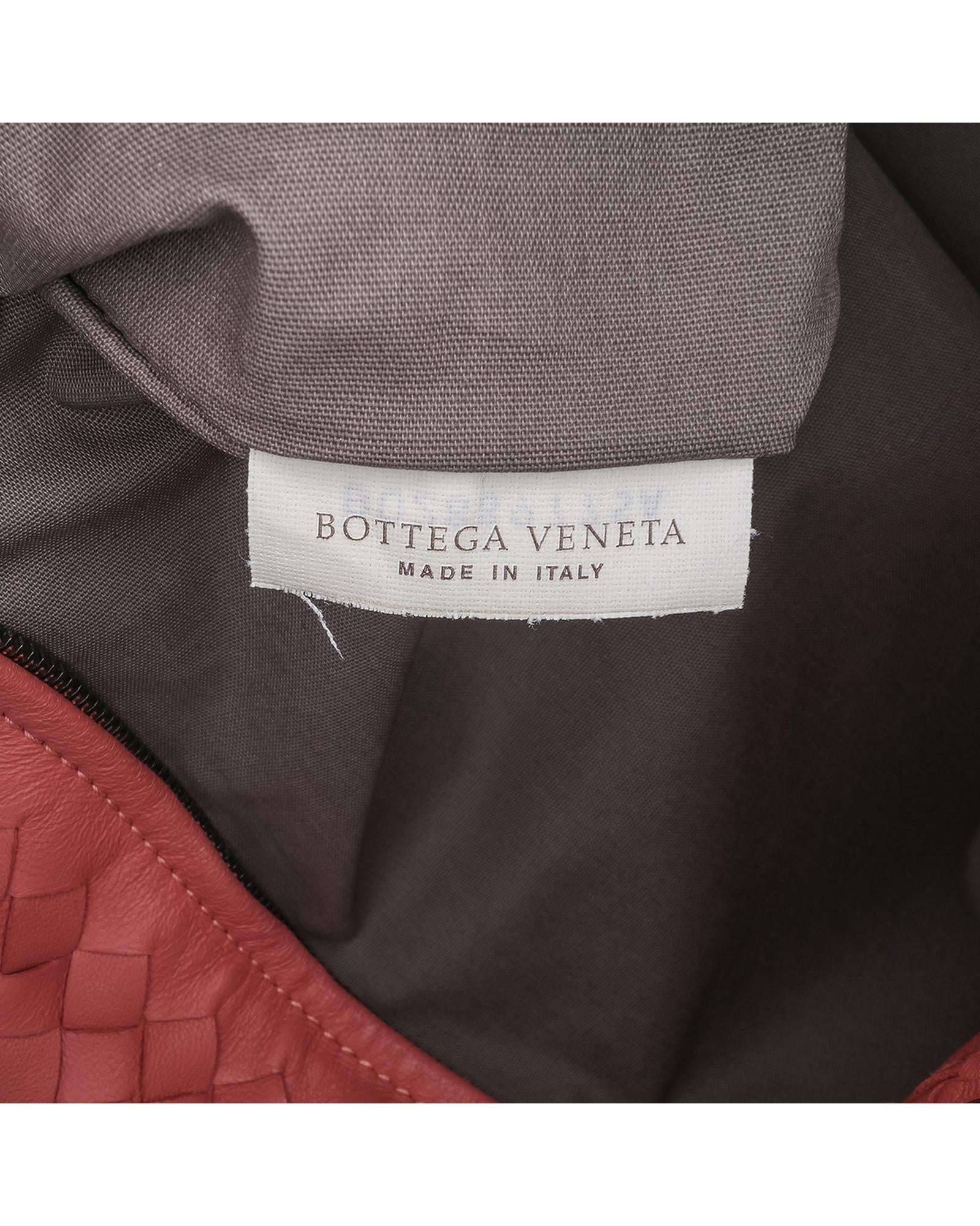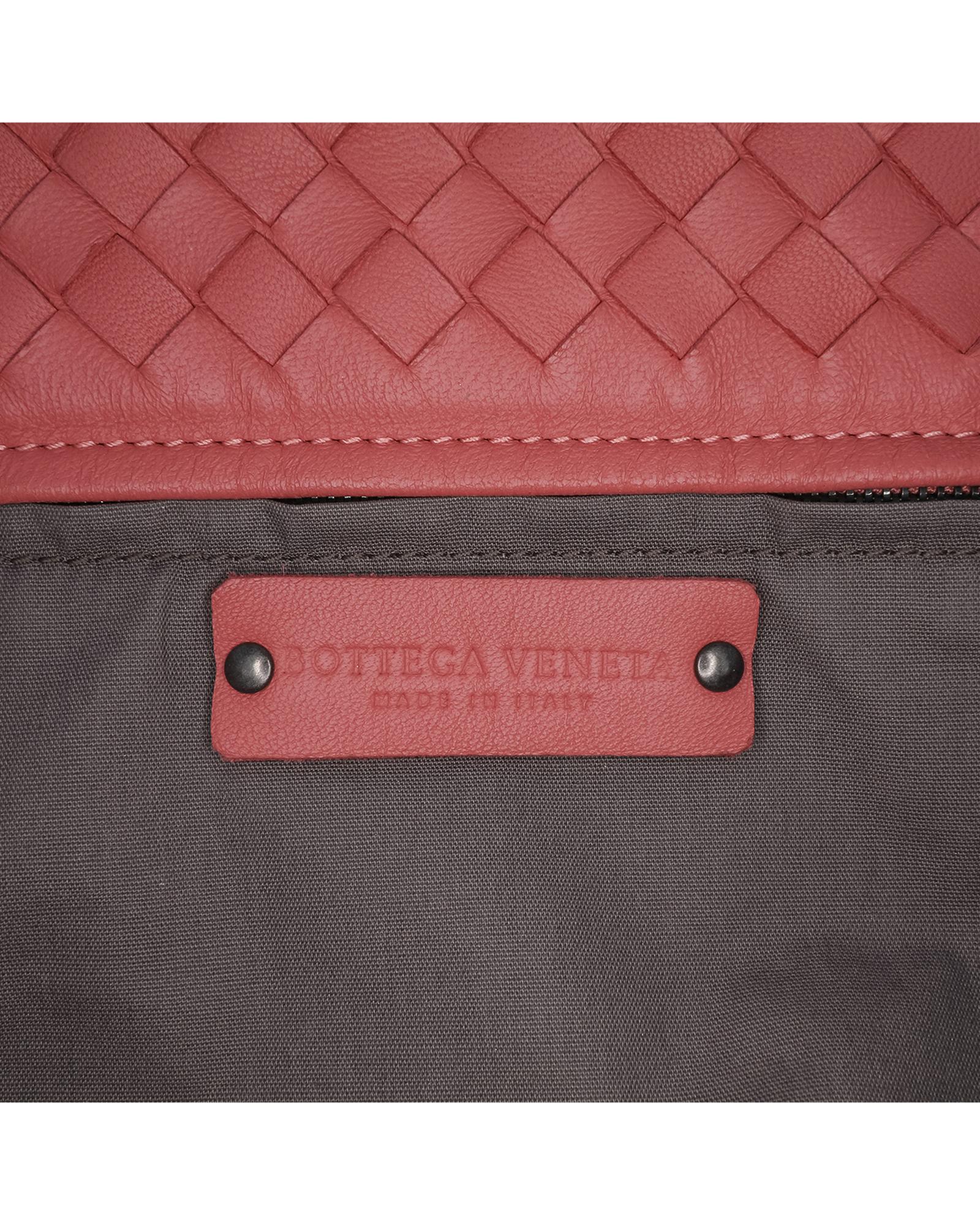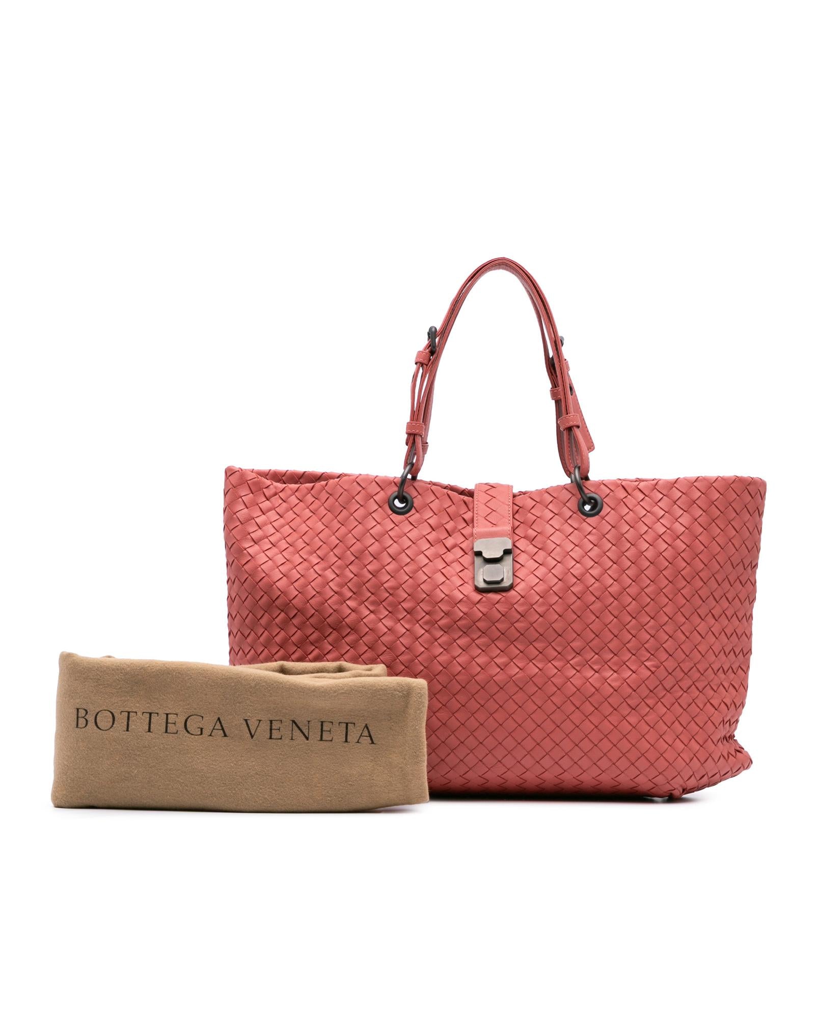 This tote bag features a woven leather body flat leather handles an open top with a top strap closure and an interior zip pocket.Brand: Bottega Veneta