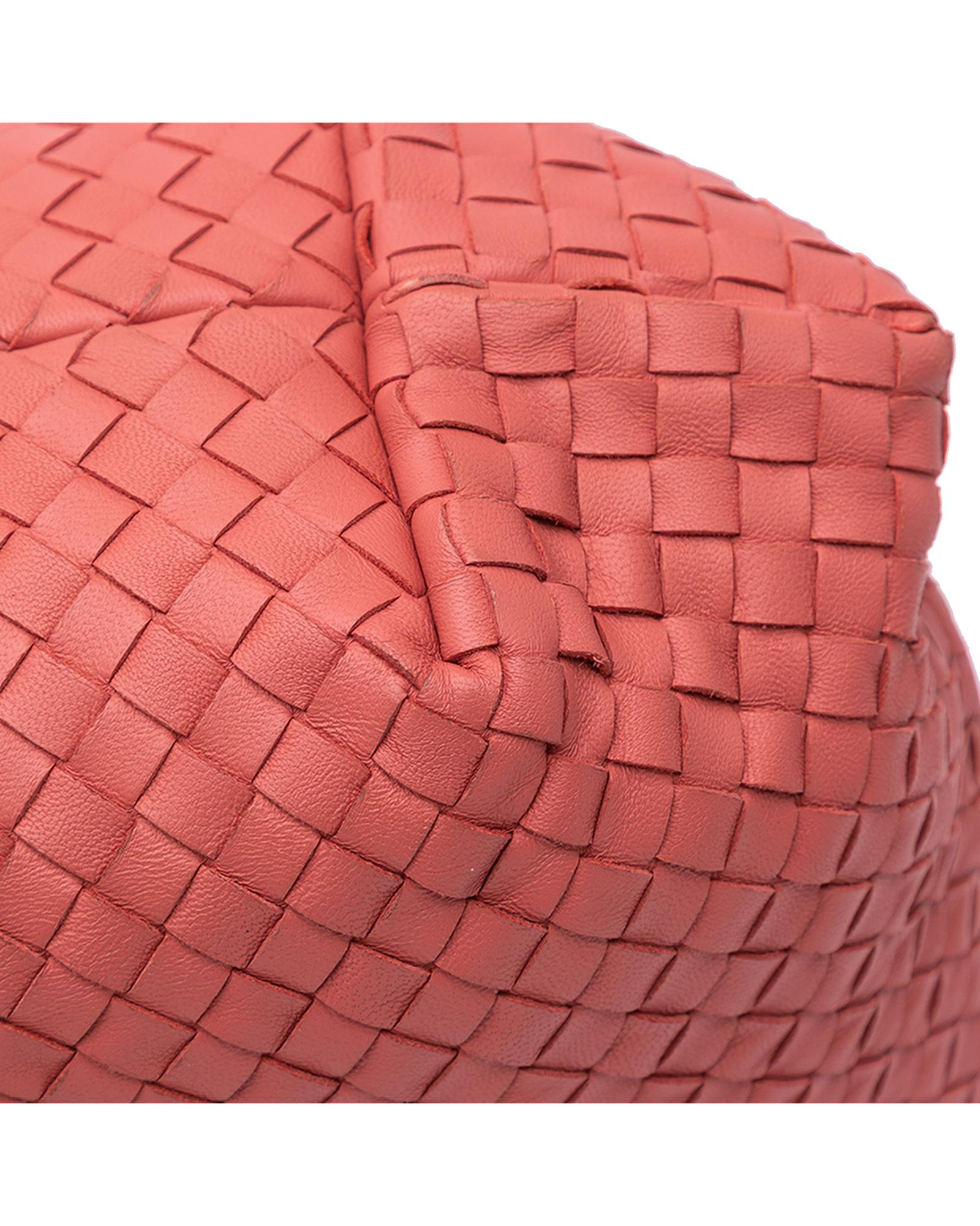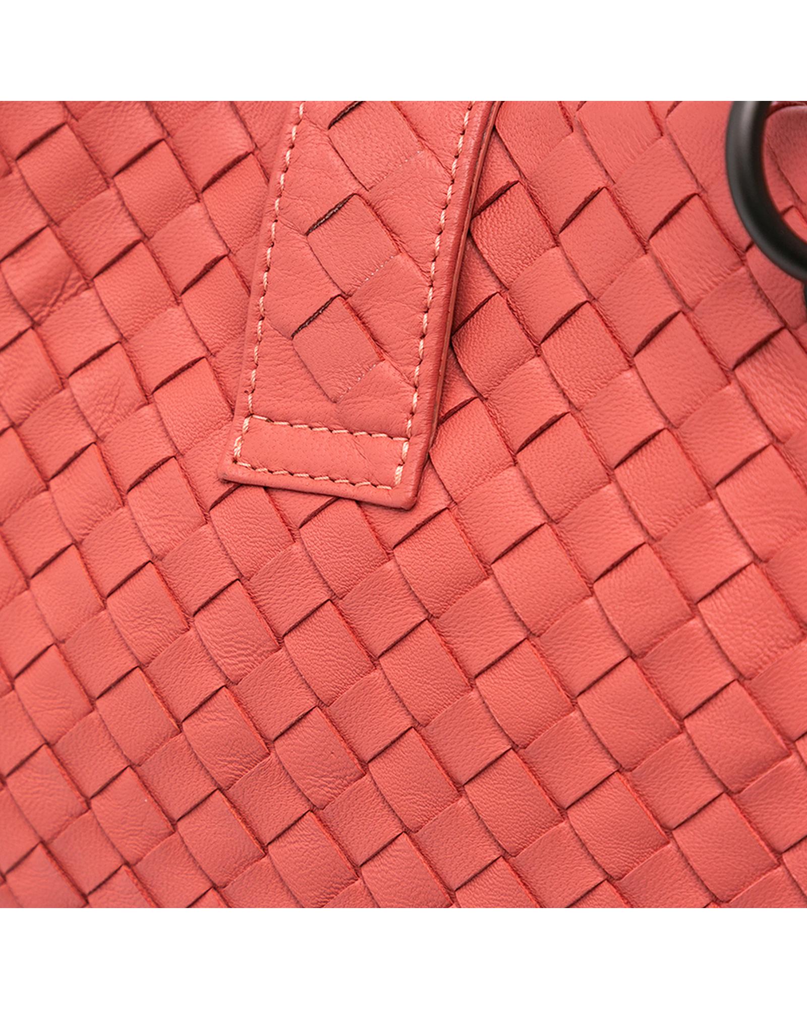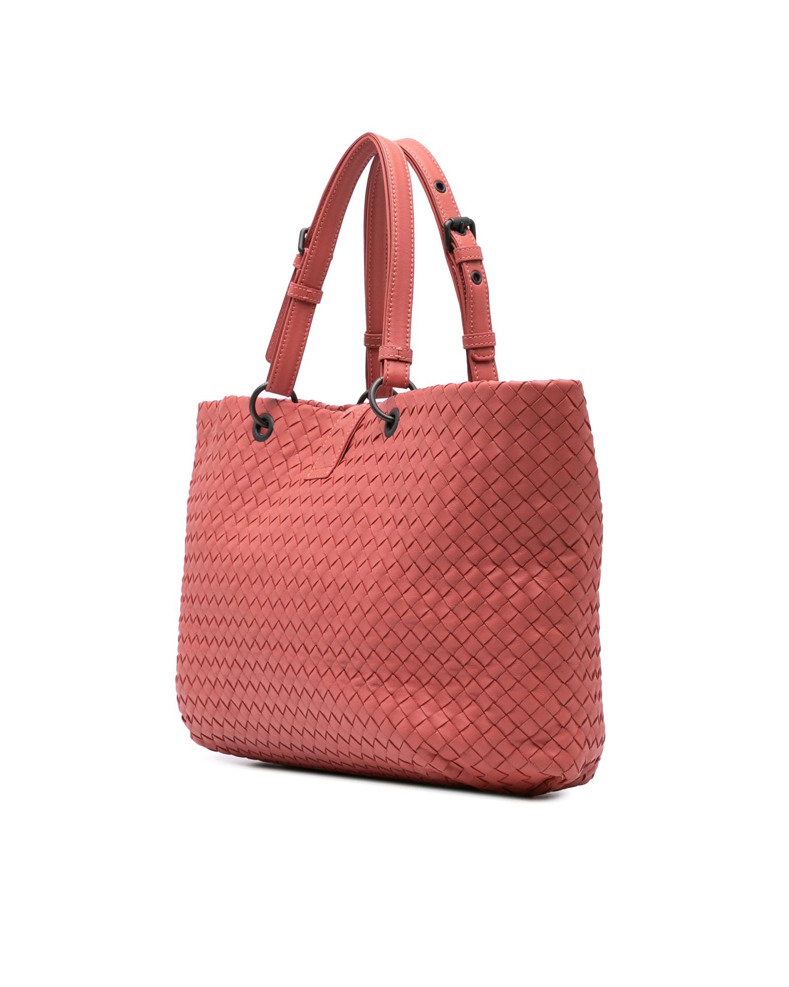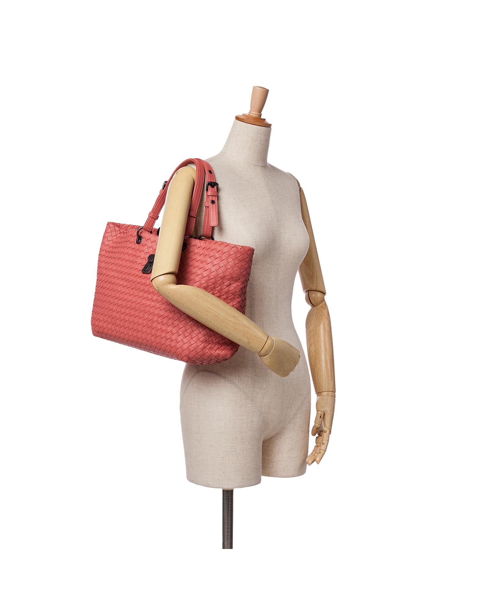This tote bag features a woven leather body flat leather handles an open top with a top strap closure and an interior zip pocket.Brand: Bottega Veneta