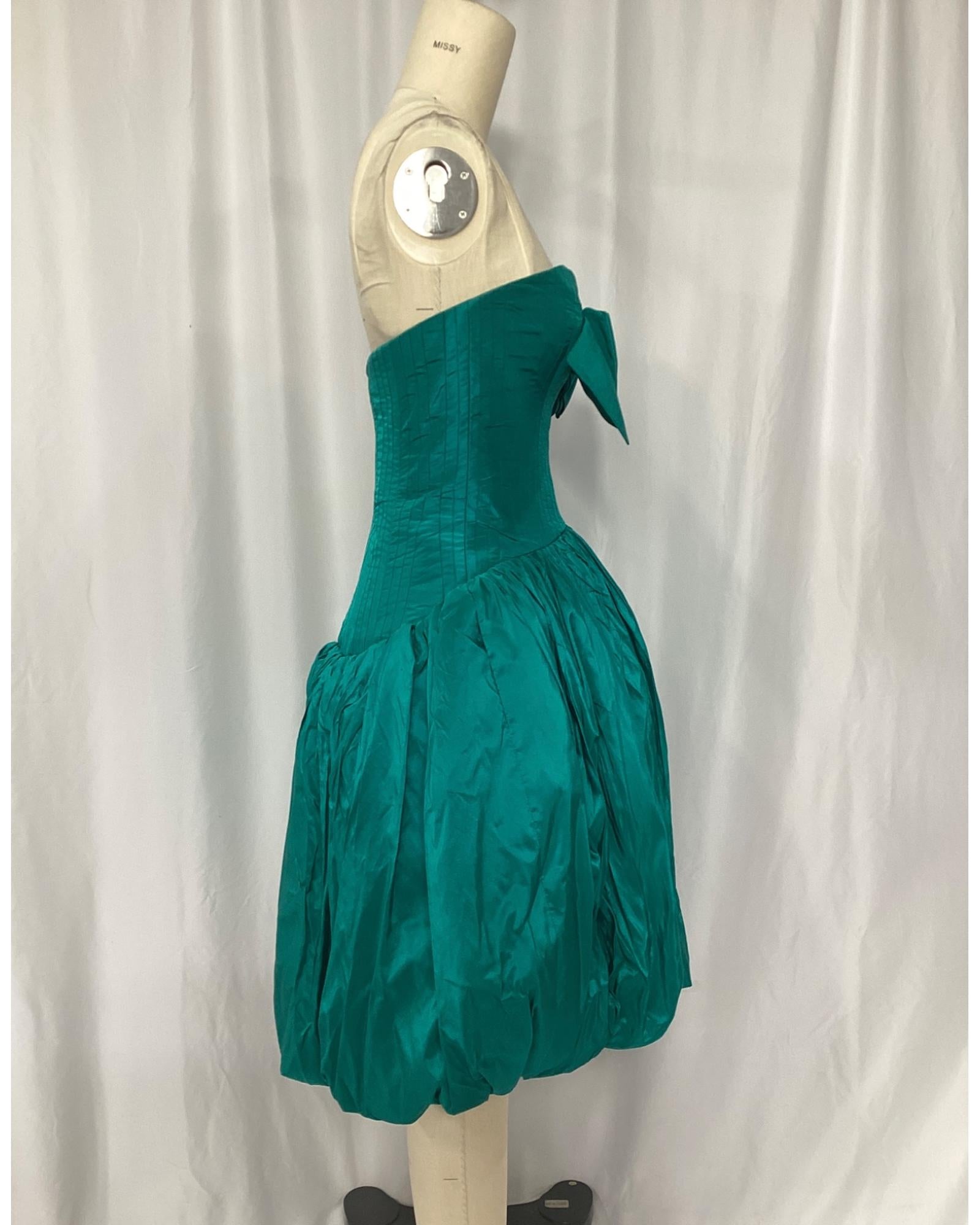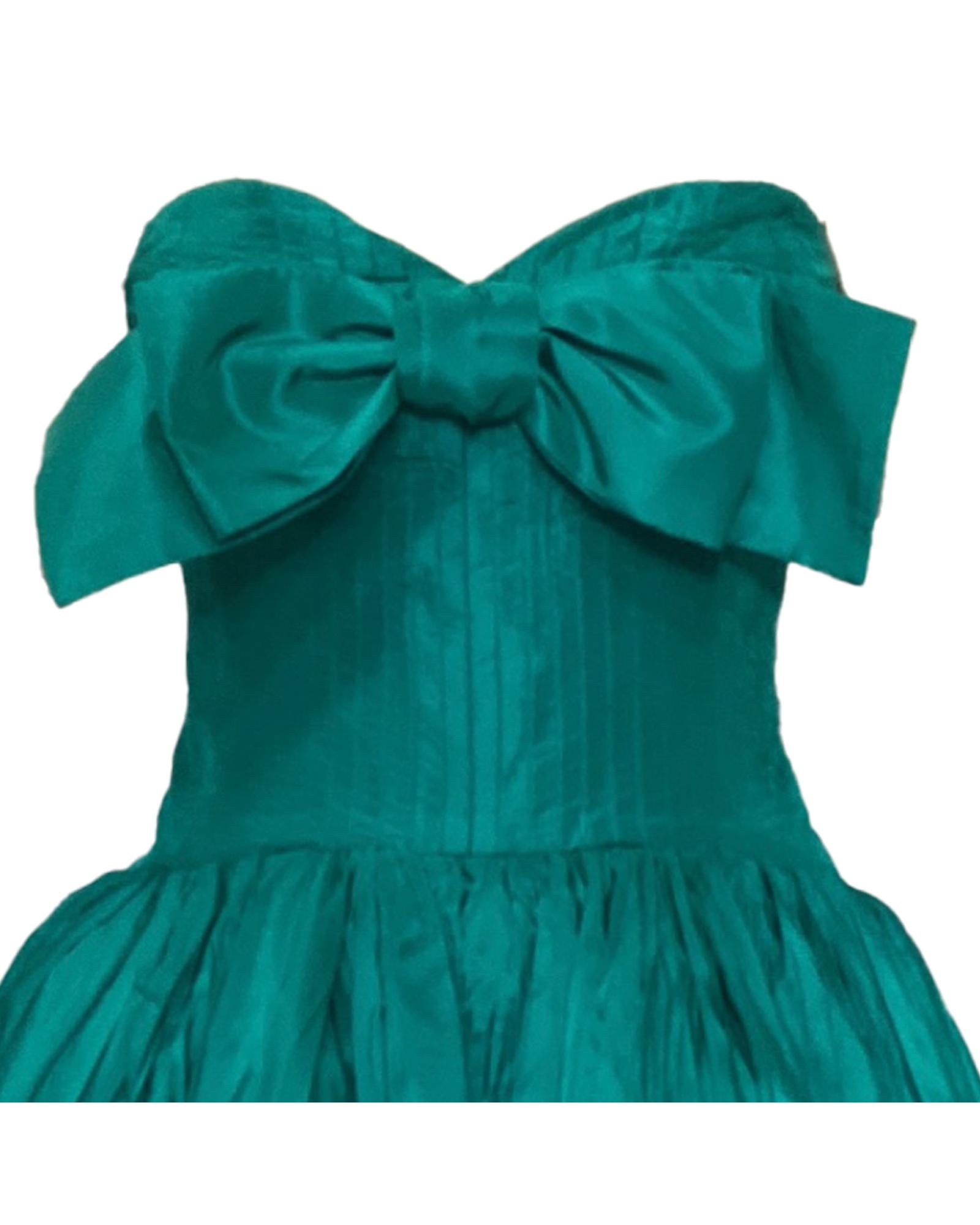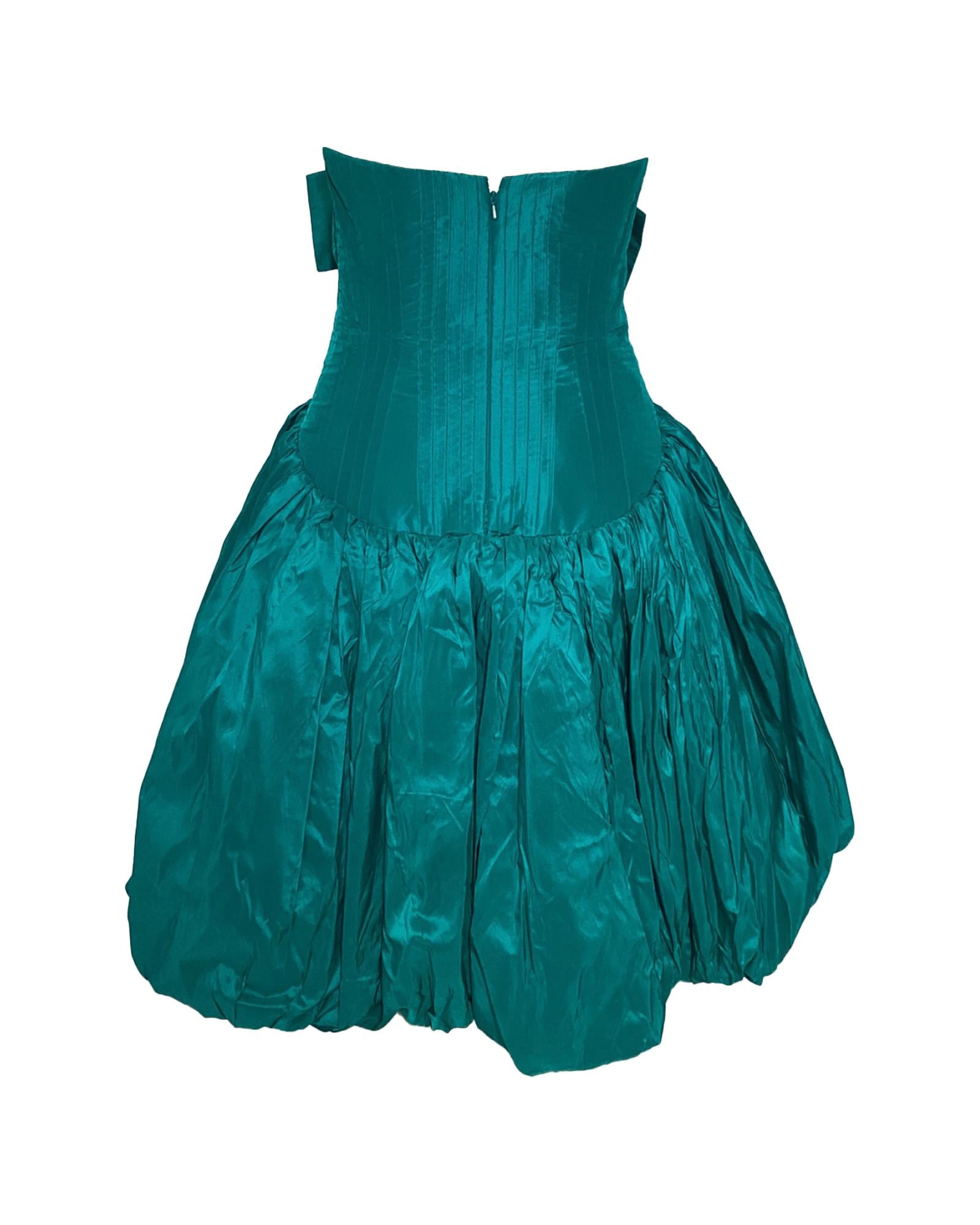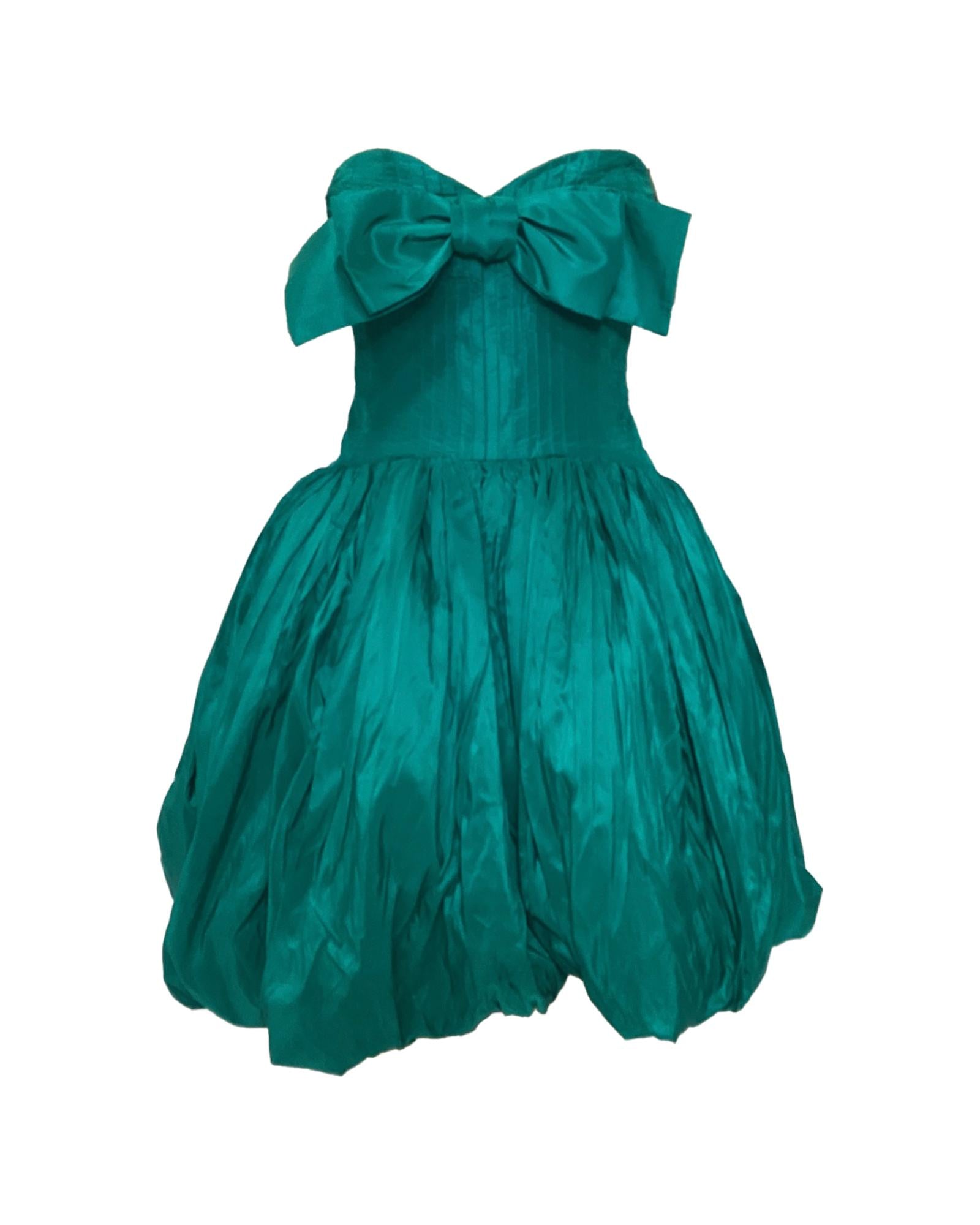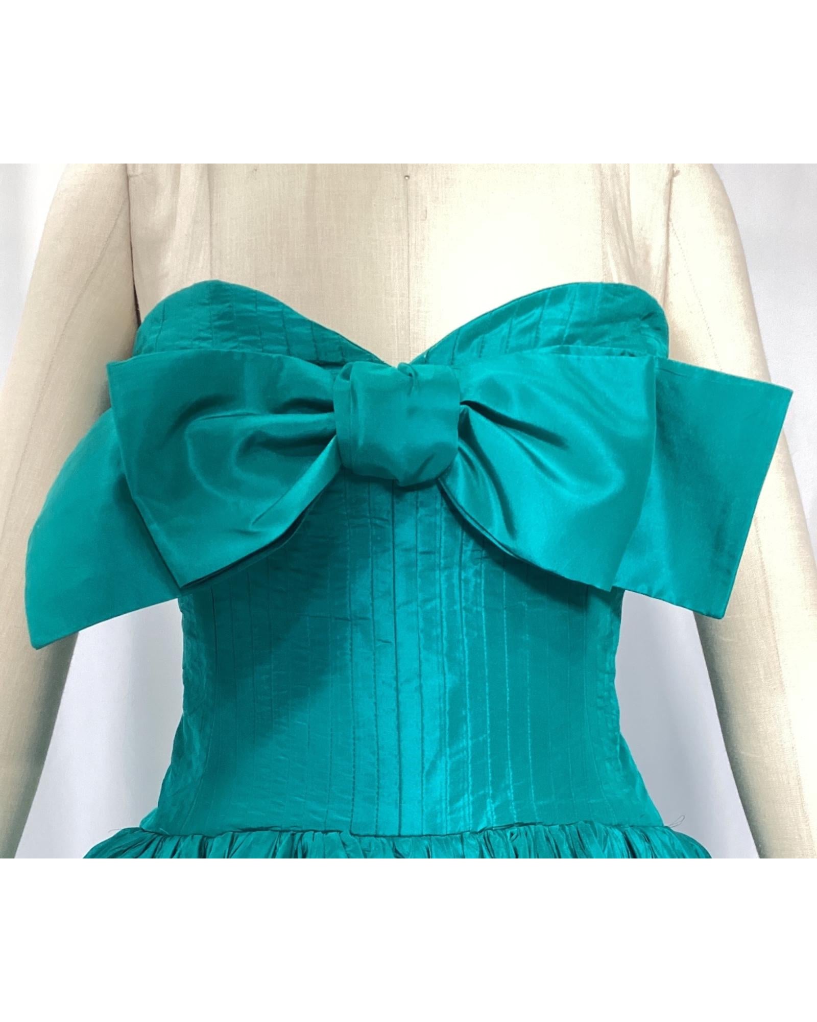 • Oscar de la Renta Strapless Bow Embellished Taffeta Mini Dress in Turquoise Silk