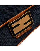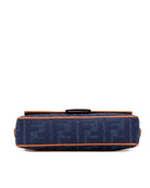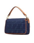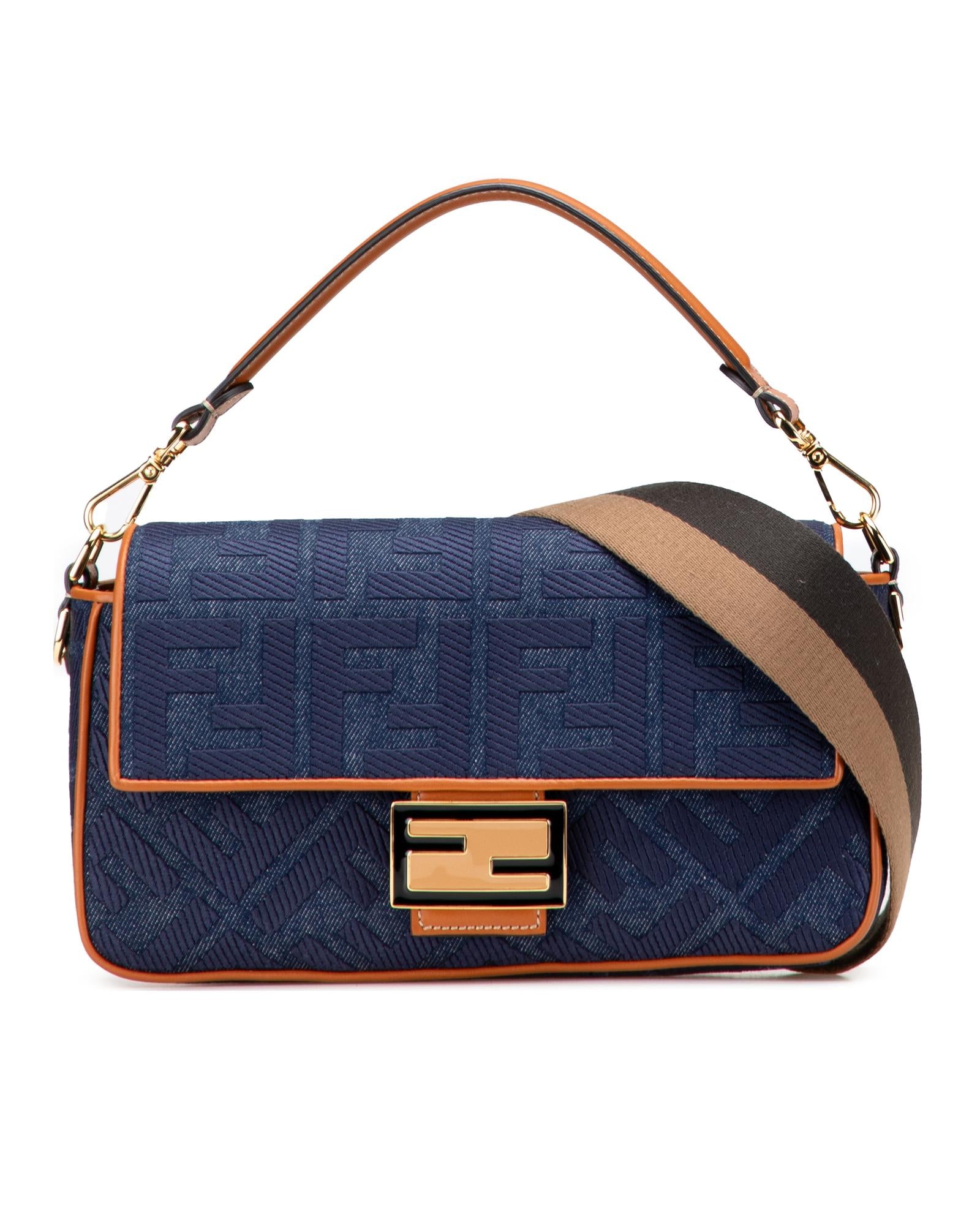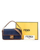 The Baguette features an embroidered denim body with leather trim a detachable flat leather top handle a detachable flat canvas strap a front flap with magnetic snap closure and an interior zip pocket.Brand: Fendi Vintage