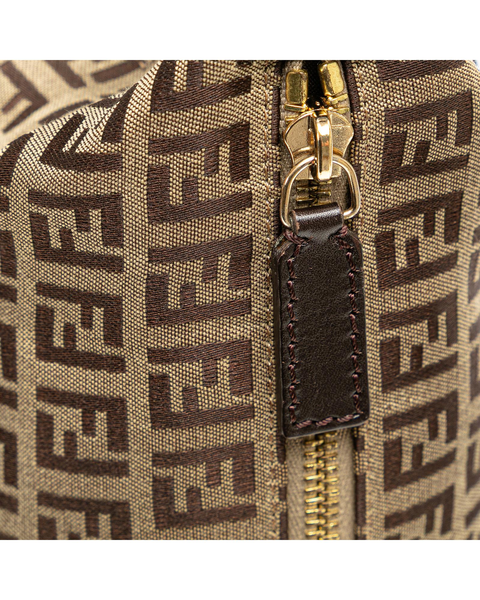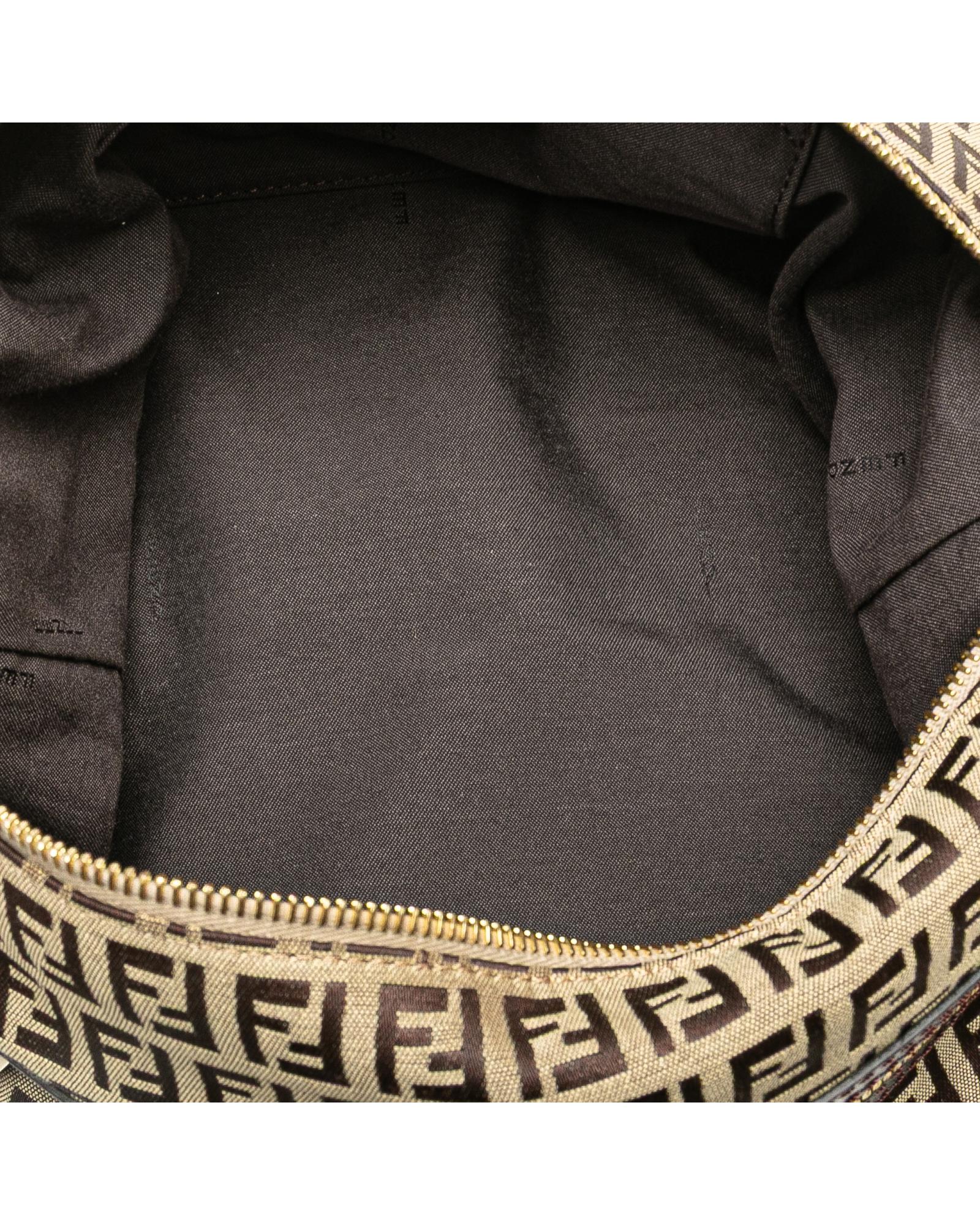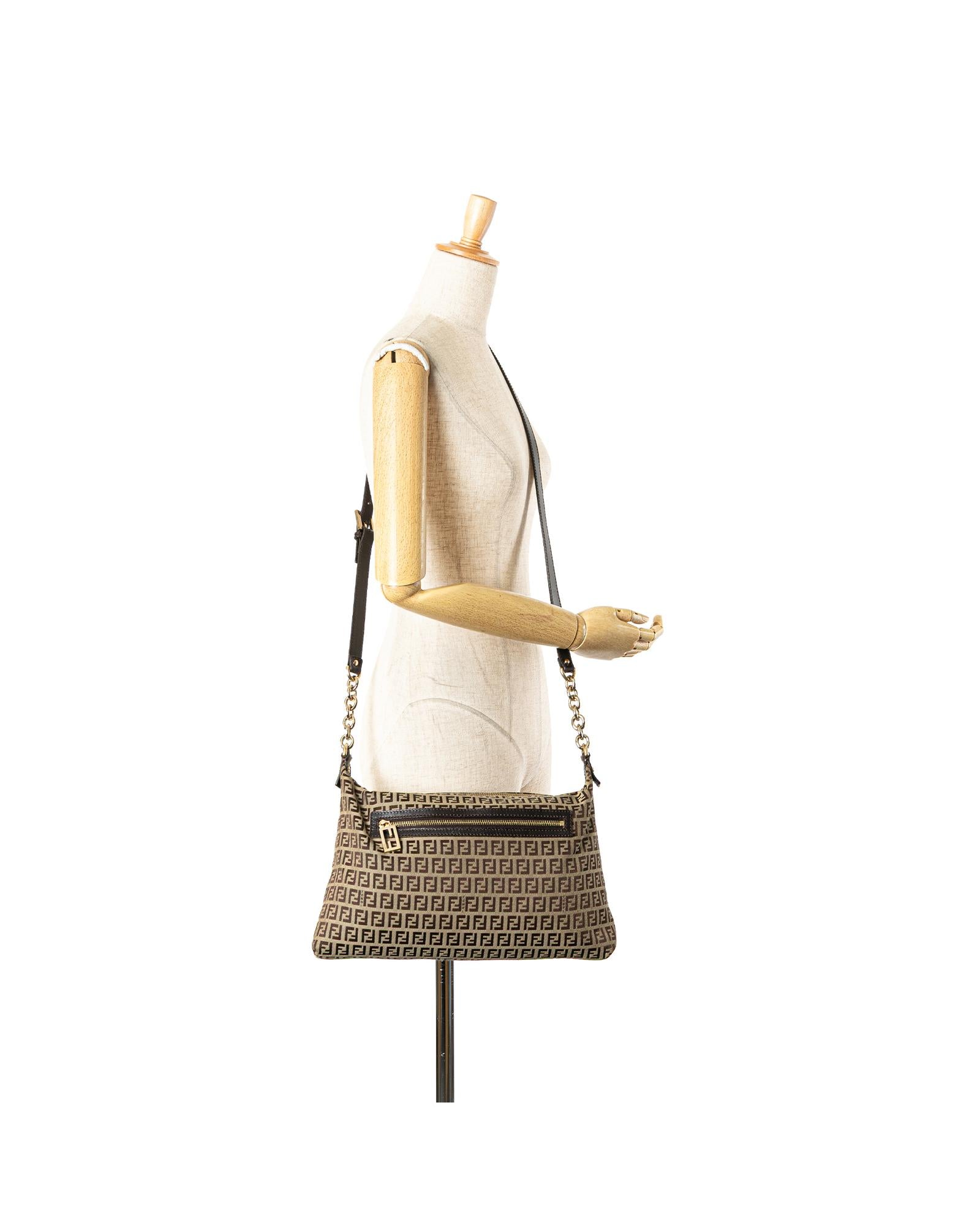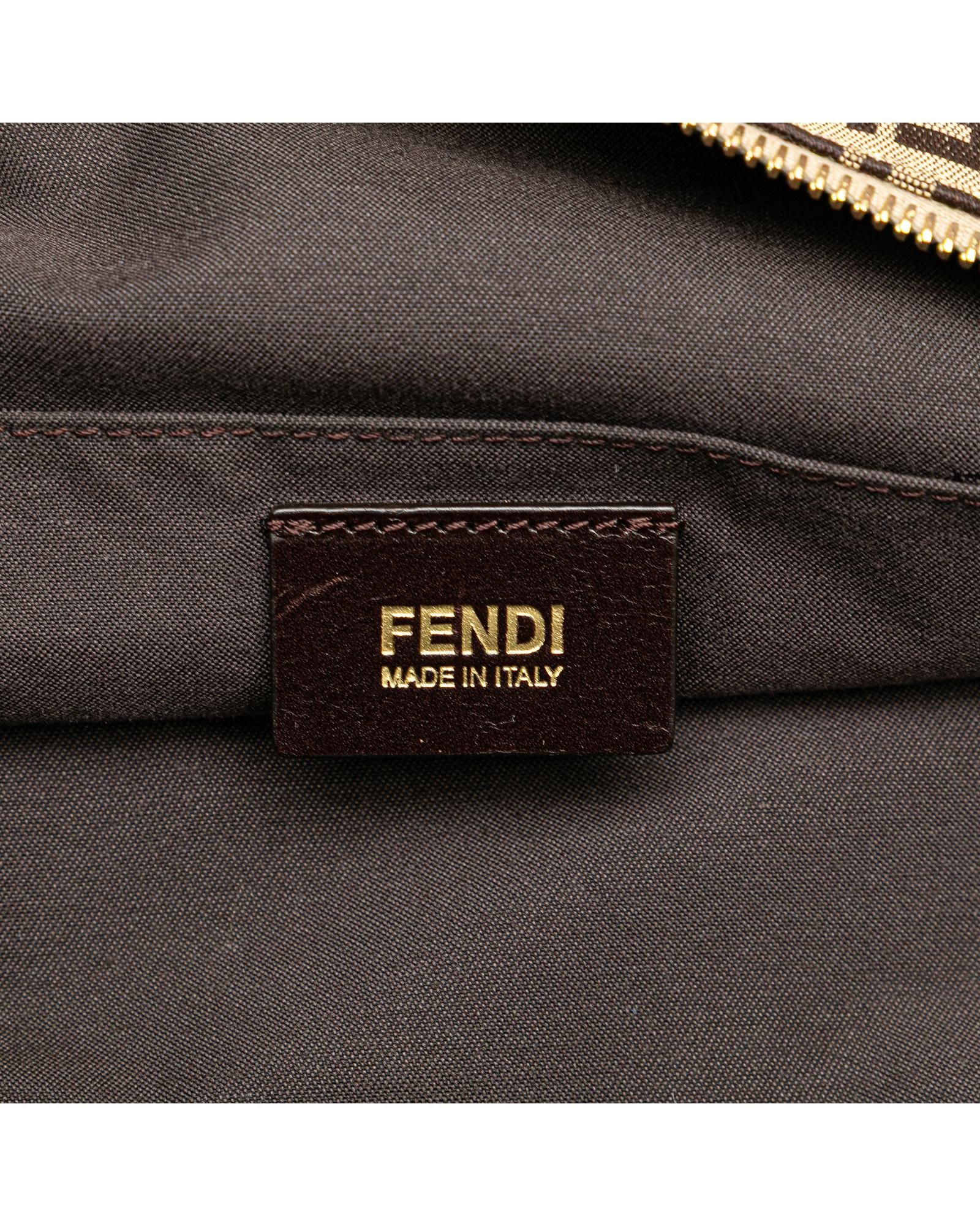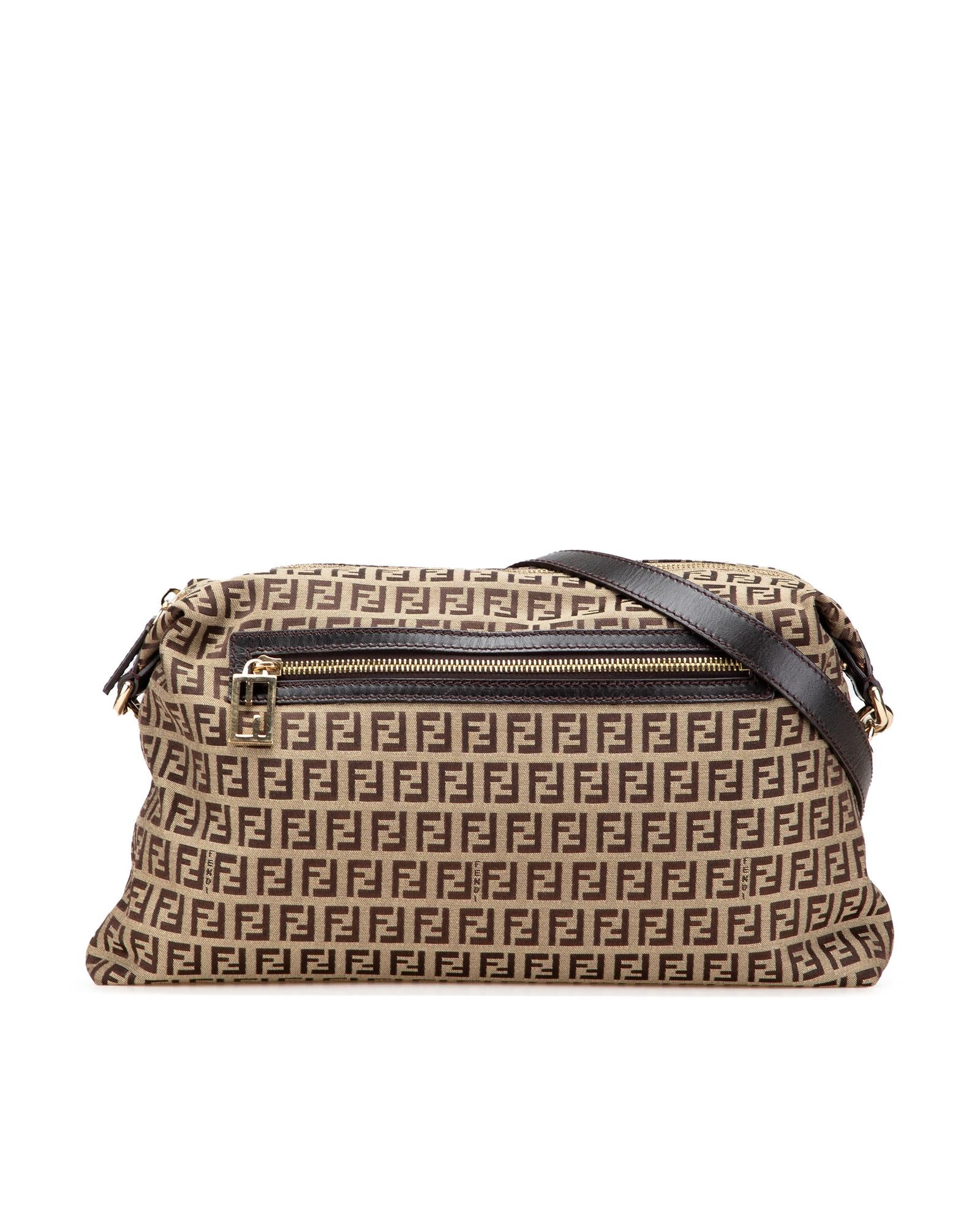 This crossbody features a canvas body with leather trim an adjustable flat leather strap a top zip closure an exterior zip pocket and an interior slip pocket.Brand: Fendi Vintage