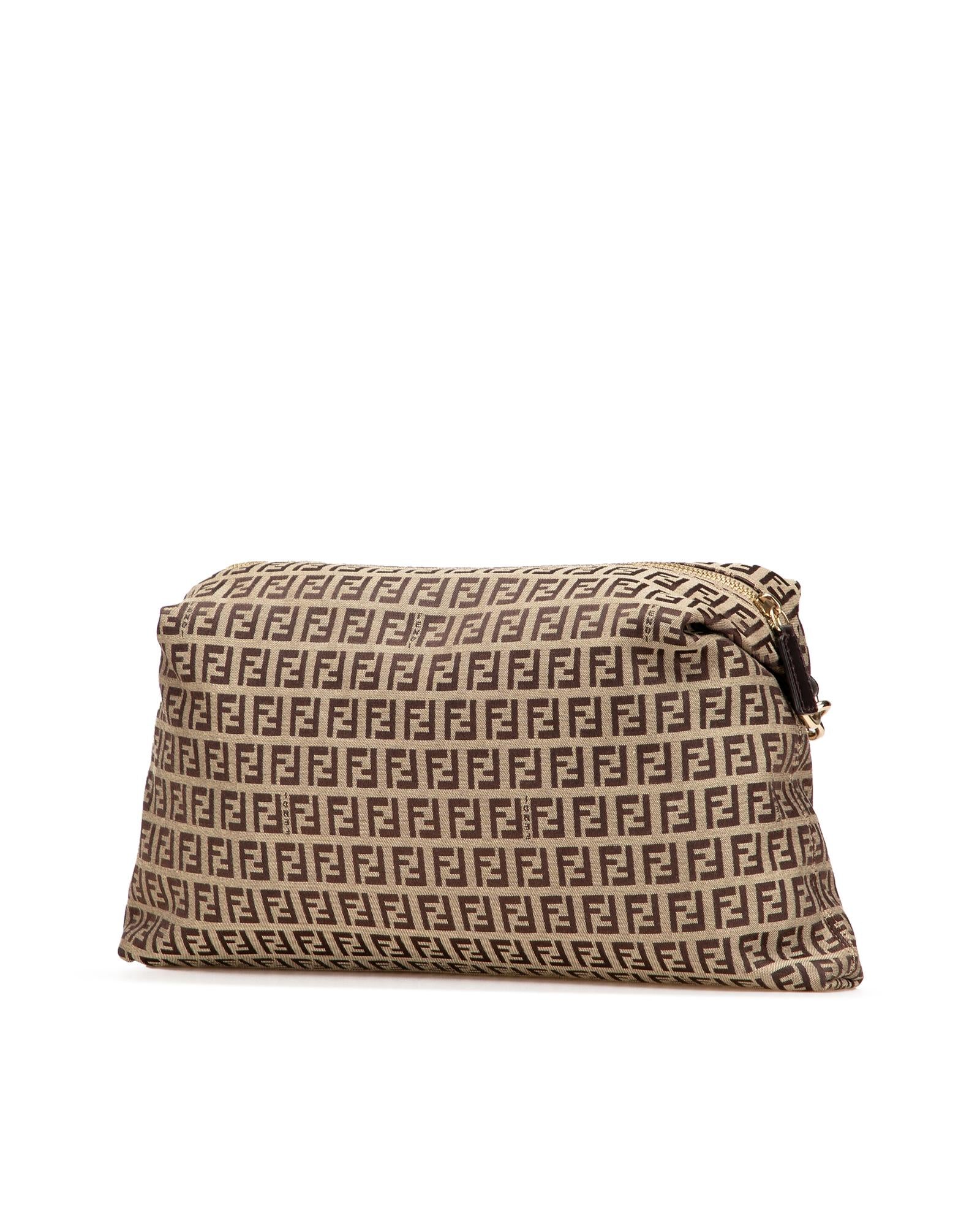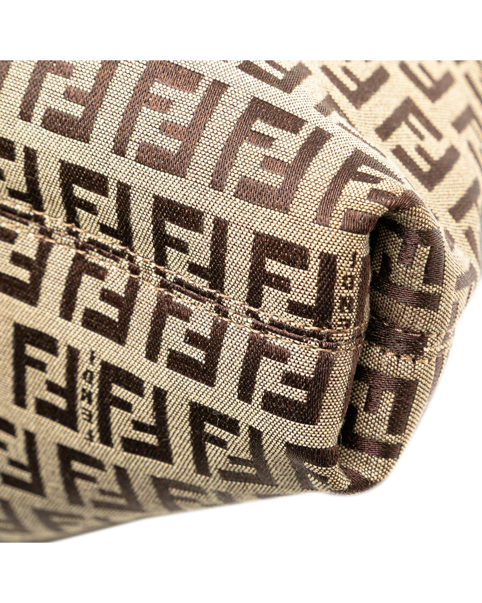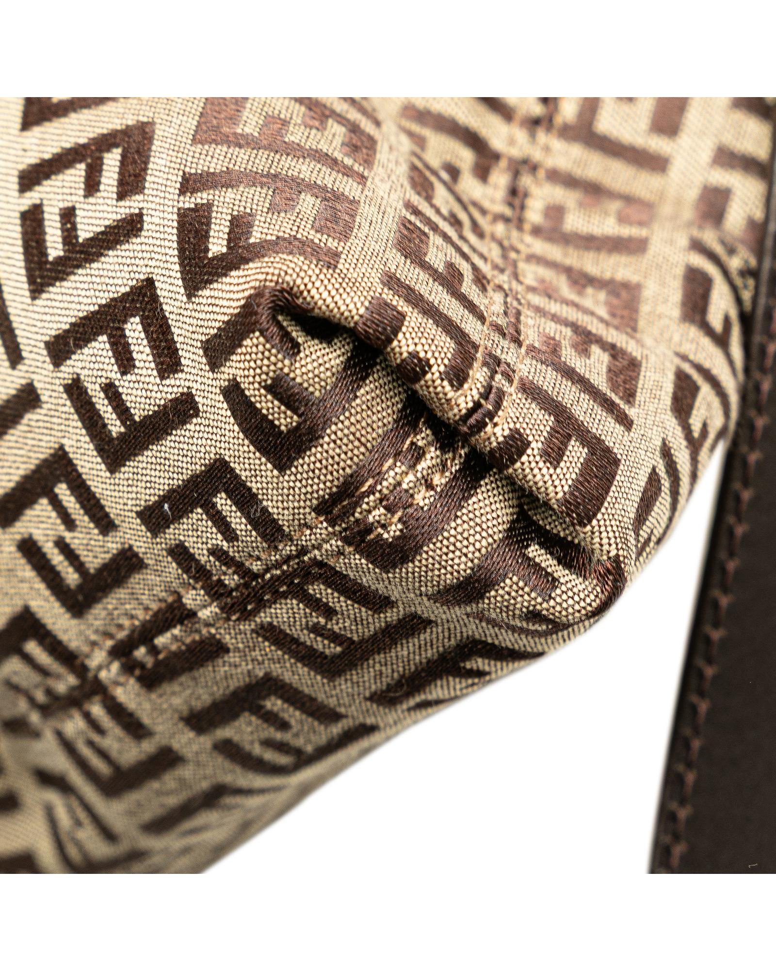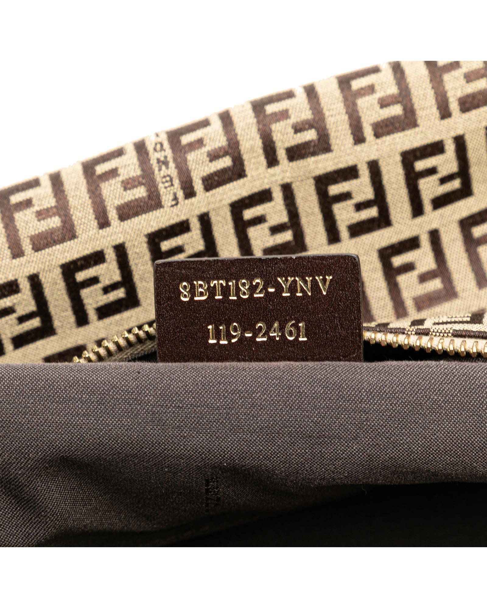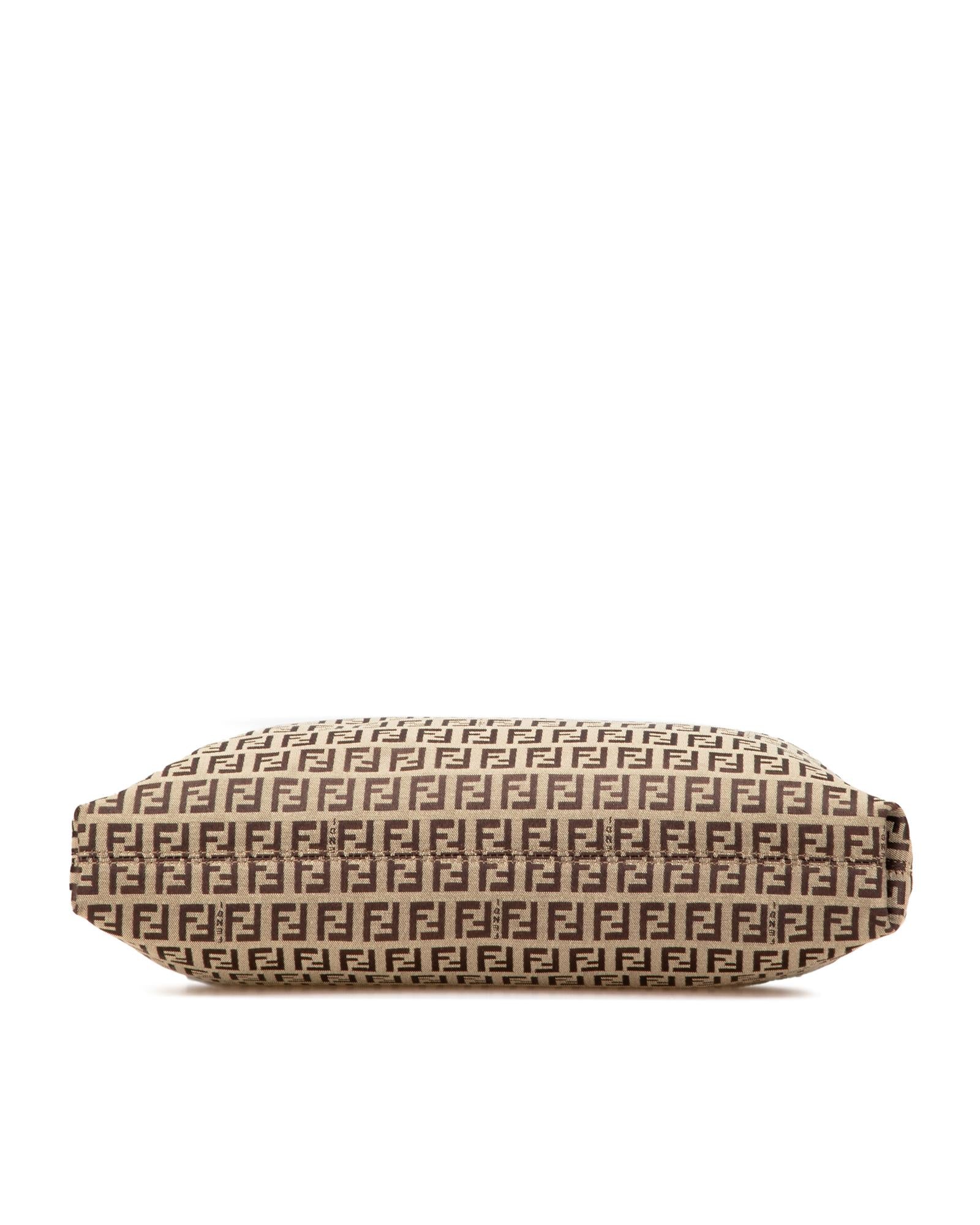 This crossbody features a canvas body with leather trim an adjustable flat leather strap a top zip closure an exterior zip pocket and an interior slip pocket.Brand: Fendi Vintage
