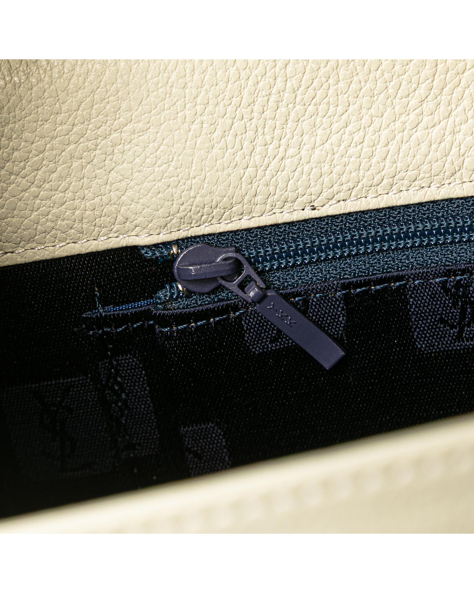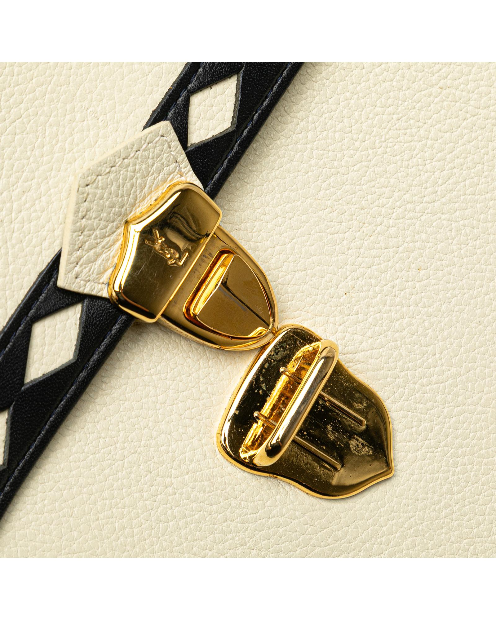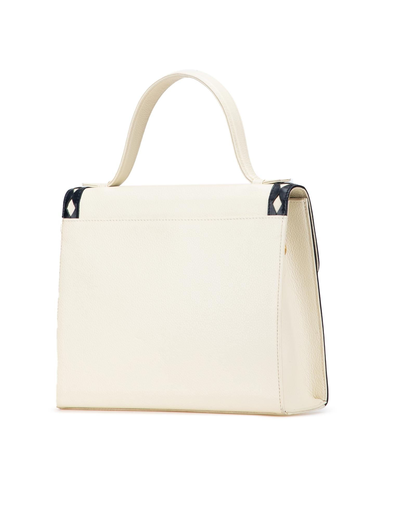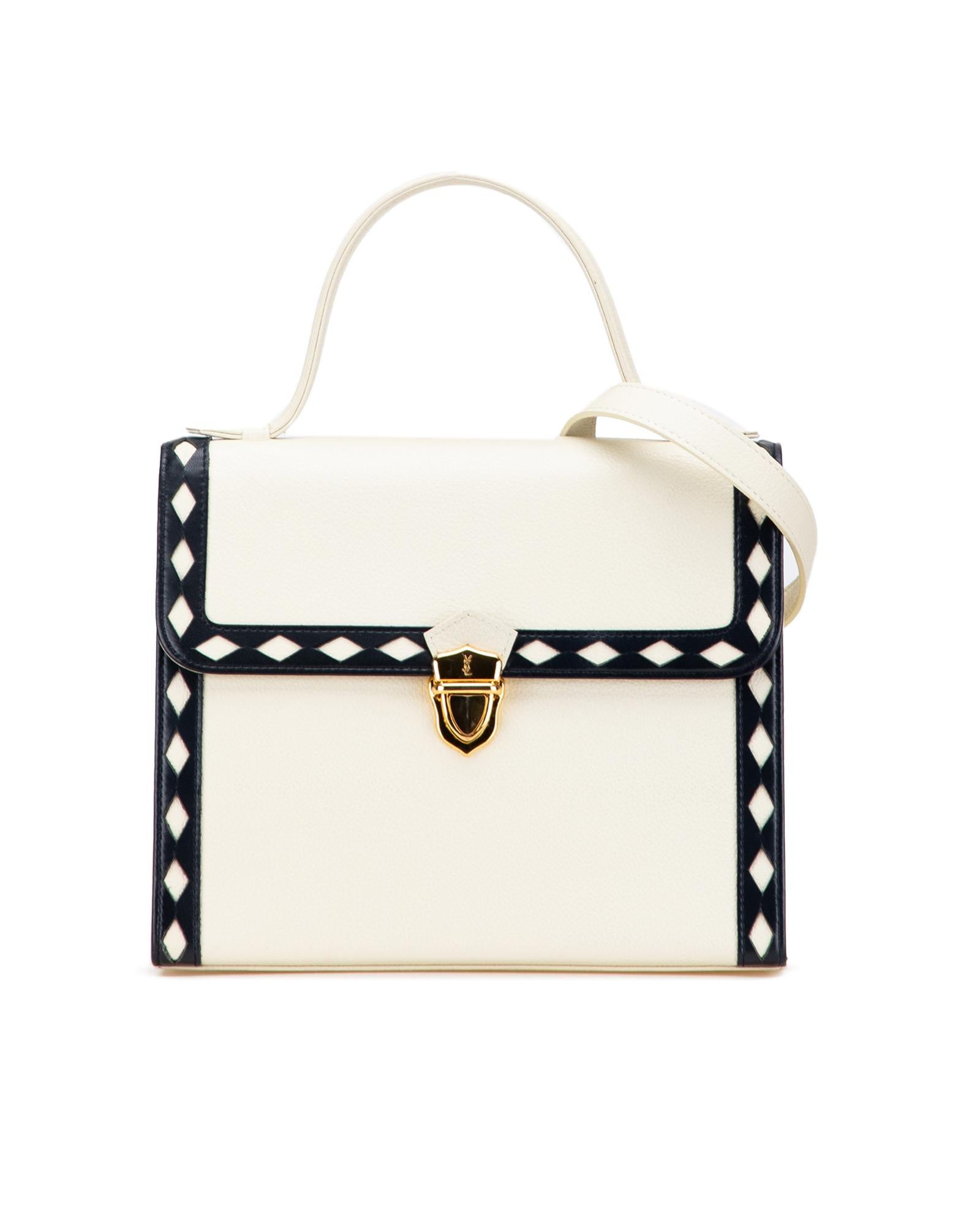 This satchel features a leather body a flat leather top handle a detachable flat leather strap a front flap with a push lock closure and interior zip and slip pockets.