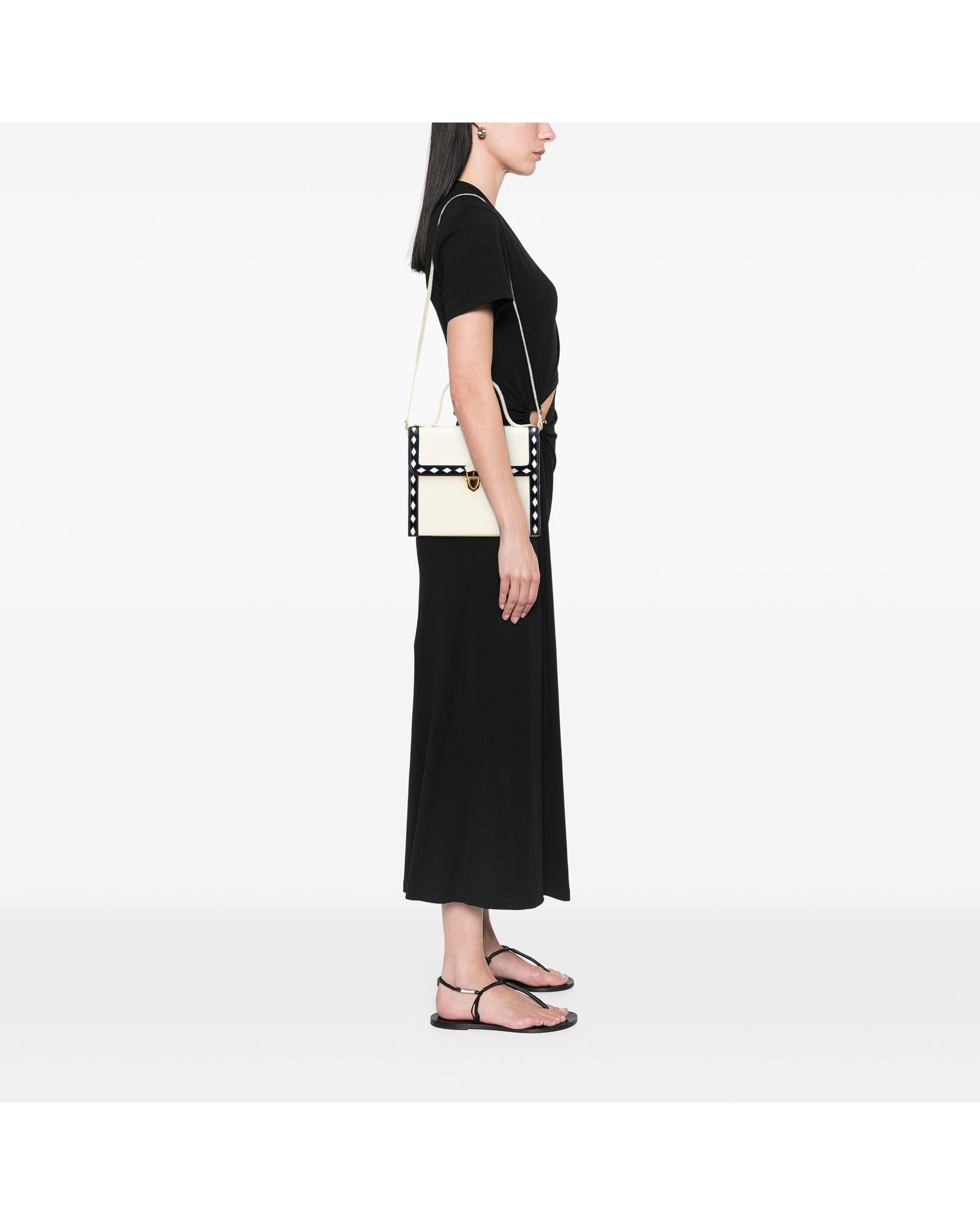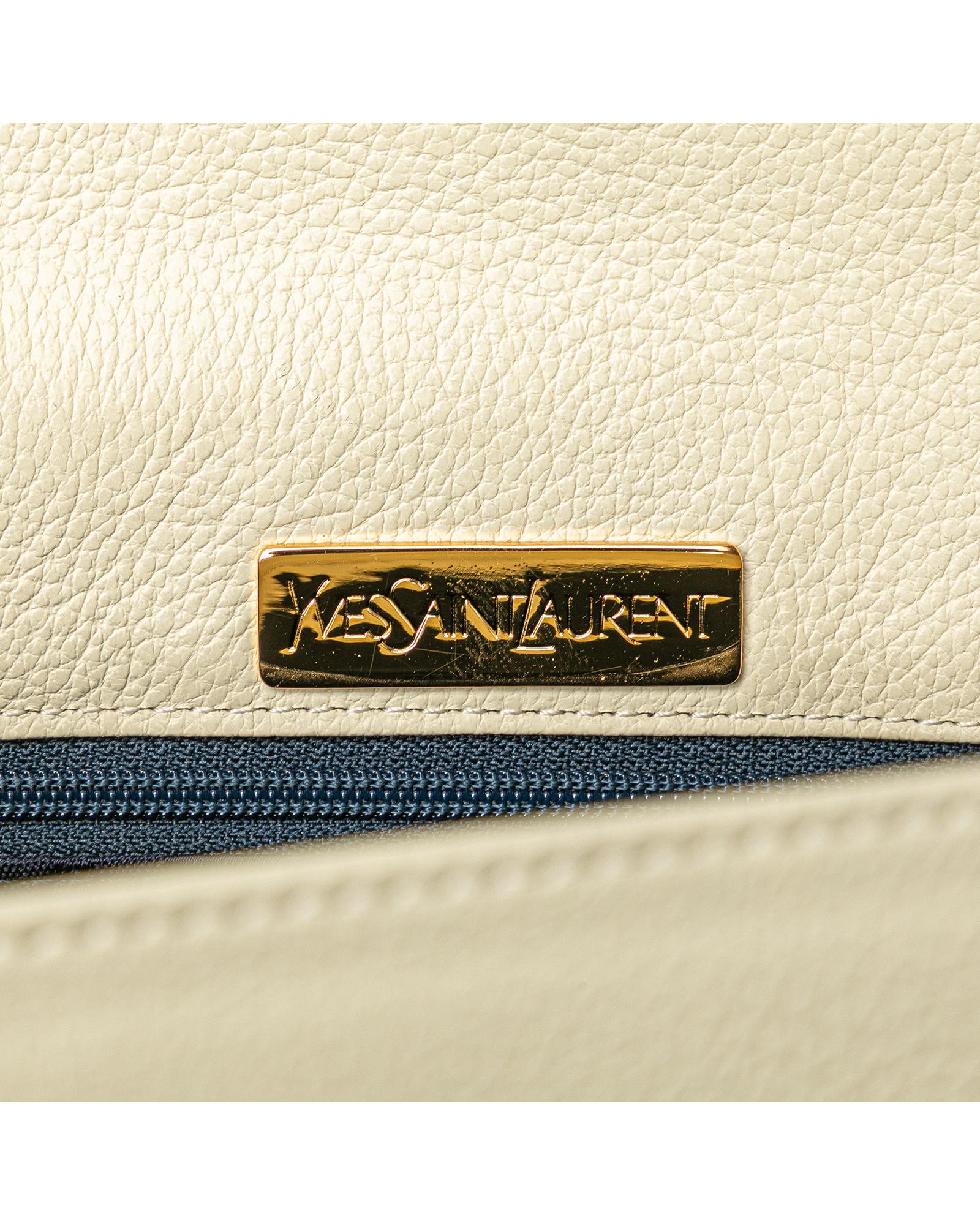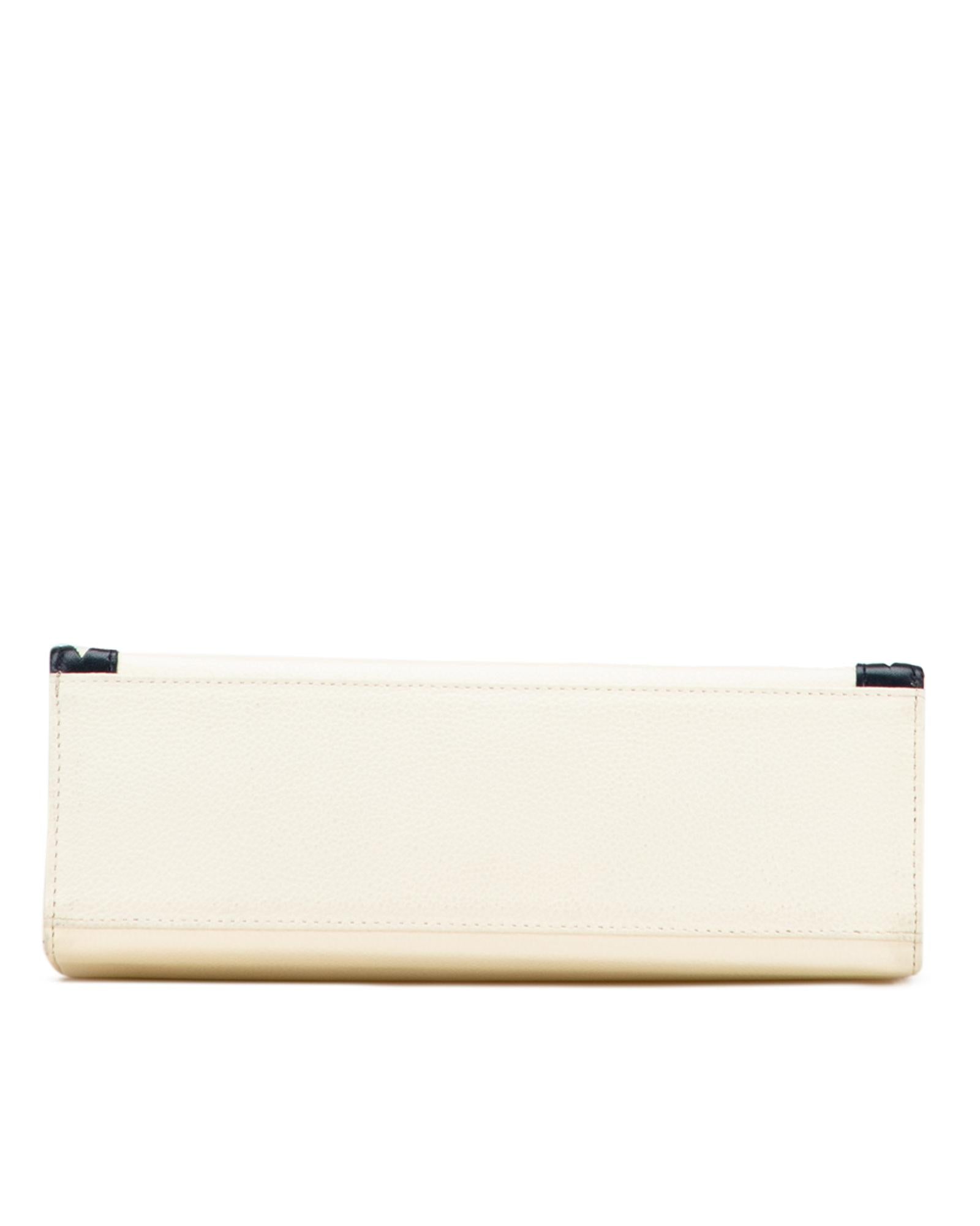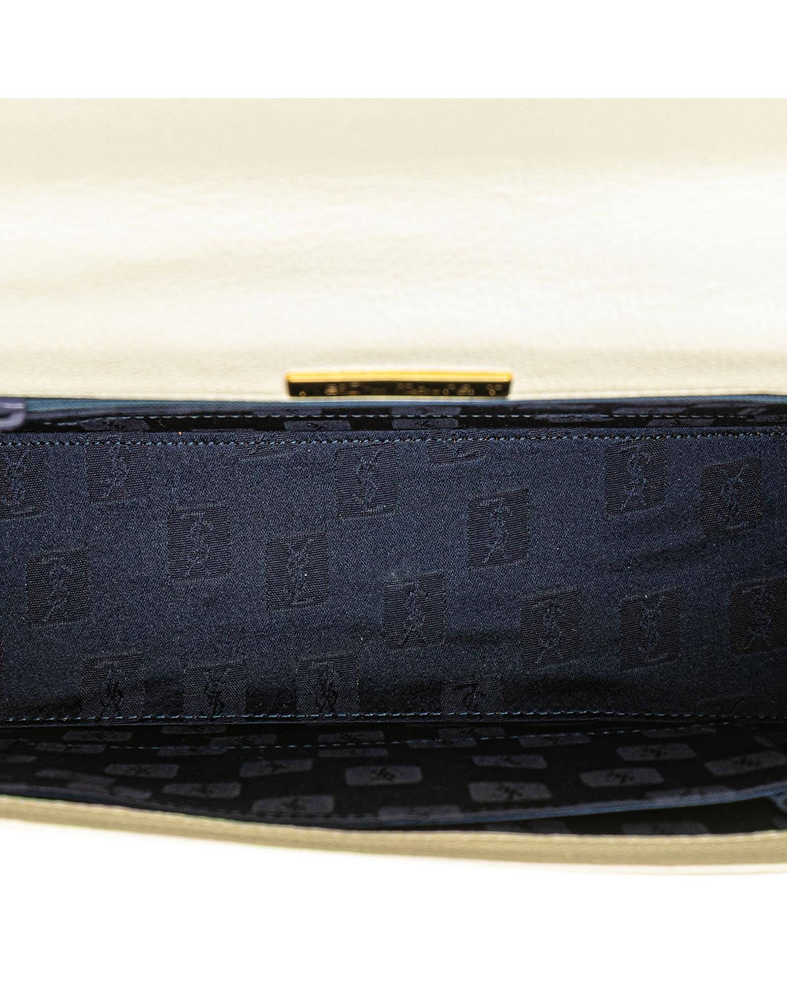 This satchel features a leather body a flat leather top handle a detachable flat leather strap a front flap with a push lock closure and interior zip and slip pockets.