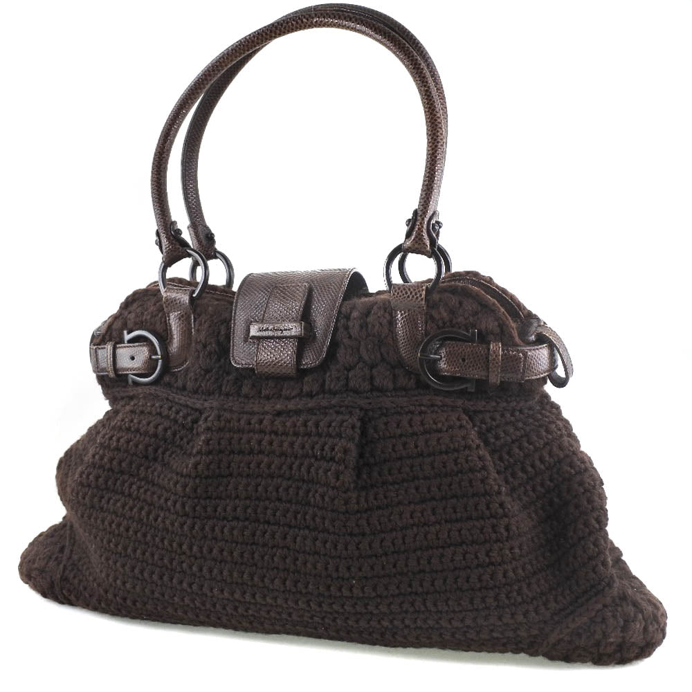 This ladies' shoulder bag is from Salvatore Ferragamo crafted from dark brown calf leather and knit material. It features an inside zipper opening with two open pockets and one zipped pocket.