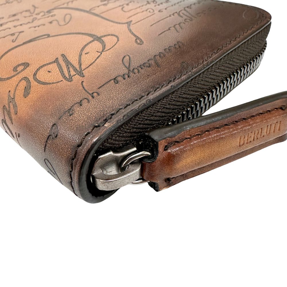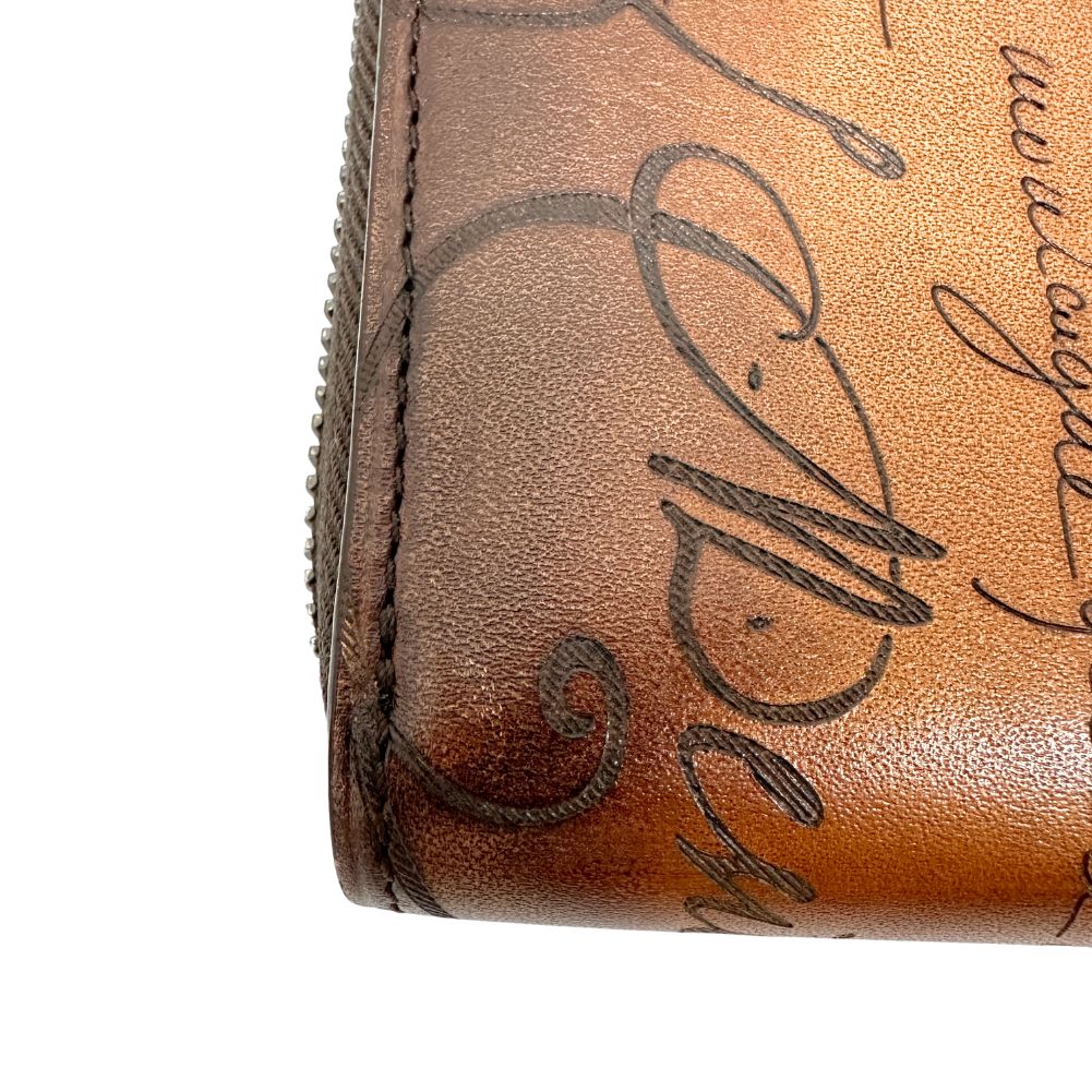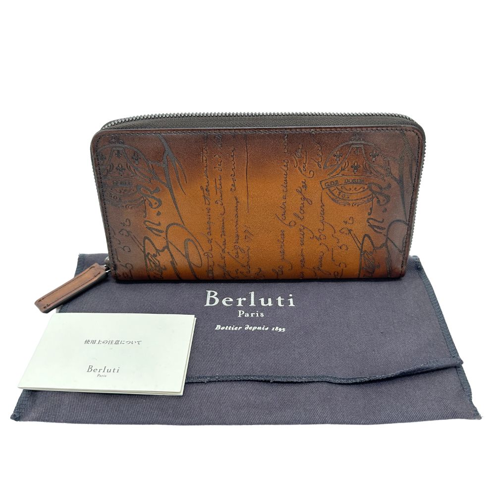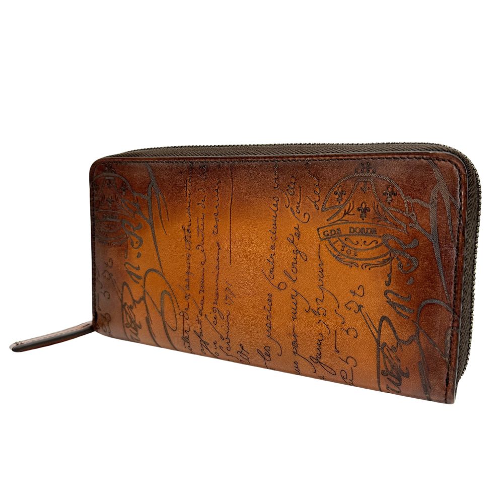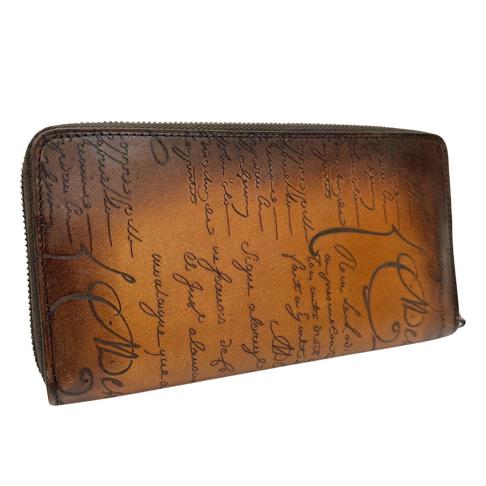 Presenting the Berluti Portefeuille Zippe long wallet a refined accessory crafted from exquisite calf leather in a rich brown hue. This luxurious wallet exudes sophistication and style perfect for the discerning gentleman.