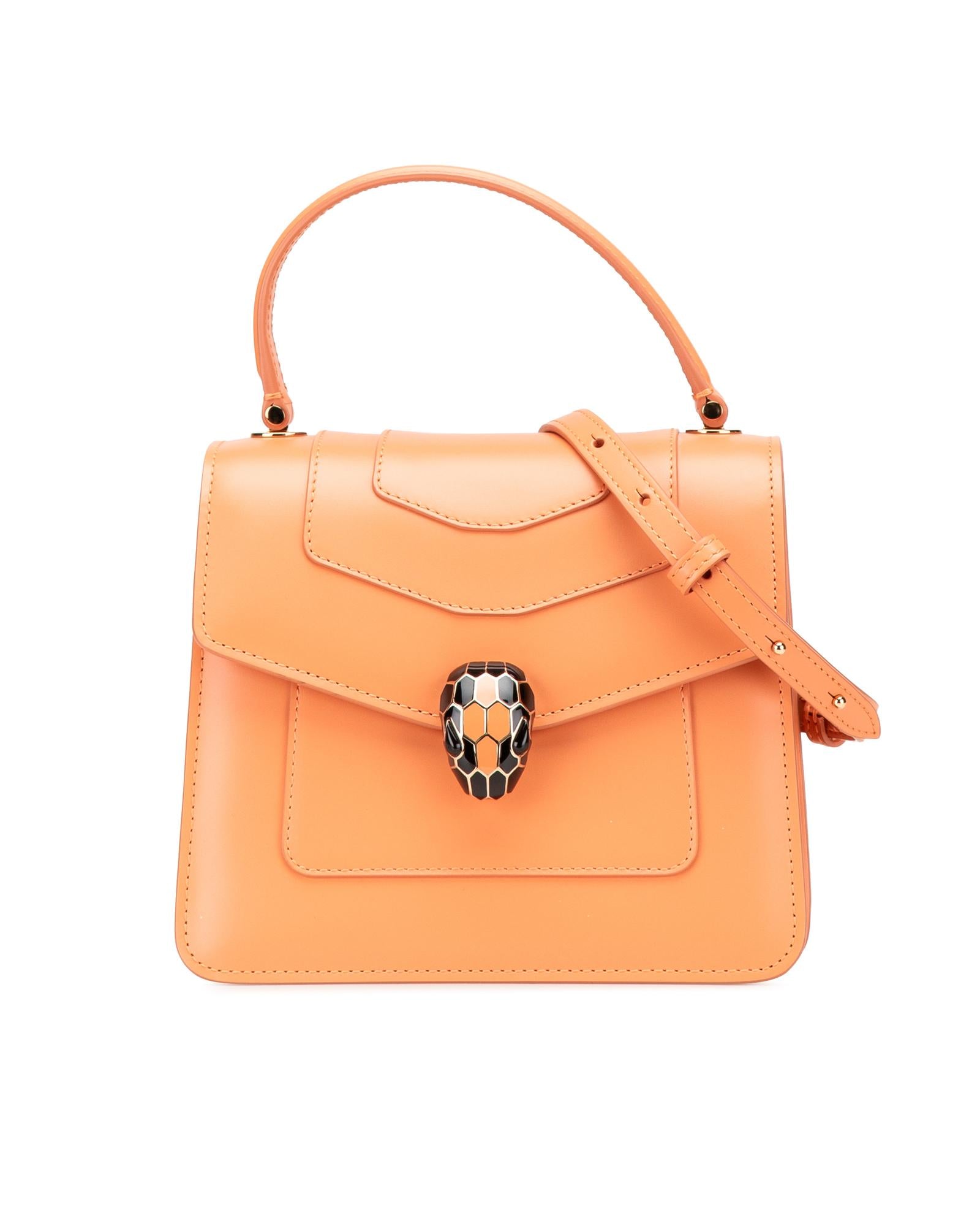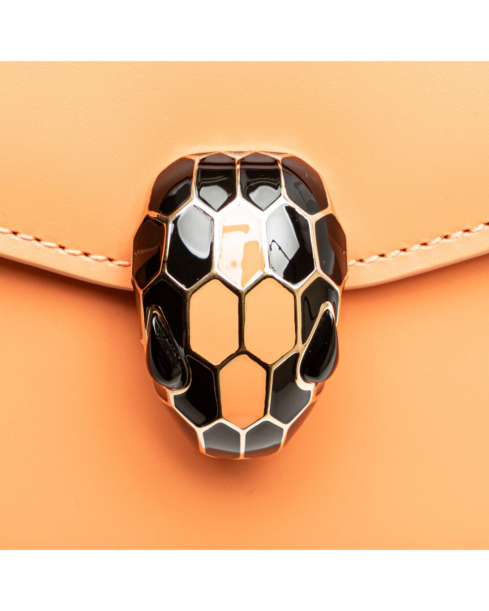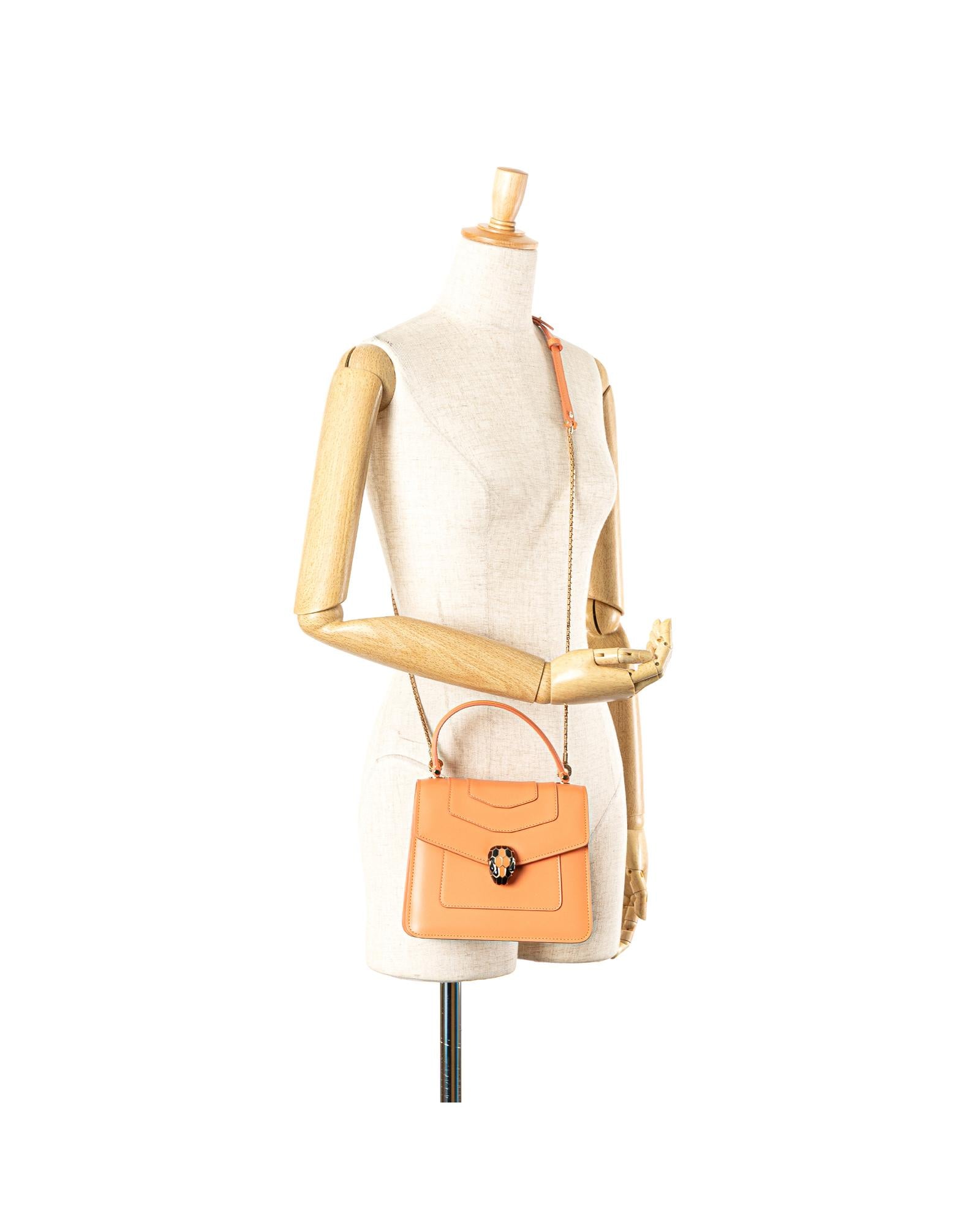 The Serpenti satchel features a leather body a flat top handle a detachable gold-tone chain strap a front flap with snap closure and serpenti adornment and an interior slip pocket.Brand: Bvlgari