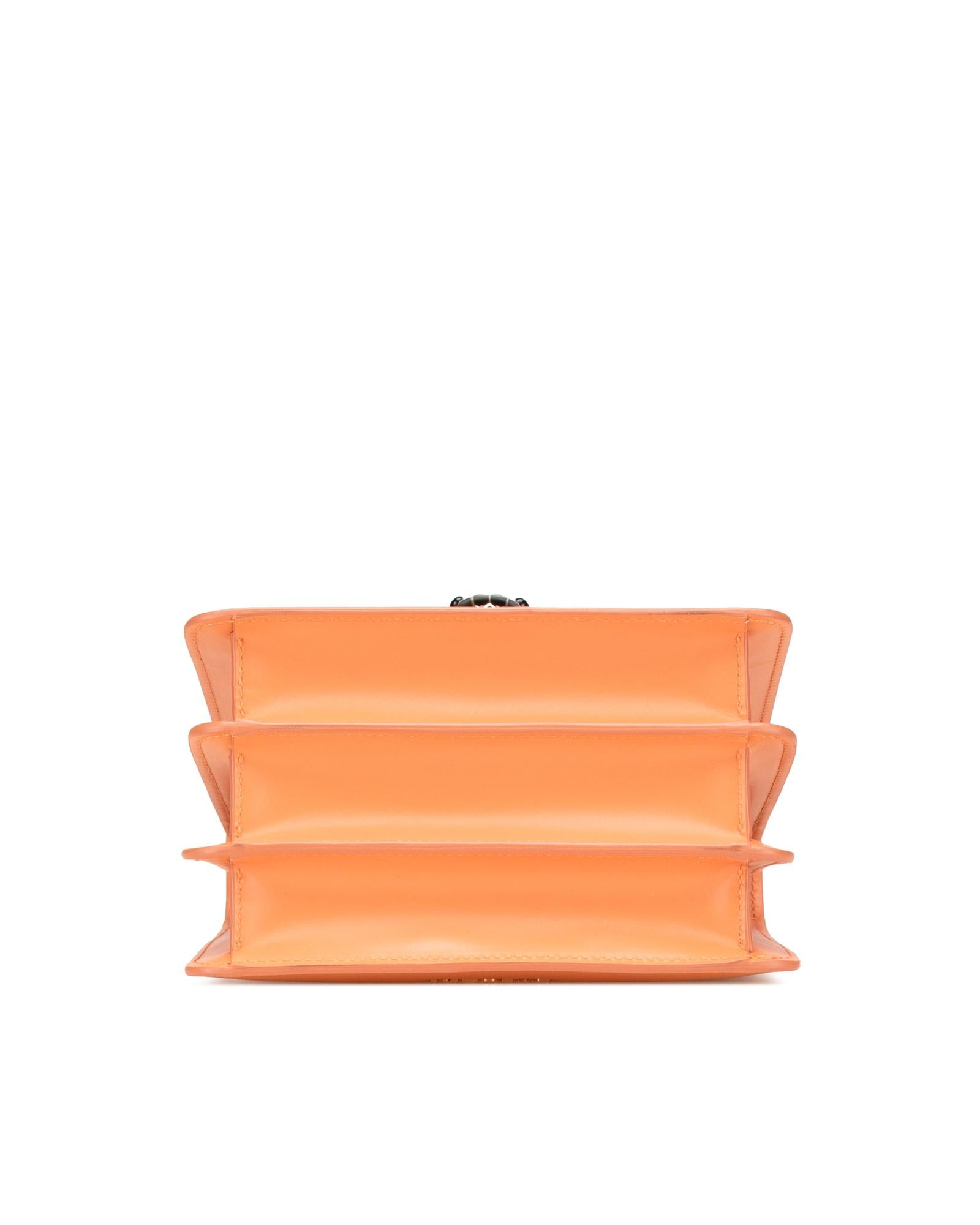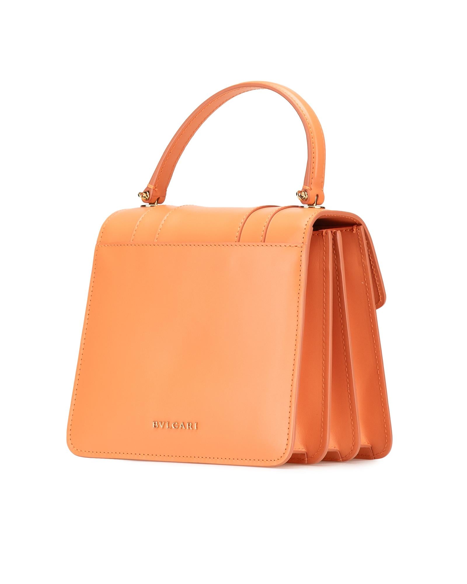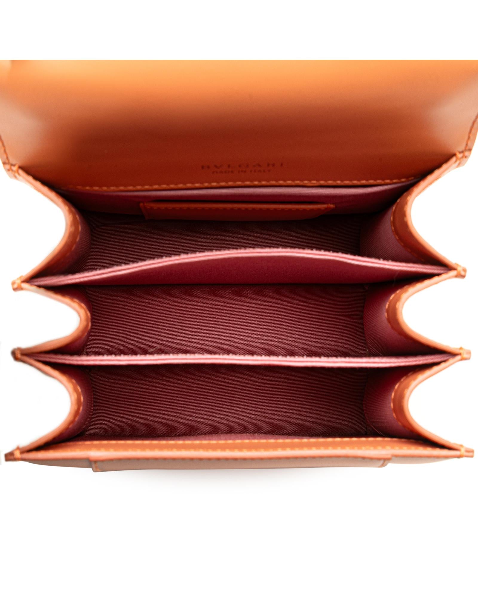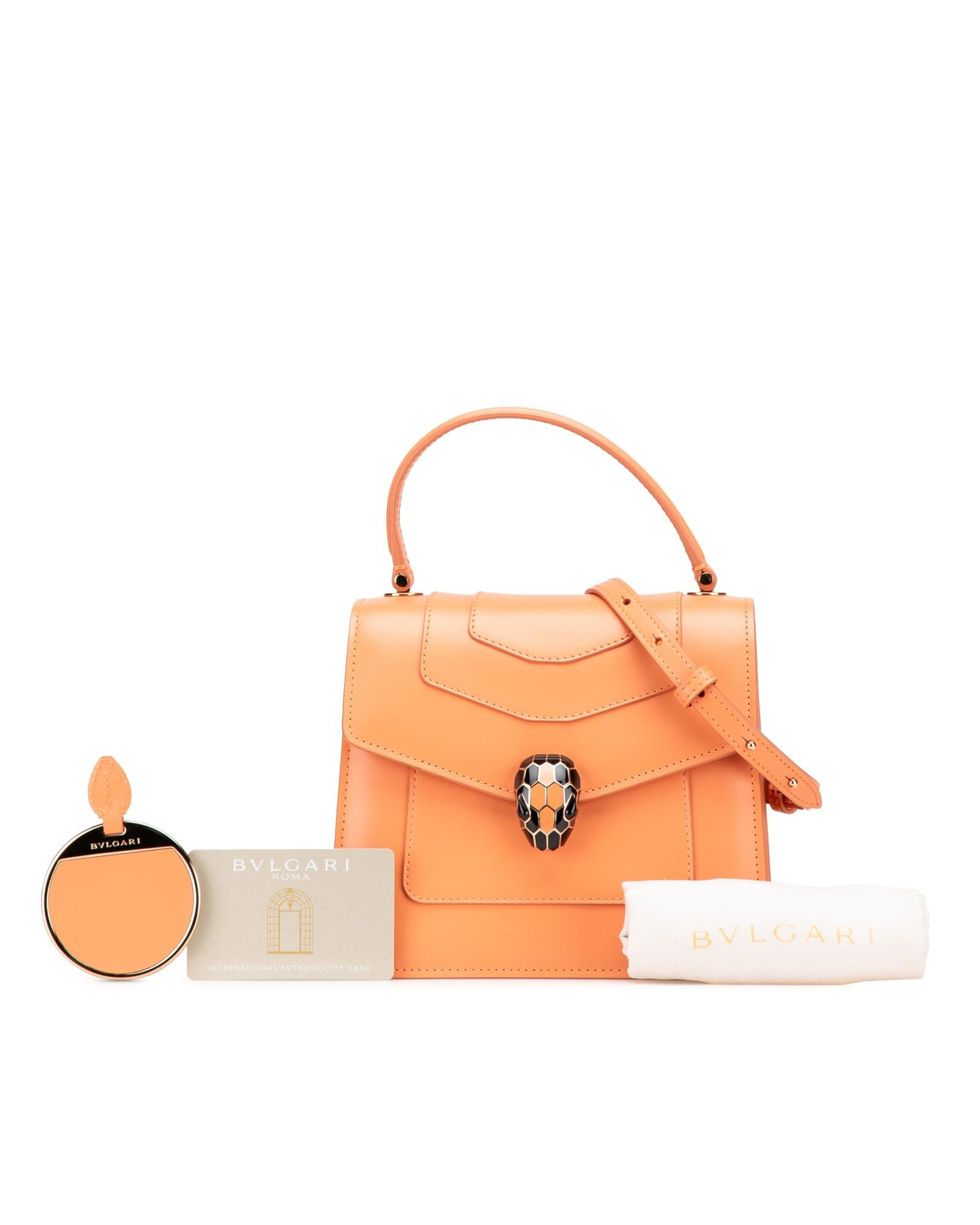 The Serpenti satchel features a leather body a flat top handle a detachable gold-tone chain strap a front flap with snap closure and serpenti adornment and an interior slip pocket.Brand: Bvlgari