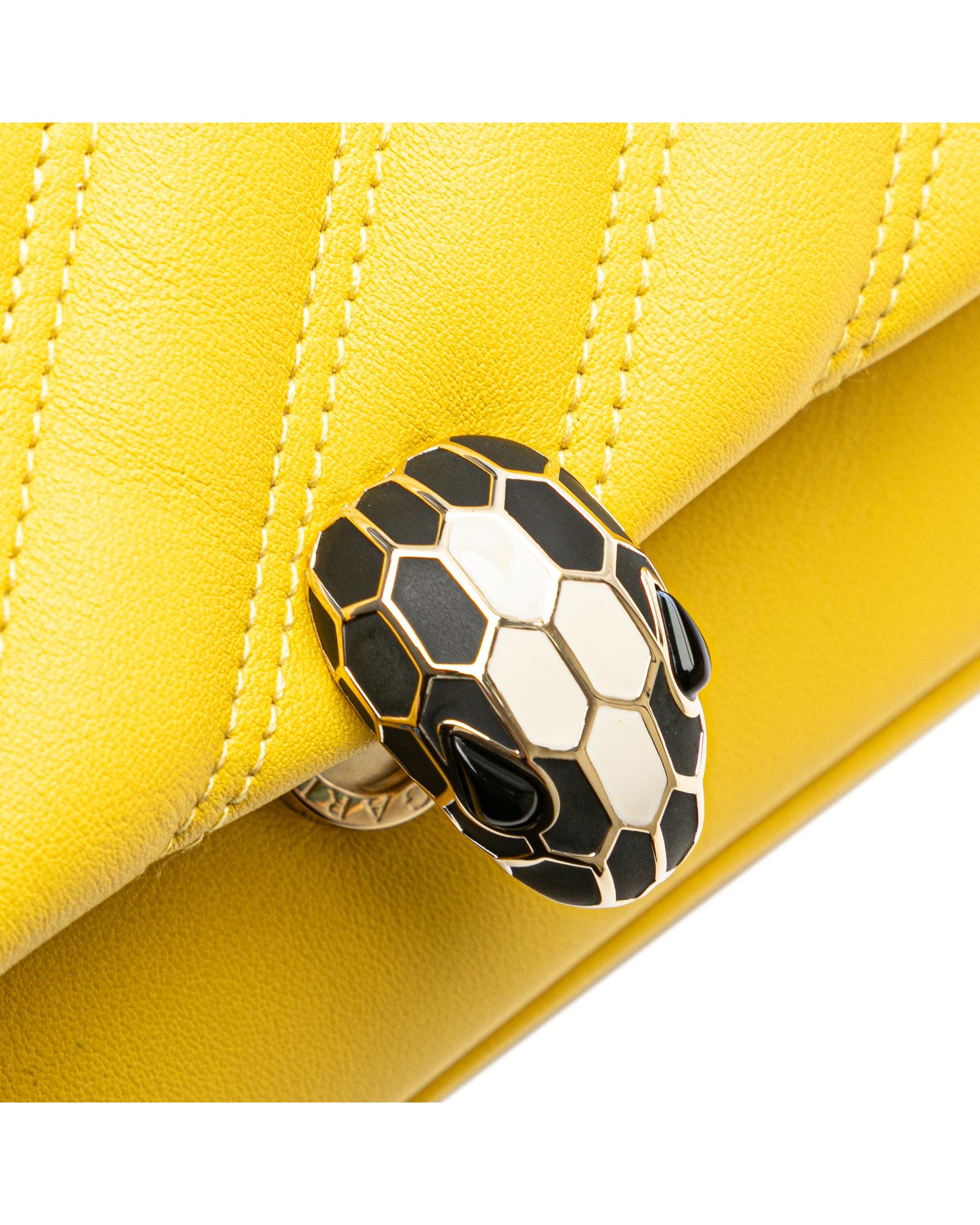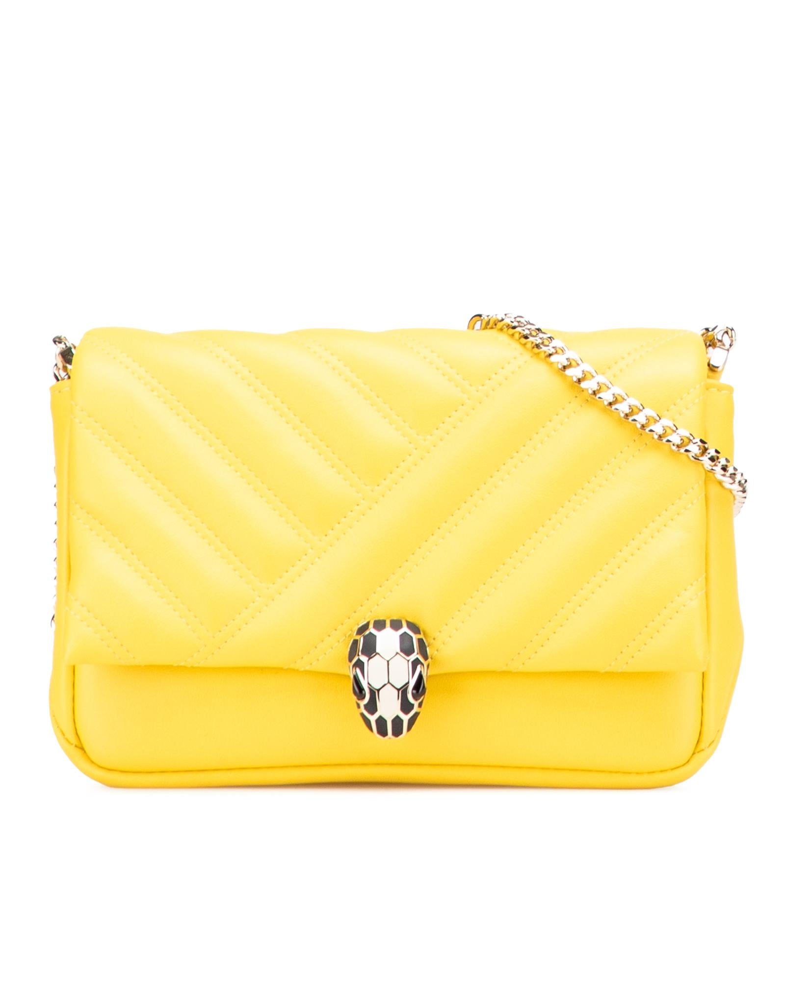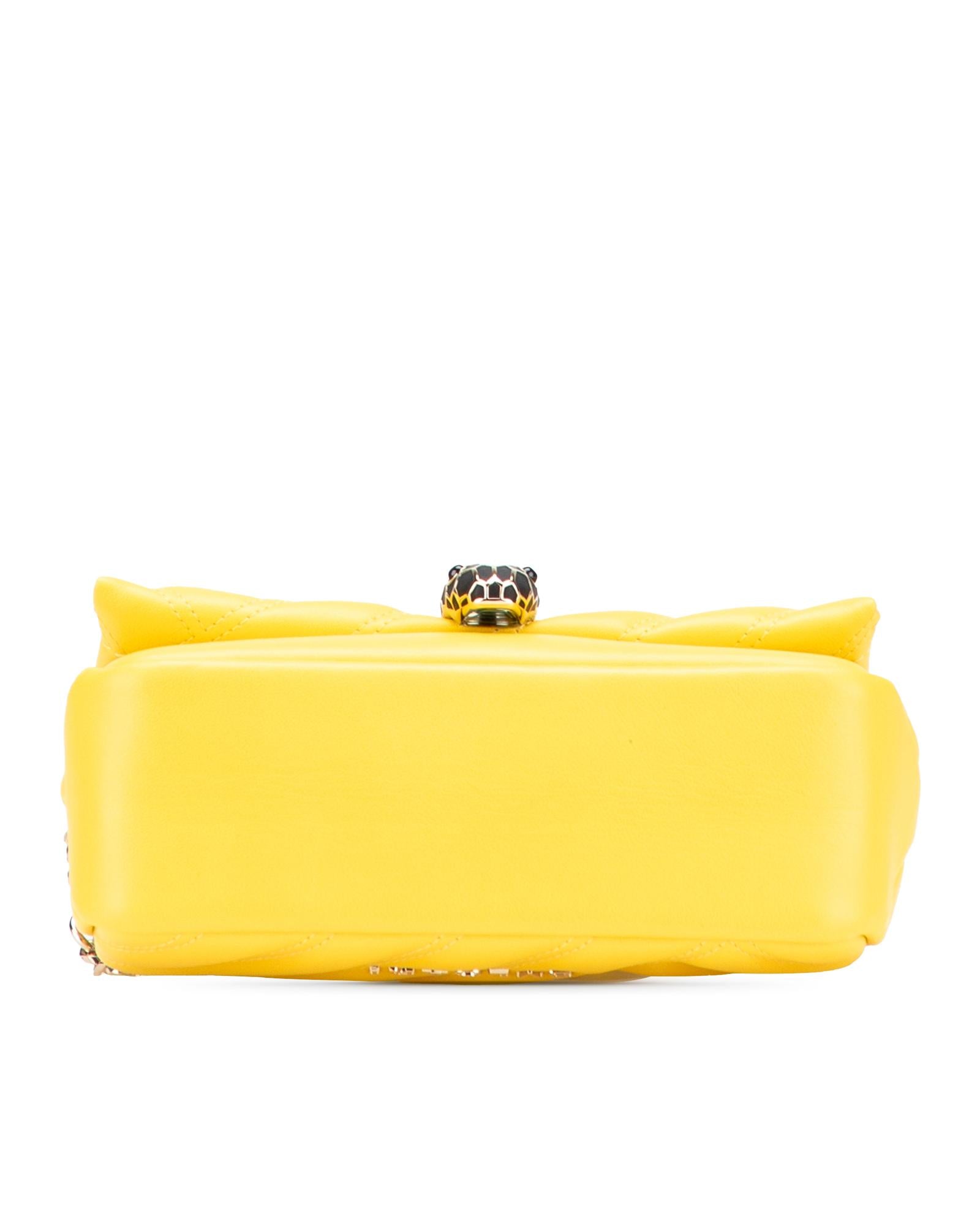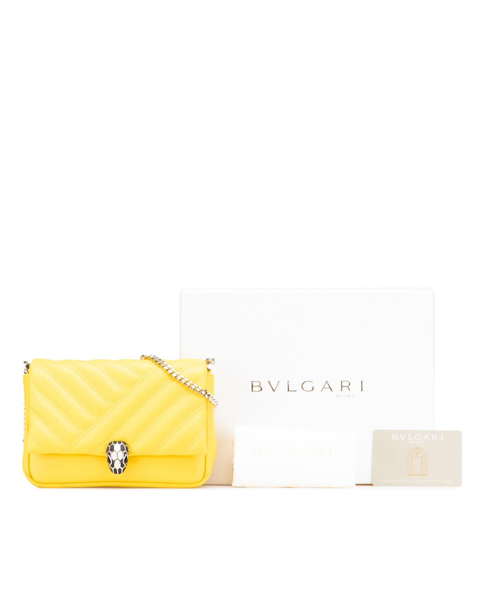 The Serpenti Cabochon features a leather body a chain link strap and a flap with snap button closure.Brand: Bvlgari